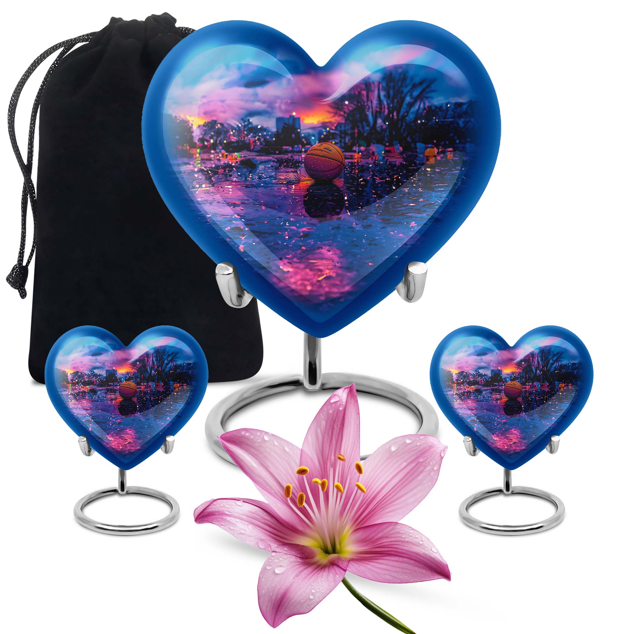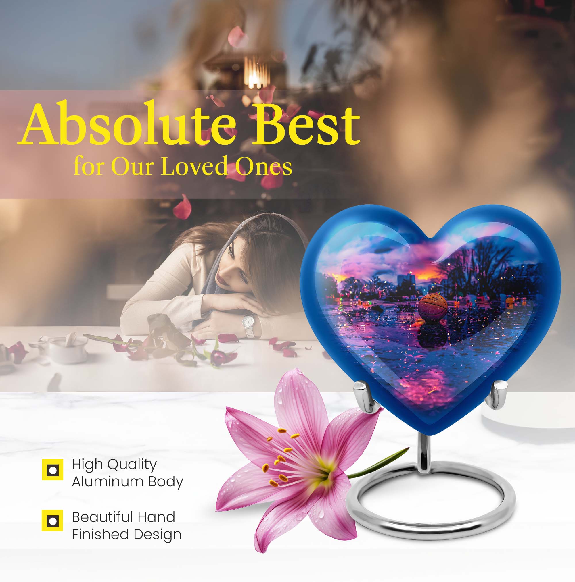 This elegantly crafted 10-inch 'Heart Urn' is not just another everyday cremation urn. Meticulously handcrafted from high-quality aluminium, it's more than capable of securely storing the ashes of your dearly departed loved ones. With a generous capacity of 200 cubic inches, it comfortably accommodates the remains of an adult female. Perfectly weighted at 3.3 pounds, it ensures stability whilst showcasing an exquisitely detailed butterfly theme that symbolizes transformation and renewal. To add an intimate touch, you have the option to personalize this large urn with engraved names. Further enhancing its value, each urn is accompanied by a velvet pouch, ensuring the contained ashes remain undisturbed. Particularly suited for those searching 'basketball urn' or 'burial large urns', this cremation ashes container elegantly honours the memory of your loved one while adding a unique accent to your decor.