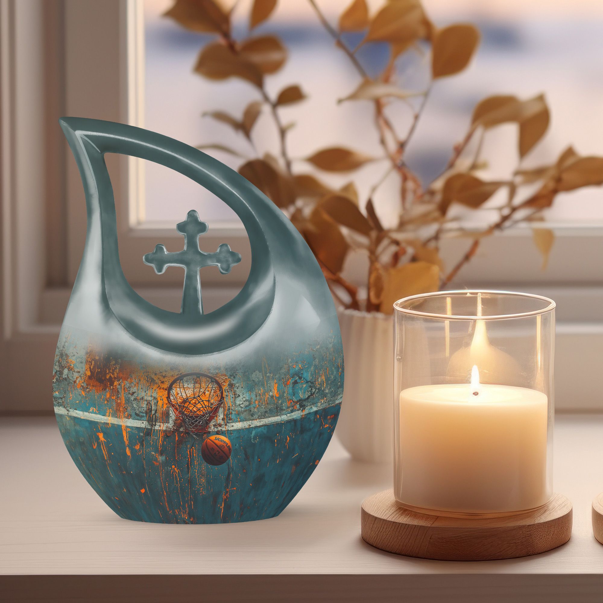 Honor the memory of your loved ones with our skillfully crafted Basketball Urn, a unique monument among memorial urns for human ashes. This large sized urn, standing robust at 10 inches, features a distinctive Cross Drop theme, paying homage to the eternal spirit of the departed. Lovingly constructed from aluminium, this urn weighs 3.3 pounds with the capacity to hold up to 200 cubic inches of ashes - making it an apt selection for adults and seniors alike. Adding a touch of personal touch, you can customize this piece with engraved names. The package also includes a velvet pouch for containing the precious remains. This generously-sized Basketball Urn is the epitome of commemorative elegance, a perfect tribute to hold dear the memories of your cherished ones. It's more than a simple sanctuary for ashes, it's a piece of art that stands out, exactly like the ones it represents.