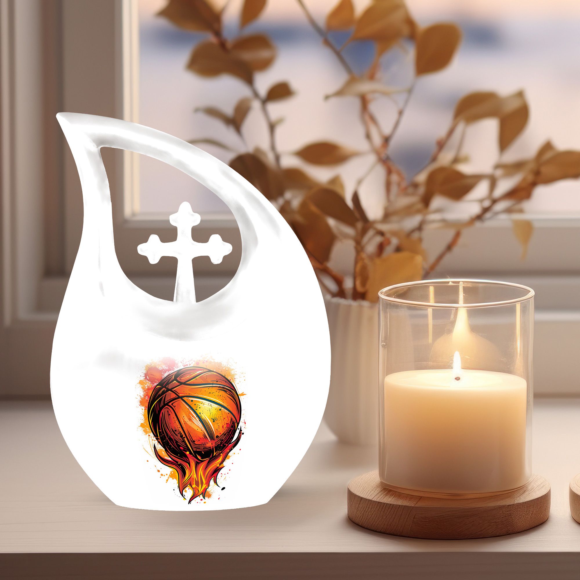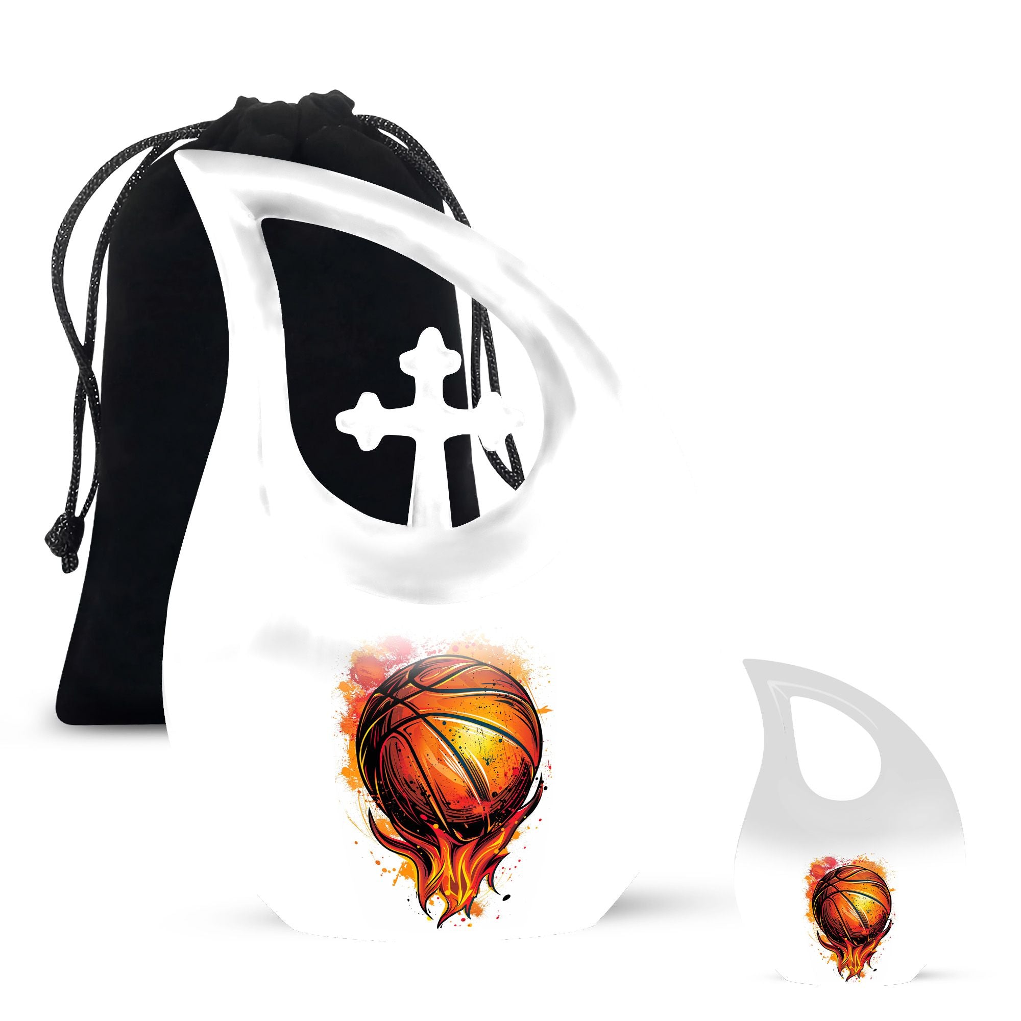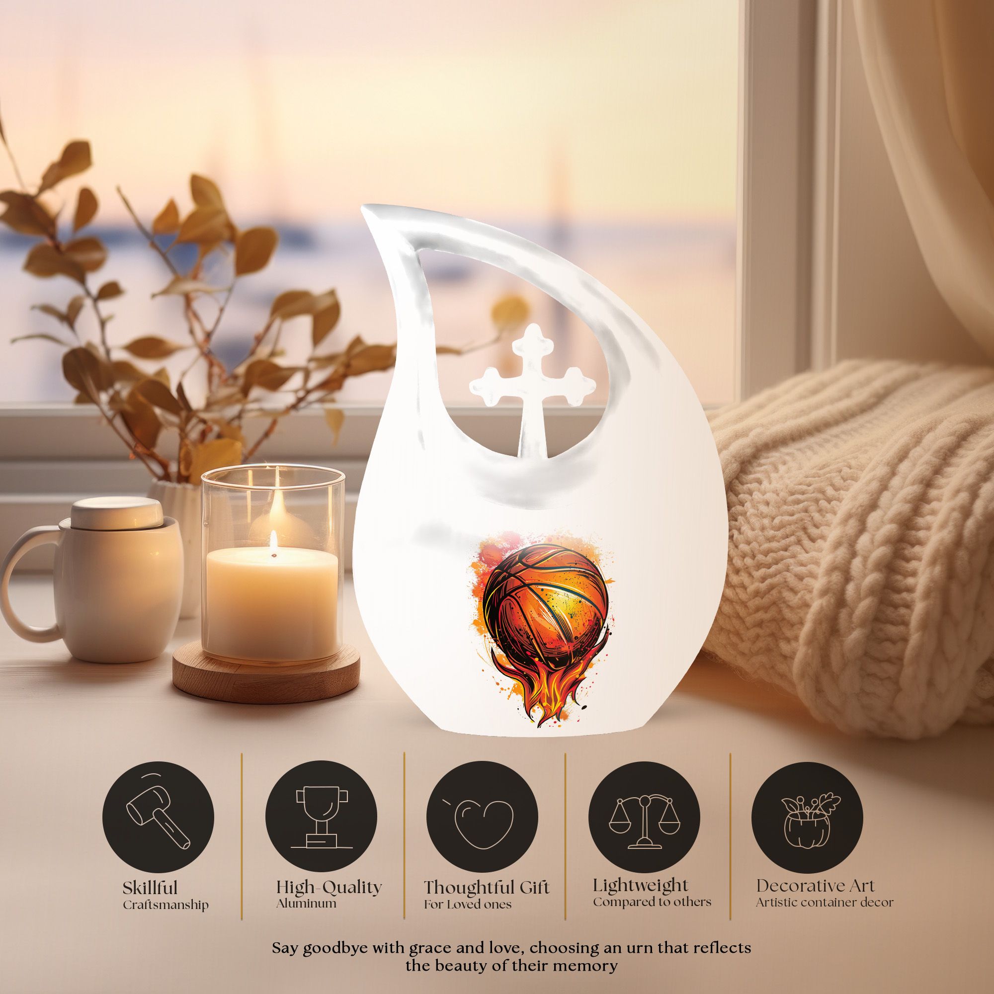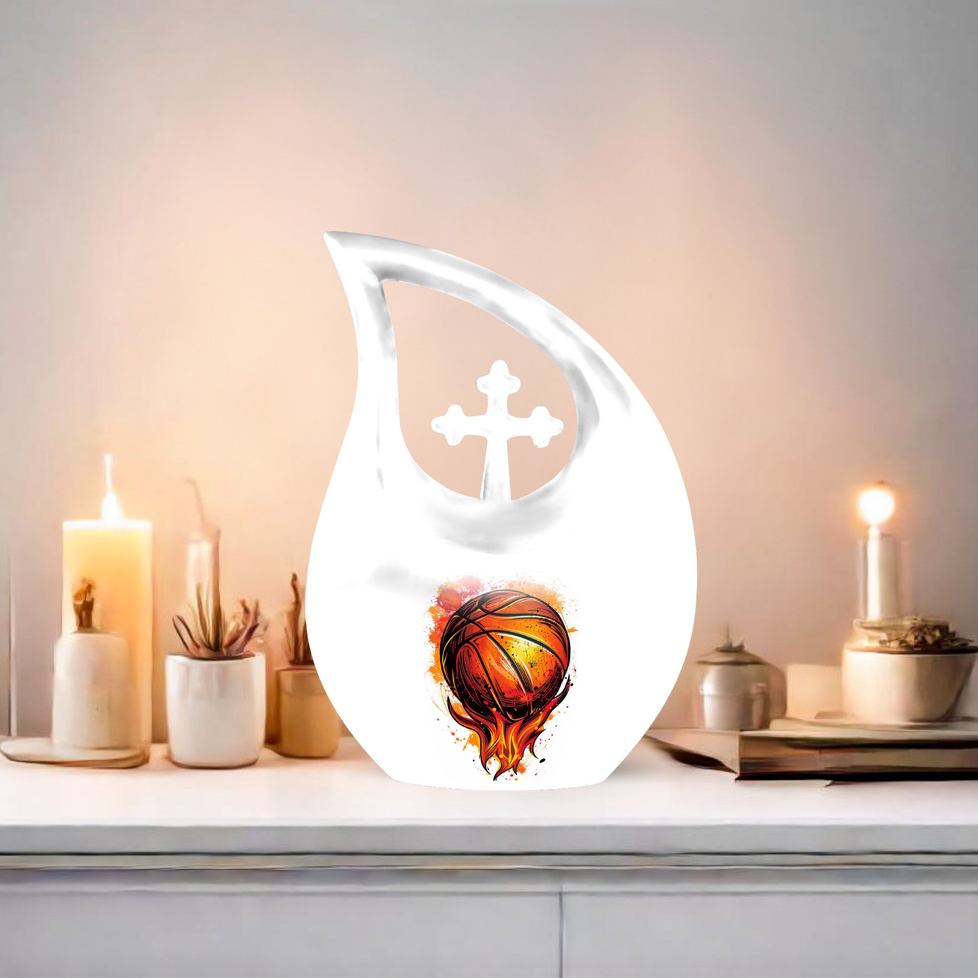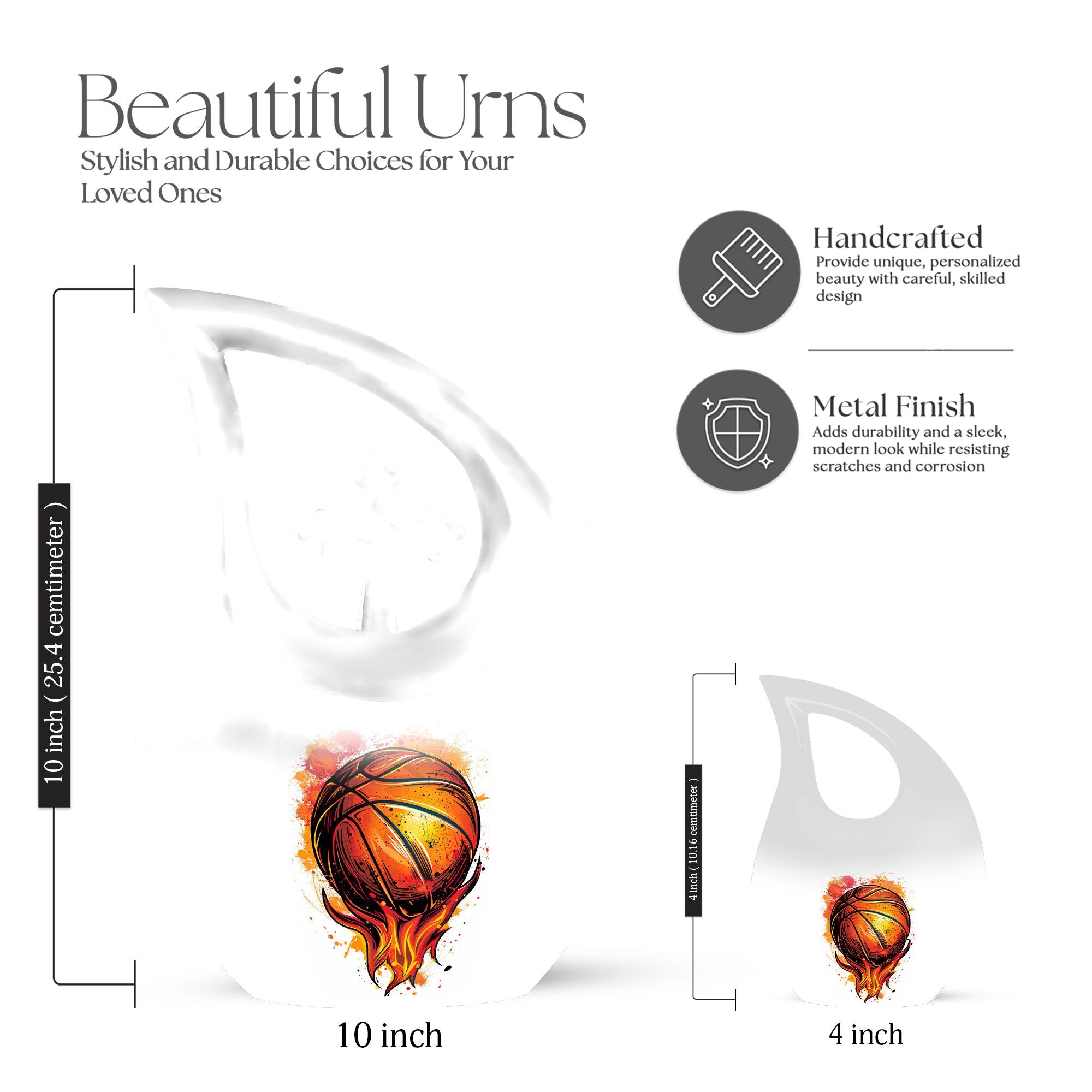Celebrate the love for the game and the cherished memories of your departed loved one with our 10-inch Basketball Urn. Crafted meticulously from robust aluminium, this unique urn is not just an ordinary memorial urn but a timeless tribute symbolizing their passion for sports. It displays a 'Cross Drop' emblem, symbolizing faith, strength, and peace. Weighing at a sturdy 3.3 pounds and with a capacity of 200 cubic inches, it assures to securely hold the ashes. Each purchase comes with a velvet pouch, providing an elegant containment for the ashes. To add a personal touch, we offer the liberty to engrave names, making it a truly special tribute. As Large Urns that embody love and respect, these Cremation Boxes for adults serve as both, a sacred Cremation Container and a beautiful piece of decor. With its Basketball theme, it makes for an ideal choice as Funeral Urns for adults, especially for sports enthusiasts. Keywords: Basketball Urn, Unique Urns for Dad, Cremation Boxes for Adults, Cremation Containers, Large Urns for Ashes, Funeral Urns for Adults.