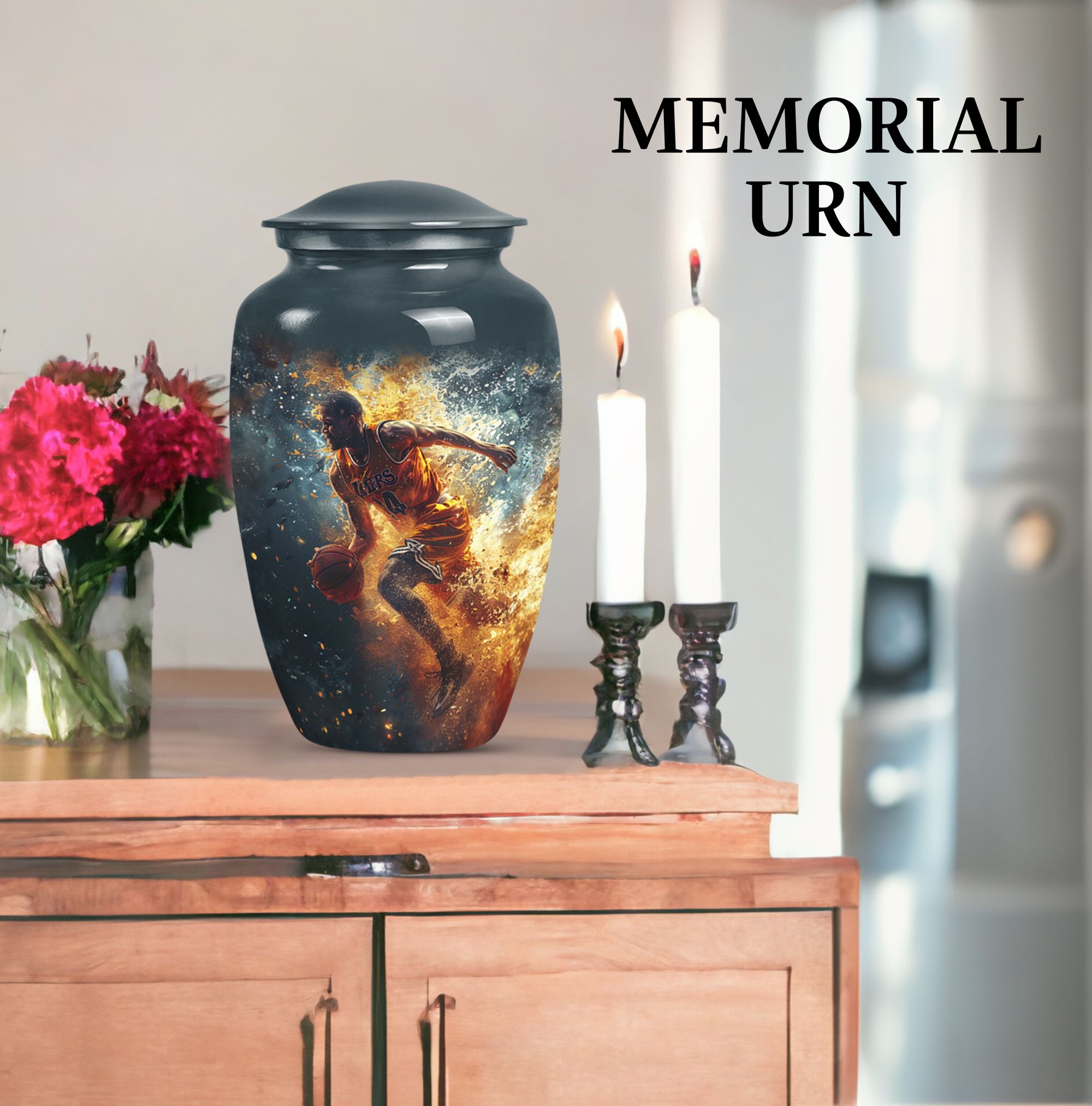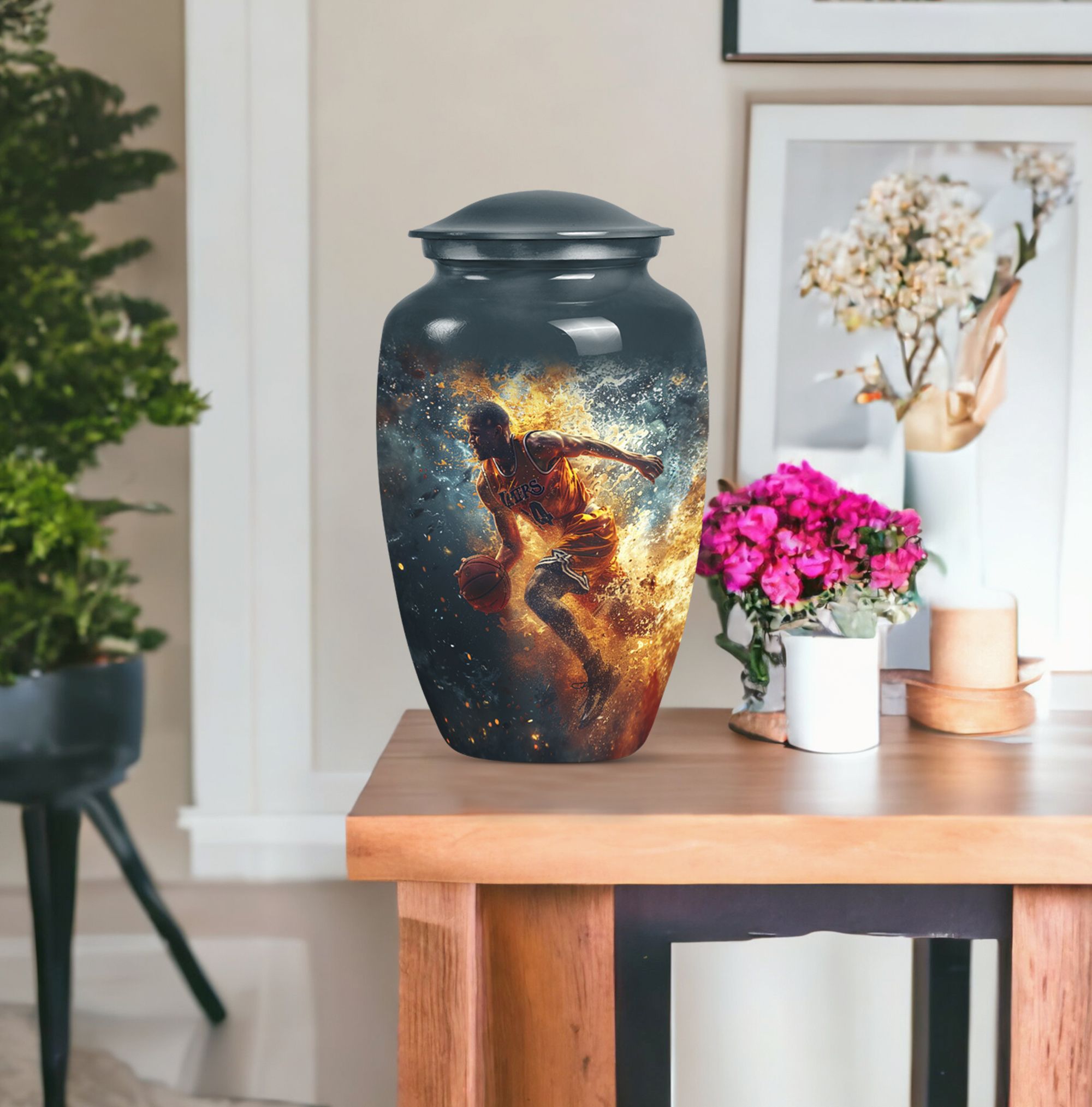 Honor the memory of your loved ones with our 10-inch basketball urn. This large urn made of durable aluminium is designed to securely hold up to 200 cubic inches of burial ashes. Weighing just under 3.3 pounds, it's a substantial and sturdy choice for safely preserving cremation remains. The shimmer of the aluminium material aptly reflects the homage and respect you still hold for them. In preparation for memorial ceremonies, the urn comes neatly packaged in a velvet pouch, ensuring that the containment of ashes is both respectful and elegant. We offer the added touch of personalization - engrave the names of your loved ones for a truly unique tribute. Our butterfly theme provides a gentle reminder of the beauty and transience of life. This cremation urn is specifically designed for adults and seniors, and is an elegant selection within urns for cremation ashes. Its classic urn style fits seamlessly within your home decor, acting as a subtle remembrance of your loved one. Please note that the design is pre-fixed and any customization applies only to the name engraving.