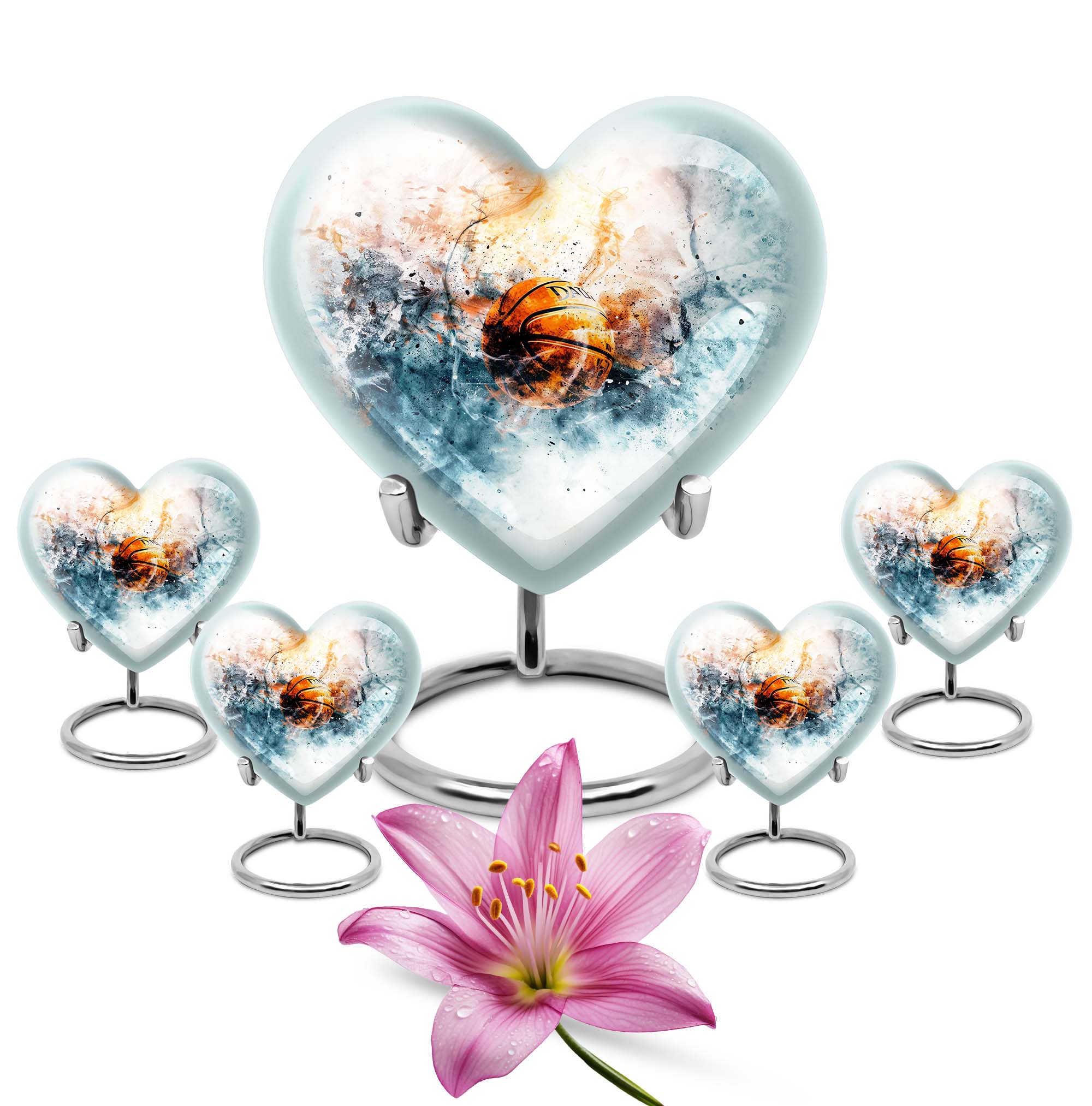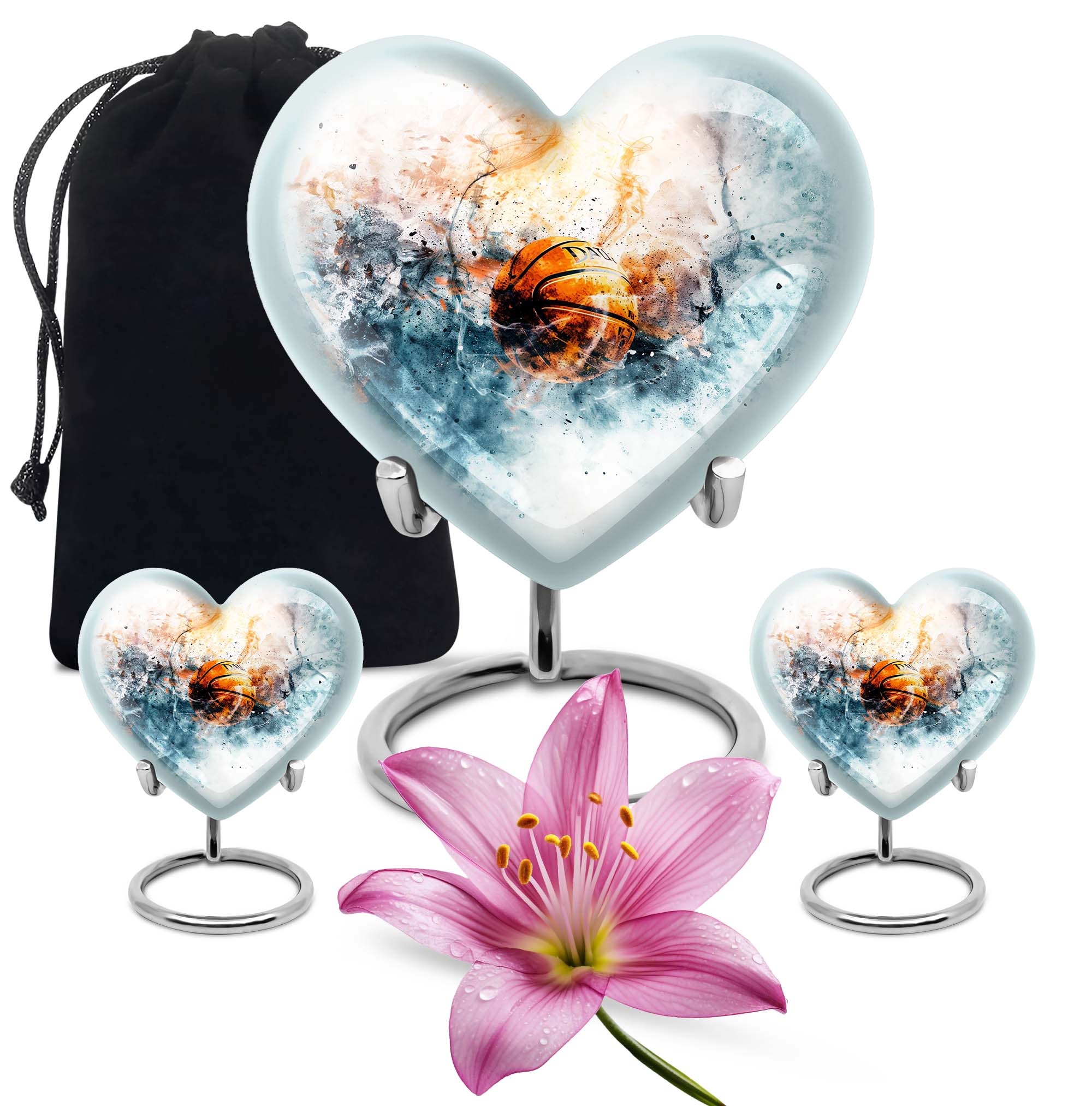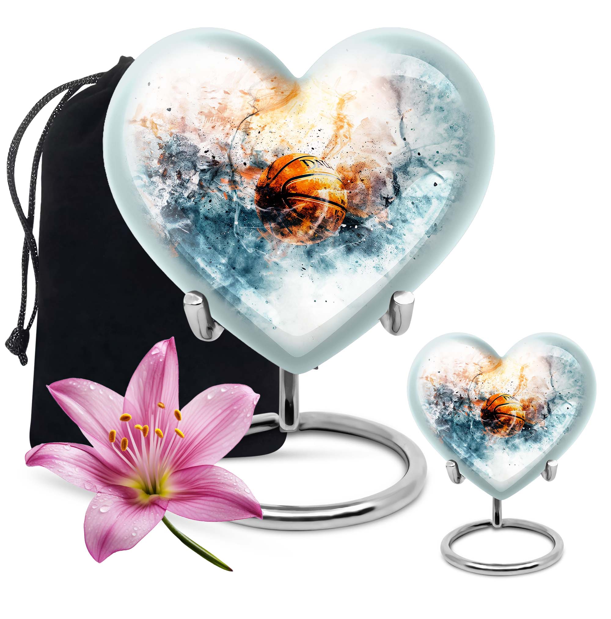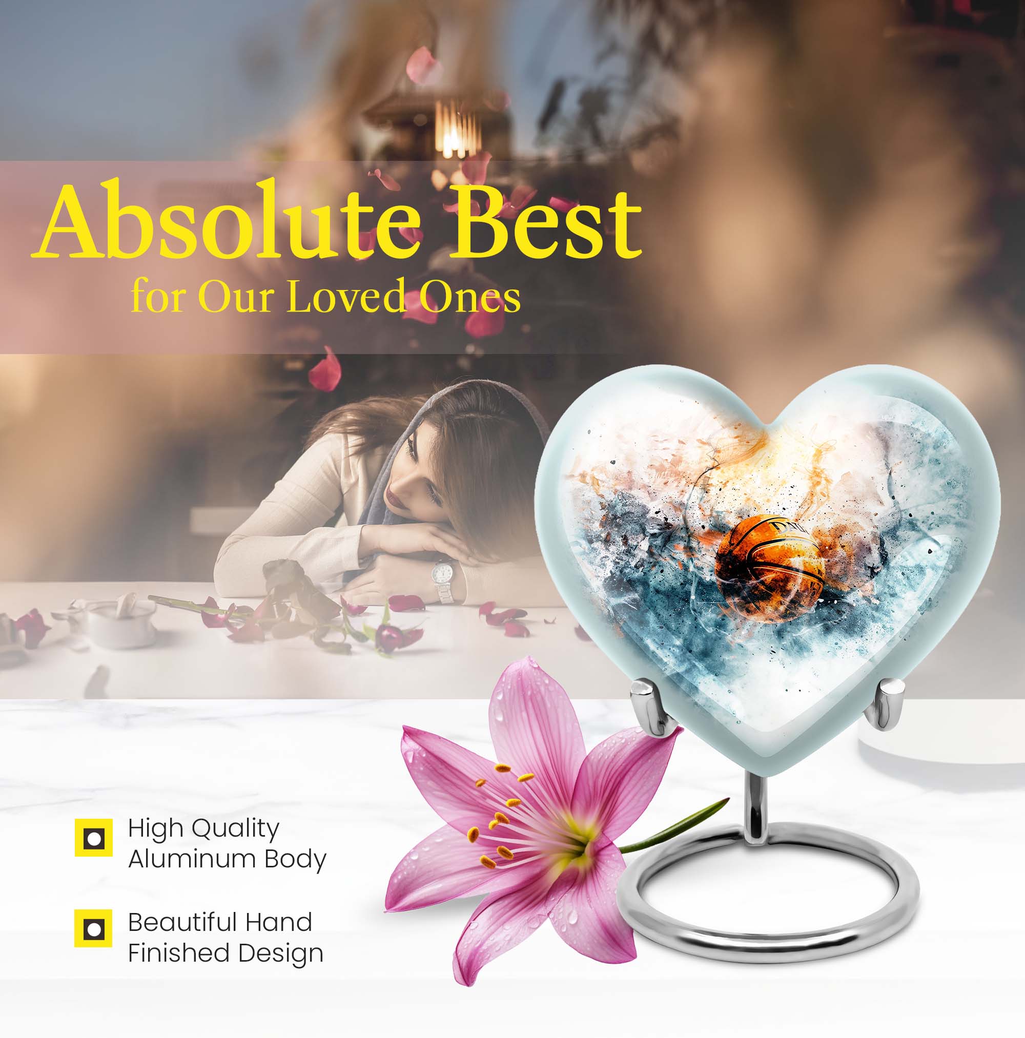 Indulge in the honor of commemorating your cherished ones with this large, abstract themed 10-inch basketball urn, astutely assembled from strong and lightweight aluminium. Well-suited as a funeral urn for men's ashes, it radiates an unequivocal respect and serves as a heartfelt tribute to your loved one, while subtly adding a decorative touch to your space. Much more than a mere urn, it lends itself as a personalized emblem of farewell with customizable options to engrave names, allowing for a unique commemoration. The considerable capacity holds up to 200 cubic inches, accommodating adult ashes with sufficient room. Arrives complete with a soft velvet pouch for dignified containment of ashes. Delightfully comforting and ceaselessly endearing, this can serve as an emblematic keepsake or memorial urn that will stand the test of time. As a tribute urn, it gracefully captures the essence of your bond, making it an optimum choice amongst decorative human ashes urns and metal urns.