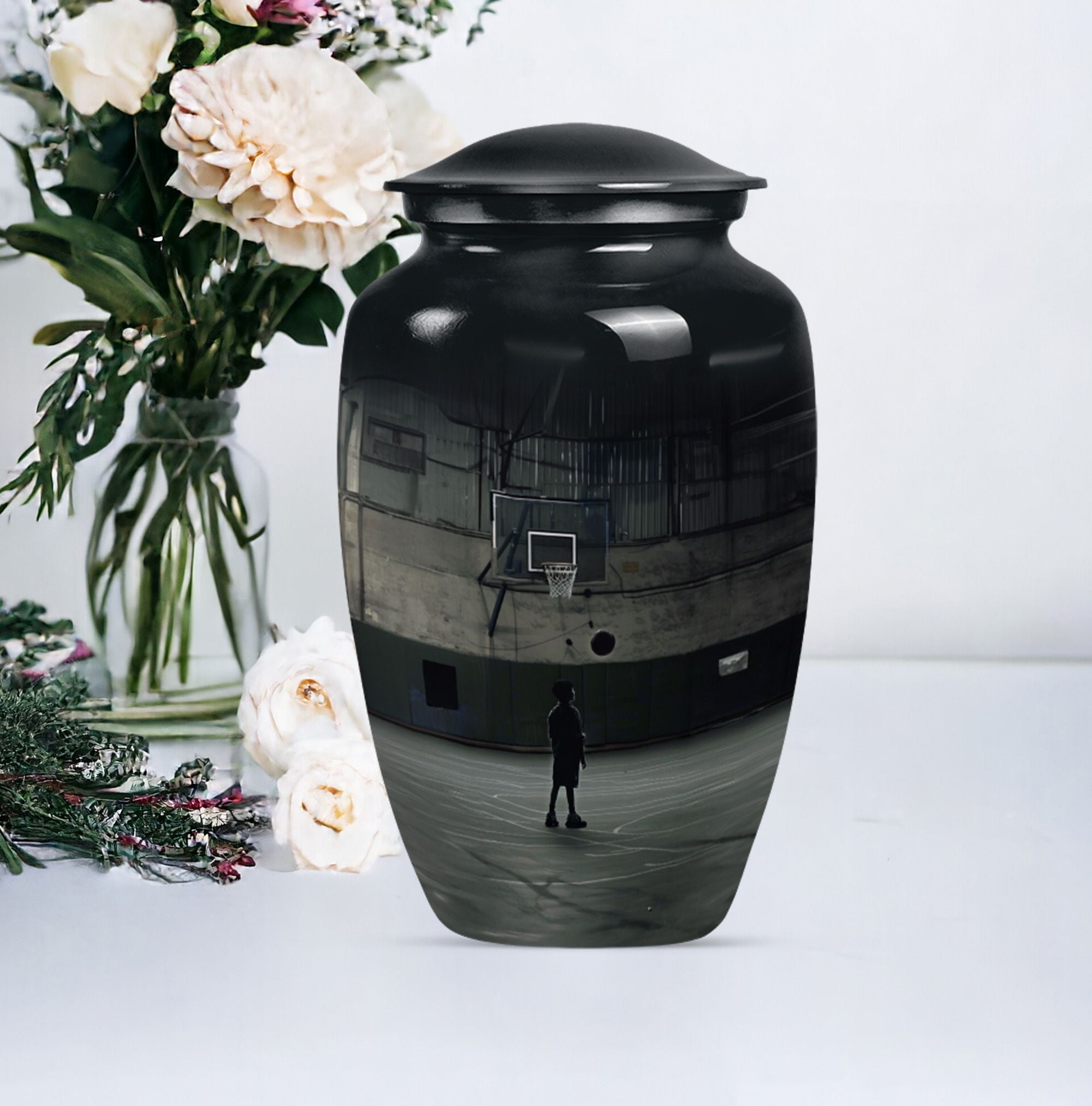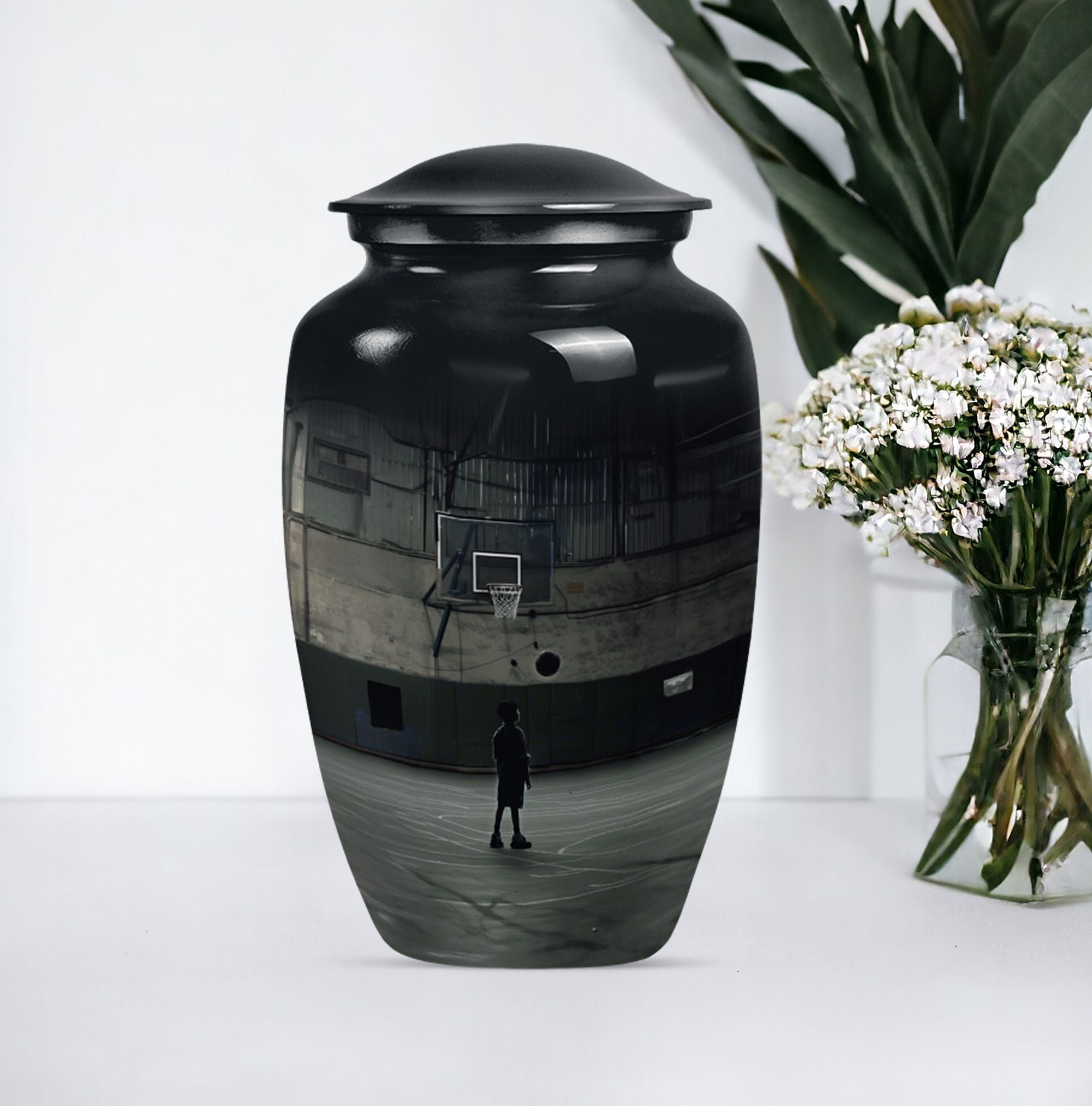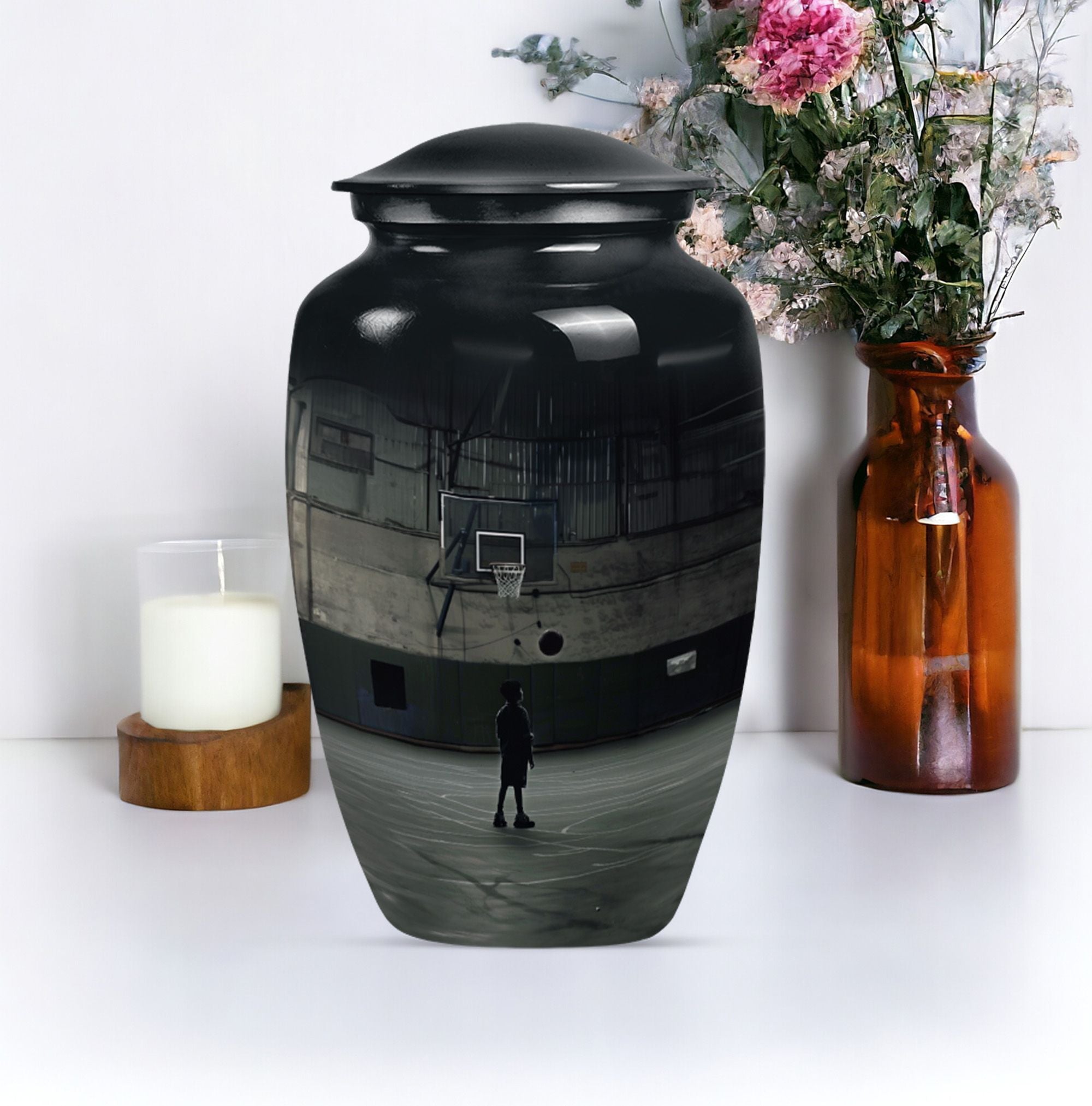 Carry the cherished memory of a man who lived for the court with this abstract-themed, aluminum made, Basketball Cremation Urn. Tailored to fit the 'memorial urns' keyword phrase, this large-sized urn can carry up to 200 cubic inches of cremains securely. Towering at a sturdy 10 inches in height, it has a substantial weight of 3.3 pounds and brings an imposing presence in the room, very much like your loving one did on the basketball playground. You'll receive a velvet pouch that ensures the honorable containment of the cremains with every purchase. Add a personal touch by customizing it with engraved names, making it a monumental tribute to a life well-lived. Remember, it’s not just an urn; it’s a cornerstone linking the love and memories between you and the departed. Among the widely searched 'funeral ashes urns', this one stands out with its unique fusion of the sporty theme with a classic urn shape, distinctly designed for adults and seniors looking for 'cremation urns for men'.