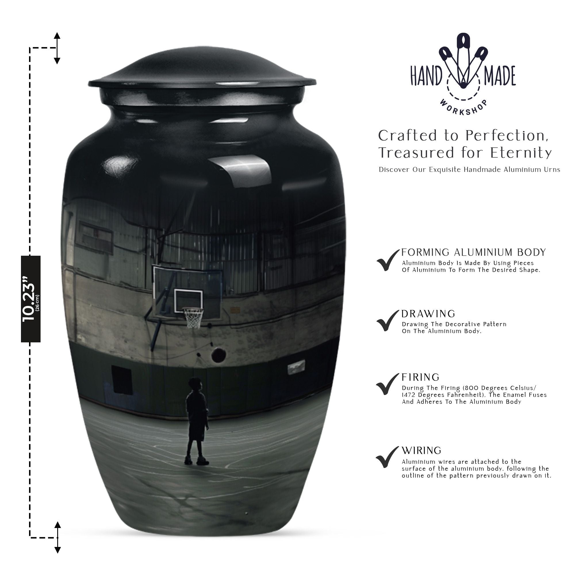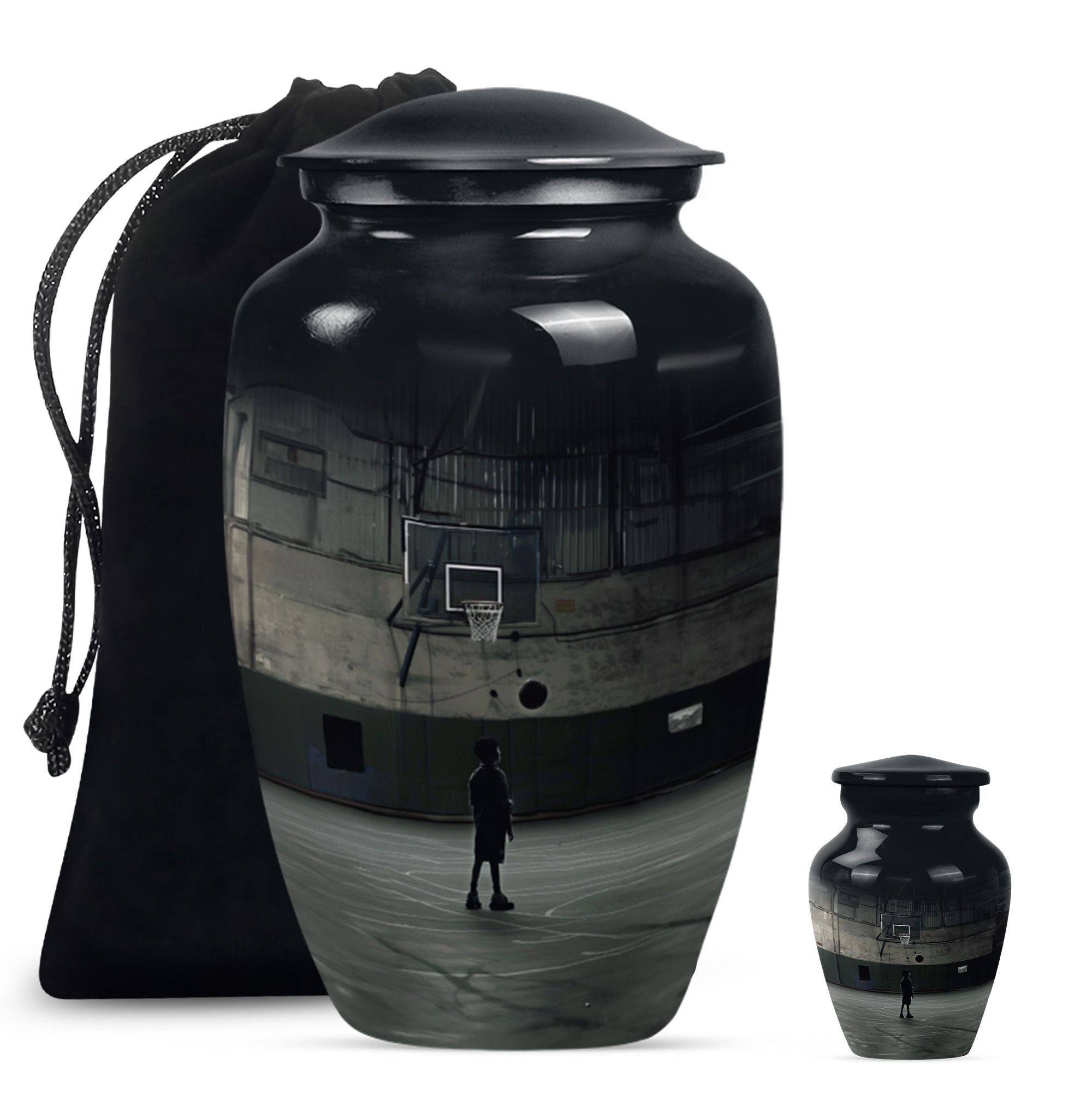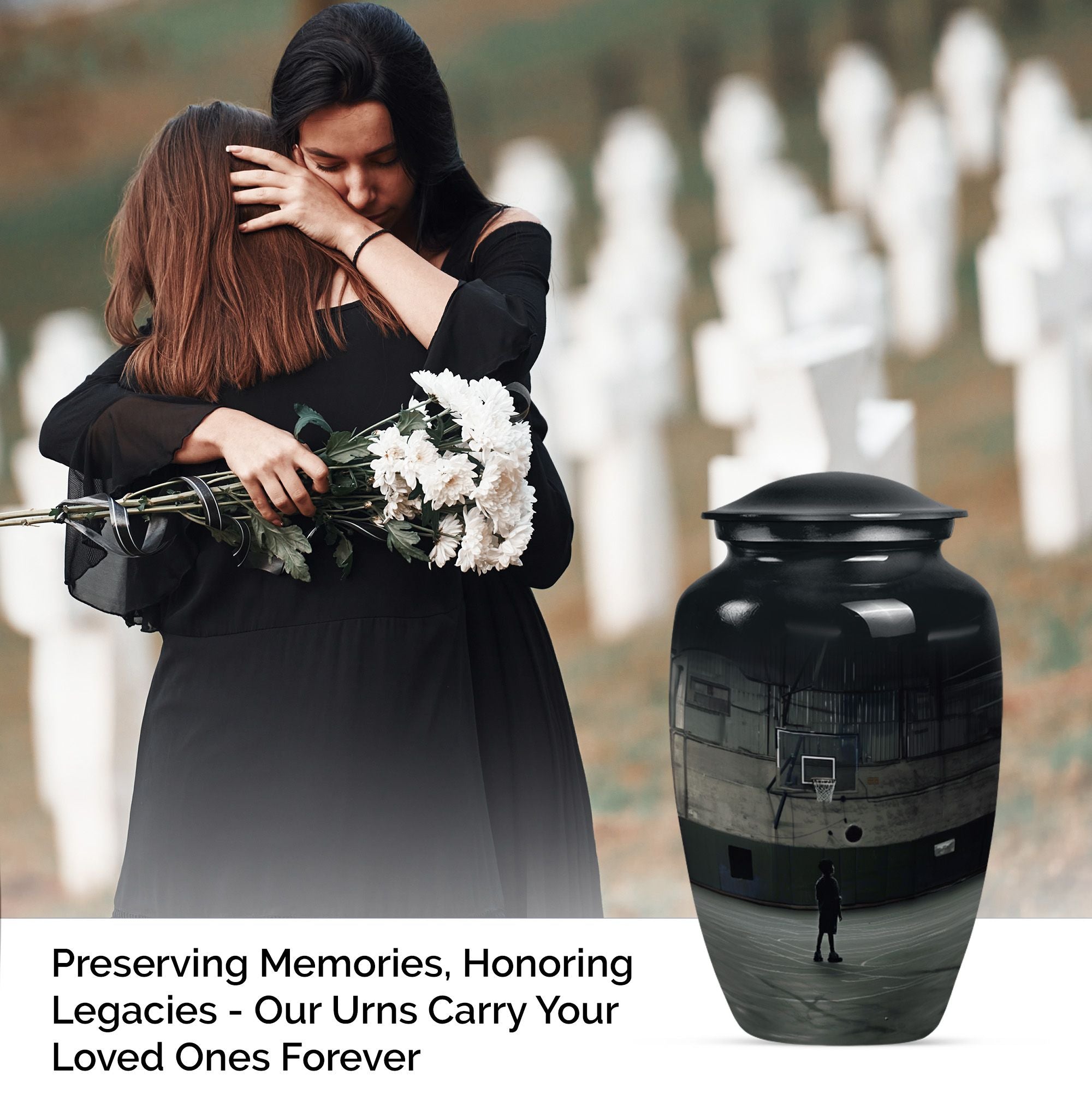 Carry the cherished memory of a man who lived for the court with this abstract-themed, aluminum made, Basketball Cremation Urn. Tailored to fit the 'memorial urns' keyword phrase, this large-sized urn can carry up to 200 cubic inches of cremains securely. Towering at a sturdy 10 inches in height, it has a substantial weight of 3.3 pounds and brings an imposing presence in the room, very much like your loving one did on the basketball playground. You'll receive a velvet pouch that ensures the honorable containment of the cremains with every purchase. Add a personal touch by customizing it with engraved names, making it a monumental tribute to a life well-lived. Remember, it’s not just an urn; it’s a cornerstone linking the love and memories between you and the departed. Among the widely searched 'funeral ashes urns', this one stands out with its unique fusion of the sporty theme with a classic urn shape, distinctly designed for adults and seniors looking for 'cremation urns for men'.