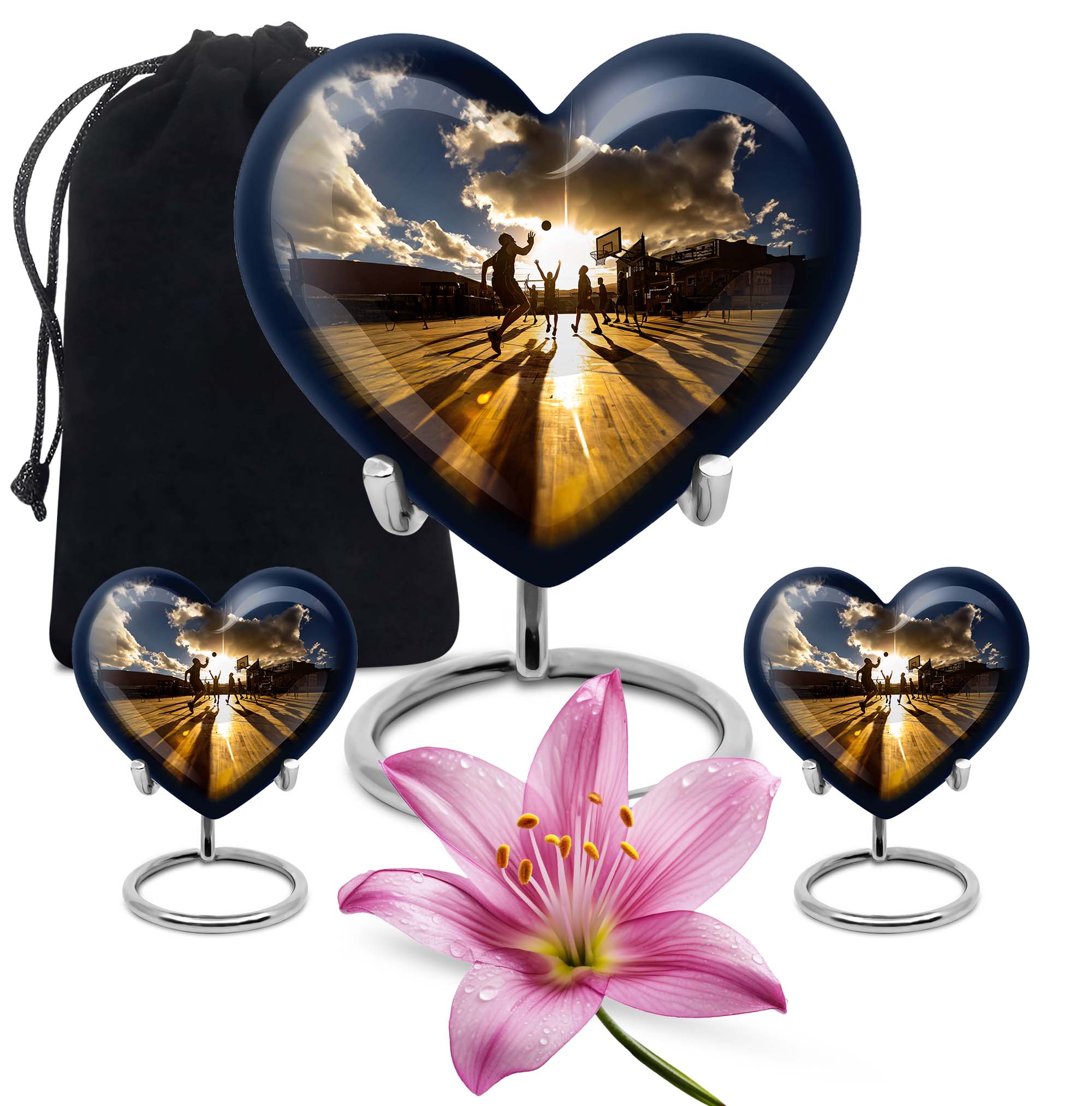 Cherish the memory of the departed with our meticulously crafted 10-inch Basketball Memorial Urn, specially designed for women. This standout piece, made from resilient aluminium, carries a substantial measure of 200 cubic inches, perfect for containing and preserving precious ashes. Weighing a solid 3.3 pounds, its hefty build exudes permanence, while its heart-shaped design alludes to the everlasting love encompassed in memories. Included in your purchase is a plush velvet pouch, providing a dignified containment for the ashes. It's more than just an urn, it represents an abstract symbol of memory and love. You can add a personal touch by engraving names on this large urn, making it a unique tribute to your loved ones. Our urn is also suitable for ground burial. This Basketball memorial urn for women’s ashes is a beautiful tribute and a comforting presence in your home. Catchwords that capture the essence of this product are 'women urns', 'Urn for Ground Burial', 'urns for human ashes', and 'metal urns for human ashes adult female'.