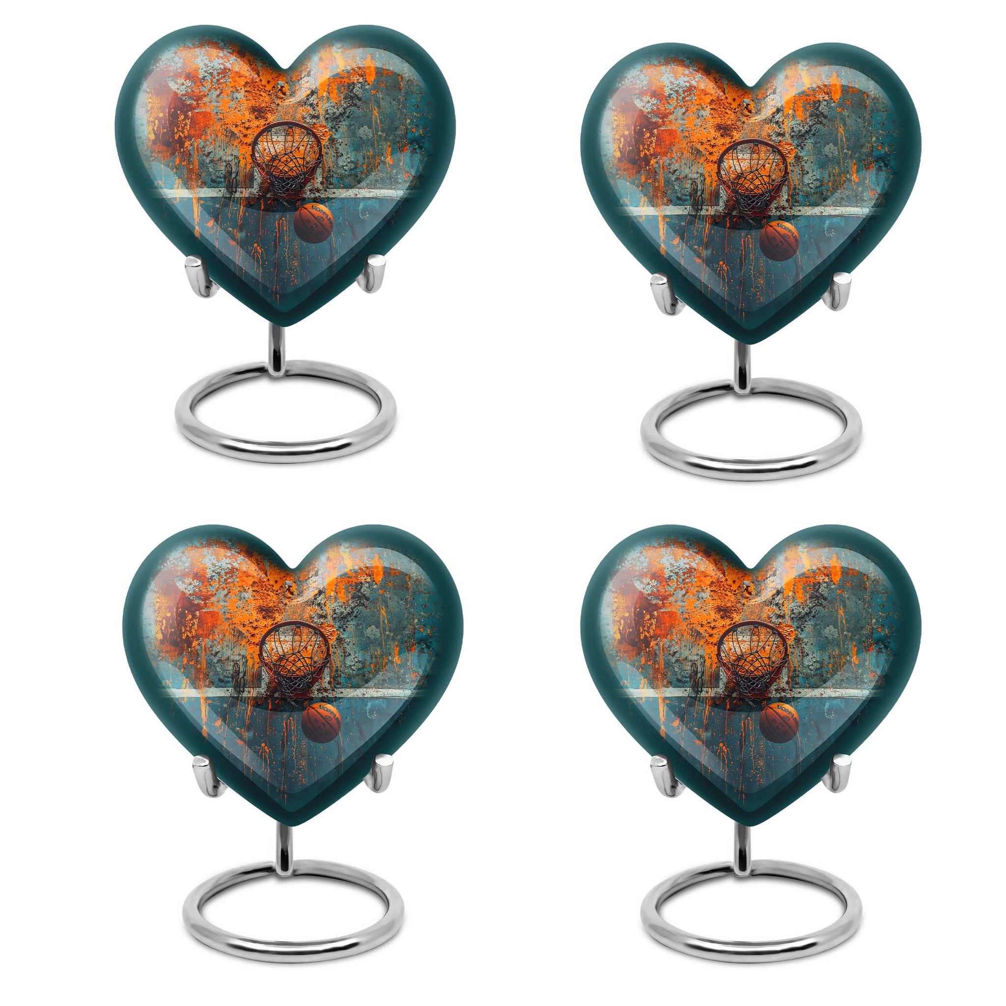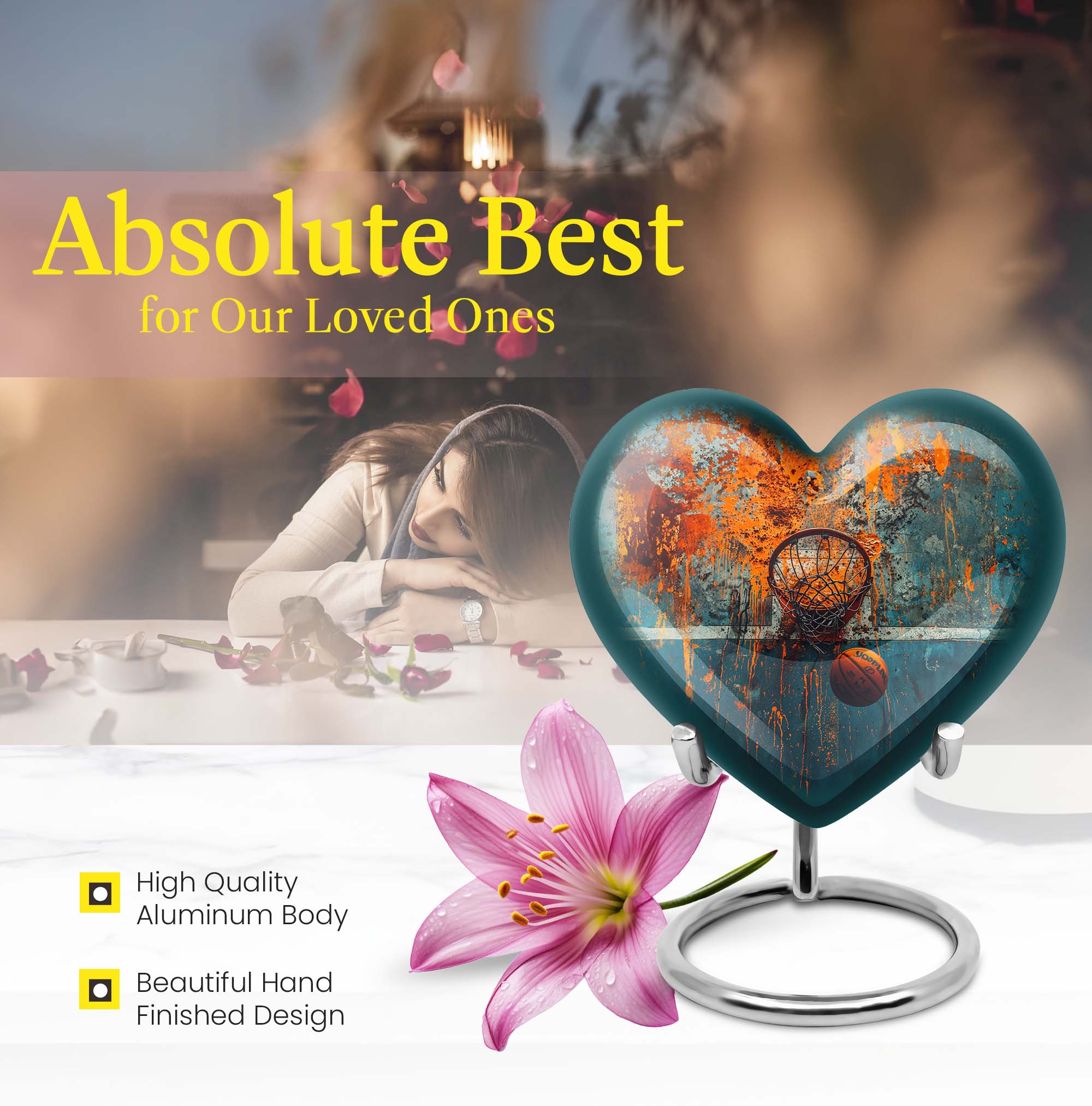 Capture an eternal feeling of unity, love, and respect that resonates with the Heart Urn, a basketball urn designed for adult ashes. This multi-faceted cremation urn, reaching ten inches in height, offers a holding capacity of 200 cubic inches. Lovingly crafted from premium aluminium, it epitomizes longevity and honoured bonds. With an underlying butterfly theme, it serves as a timeless emblem of rebirth and transformation. The urn’s construction allows for personalization with engraved names, making it a one-of-a-kind keepsake. Weighing at 3.3 pounds, its robust structure ensures durable protection for your loved one’s ashes. It comes complete with a velvet pouch, thoughtfully designed for the containment of ashes. By choosing our large urns, you embody the essence of memorial ceremonies; these urns offer a profound way to remember and celebrate a life well-lived. Whether it's for burial in ground or to keep close within your residence, our cremation large urn for ashes presents a heartfelt homage to your cherished one.
