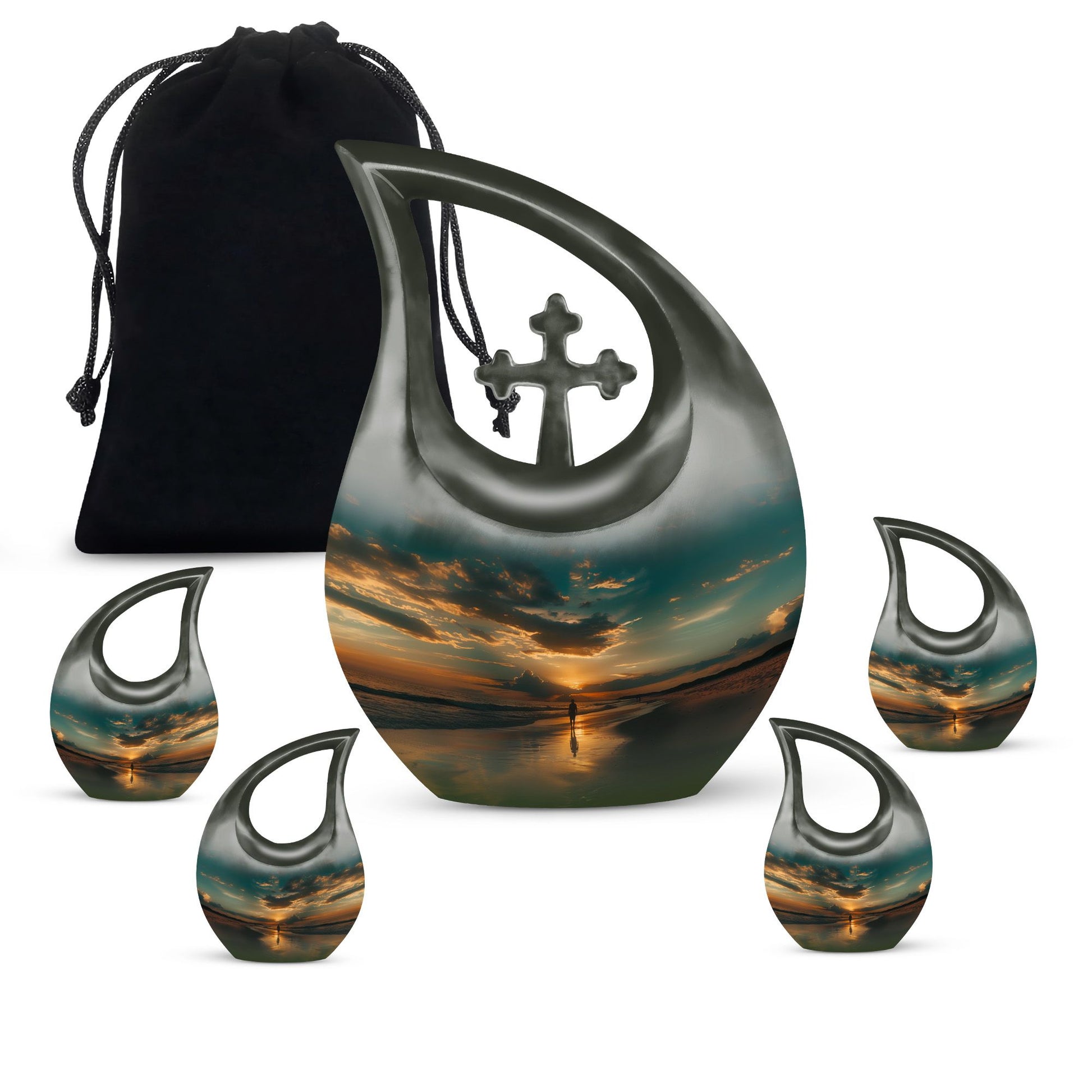 Discover a serene final resting place with our Beach themed Memorial Urn. This large urn, standing 10 inches in height and weighing 3.3 pounds, provides a home for your dearly departed within its 200 cubic inches capacity. Crafted meticulously from high-quality Aluminium, our Cross Drop urn design provides a refined touch to this memorial relic. The urn comes packaged with a velvet pouch, offering a dignified containment for the ashes of your loved one. Further adding to its uniqueness is the customization option, allowing you to personalize the urn with engraved names, bringing a more intimate atmosphere to the remembrance. Whether you're on the lookout for Beach Urns, Keepsake Urns, or Custom Urns for ashes, our offering strikes the perfect balance between aesthetics and quality, whilst offering a place of peaceful remembrance.