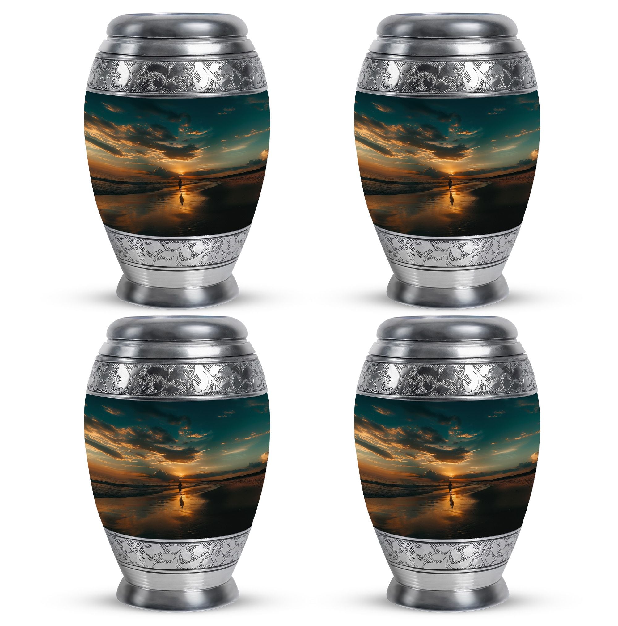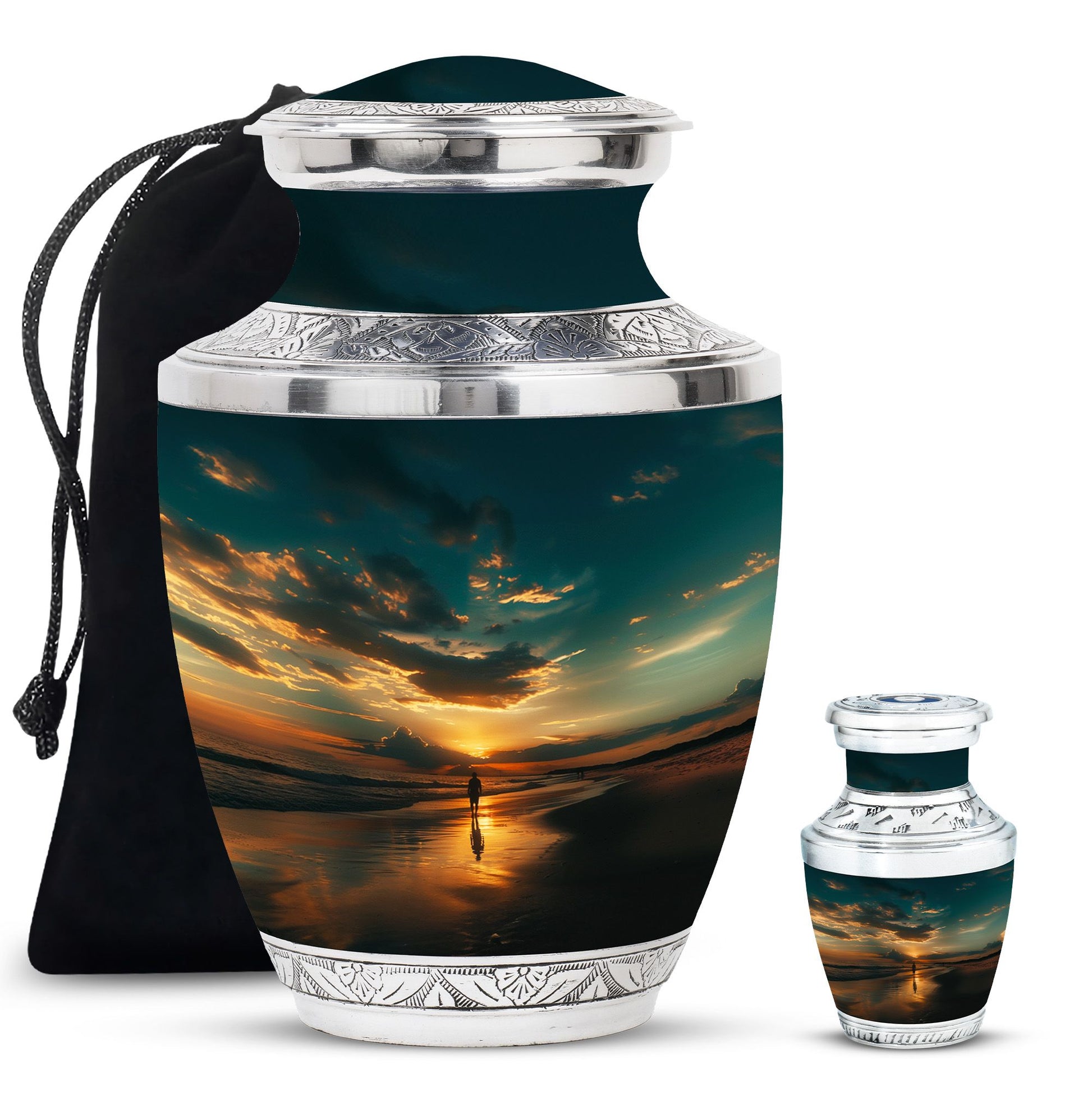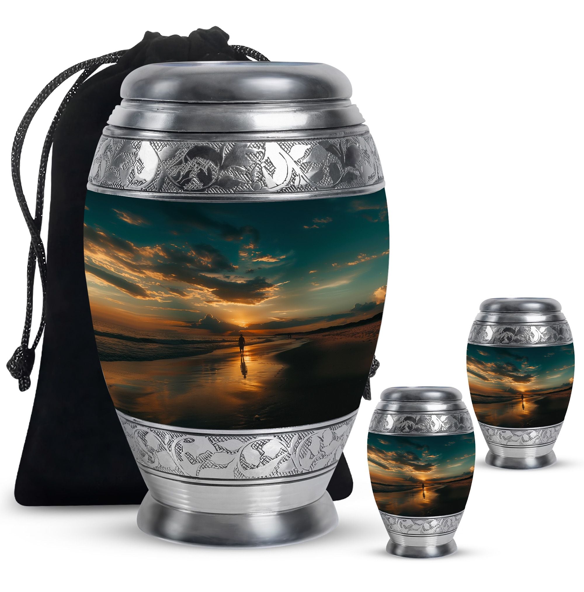Crafted from high-quality aluminium, this urn features a warm sunrise-inspired beach design, symbolizing hope and renewal. Its versatile design suits mens urns for human ashes, funeral urns men, and funeral urns women, while also serving as a beautiful cremation urn women or cremation urn men. The secure screw-top lid ensures ashes remain protected, making it a practical and meaningful choice for memorials at home or burial. Families searching for cremation urns women or a reliable burial urn men will find this piece a comforting tribute.