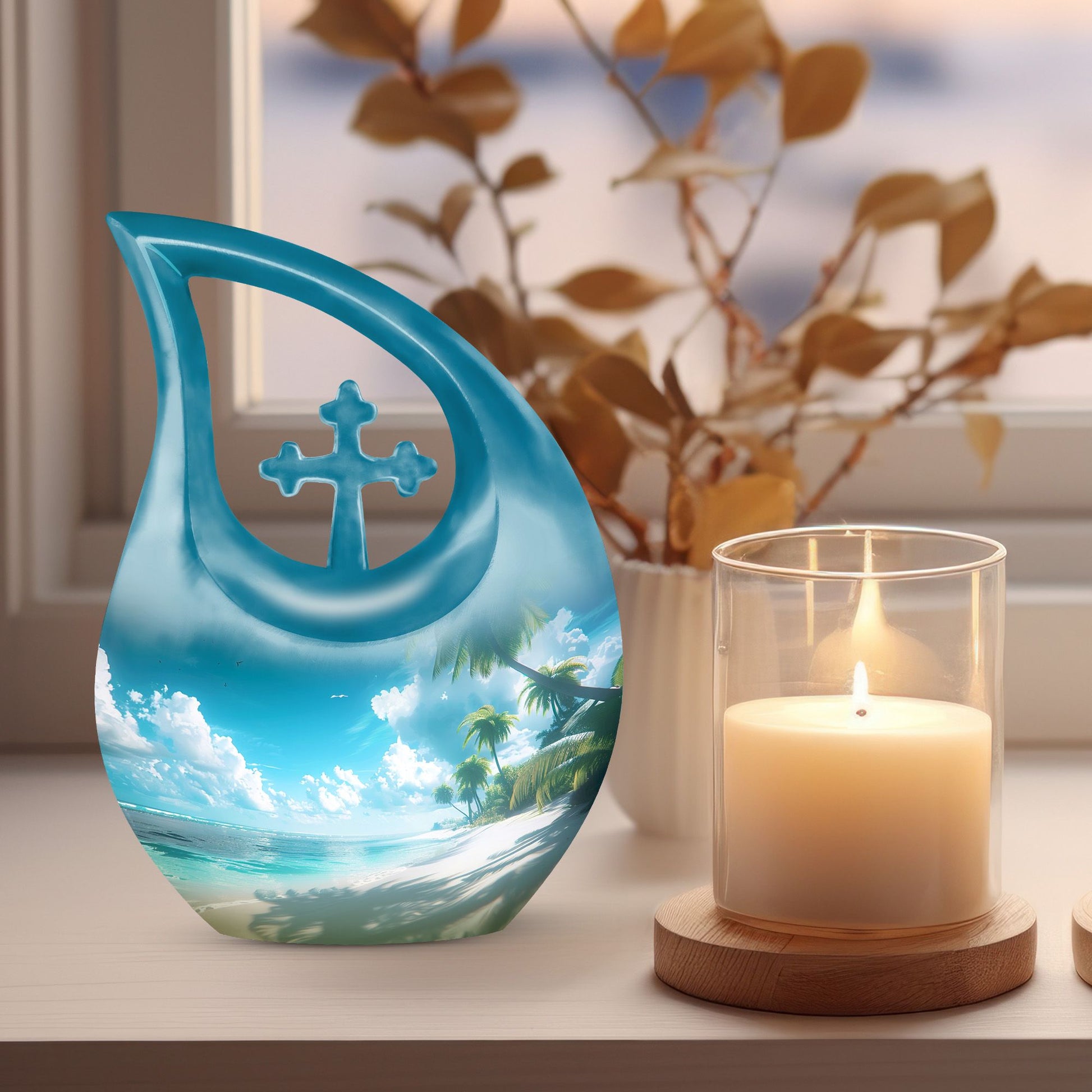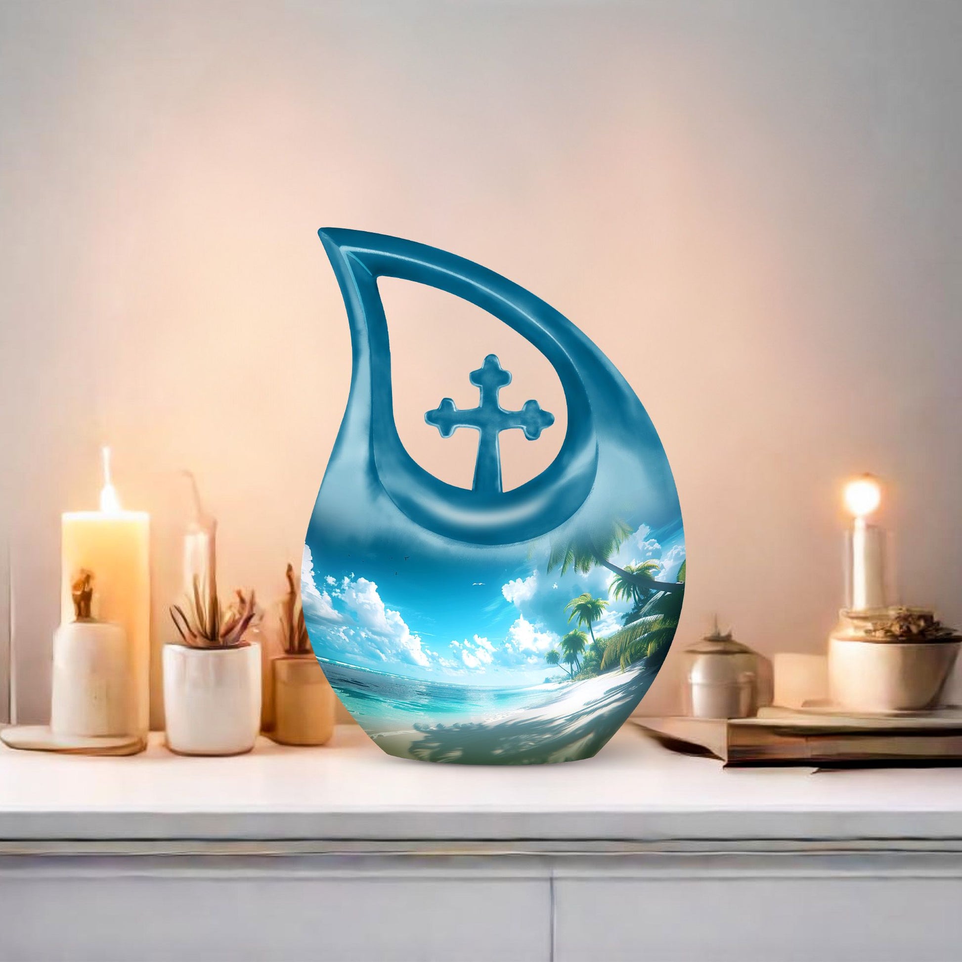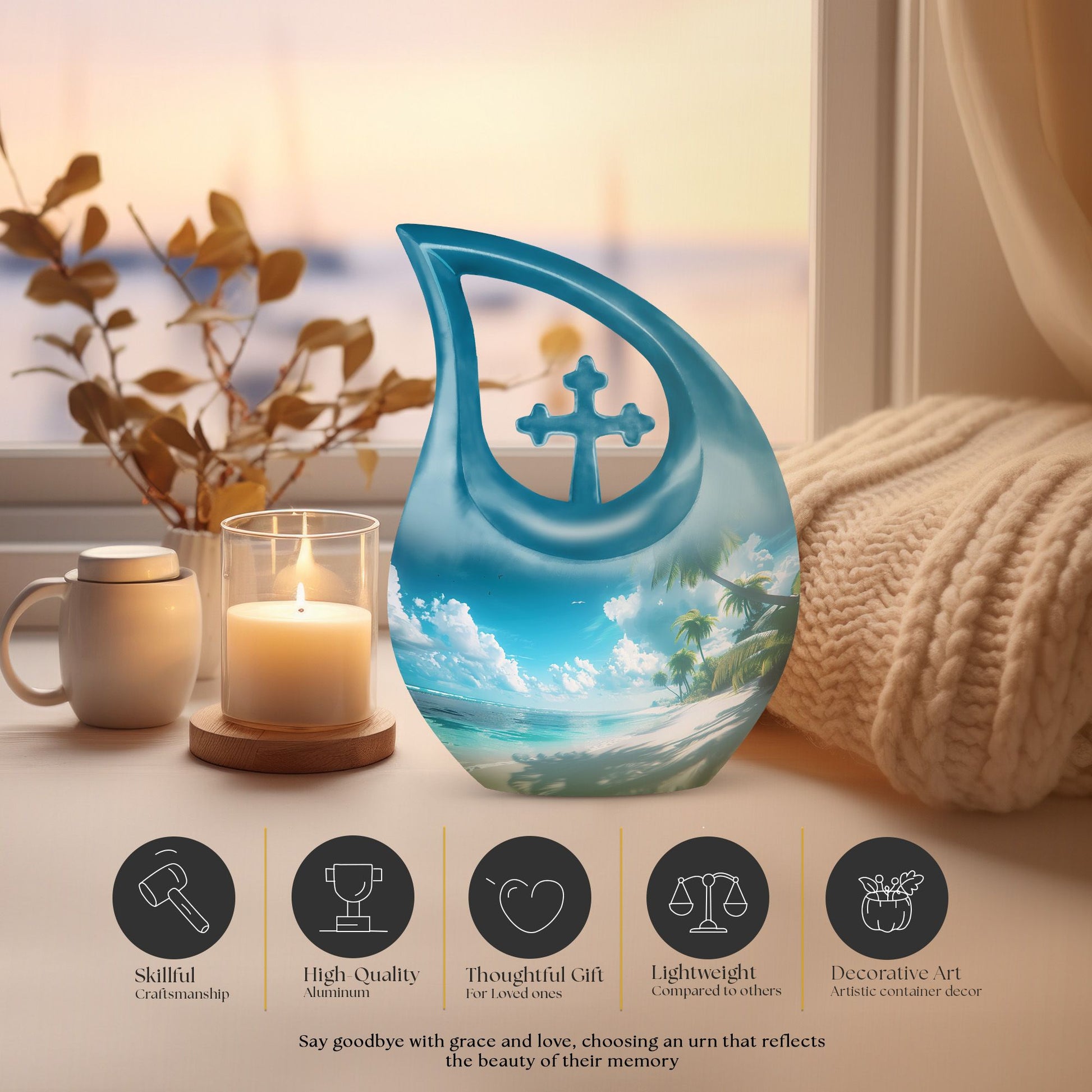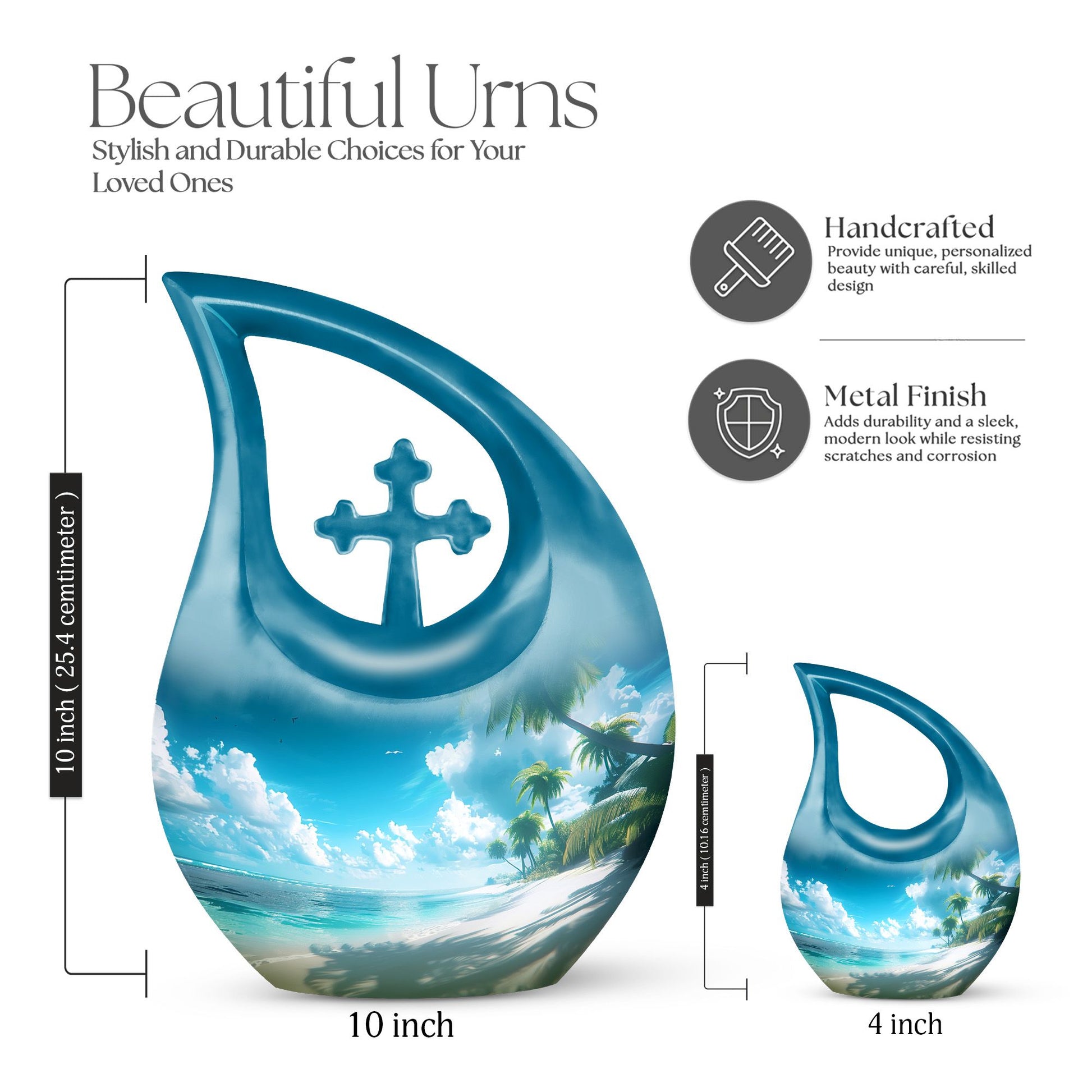 Experience a special way of cherishing a loved one with our 10-inch Beach Urn. The artisanal Cross Drop motif serves as a tranquil reminder of the peaceful rest of those departed. Weighing a stable 3.3 pounds, the urn is not just an iconic symbol, but a grand home for the final rest of your cherished person. It offers ample space, accommodating up to 200 cubic inches. This urn is meticulously crafted from durable aluminium material, ensuring a lasting tribute. Its unique beach theme brings a serene connection with nature. This large urn complements personal sense of style and respect, especially when personalized with engraved names. Included in the package is a velvet pouch, specially tailored for the dignified containment of ashes. Whether you're in search of Affordable Cremation and Burial Urns, a Biodegradable Urn, or simply a precious Ashes Keepsake, this affordable urn makes a heartfelt and meaningful choice.
