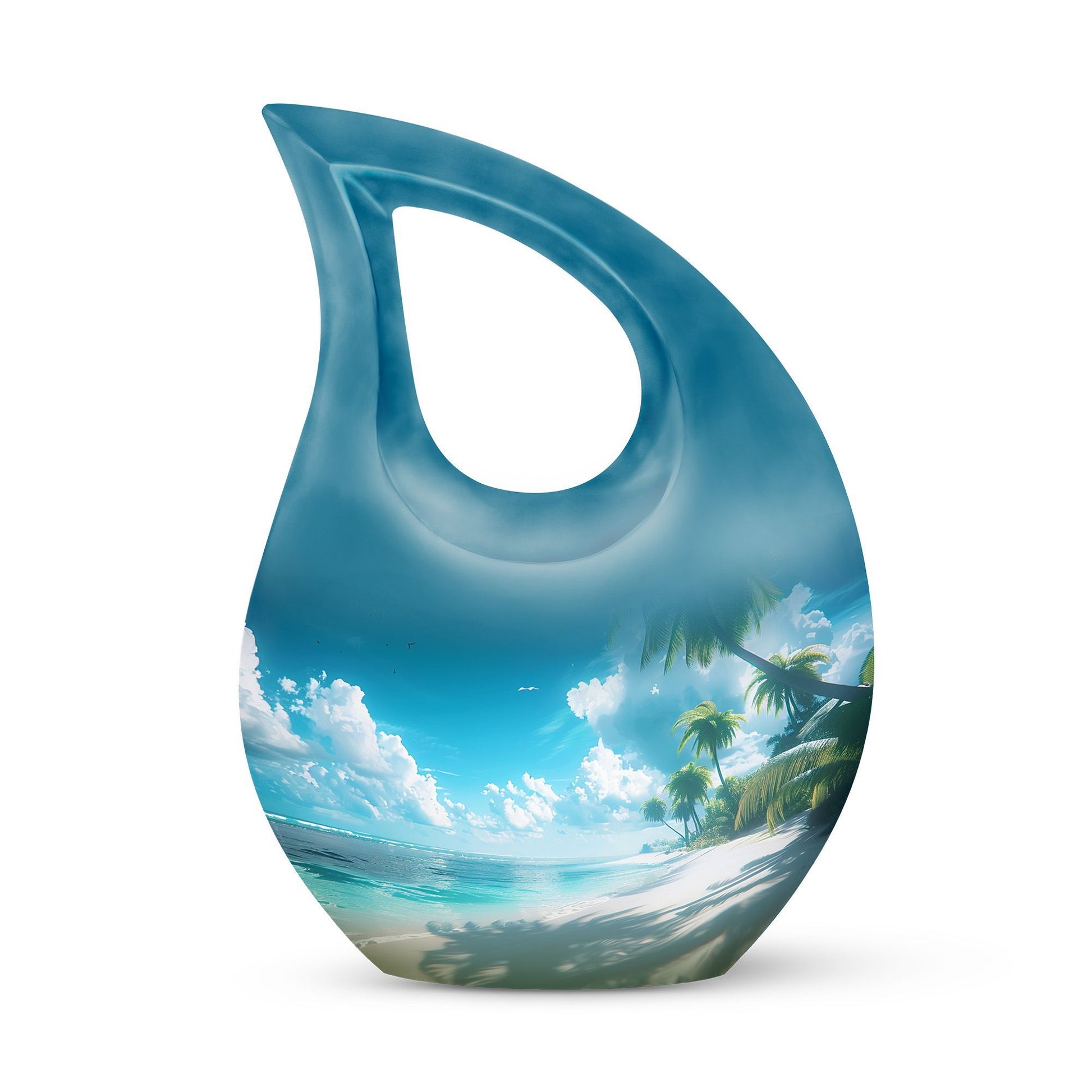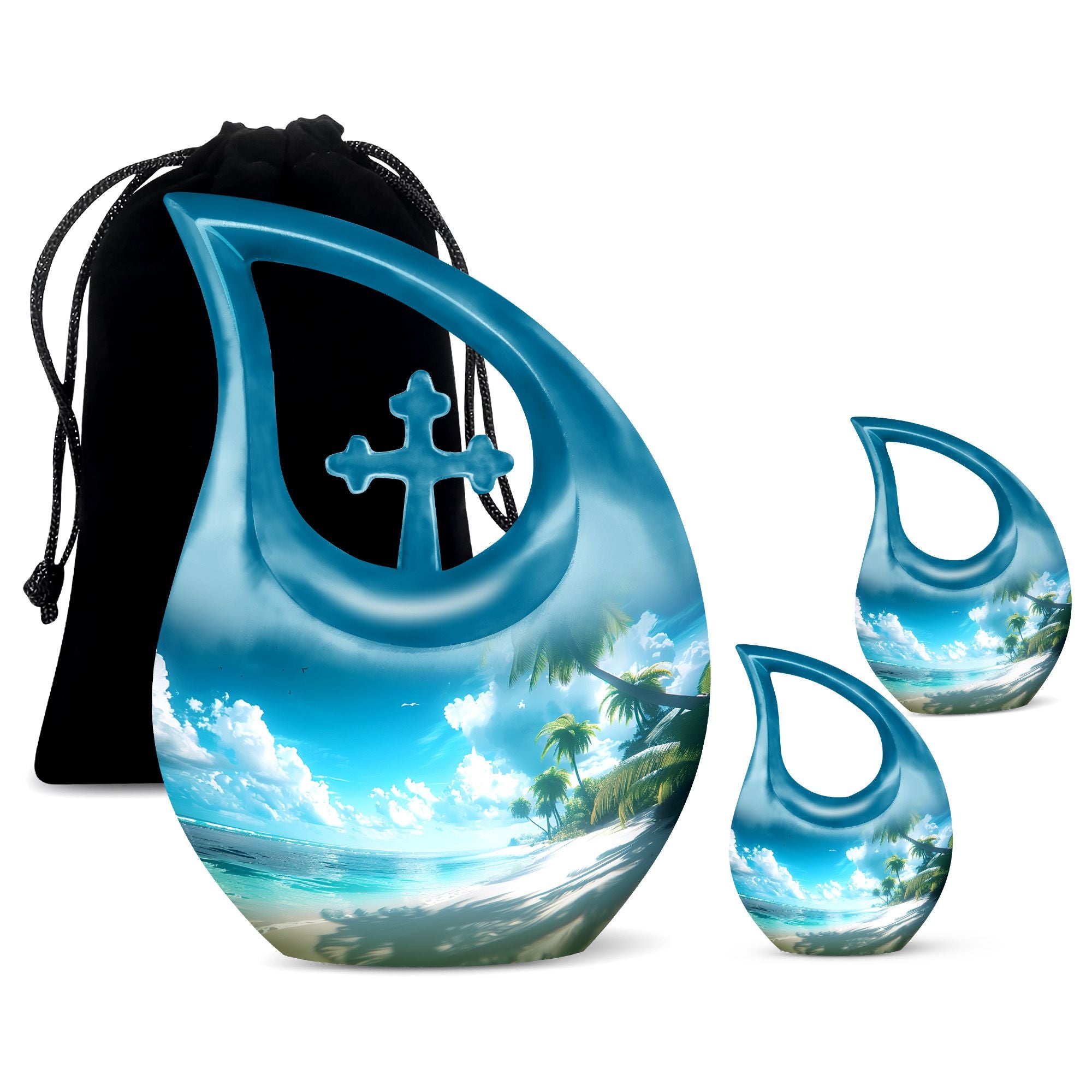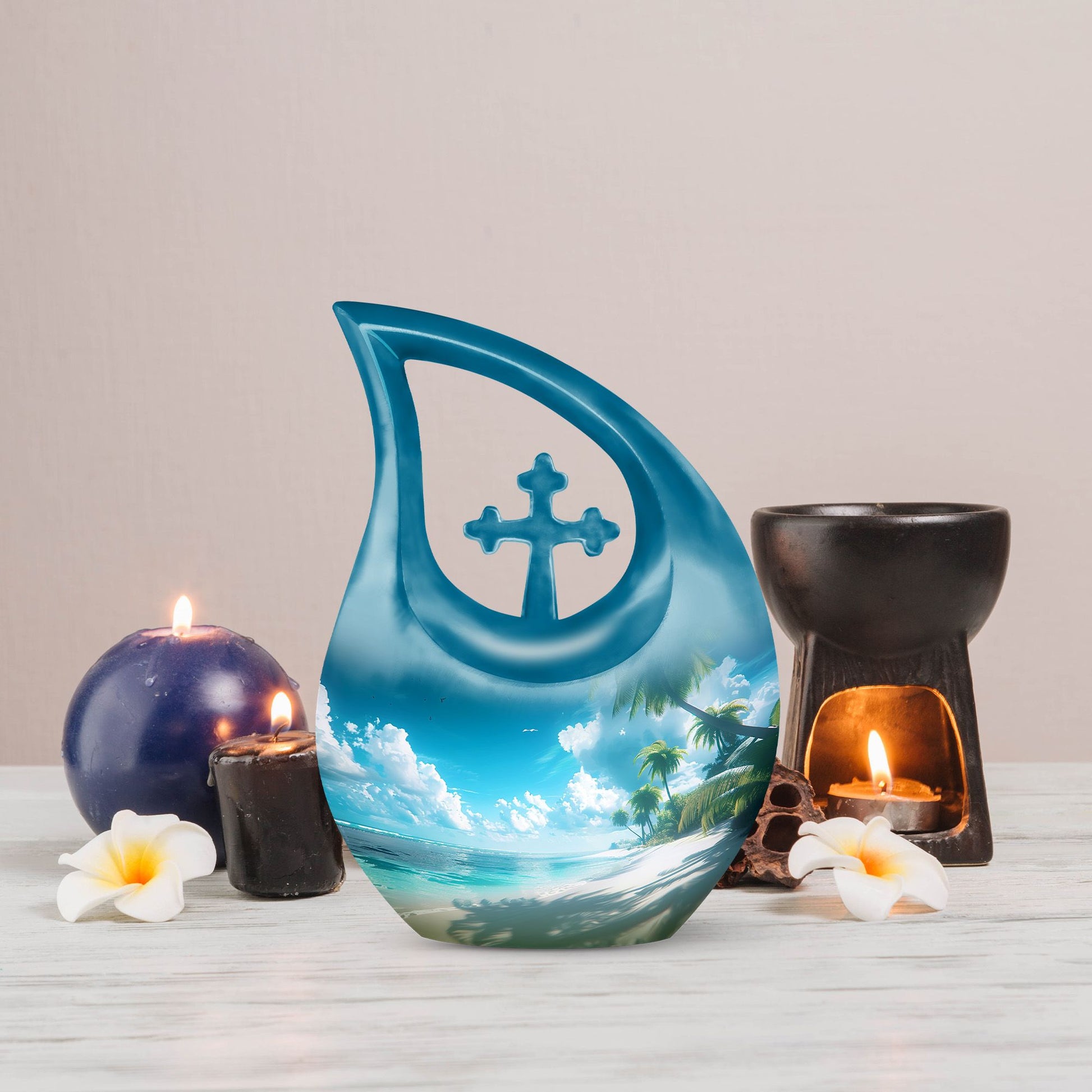 Experience a special way of cherishing a loved one with our 10-inch Beach Urn. The artisanal Cross Drop motif serves as a tranquil reminder of the peaceful rest of those departed. Weighing a stable 3.3 pounds, the urn is not just an iconic symbol, but a grand home for the final rest of your cherished person. It offers ample space, accommodating up to 200 cubic inches. This urn is meticulously crafted from durable aluminium material, ensuring a lasting tribute. Its unique beach theme brings a serene connection with nature. This large urn complements personal sense of style and respect, especially when personalized with engraved names. Included in the package is a velvet pouch, specially tailored for the dignified containment of ashes. Whether you're in search of Affordable Cremation and Burial Urns, a Biodegradable Urn, or simply a precious Ashes Keepsake, this affordable urn makes a heartfelt and meaningful choice.