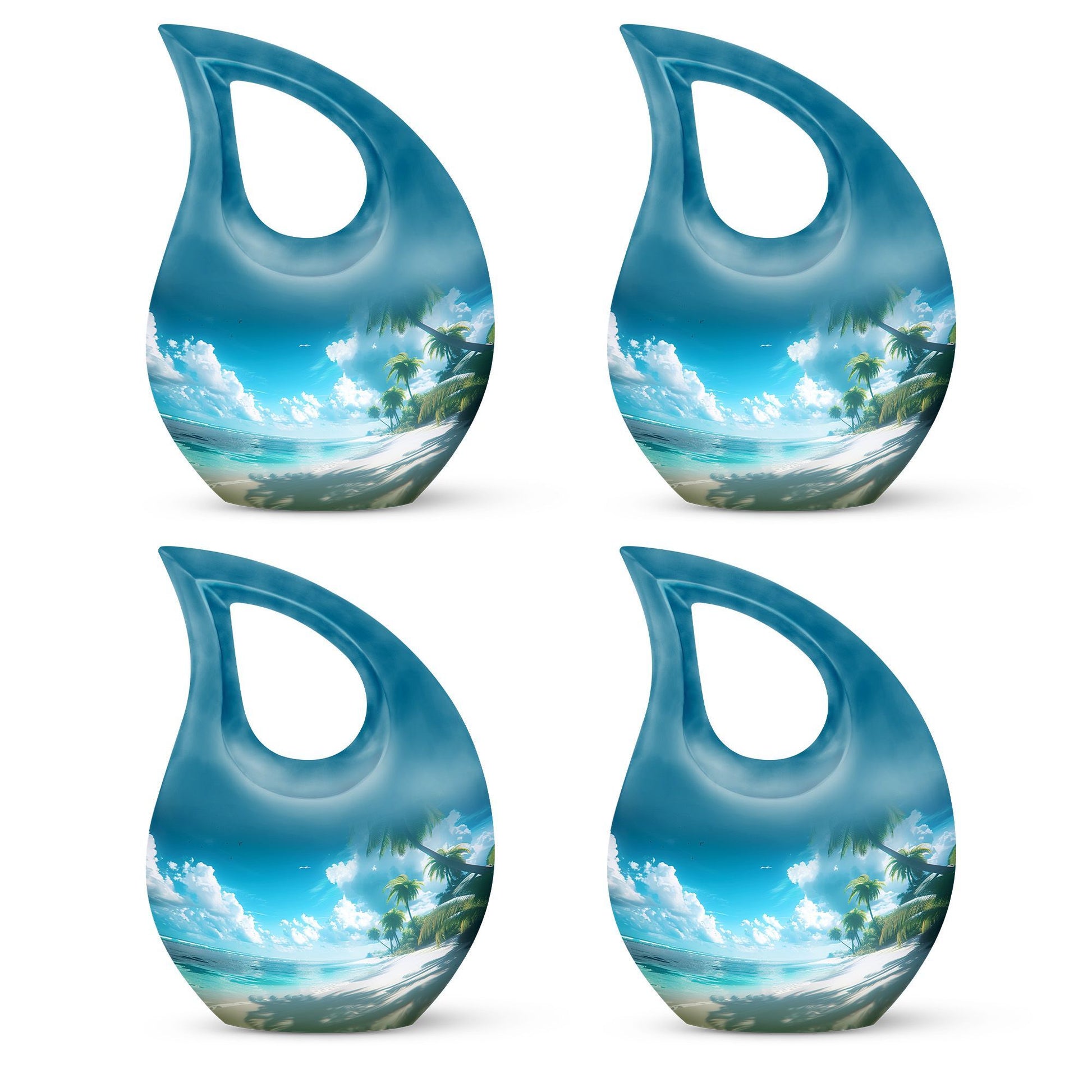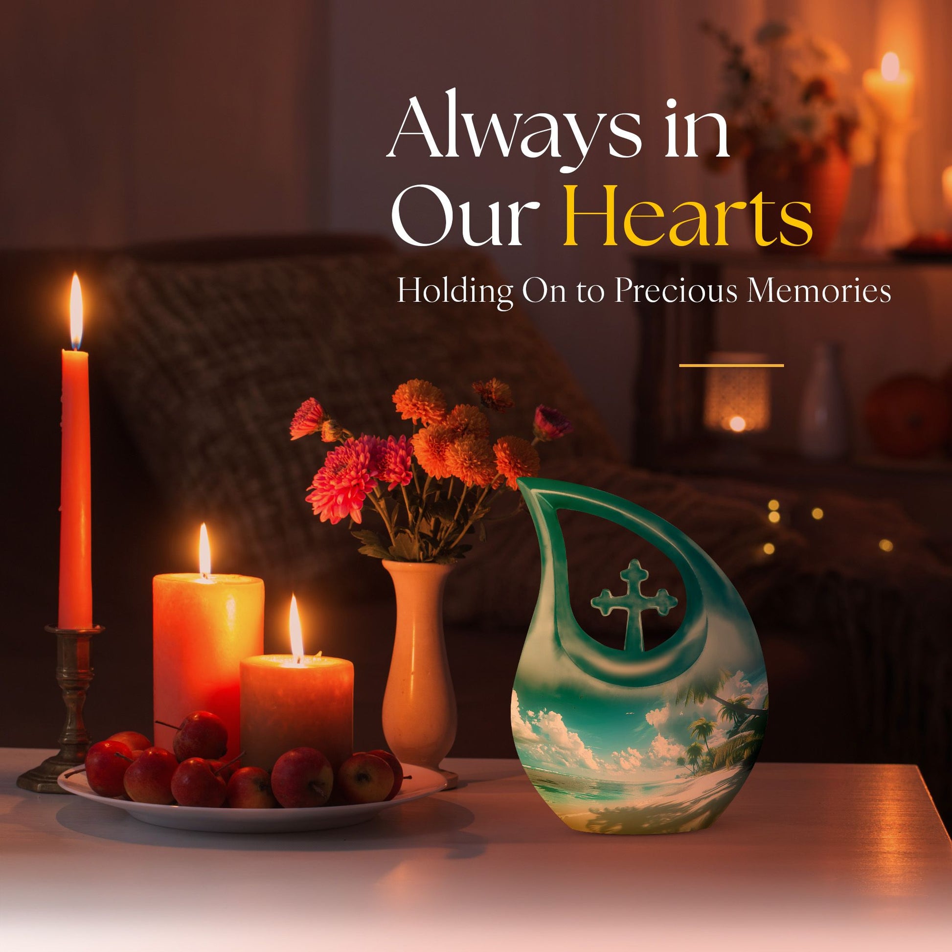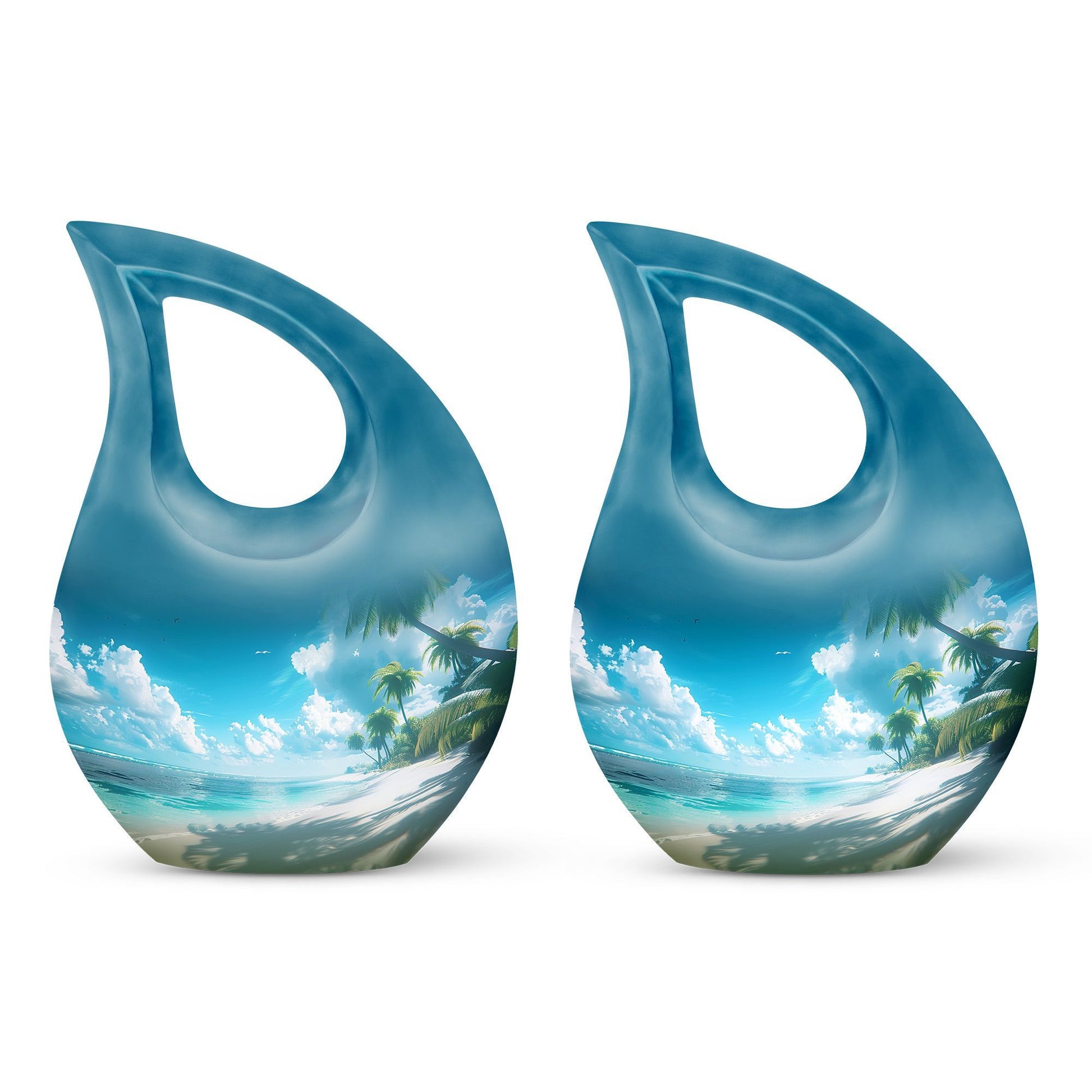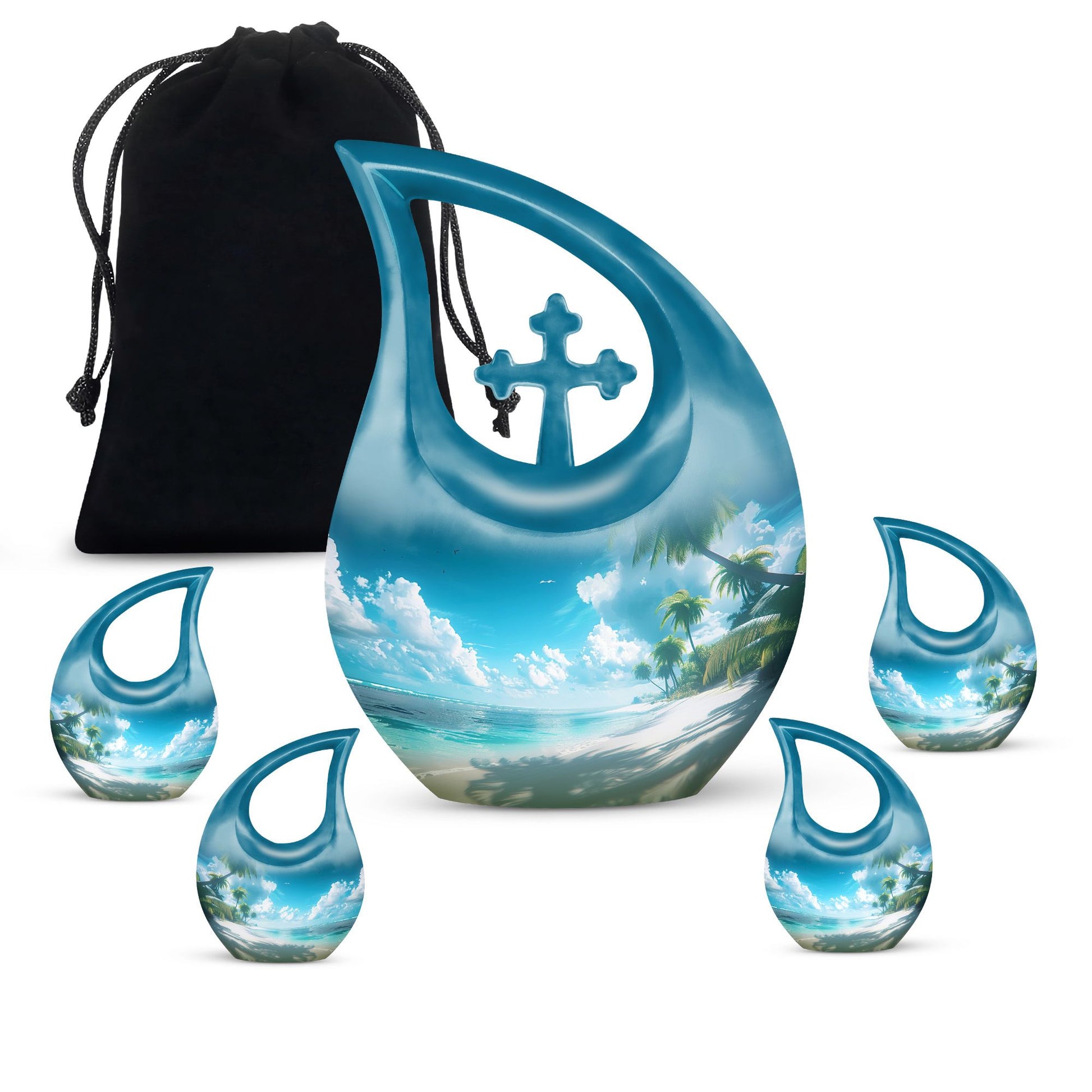 Experience a special way of cherishing a loved one with our 10-inch Beach Urn. The artisanal Cross Drop motif serves as a tranquil reminder of the peaceful rest of those departed. Weighing a stable 3.3 pounds, the urn is not just an iconic symbol, but a grand home for the final rest of your cherished person. It offers ample space, accommodating up to 200 cubic inches. This urn is meticulously crafted from durable aluminium material, ensuring a lasting tribute. Its unique beach theme brings a serene connection with nature. This large urn complements personal sense of style and respect, especially when personalized with engraved names. Included in the package is a velvet pouch, specially tailored for the dignified containment of ashes. Whether you're in search of Affordable Cremation and Burial Urns, a Biodegradable Urn, or simply a precious Ashes Keepsake, this affordable urn makes a heartfelt and meaningful choice.