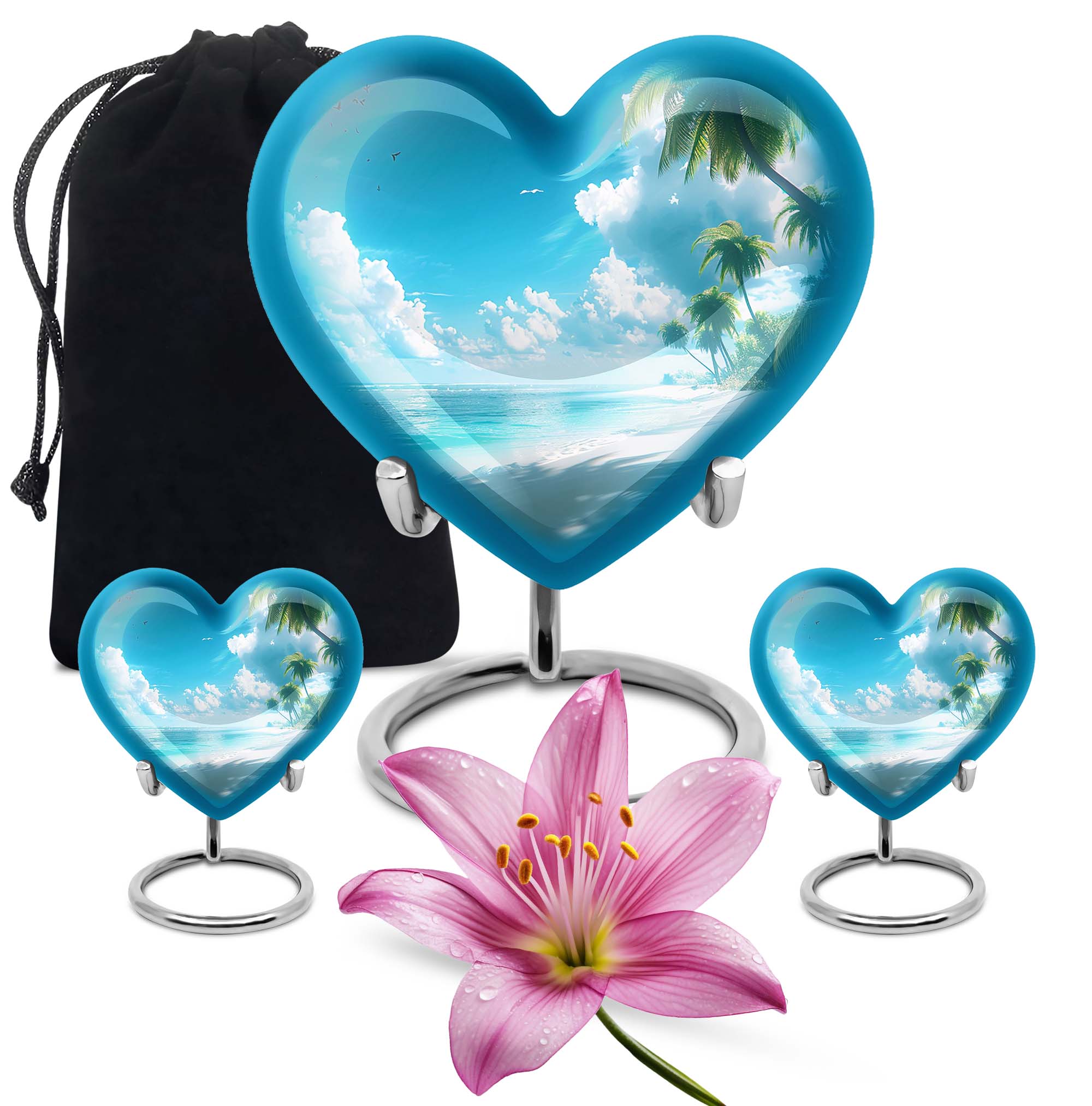 Commemorate your loved ones and keep them close to your heart with this exquisitely crafted 10-Inch Beach Urn. This large urn is meticulously fabricated using the finest Aluminium, lending it an enduring quality. Weighing a mere 3.3 pounds, it is aptly sized for your convenience. Irrespective of whether you seek 'funeral urns for burial' or 'cremation urn for Dad', our Beach Urn capably addresses your needs. This heart urn, with its dimension of 10 inches in height and a capacity of 200 cubic inches, resonates with heartfelt symbolism. Discretely secure the ashes in the provided velvet pouch, enhancing the sanctity of the urn. Our urns can be personalized with the engraved names of the departed - a stoic reminder of their eternal presence. Befitting the remembrance of lived moments, the urn effloresces life's essence with its floral theme. This 'memorial urn' is more than just an 'urn for human adult'; it's a tribute to the unceasing bonds that outlive time itself. Veering away from traditional 'burial urns for cremation ashes', our 'adult burial cremation urns' affirm the adage, 'love never dies'.