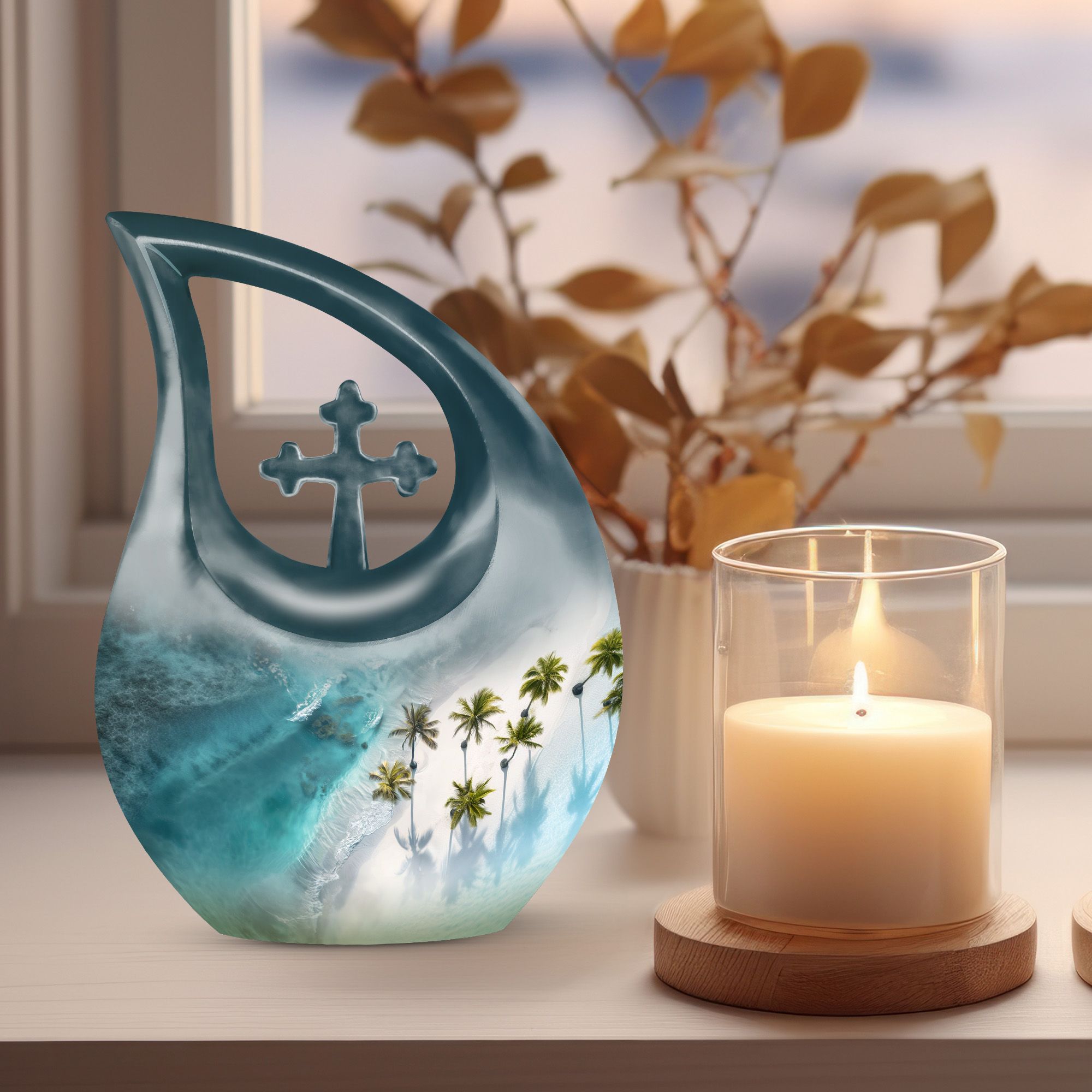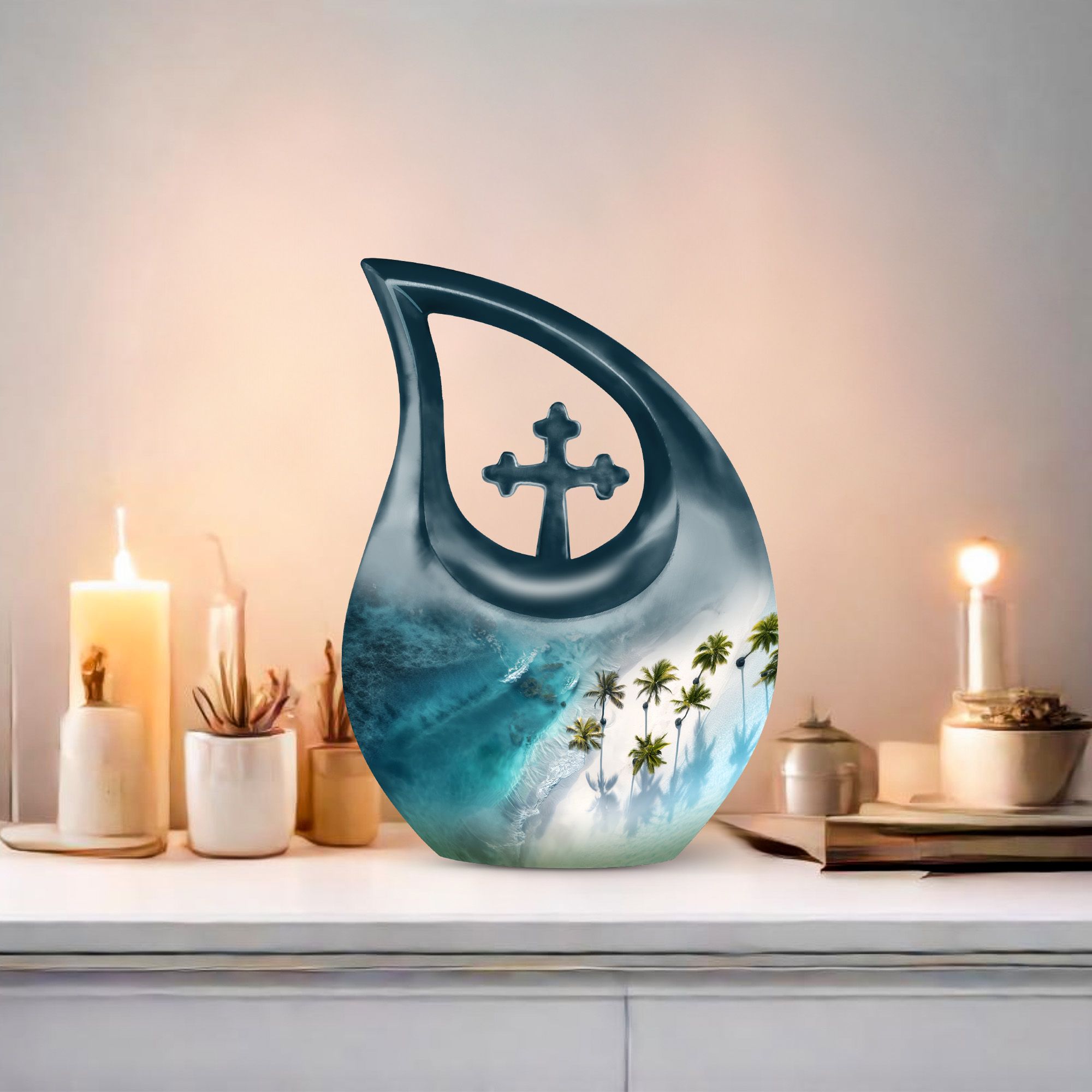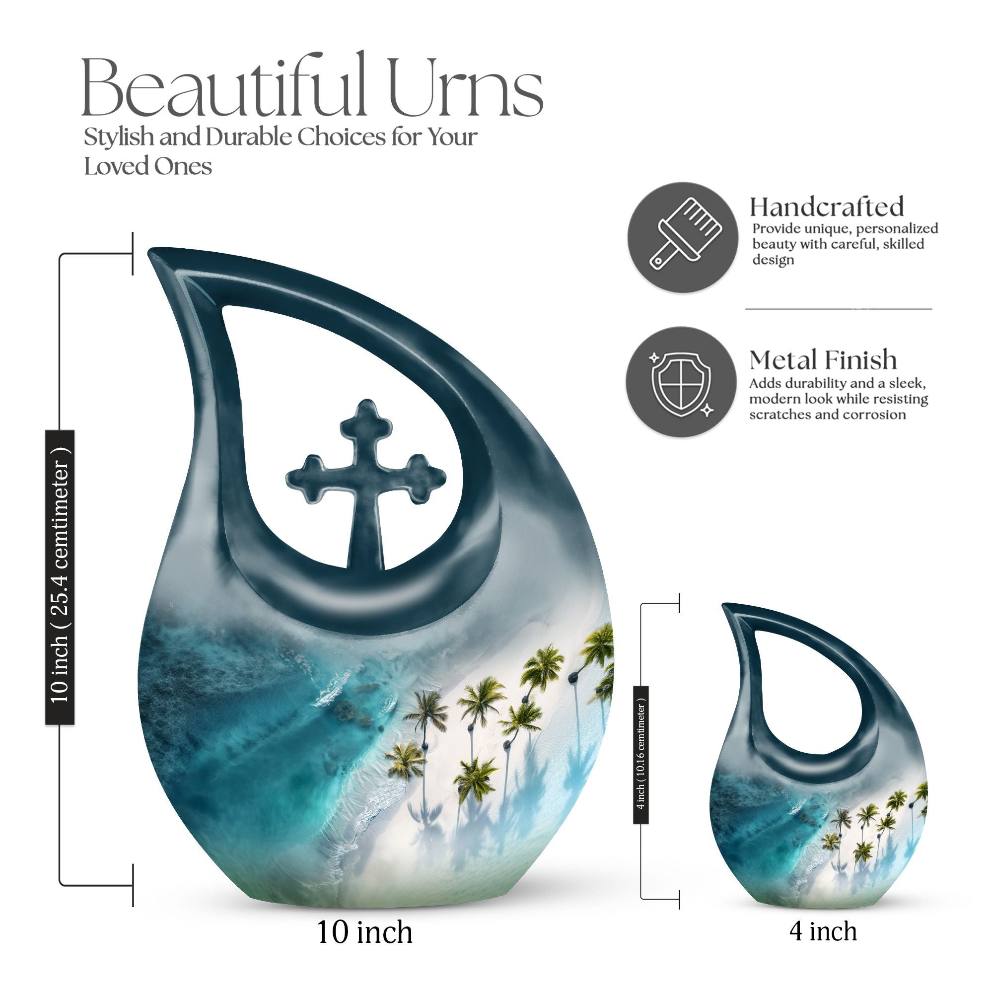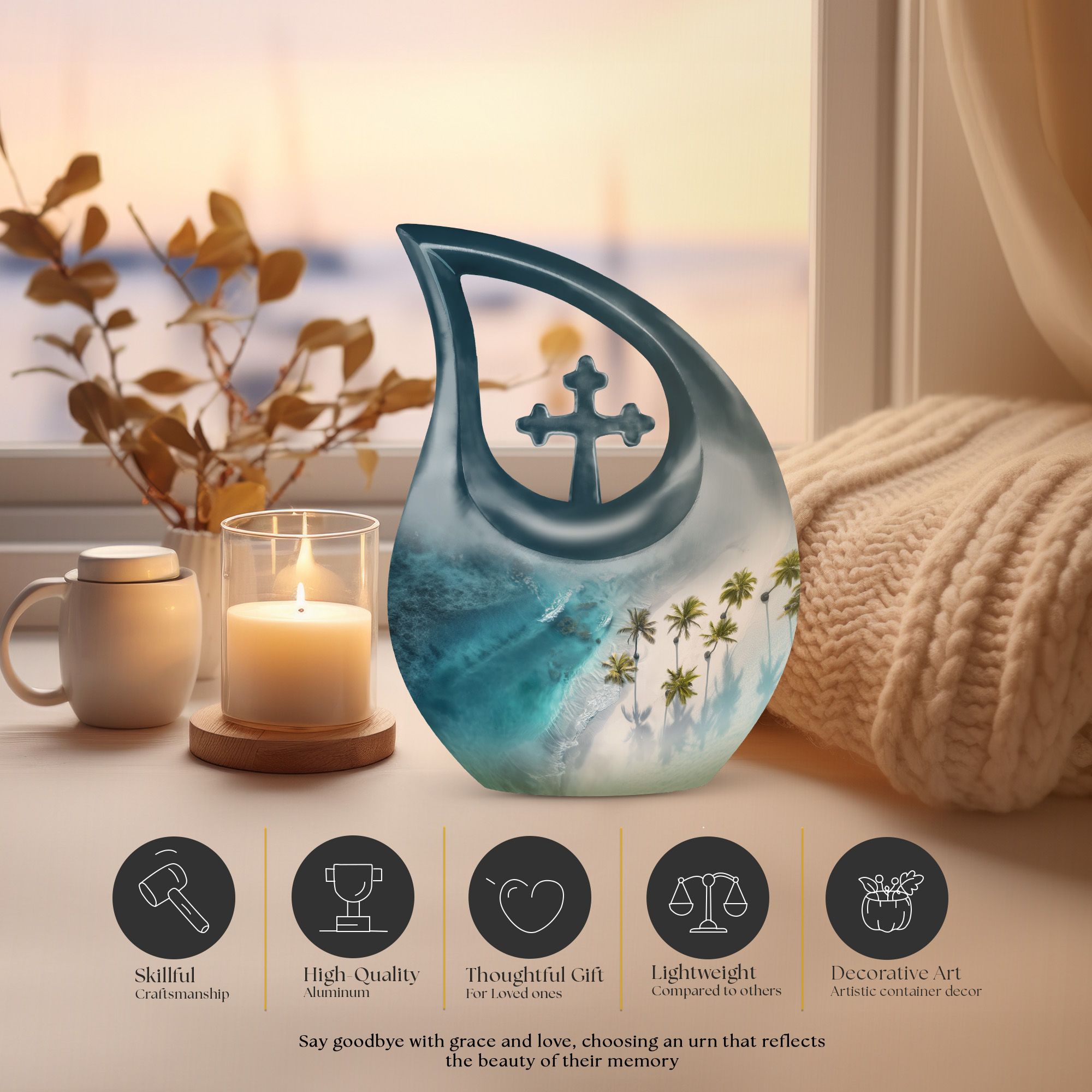 Construct the ideal memorial for your cherished loved one with our Beach Urn, a unique find among memorial urns. Made from durable aluminium, this 10-inch urn is not only stylish but also sturdy, with a weight of 3.3 pounds. Standout with its 'Cross Drop' design, our urn is fitting for those seeking a peaceful and serene memorial piece. It holds up to 200 cubic inches of ashes and comes in a velvet pouch for safe containment. This large urn can be customized to suit your personal preference – you can engrave names to make this tribute even more meaningful and personal. Suitable even for those searching for small urns for ashes, mini urns for ashes, or Purple urns. This urn is a beautiful blend of devotion, style, and durability, creating the perfect resting place for your loved one. Note: While 'Design' is not emphasized, its tangible attributes are.