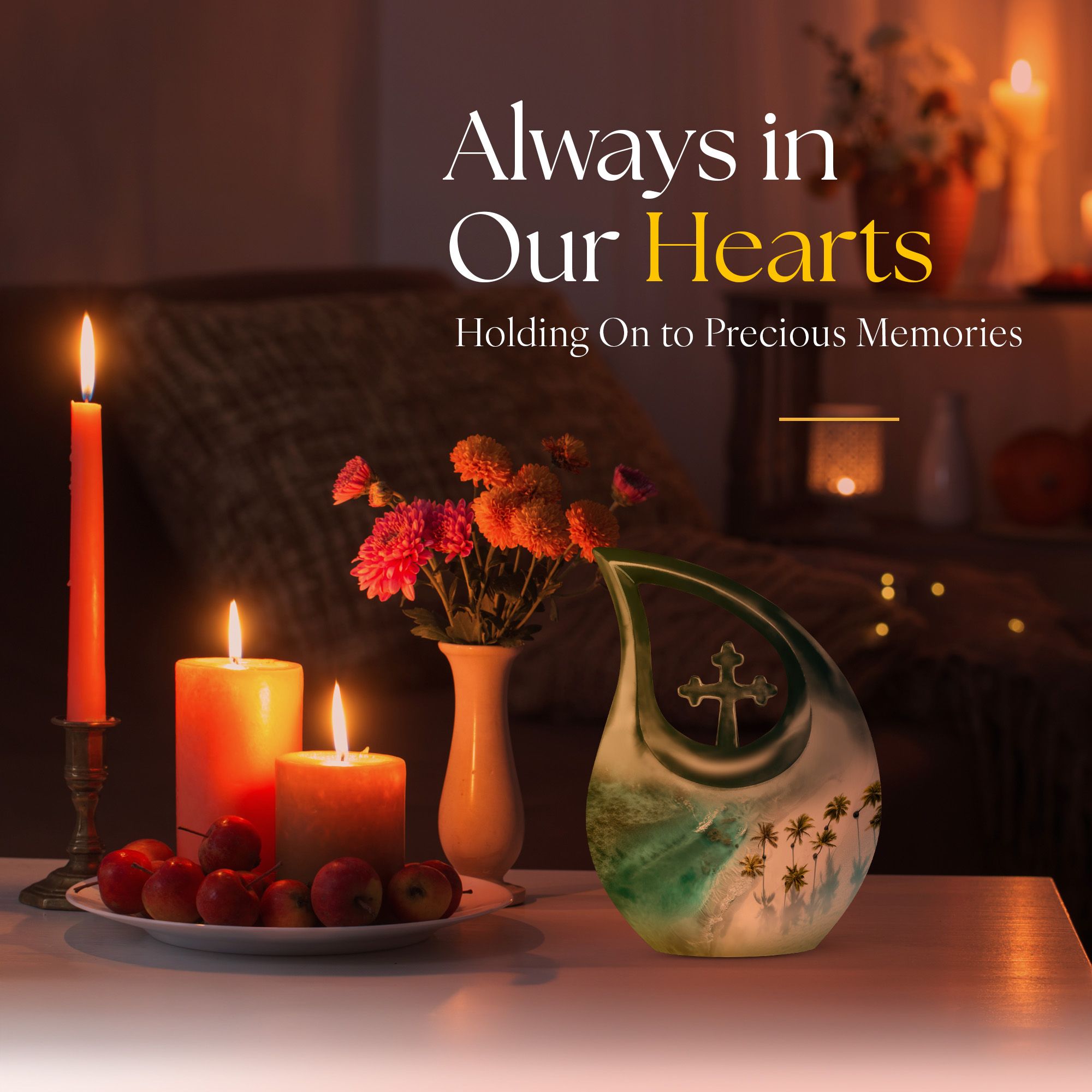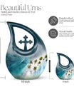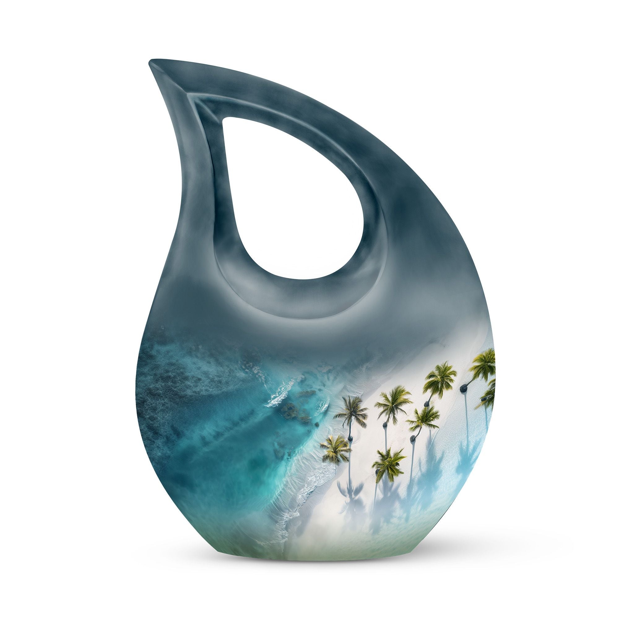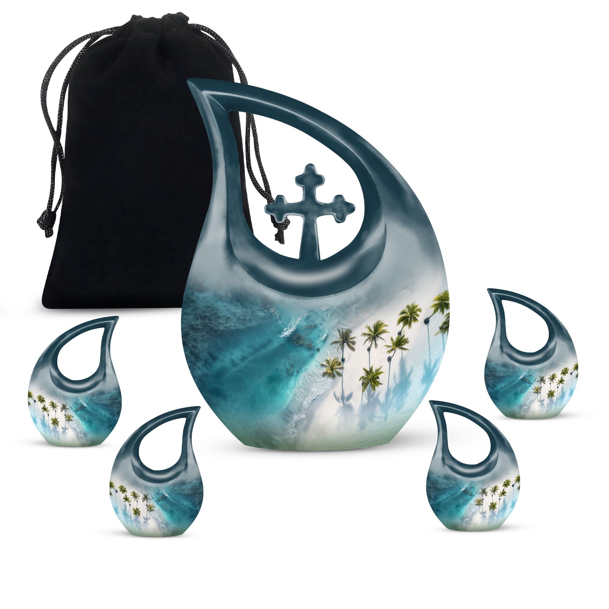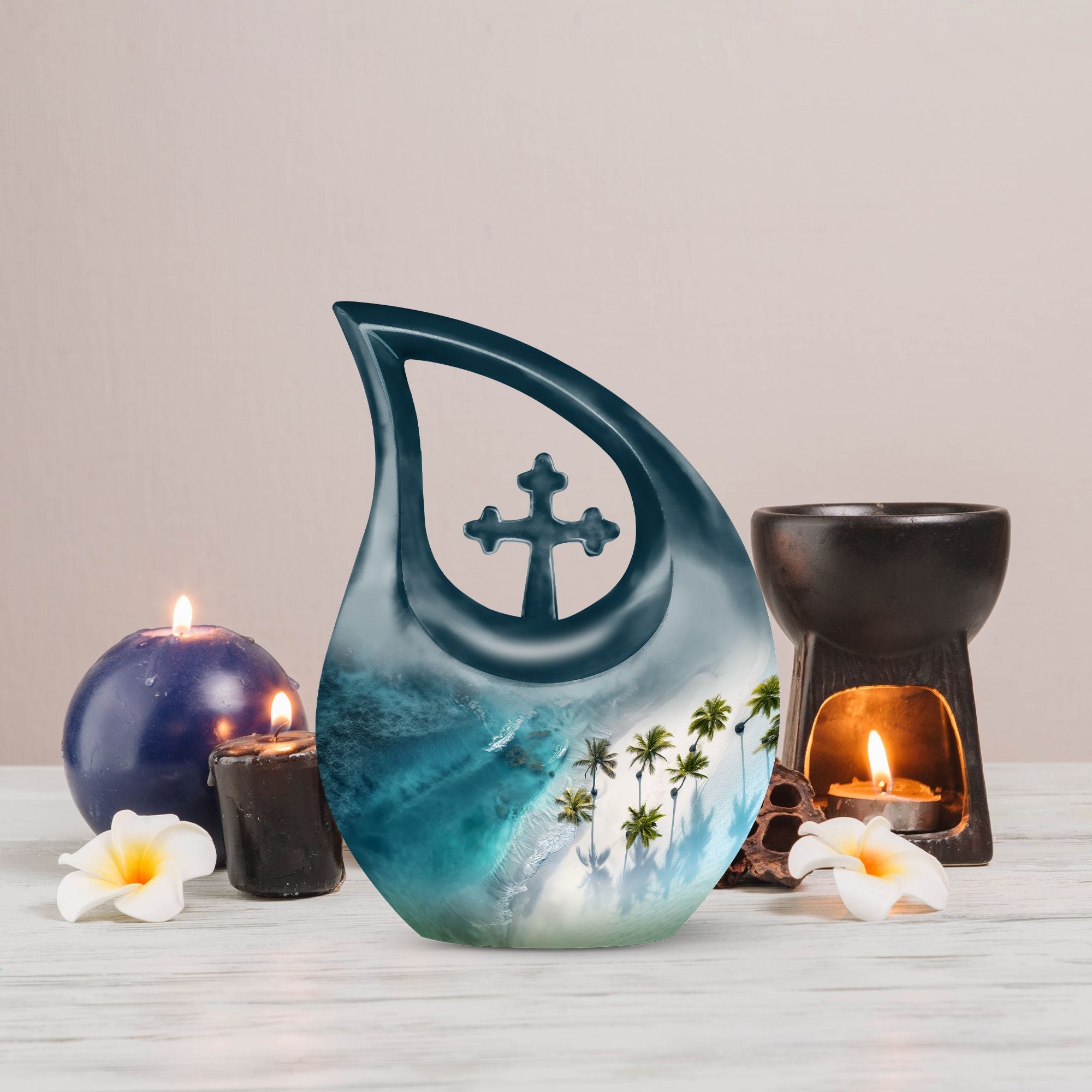 Construct the ideal memorial for your cherished loved one with our Beach Urn, a unique find among memorial urns. Made from durable aluminium, this 10-inch urn is not only stylish but also sturdy, with a weight of 3.3 pounds. Standout with its 'Cross Drop' design, our urn is fitting for those seeking a peaceful and serene memorial piece. It holds up to 200 cubic inches of ashes and comes in a velvet pouch for safe containment. This large urn can be customized to suit your personal preference – you can engrave names to make this tribute even more meaningful and personal. Suitable even for those searching for small urns for ashes, mini urns for ashes, or Purple urns. This urn is a beautiful blend of devotion, style, and durability, creating the perfect resting place for your loved one. Note: While 'Design' is not emphasized, its tangible attributes are.