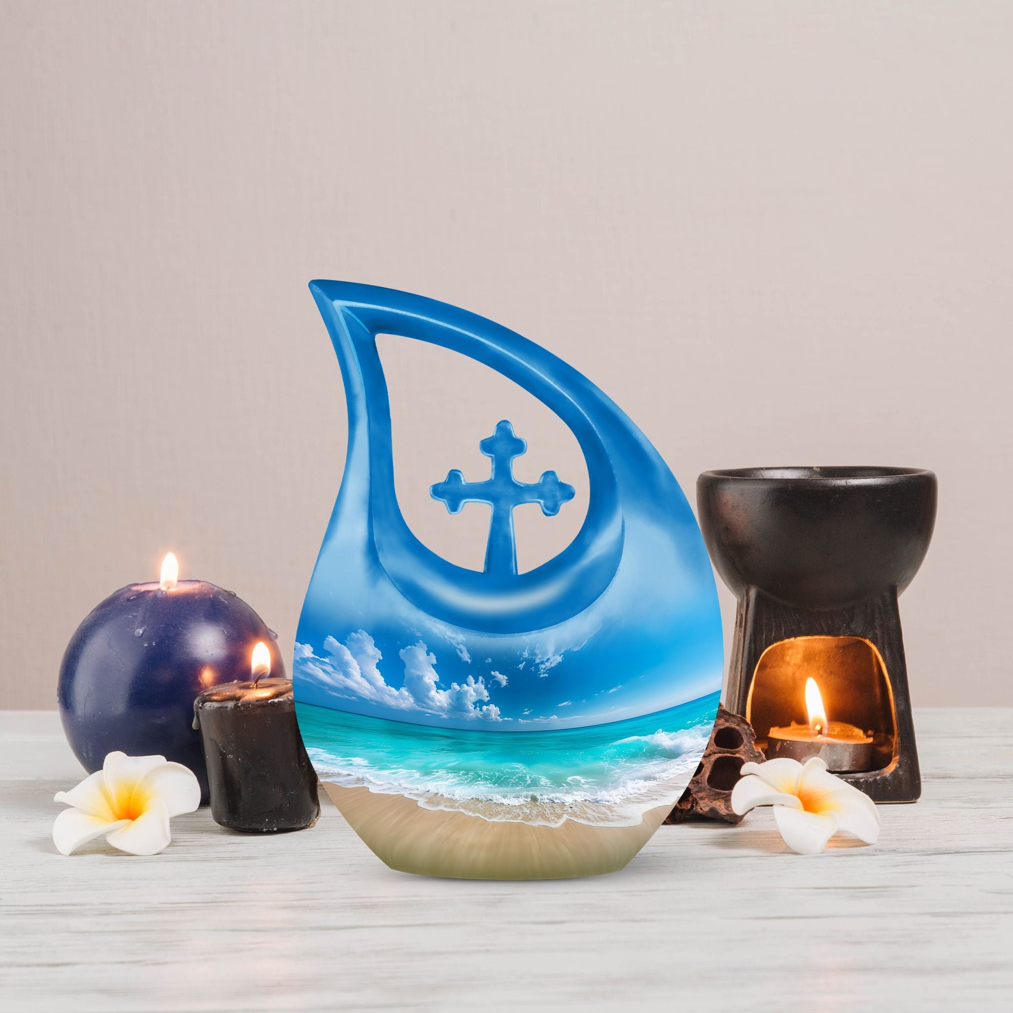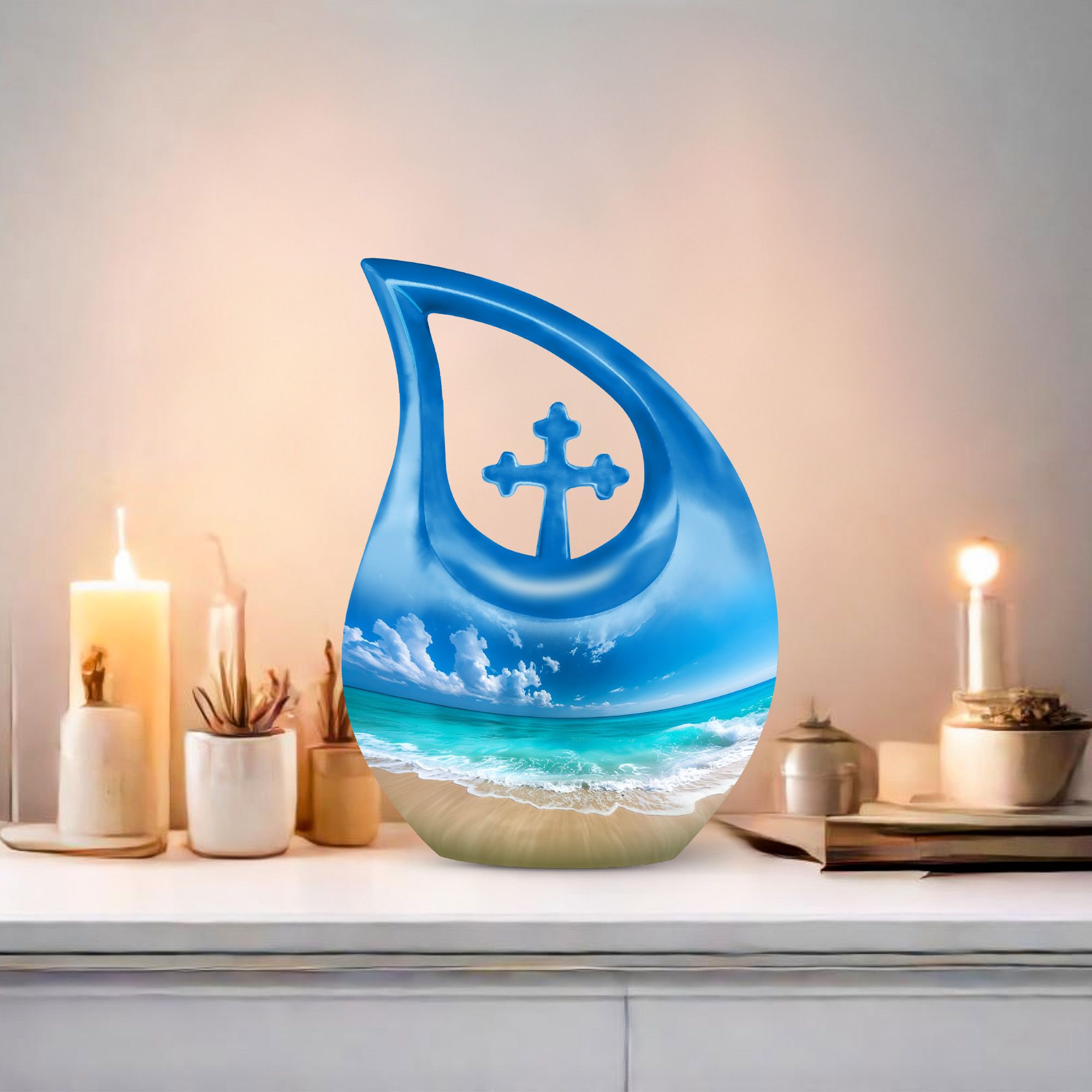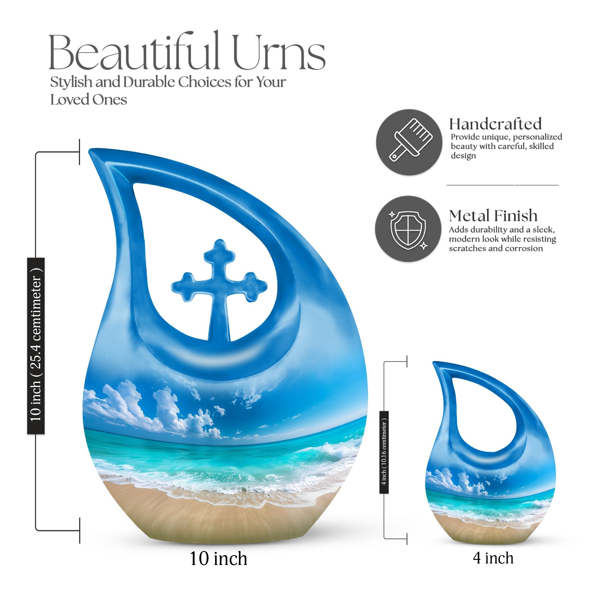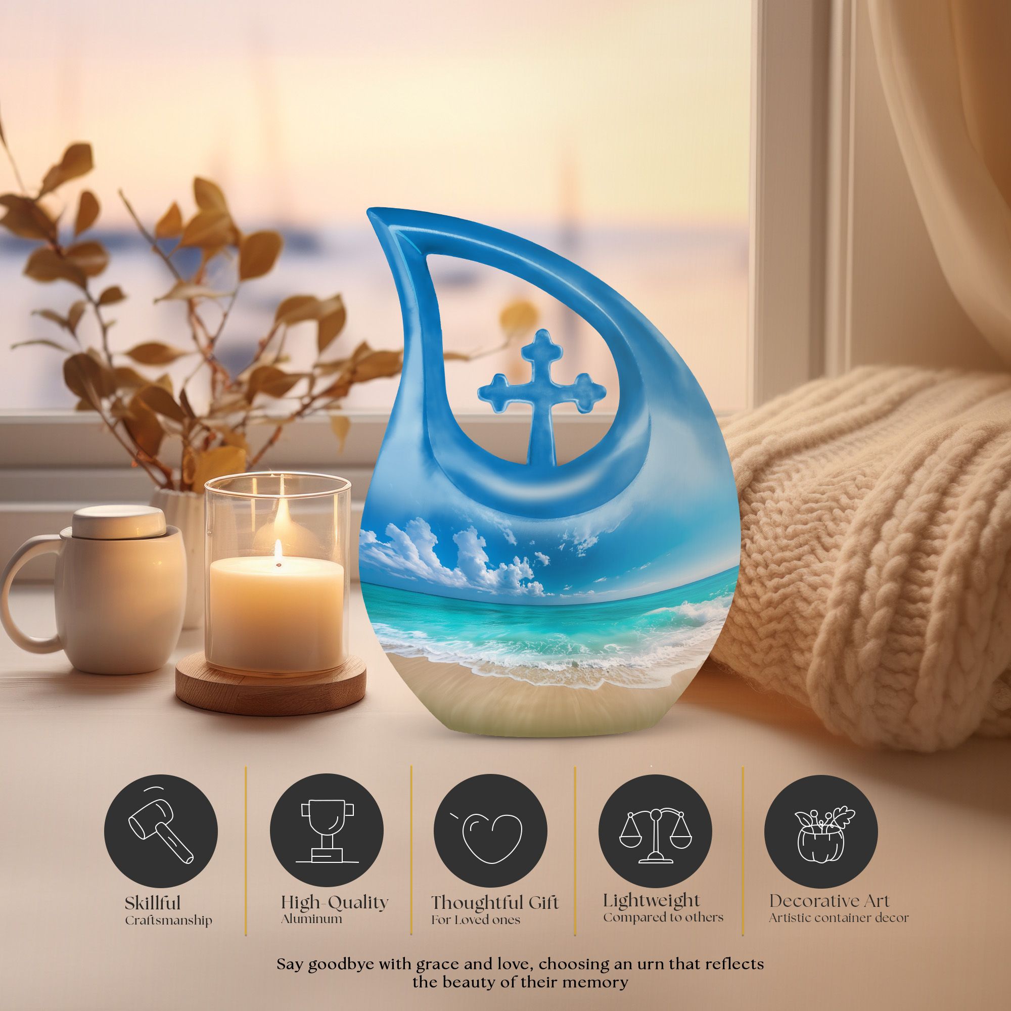Experience the serene tribute to your loved ones with our Beach themed urn made of robust aluminium. This large, 10-inch urn brandishes a distinguished Cross Drop design, portraying a quiet dignity for the departed. The urn weighs a sturdy 3.3 pounds and stands tall at 10 inches in height, with a capacity to contain up to 200 cubic inches of ashes. Moreover, with an opportunity to personalize it, you can engrave the name of your loved one for a unique touch. It also comes with a velvet pouch, ensuring the subtle containment of the ashes. This affordable cremation urn is more than just a memorial urn—it is a final home for your dearly departed loved one, embodying their memory in a tangible form. Moreover, it stands out as a beach urn, offering a sense of peace and tranquility. As for affordability, we offer nothing short of cheaper funeral urns for sale without compromising on the quality of the urn. This product caters perfectly to those on the lookout for small urns for ashes that provide value for your money.