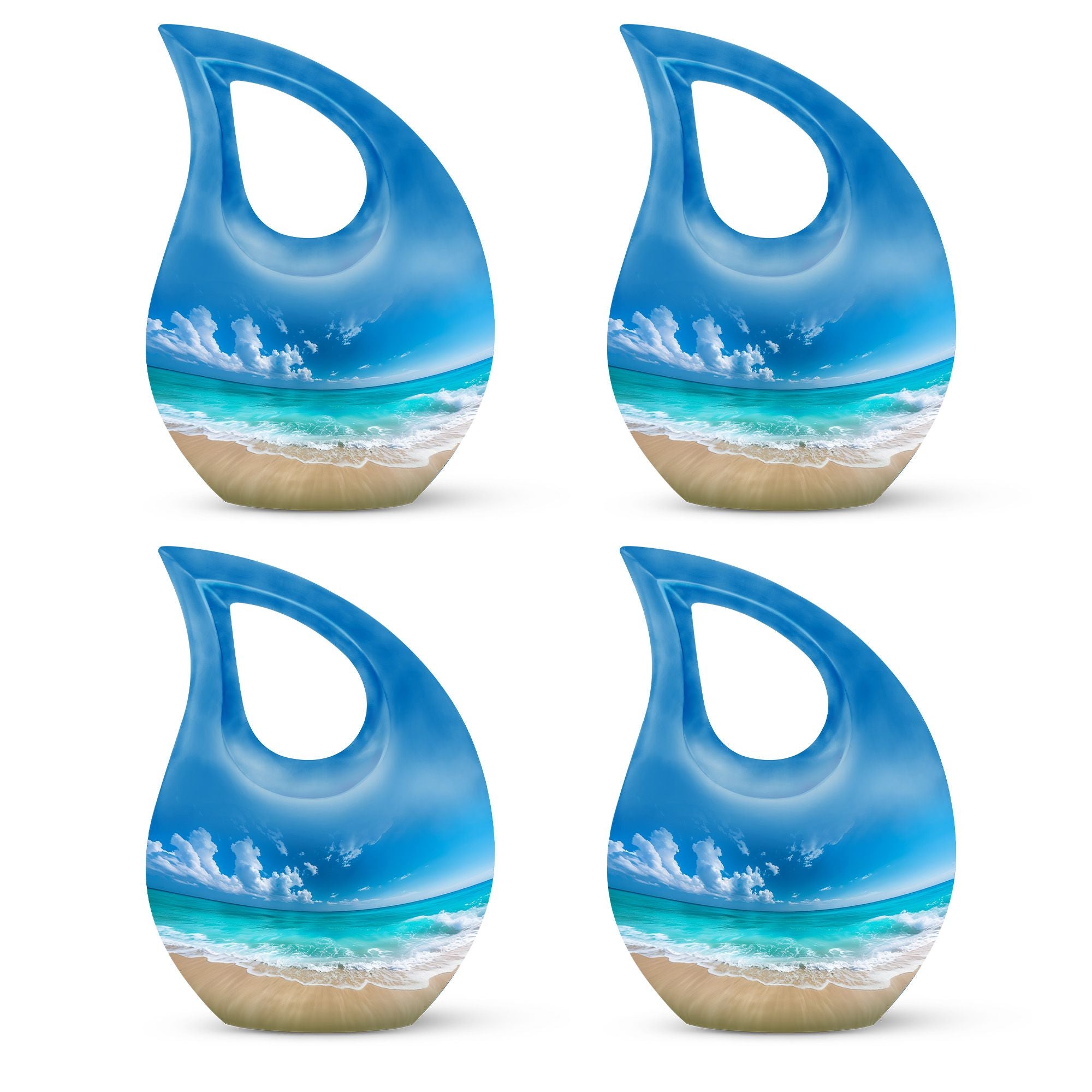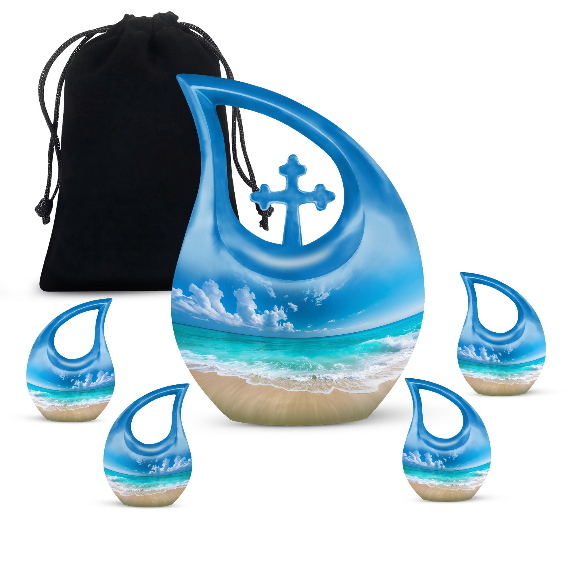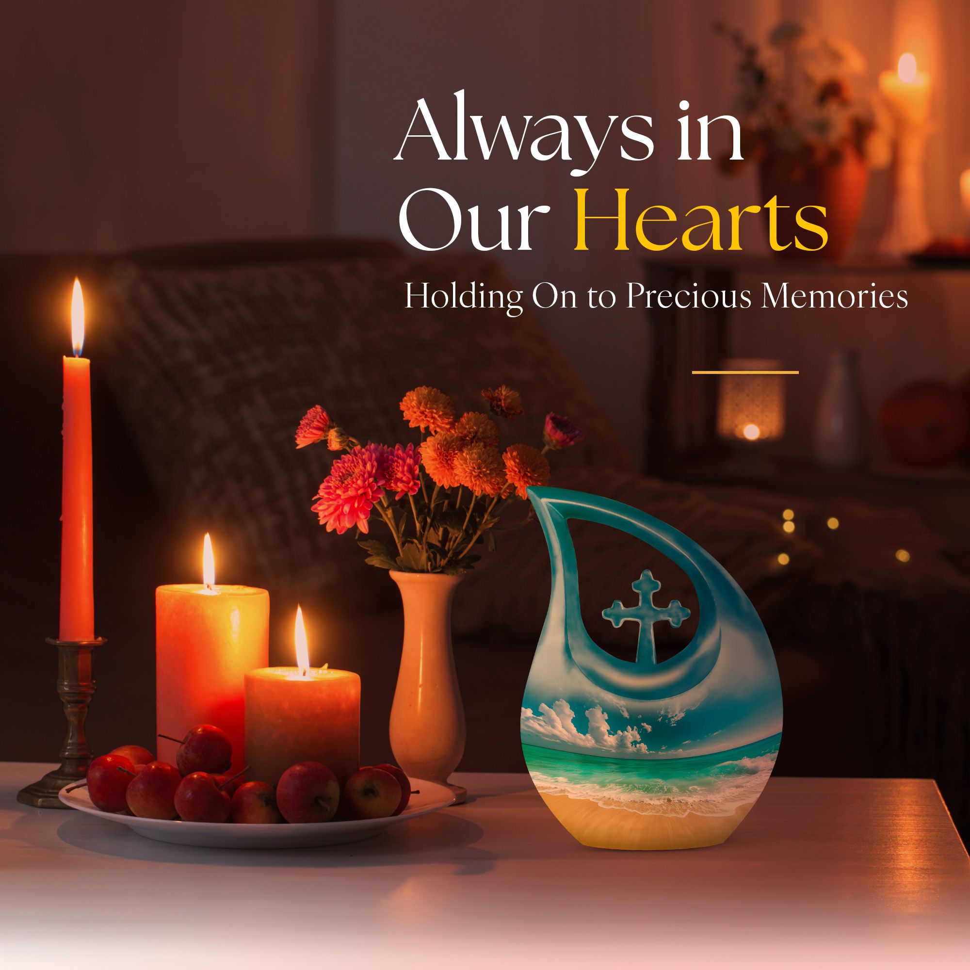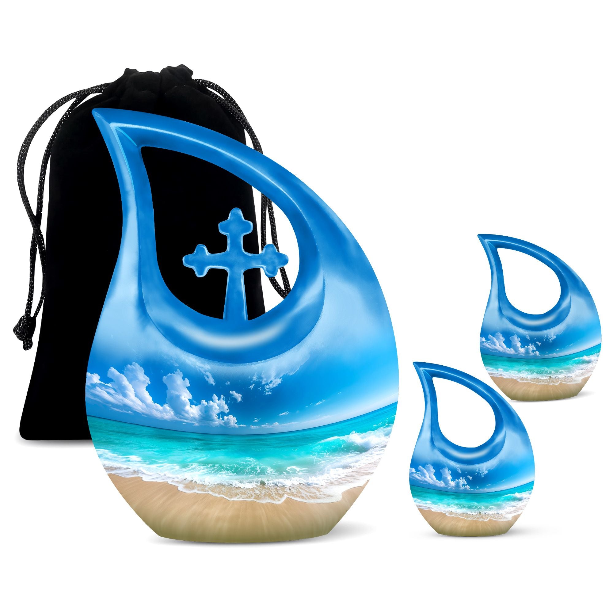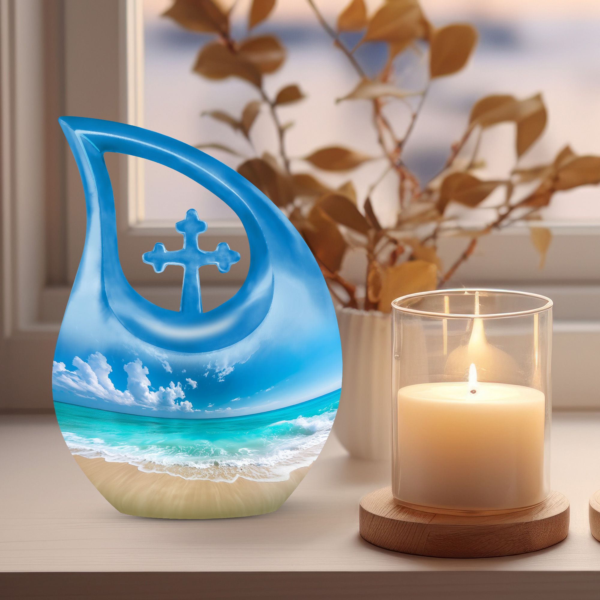 Experience the serene tribute to your loved ones with our Beach themed urn made of robust aluminium. This large, 10-inch urn brandishes a distinguished Cross Drop design, portraying a quiet dignity for the departed. The urn weighs a sturdy 3.3 pounds and stands tall at 10 inches in height, with a capacity to contain up to 200 cubic inches of ashes. Moreover, with an opportunity to personalize it, you can engrave the name of your loved one for a unique touch. It also comes with a velvet pouch, ensuring the subtle containment of the ashes. This affordable cremation urn is more than just a memorial urn—it is a final home for your dearly departed loved one, embodying their memory in a tangible form. Moreover, it stands out as a beach urn, offering a sense of peace and tranquility. As for affordability, we offer nothing short of cheaper funeral urns for sale without compromising on the quality of the urn. This product caters perfectly to those on the lookout for small urns for ashes that provide value for your money.