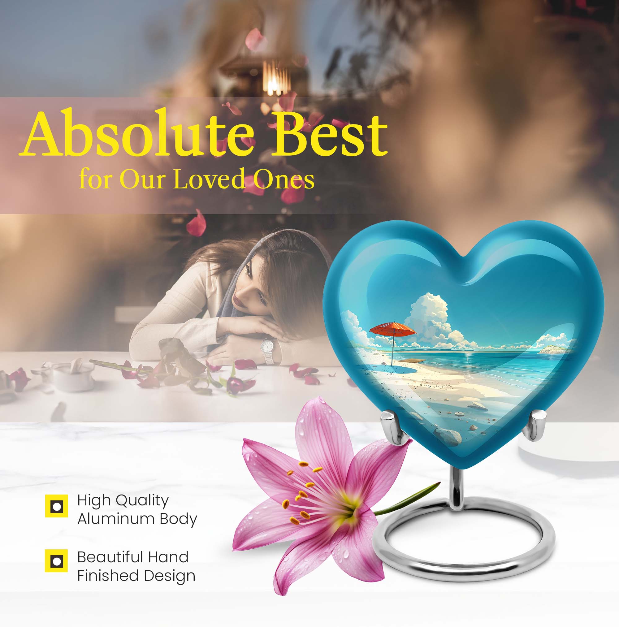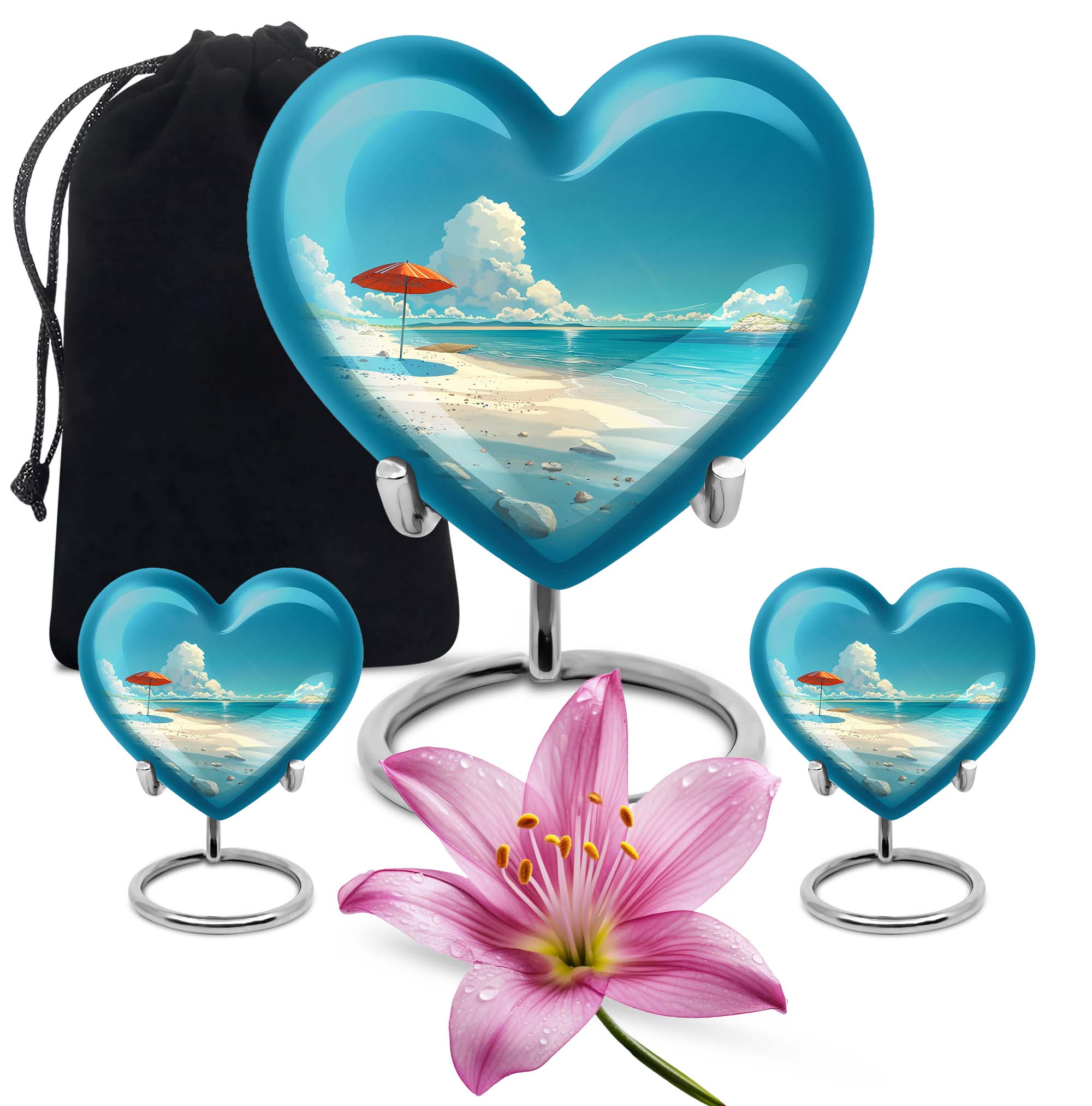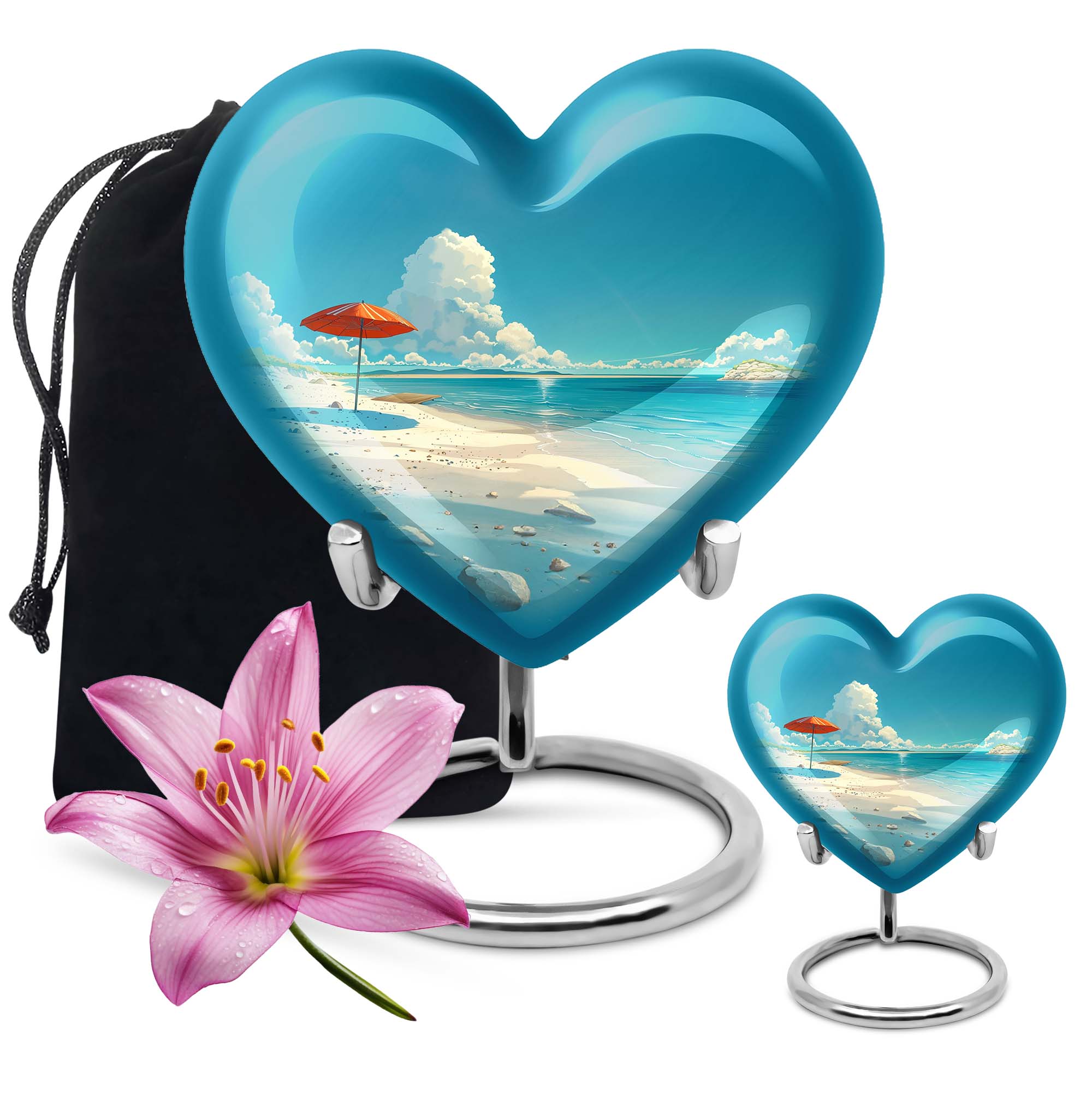 Treasure the memories of your dearly beloved with our 10-inch Beach Urn, a cherished memorial funeral urn, specially designed to hold 200 cubic inches, making it the perfect choice among large urns. Fashioned with utmost craftsmanship, this creation is notably lightweight at just 3.3 pounds, rendering it easily transportable. The heart urn boasts a lovely flower theme, enhancing the spiritual connection between nature and mortality. The beach urn is meticulously sculpted from enduring aluminum, promising lasting beauty and durability for outdoor burial or indoor display. Your purchase includes a velvet pouch for containment of ashes, ensuring the secure and respectful preservation of your loved one's remains. Take the opportunity to make this cremation urn even more special through personalization; you may opt to have names engraved, solidifying the bond even further. Venture beyond traditional funeral urns for burial and make a touching tribute with this beach urn. Ideal also as a mom cremation urn, adding an intimate and heartfelt touch.