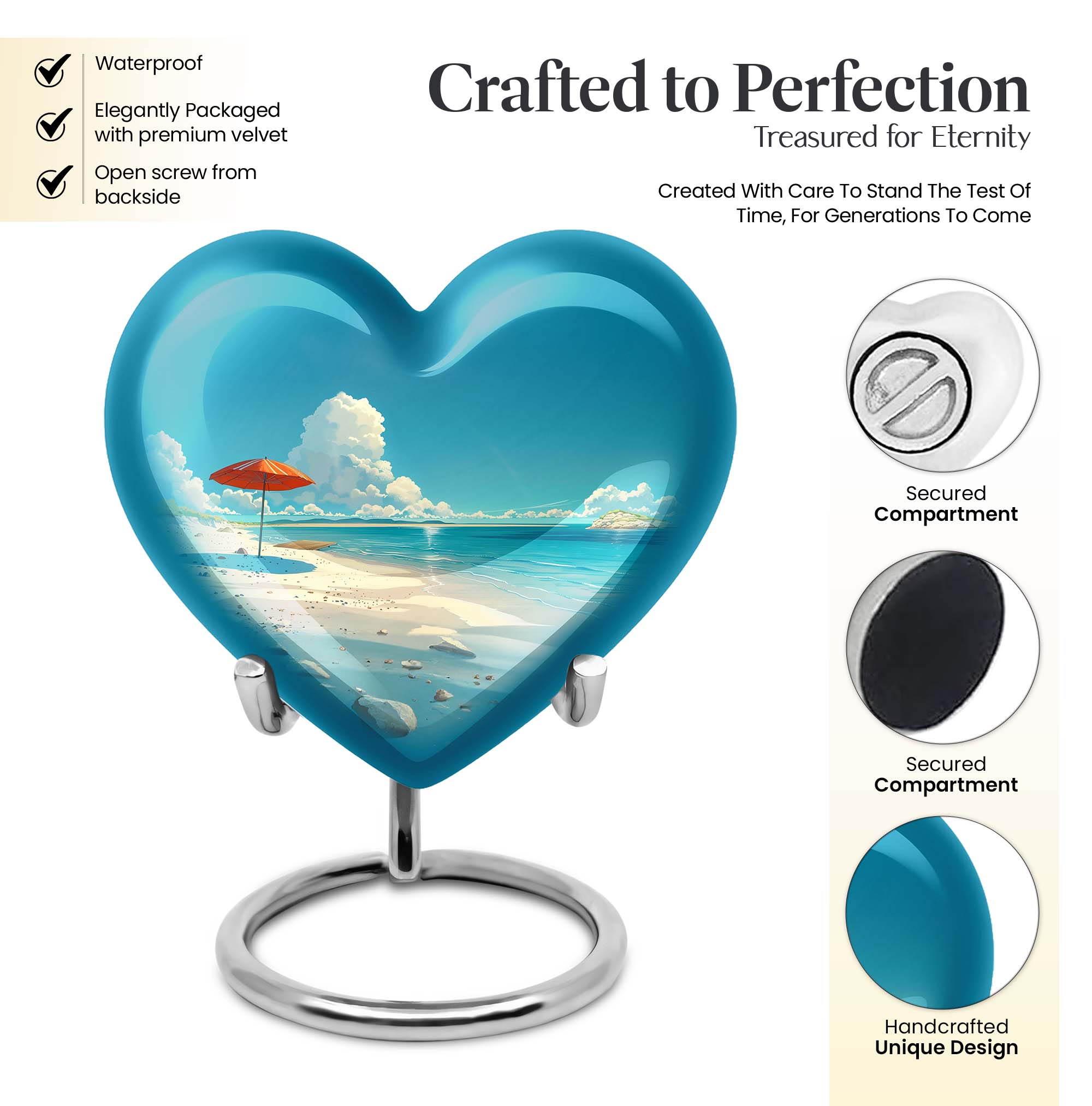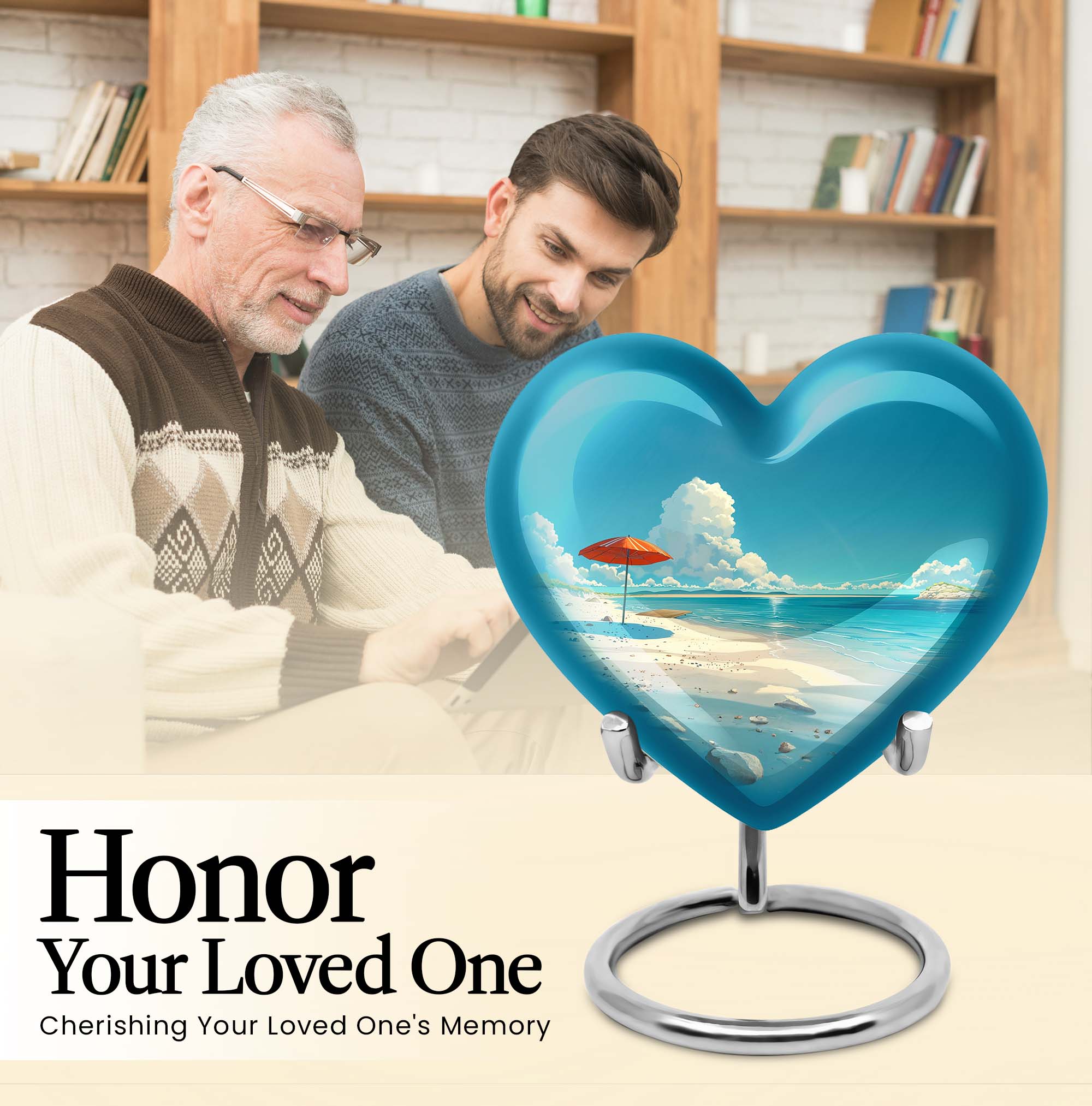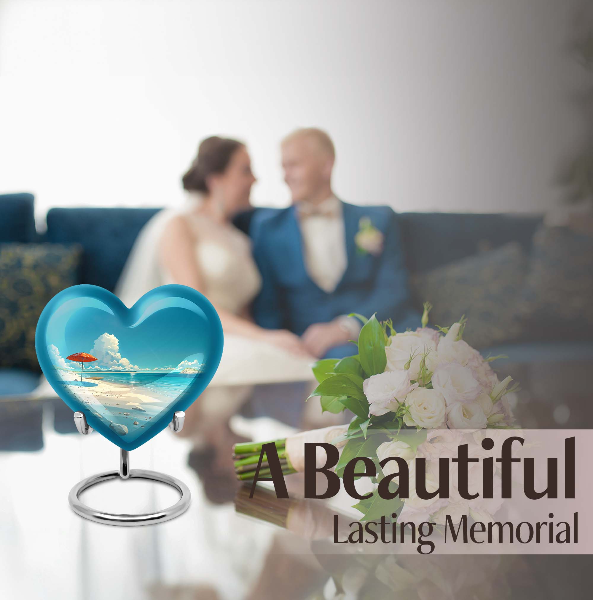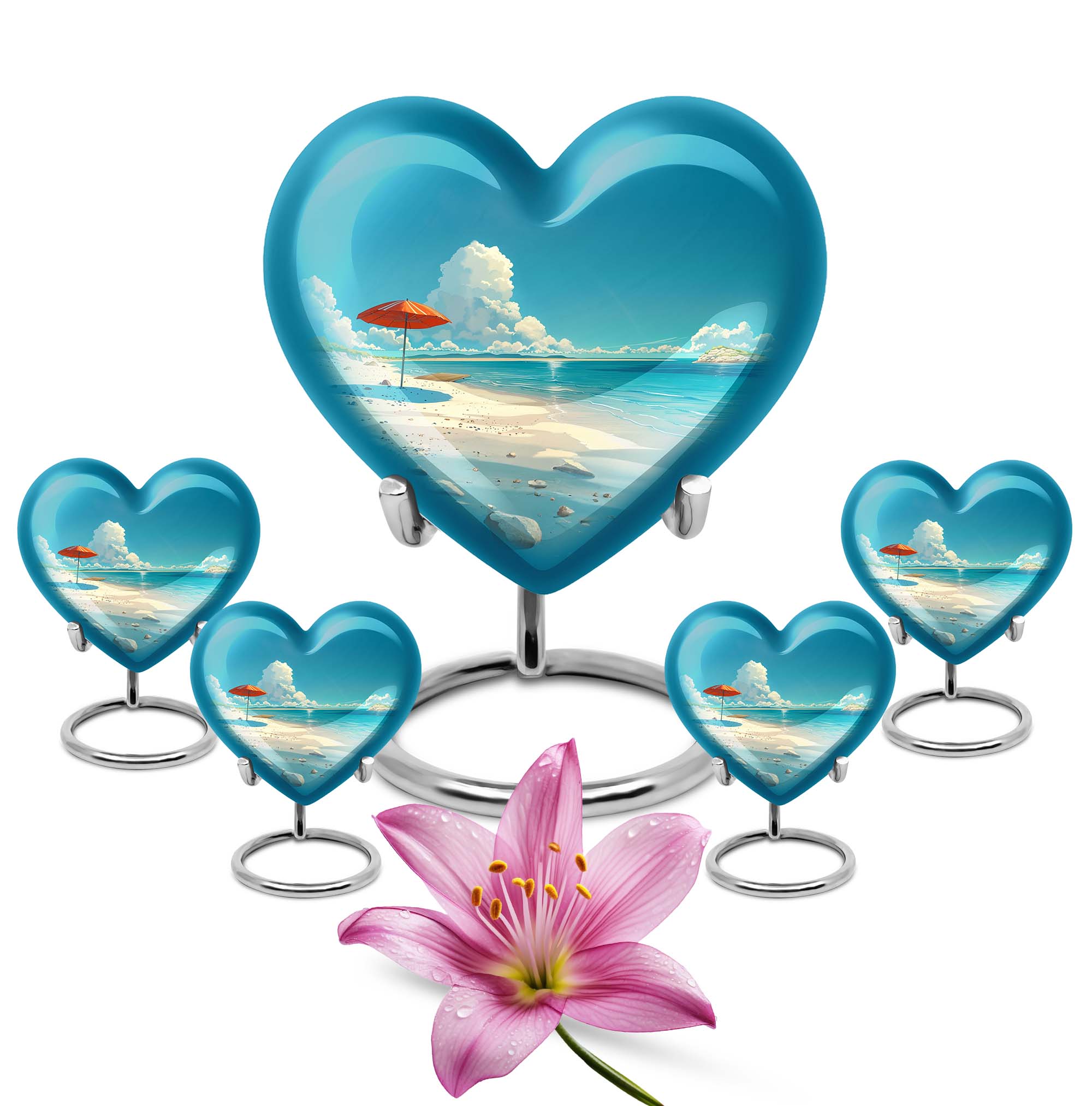 Treasure the memories of your dearly beloved with our 10-inch Beach Urn, a cherished memorial funeral urn, specially designed to hold 200 cubic inches, making it the perfect choice among large urns. Fashioned with utmost craftsmanship, this creation is notably lightweight at just 3.3 pounds, rendering it easily transportable. The heart urn boasts a lovely flower theme, enhancing the spiritual connection between nature and mortality. The beach urn is meticulously sculpted from enduring aluminum, promising lasting beauty and durability for outdoor burial or indoor display. Your purchase includes a velvet pouch for containment of ashes, ensuring the secure and respectful preservation of your loved one's remains. Take the opportunity to make this cremation urn even more special through personalization; you may opt to have names engraved, solidifying the bond even further. Venture beyond traditional funeral urns for burial and make a touching tribute with this beach urn. Ideal also as a mom cremation urn, adding an intimate and heartfelt touch.
