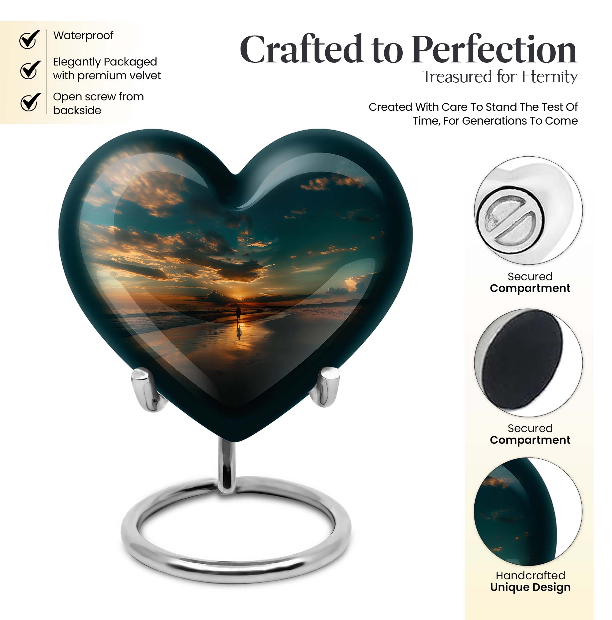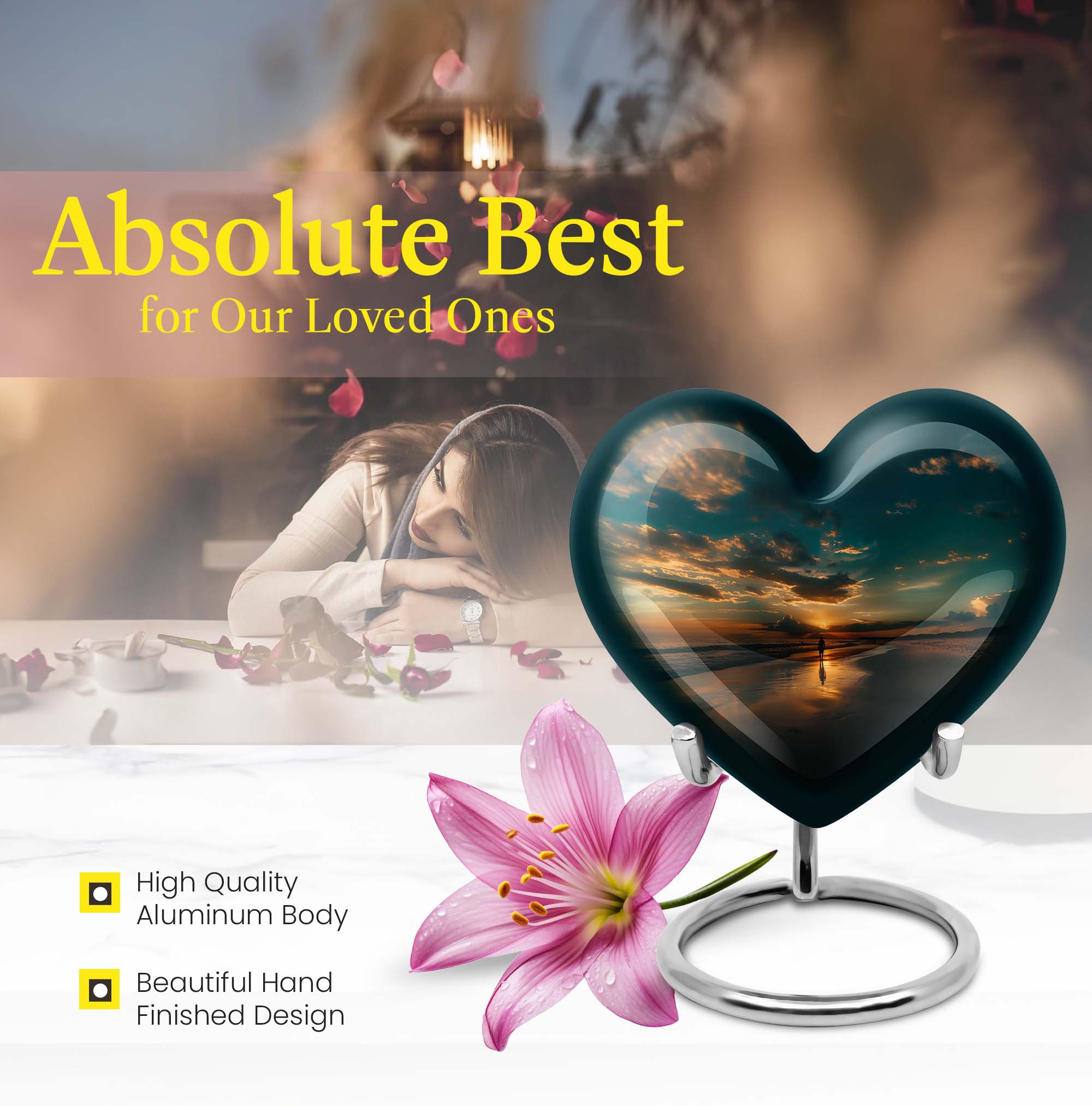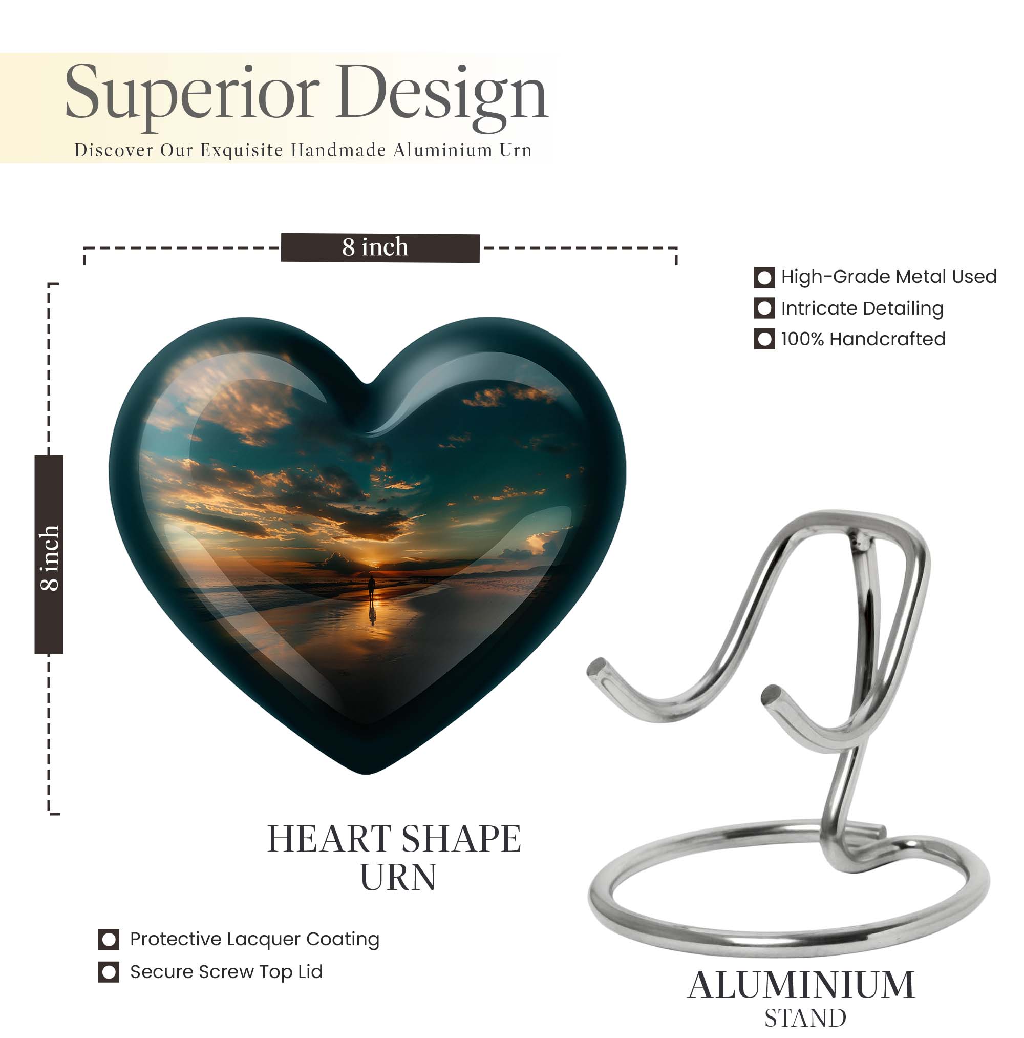 Celebrate and remember the life of your loved one with the Beach Urn. This large, durable memorial funeral urn for ashes is crafted from high-quality aluminium for long lasting durability. Measuring a respectful 10 inches in height and weighing 3.3 pounds, it embodies a serene, beach theme with a heart urn centerpiece and a display of sophisticated flowers. With a generous capacity of 200 cubic inches, this urn is perfect to safeguard the ashes of mother and father as a perfect memorial item. Additionally, the package comes with a companion velvet pouch for gentle yet secure containment of the precious contents. An option to personalize the urn with engraved names adds an intimate touch to this unique beatific work of art. Symbolizing eternal love, the Beach Urn captures the essence of individual life to honor and keep them close to the heart, always. Perfect for home or columbarium, it features a secured bottom compartment. Rediscover comfort in memories with our selection of decorative, memorial urns.