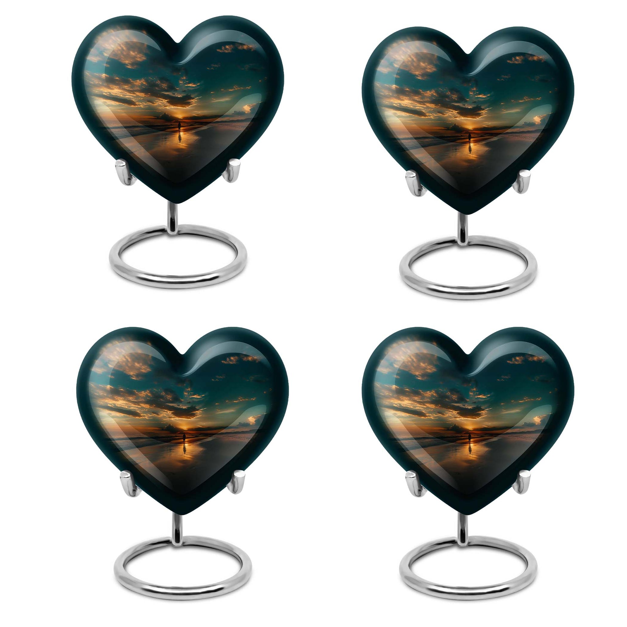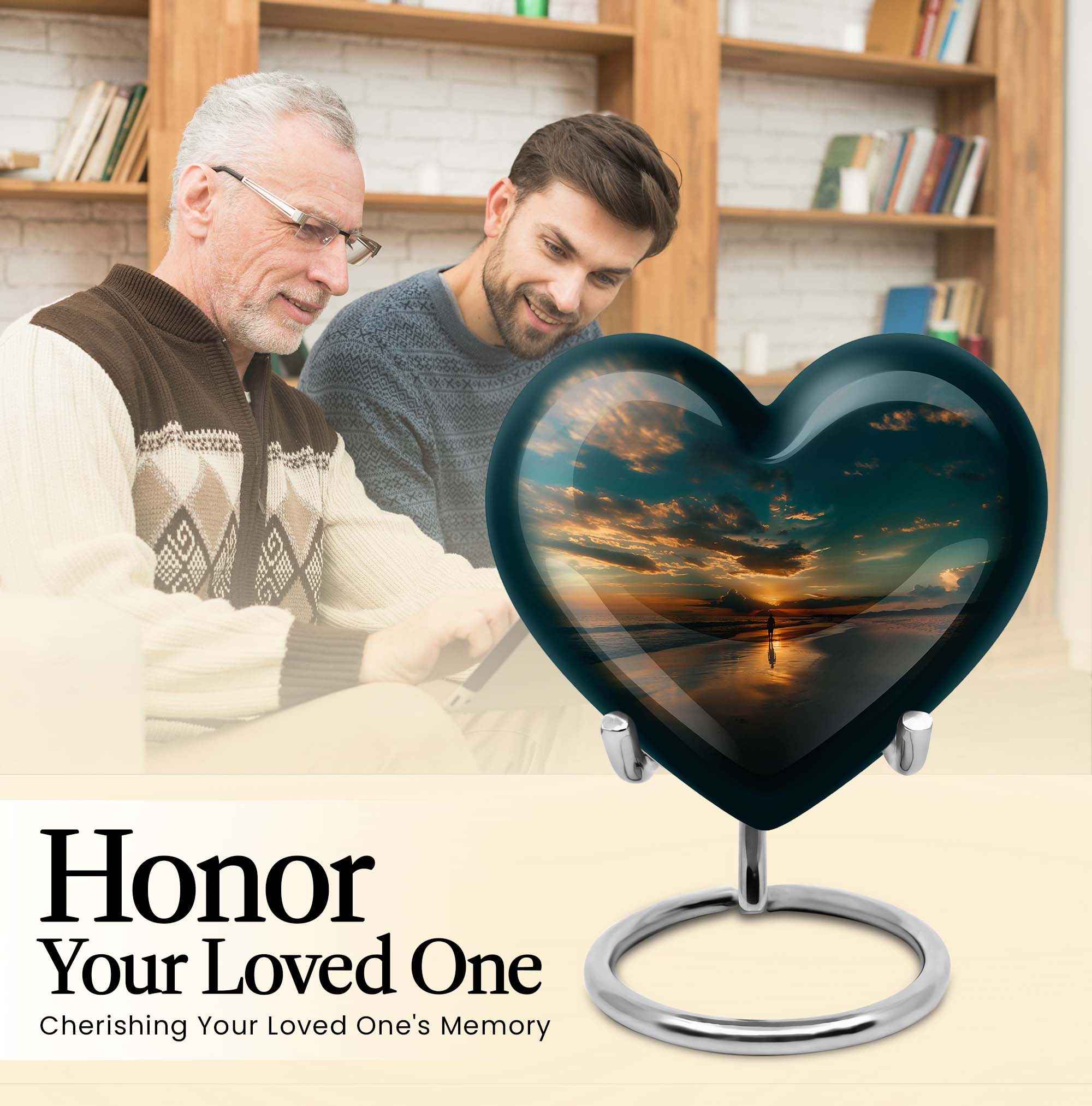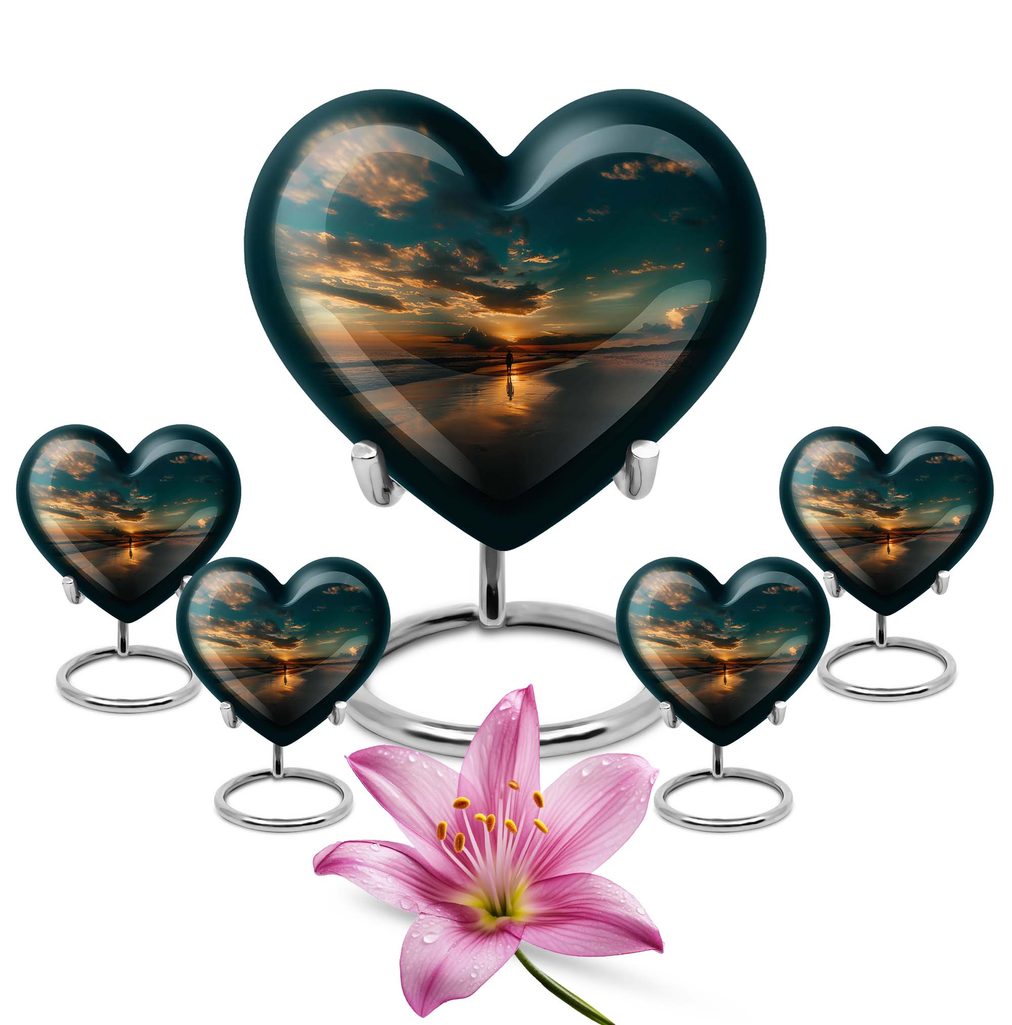 Celebrate and remember the life of your loved one with the Beach Urn. This large, durable memorial funeral urn for ashes is crafted from high-quality aluminium for long lasting durability. Measuring a respectful 10 inches in height and weighing 3.3 pounds, it embodies a serene, beach theme with a heart urn centerpiece and a display of sophisticated flowers. With a generous capacity of 200 cubic inches, this urn is perfect to safeguard the ashes of mother and father as a perfect memorial item. Additionally, the package comes with a companion velvet pouch for gentle yet secure containment of the precious contents. An option to personalize the urn with engraved names adds an intimate touch to this unique beatific work of art. Symbolizing eternal love, the Beach Urn captures the essence of individual life to honor and keep them close to the heart, always. Perfect for home or columbarium, it features a secured bottom compartment. Rediscover comfort in memories with our selection of decorative, memorial urns.