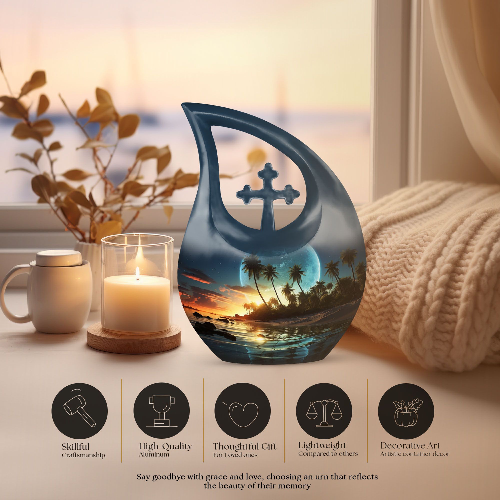 • Design: Hand-painted sunset beach scene symbolizing peace, love, and eternity