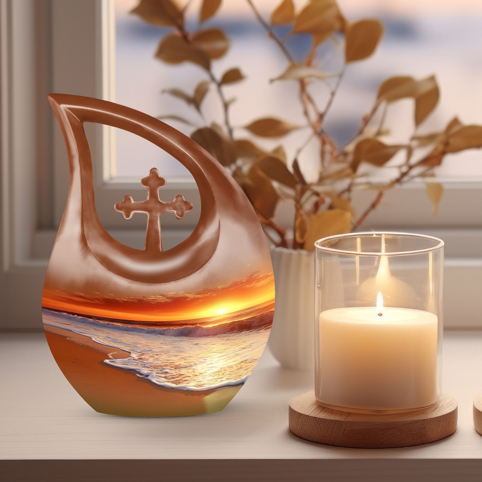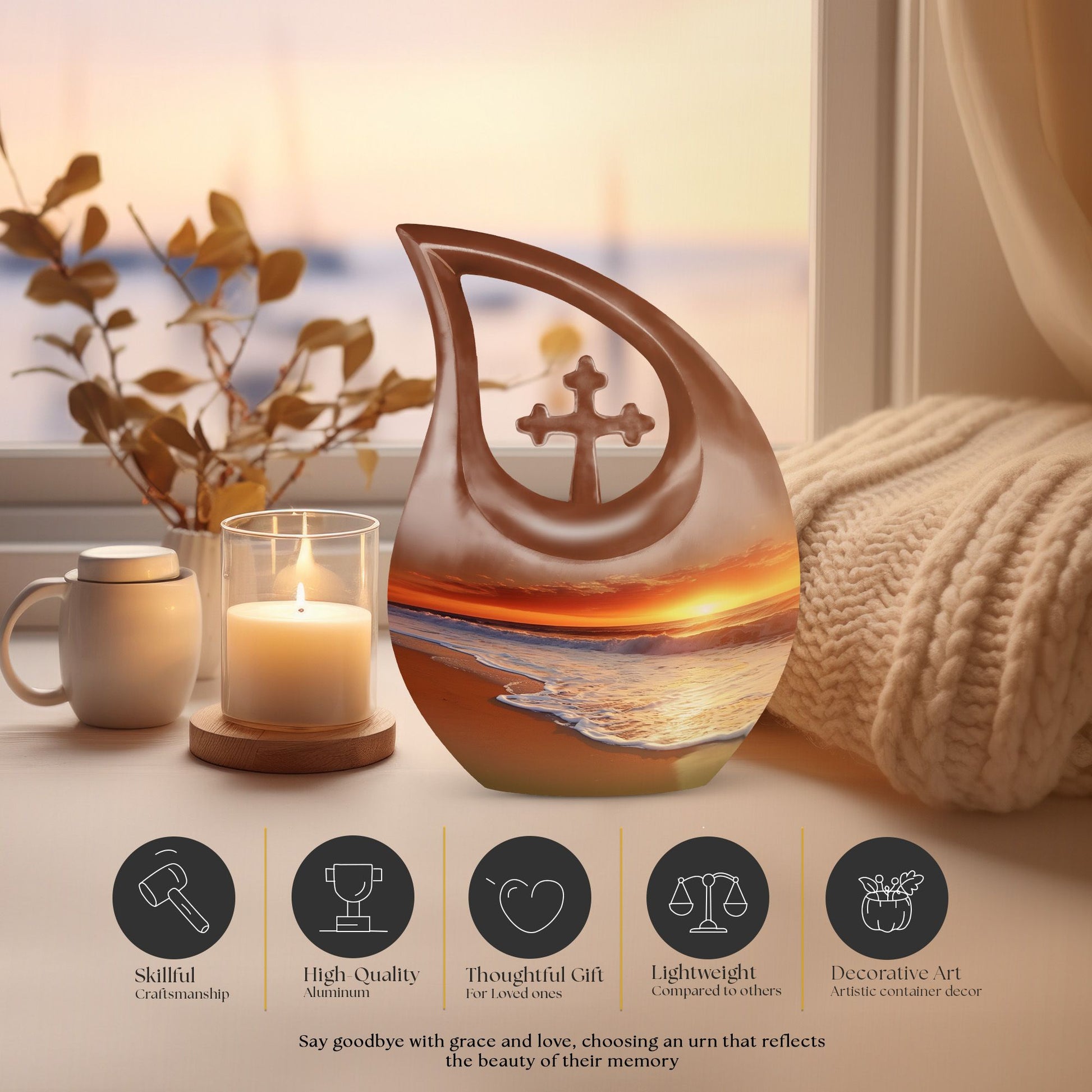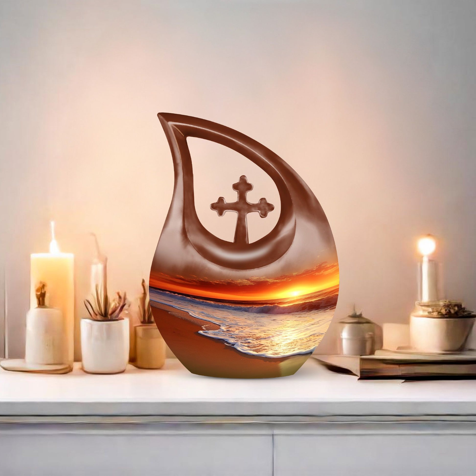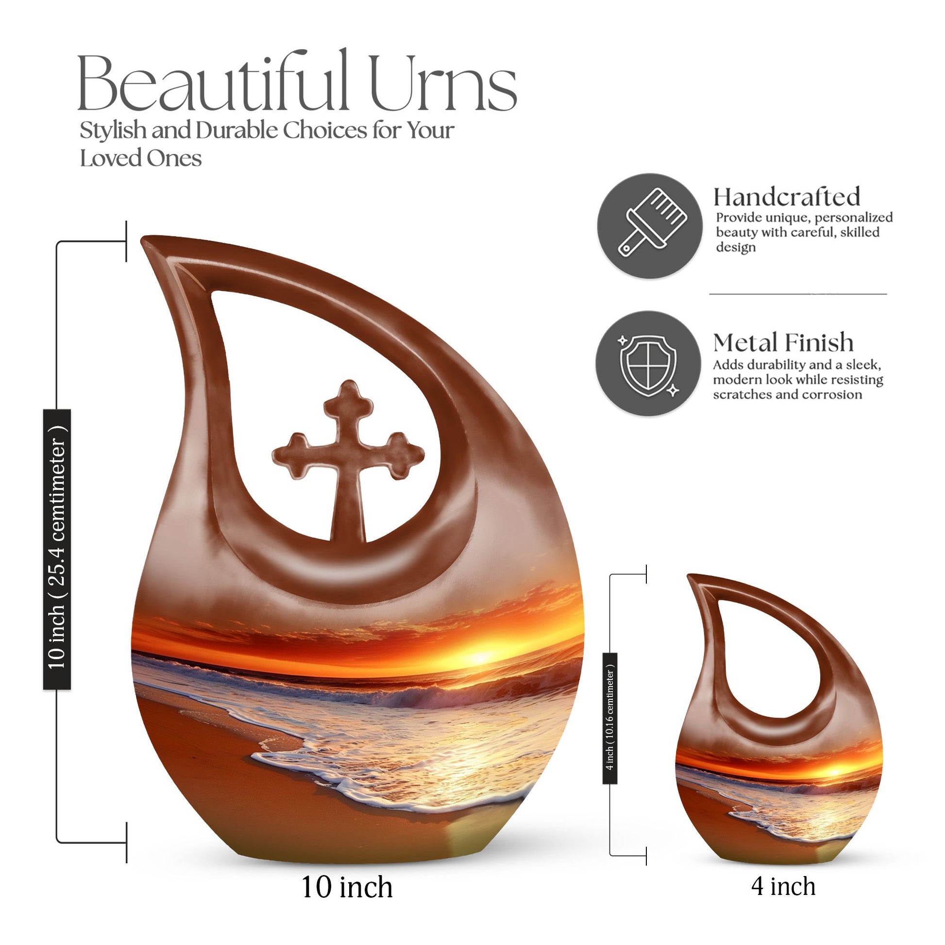 Cherish the memories of a loved one with an artistic Beach themed large urn. This 10-inch 'Cross Drop' design urn not only functions as a sacred vessel for your loved one's ashes, but also serves as a hallowing testament to their life. Meticulously crafted from high-quality aluminium, the urn has an enduring durability and elegant aesthetic. With a capacity of 200 cubic inches, it comfortably holds the ashes, while its weight of 3.3 pounds ensures easy portability. A complementary velvet pouch is included for secure containment of the ashes. On top of its aesthetic appeal and functionality, this impressive piece allows for personal customization with engraved names. An optimal choice for those in search of keepsake urns for human ashes, this urn also caters to those searching for biodegradable urns, urn vase or small urns. Capture the essence of your loved one's spirit and remember them in a way that feels as special as they were to you.