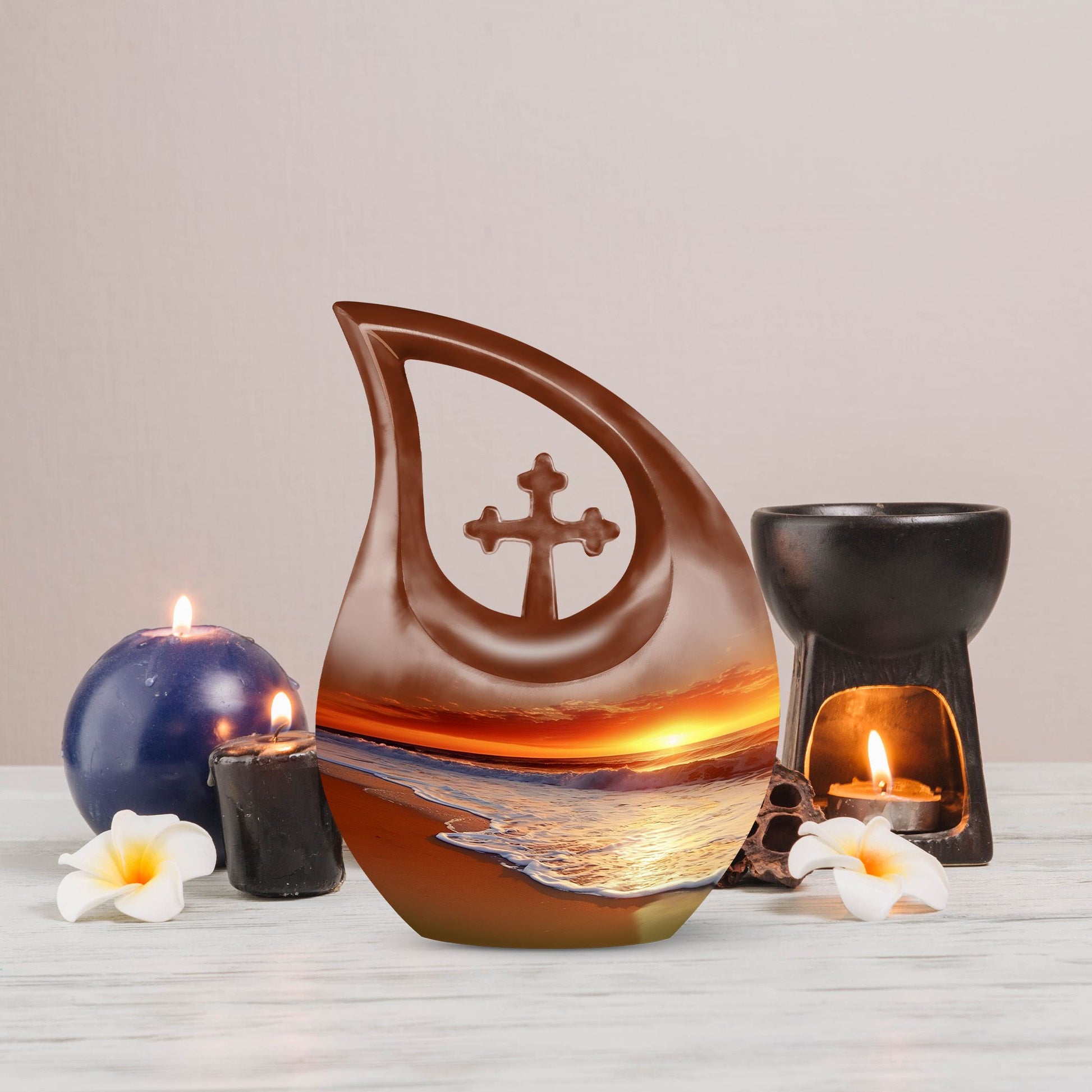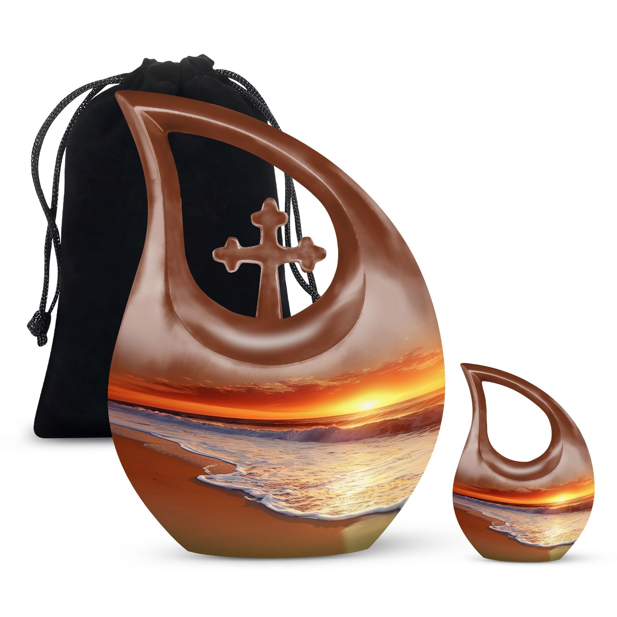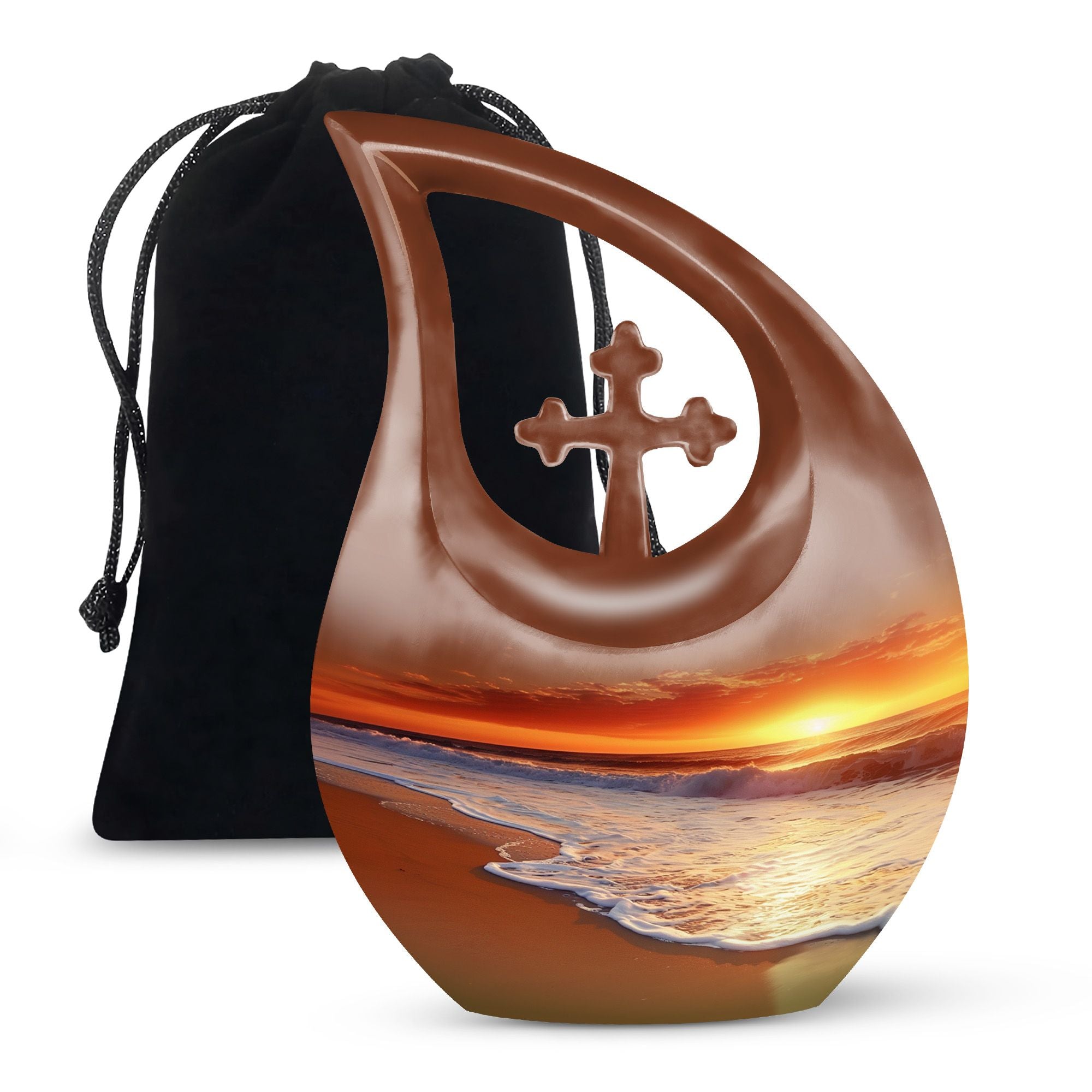 Cherish the memories of a loved one with an artistic Beach themed large urn. This 10-inch 'Cross Drop' design urn not only functions as a sacred vessel for your loved one's ashes, but also serves as a hallowing testament to their life. Meticulously crafted from high-quality aluminium, the urn has an enduring durability and elegant aesthetic. With a capacity of 200 cubic inches, it comfortably holds the ashes, while its weight of 3.3 pounds ensures easy portability. A complementary velvet pouch is included for secure containment of the ashes. On top of its aesthetic appeal and functionality, this impressive piece allows for personal customization with engraved names. An optimal choice for those in search of keepsake urns for human ashes, this urn also caters to those searching for biodegradable urns, urn vase or small urns. Capture the essence of your loved one's spirit and remember them in a way that feels as special as they were to you.