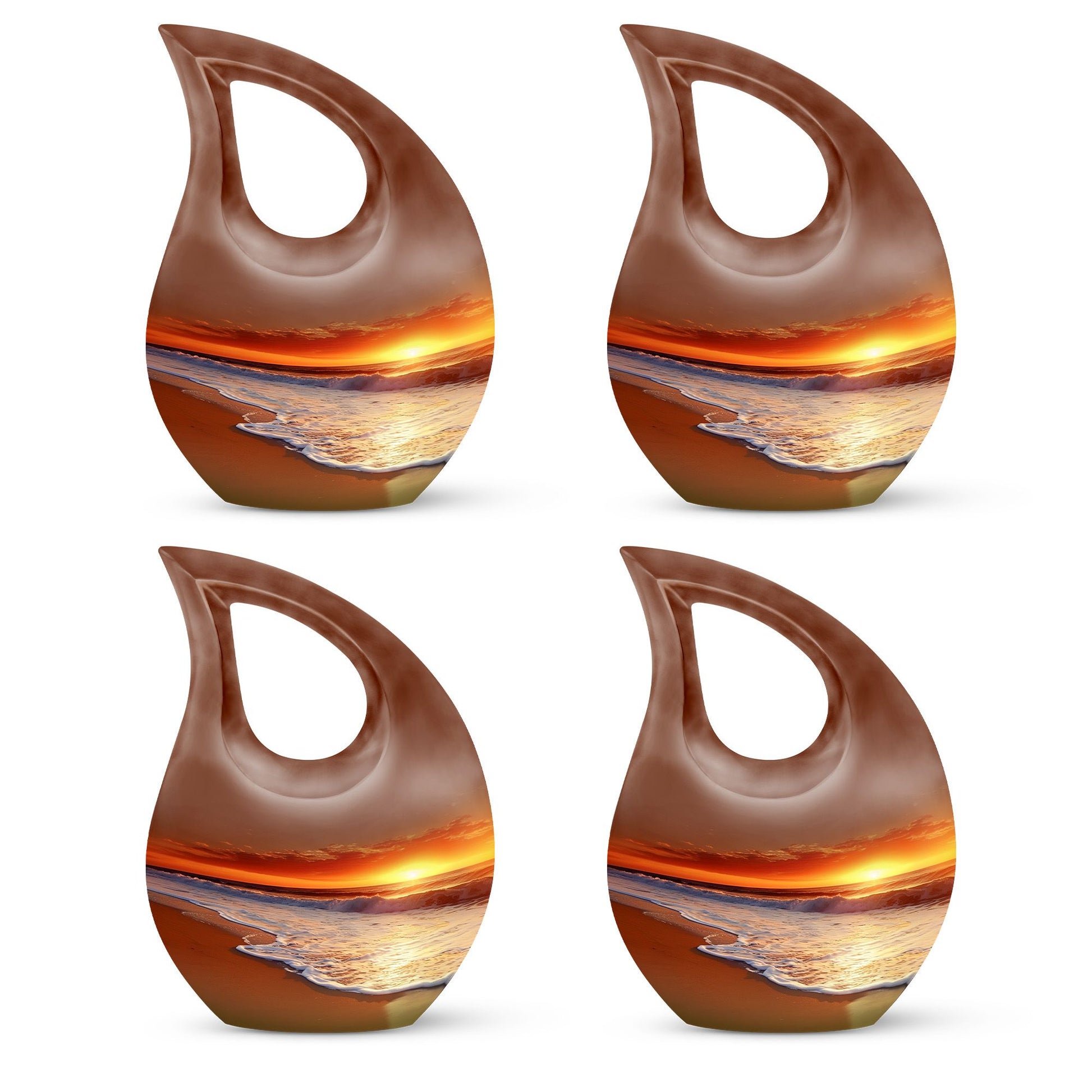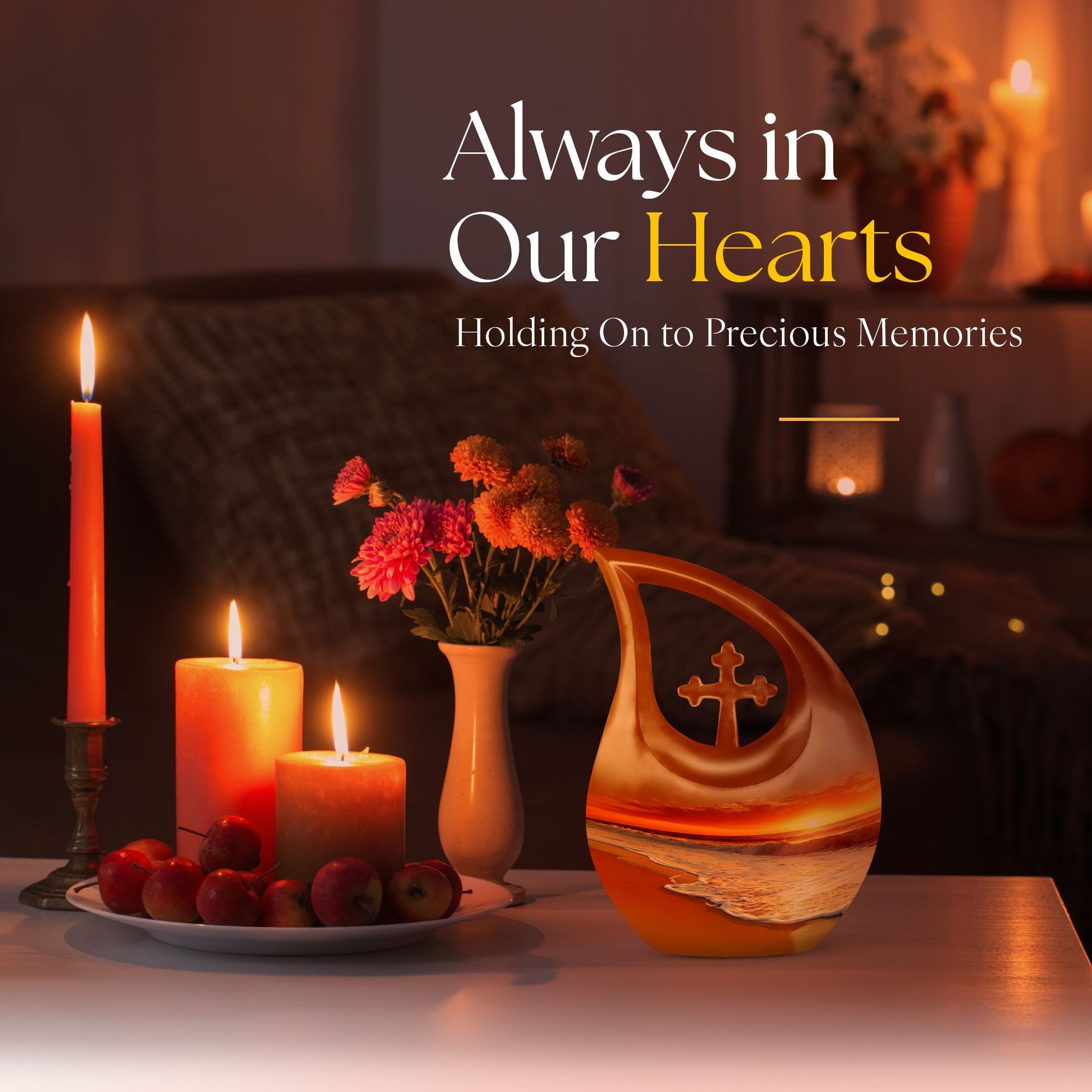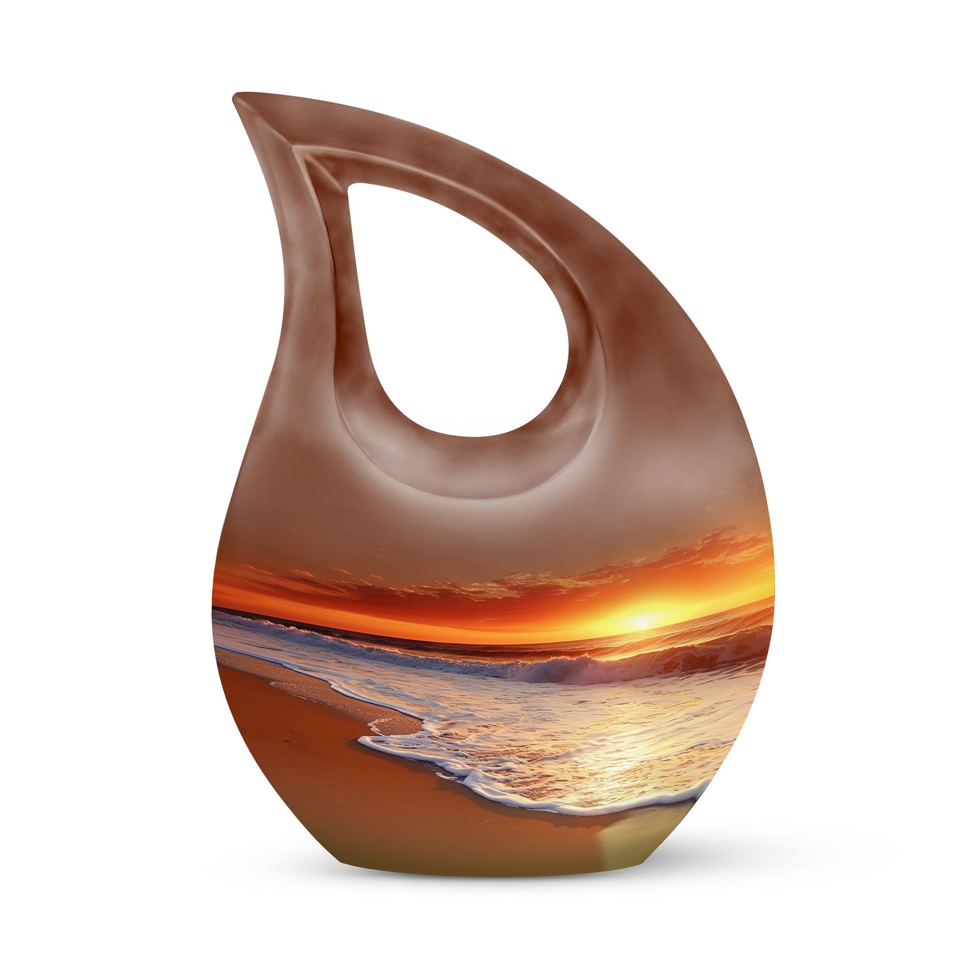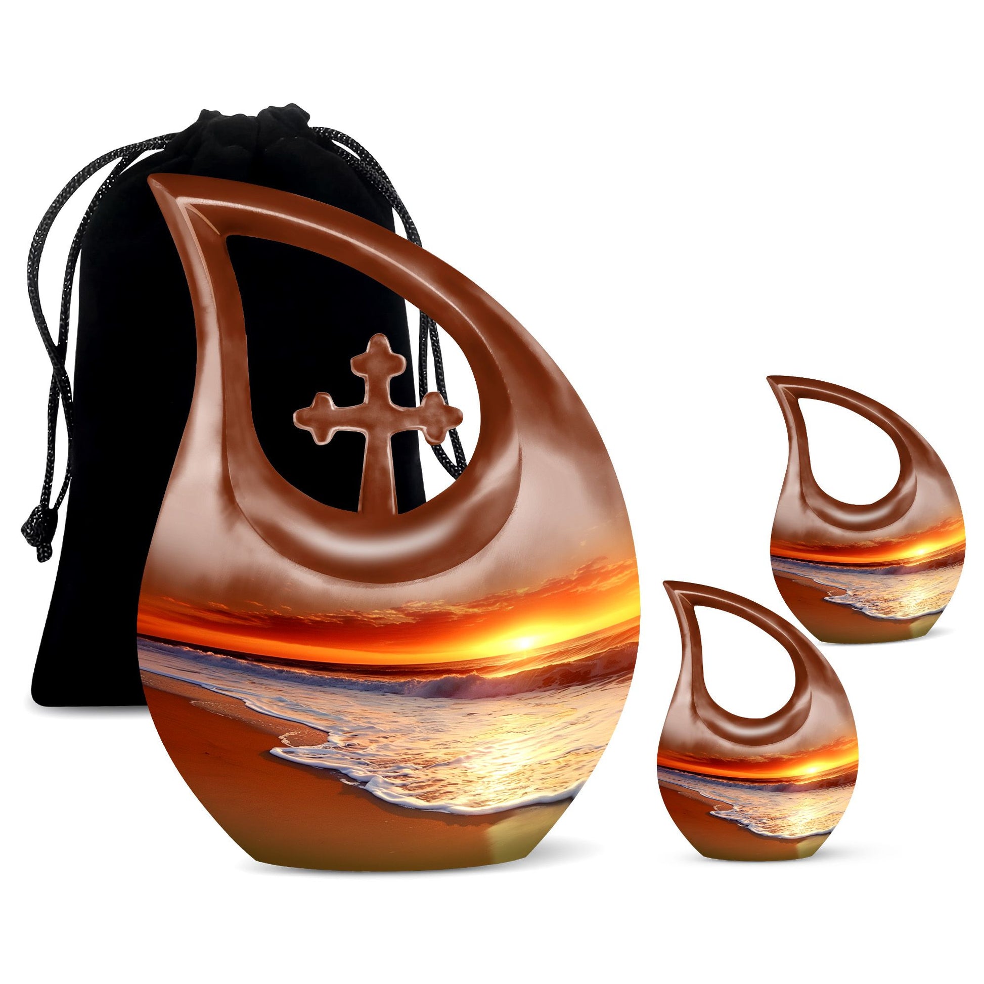 Cherish the memories of a loved one with an artistic Beach themed large urn. This 10-inch 'Cross Drop' design urn not only functions as a sacred vessel for your loved one's ashes, but also serves as a hallowing testament to their life. Meticulously crafted from high-quality aluminium, the urn has an enduring durability and elegant aesthetic. With a capacity of 200 cubic inches, it comfortably holds the ashes, while its weight of 3.3 pounds ensures easy portability. A complementary velvet pouch is included for secure containment of the ashes. On top of its aesthetic appeal and functionality, this impressive piece allows for personal customization with engraved names. An optimal choice for those in search of keepsake urns for human ashes, this urn also caters to those searching for biodegradable urns, urn vase or small urns. Capture the essence of your loved one's spirit and remember them in a way that feels as special as they were to you.