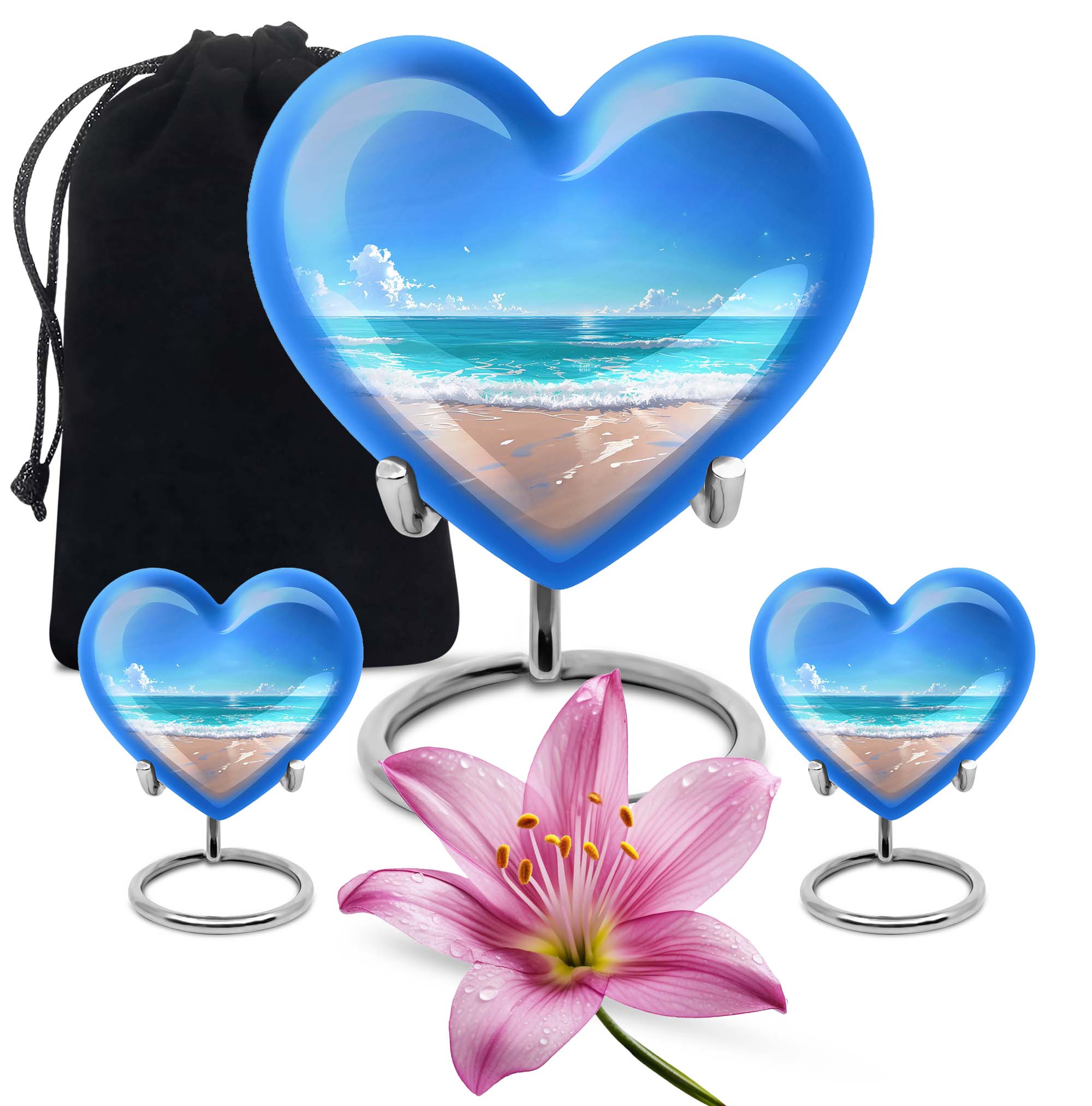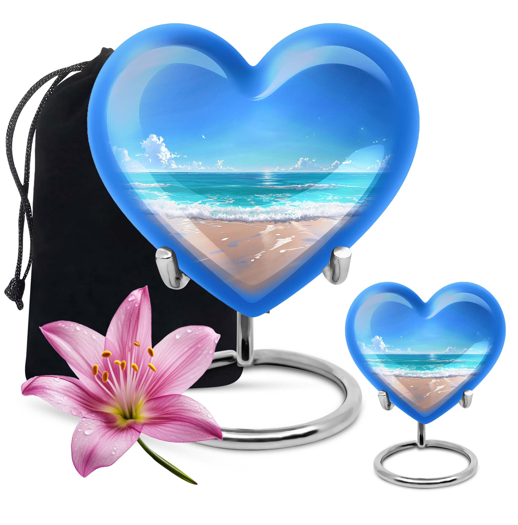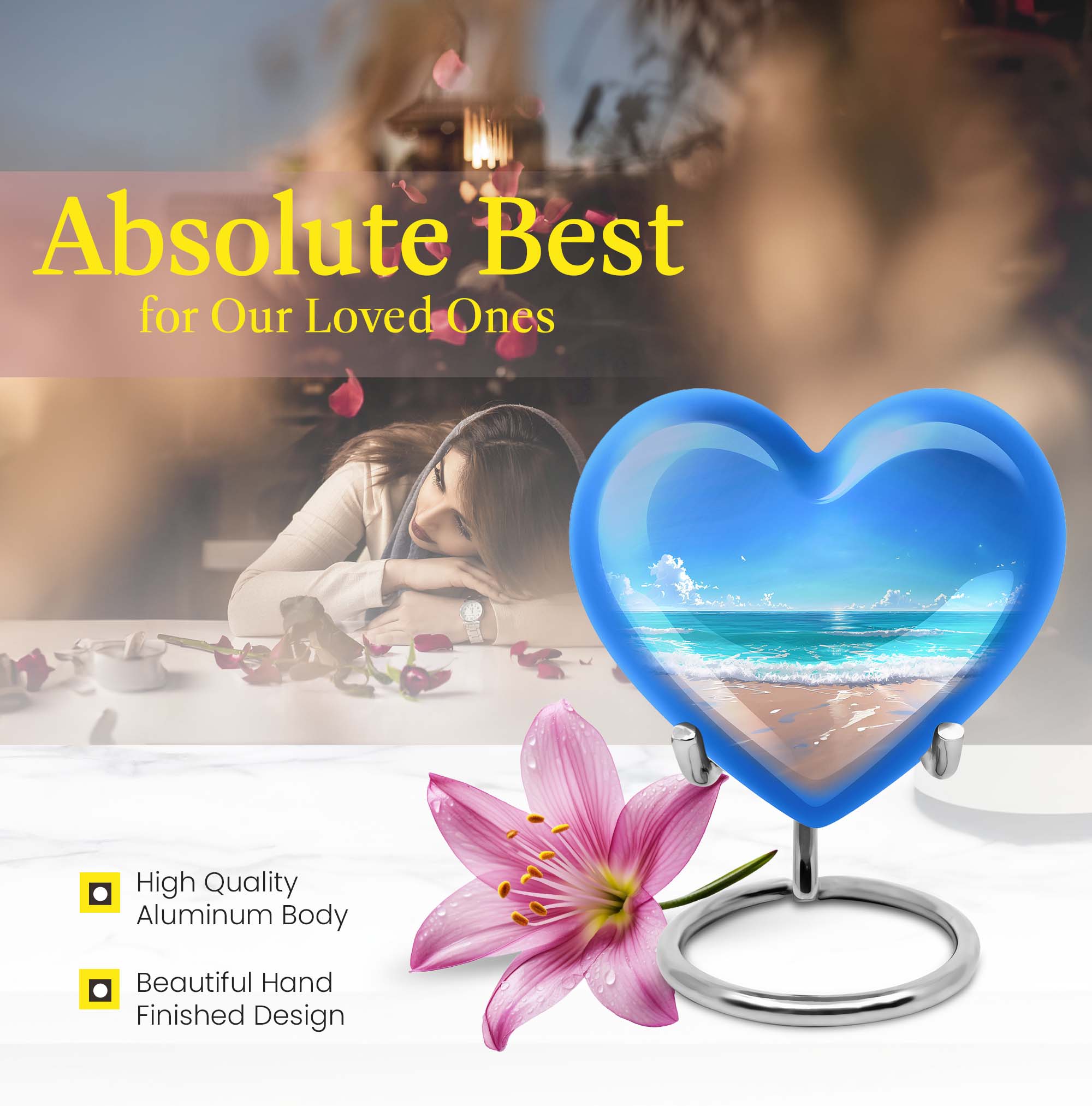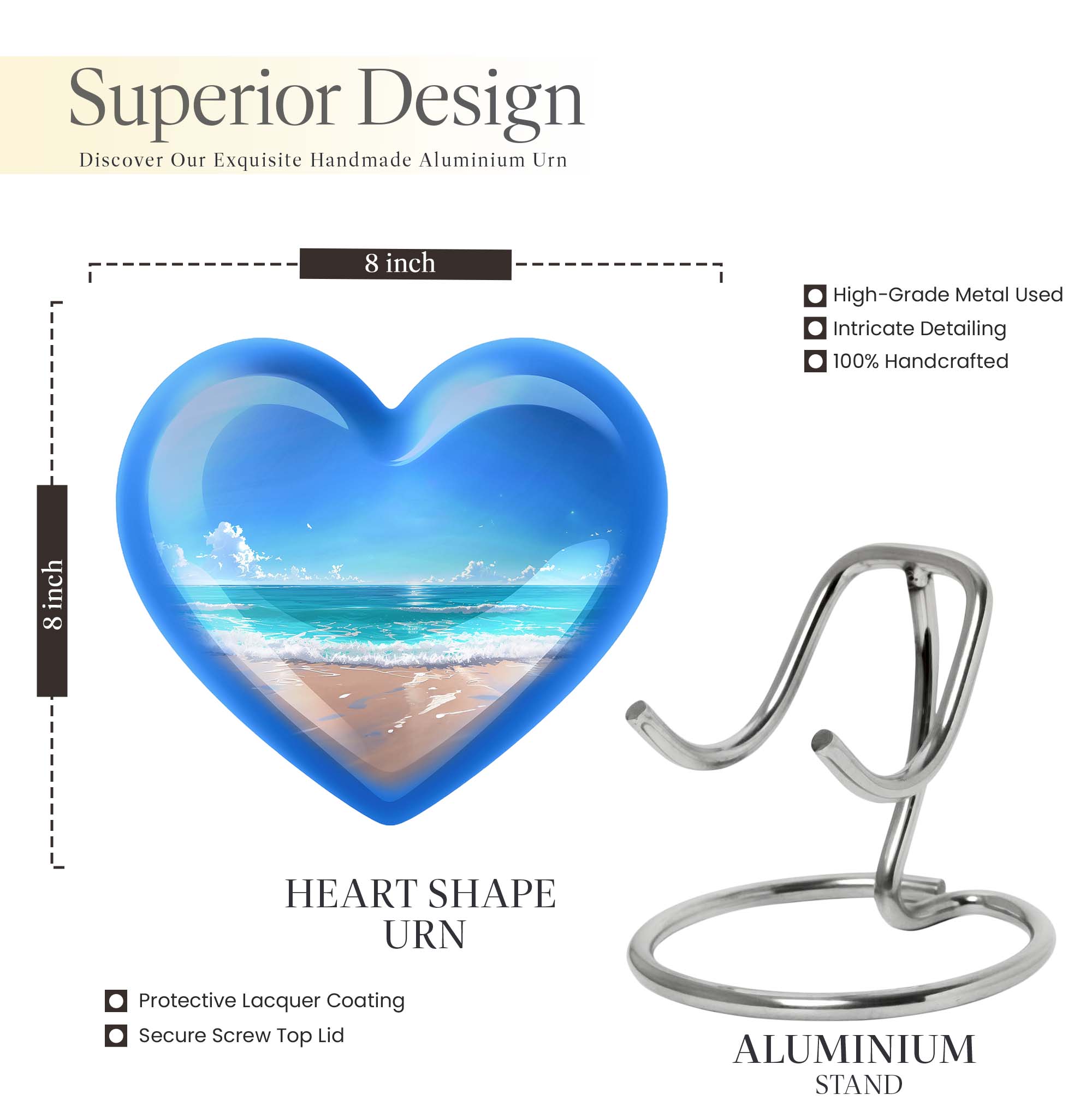Honor your departed loved ones with our Beach Urn, the perfect burial urn for ashes adult sized. Crafted from durable aluminium, this large urn weighs 3.3 pounds and stands at 10 inches in height, offering a generous capacity of 200 cubic inches. Engineered with a Heart Urn design, it elegantly captures the essence of cherished memories and unending love. Adorned with a flowers theme, it extends a peaceful, serene touch when commemorating the life of your beloved. The urn features the ability to personalize with engraved names, making it truly one-of-a-kind. Also, it is accompanied by a velvet pouch for secure containment of ashes. Ideal for those seeking adult burial or cremation urns for dad, this urn amalgamates strength, elegance and profound respect for your departed. Please note, this is not a bulk cremation urn. Its exceptional details make it an ideal collector’s item and a remarkable tribute to a life well-lived.