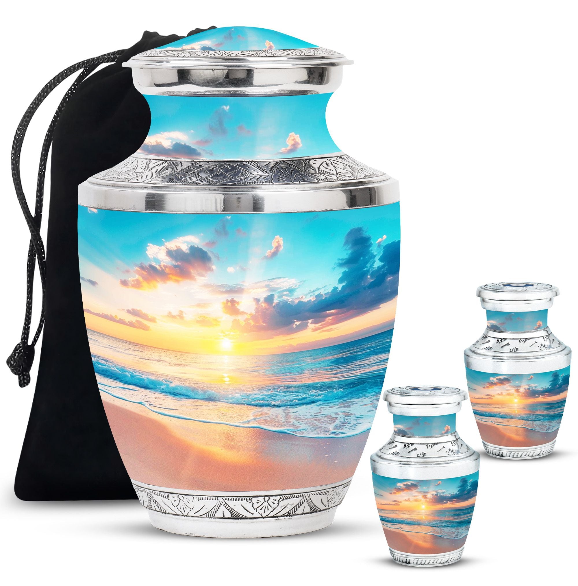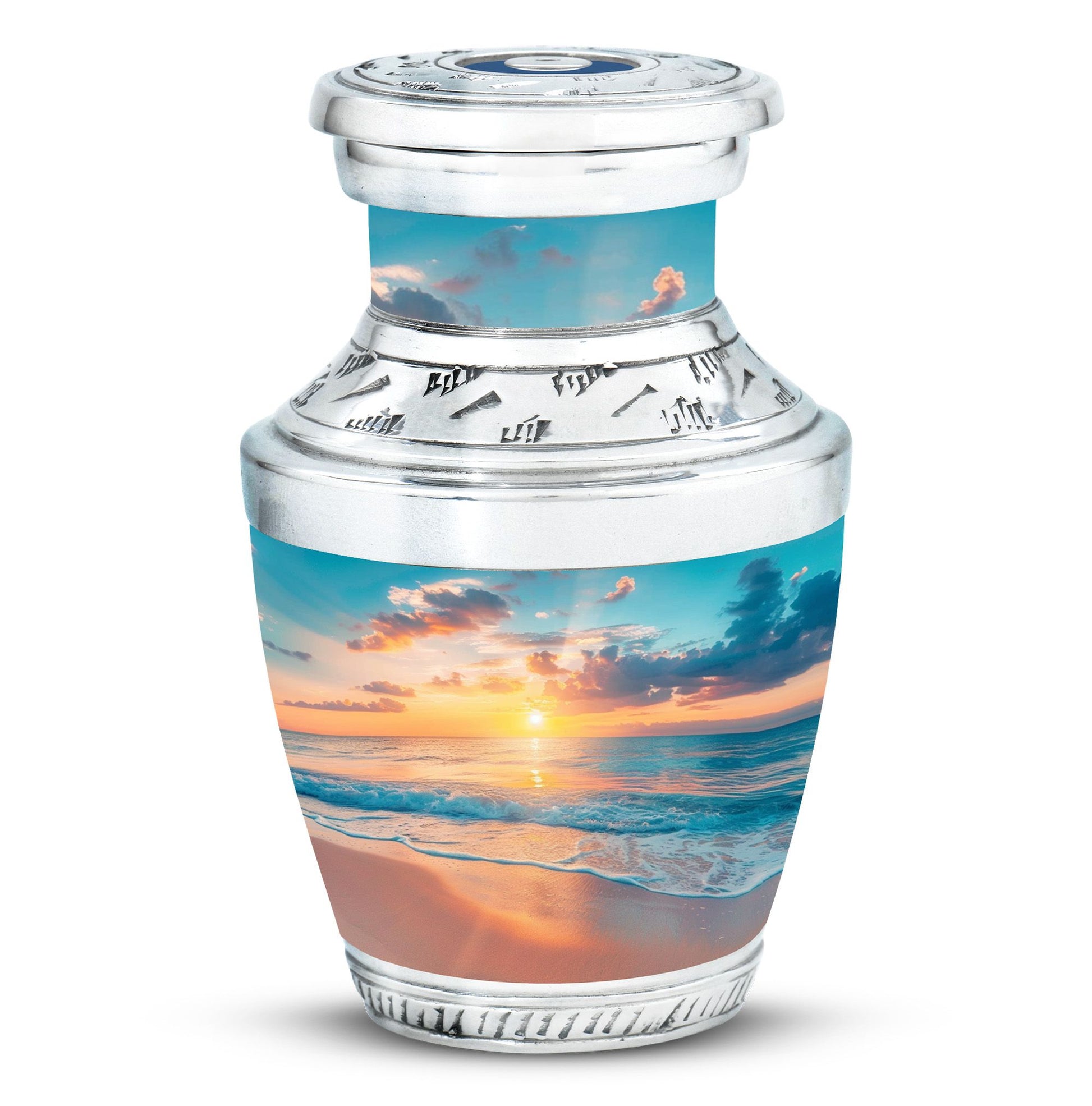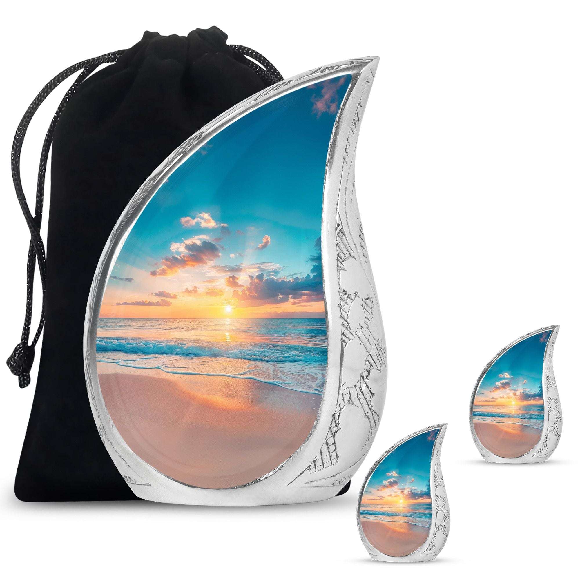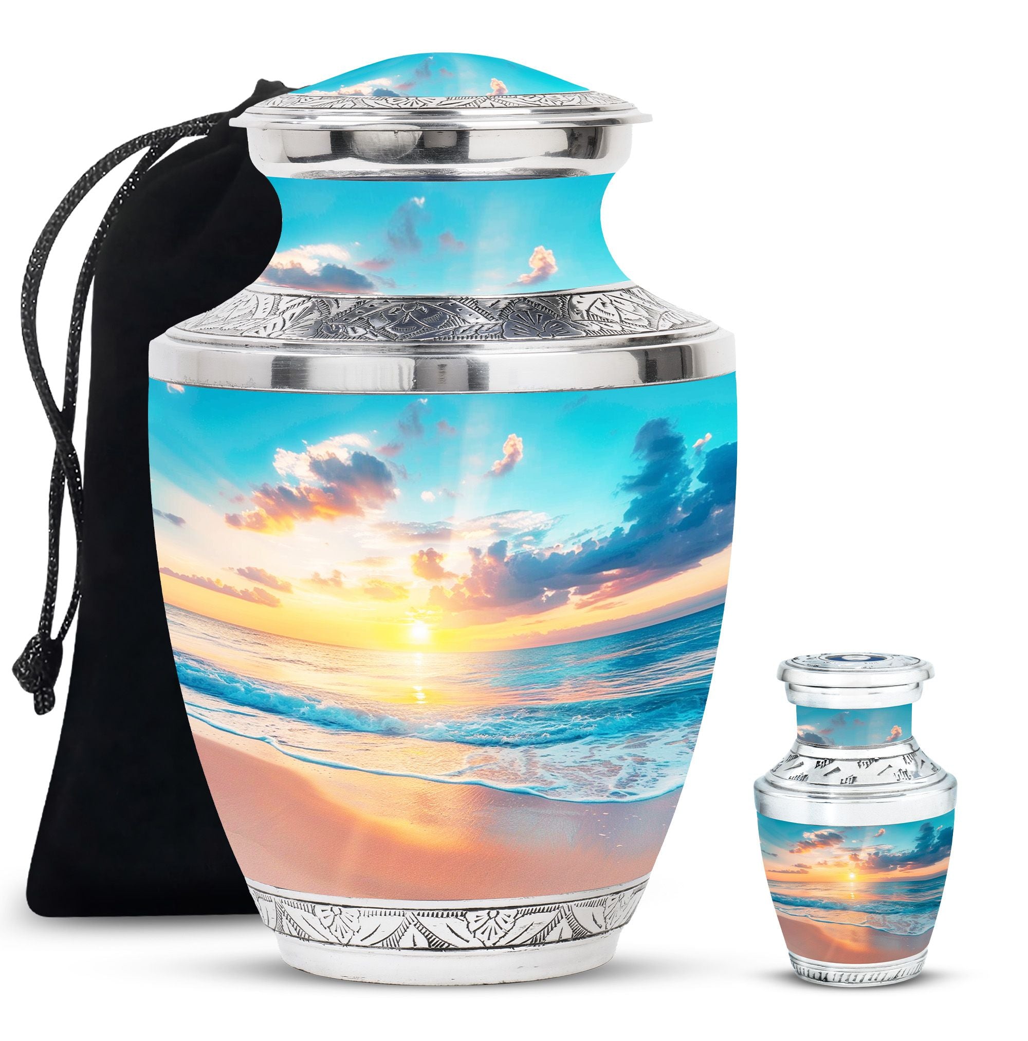 Crafted with precision, the large funeral urn features a sunset beach design that reflects tranquility and hope. Made from durable aluminium, it ensures long-lasting preservation of ashes with both style and strength. Its secure screw-top lid provides peace of mind, while the elegant artwork makes it suitable as a decorative piece for display at home or for a memorial service. Ideal as a cremation urn adult large, this urn combines artistry and practicality, meeting the needs of families seeking urns for human ashes large.
