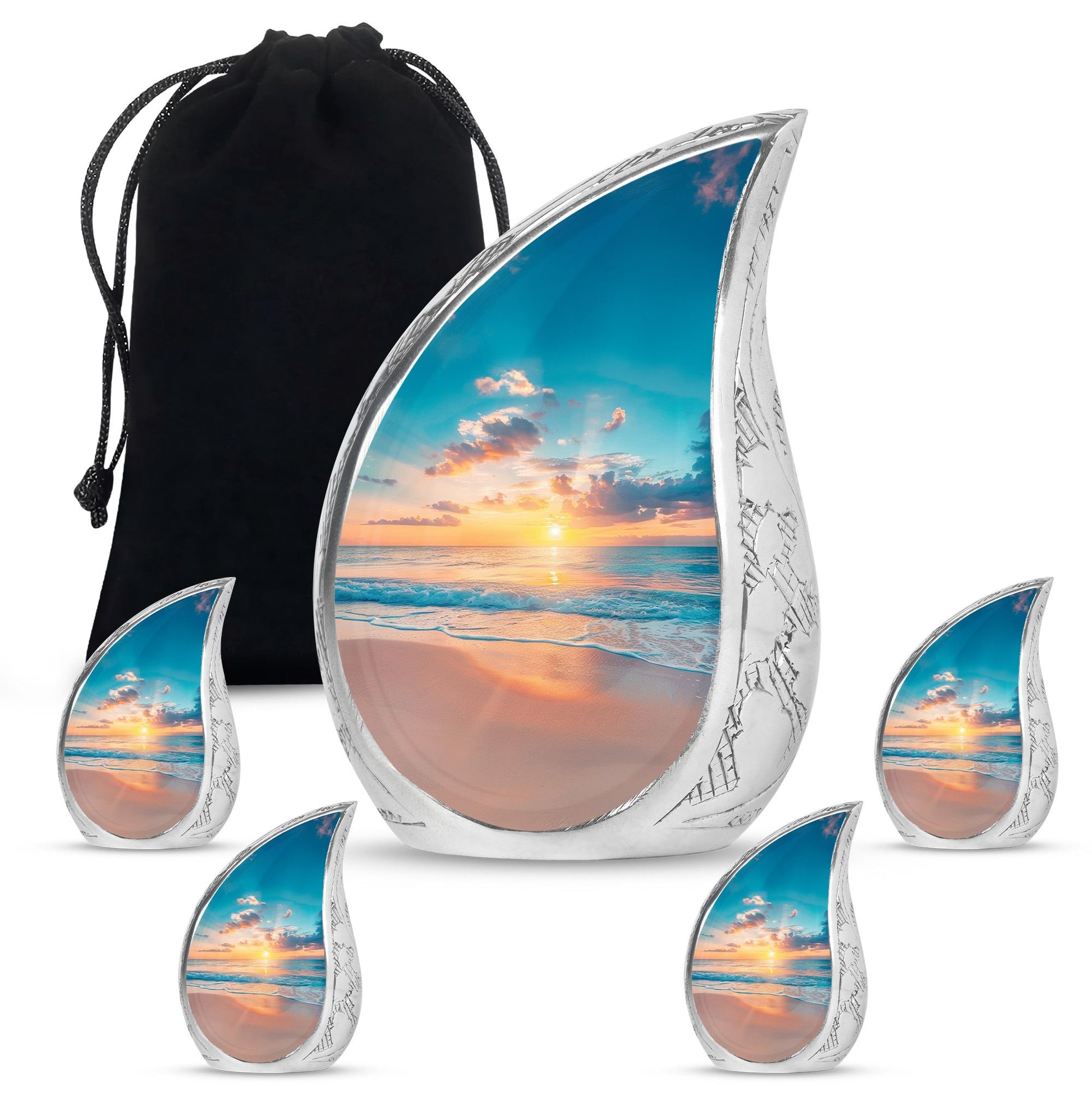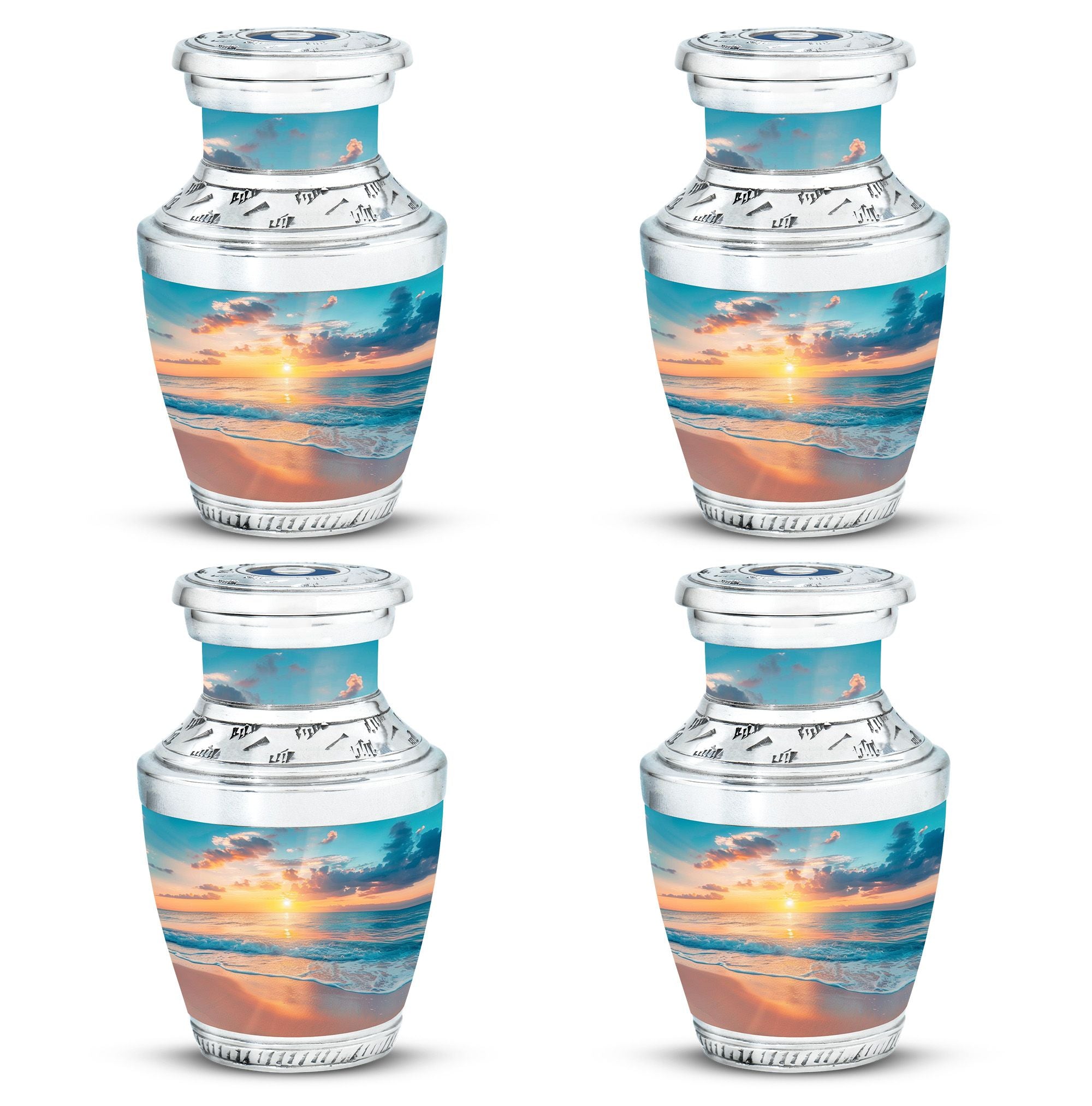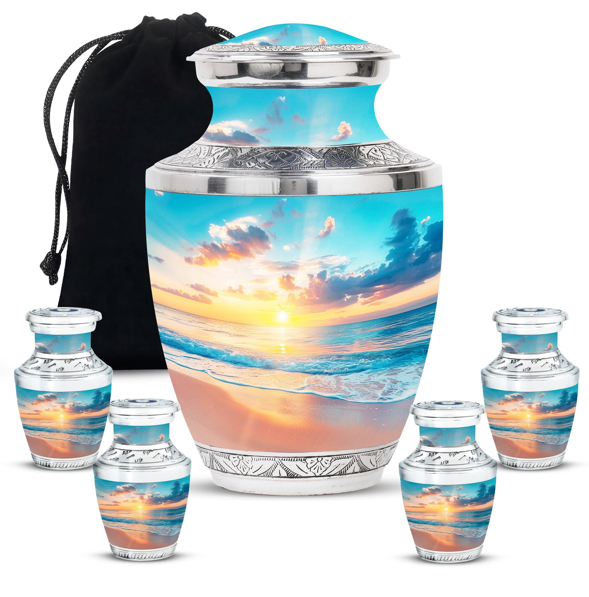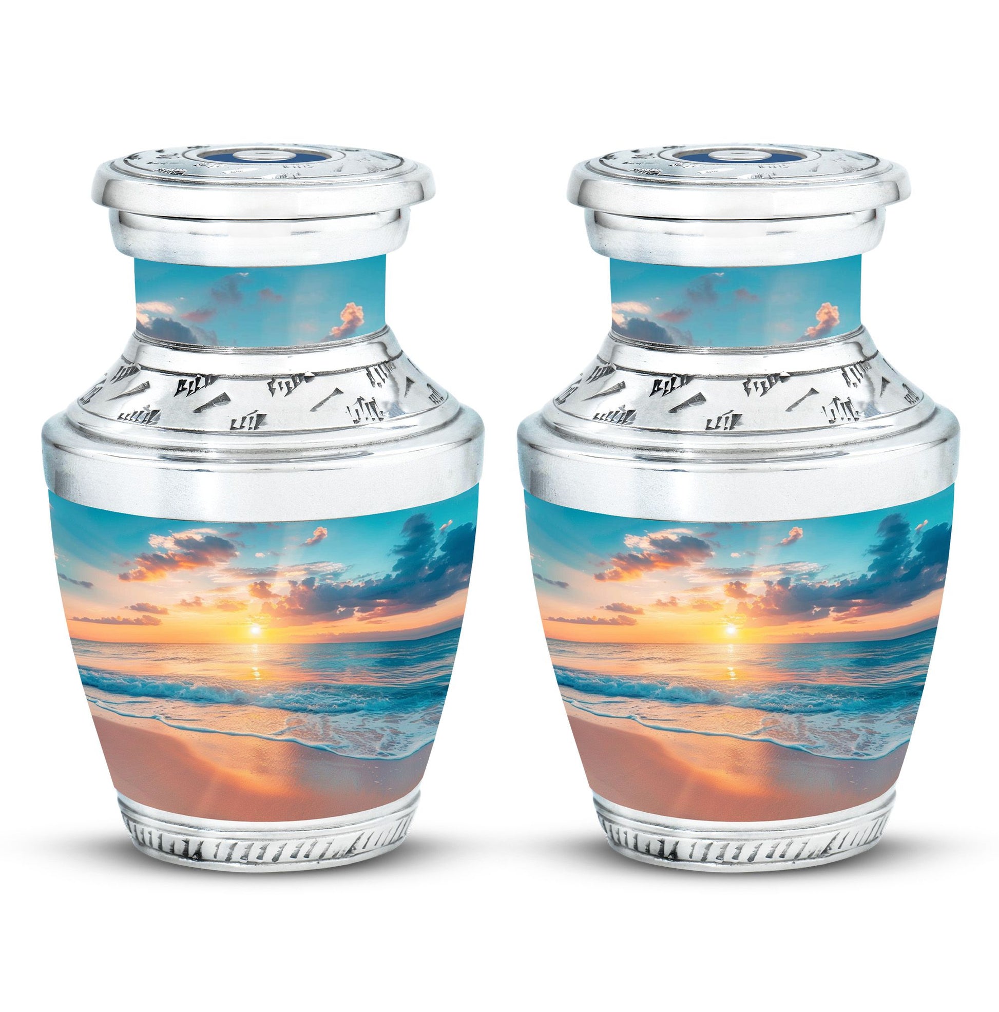 Crafted with precision, the large funeral urn features a sunset beach design that reflects tranquility and hope. Made from durable aluminium, it ensures long-lasting preservation of ashes with both style and strength. Its secure screw-top lid provides peace of mind, while the elegant artwork makes it suitable as a decorative piece for display at home or for a memorial service. Ideal as a cremation urn adult large, this urn combines artistry and practicality, meeting the needs of families seeking urns for human ashes large.