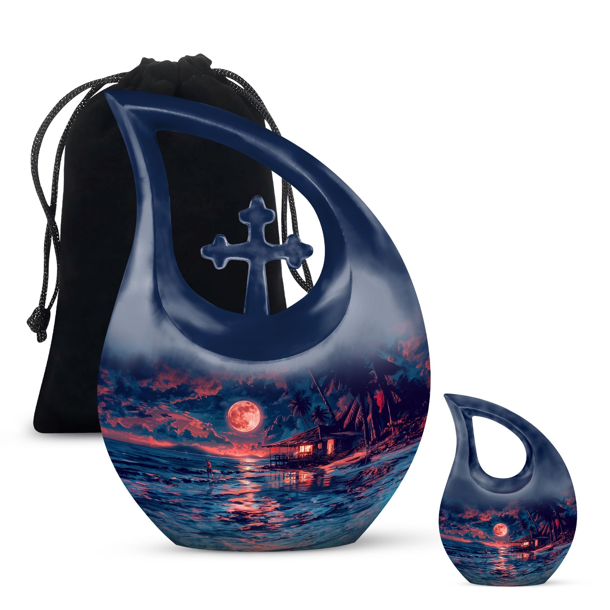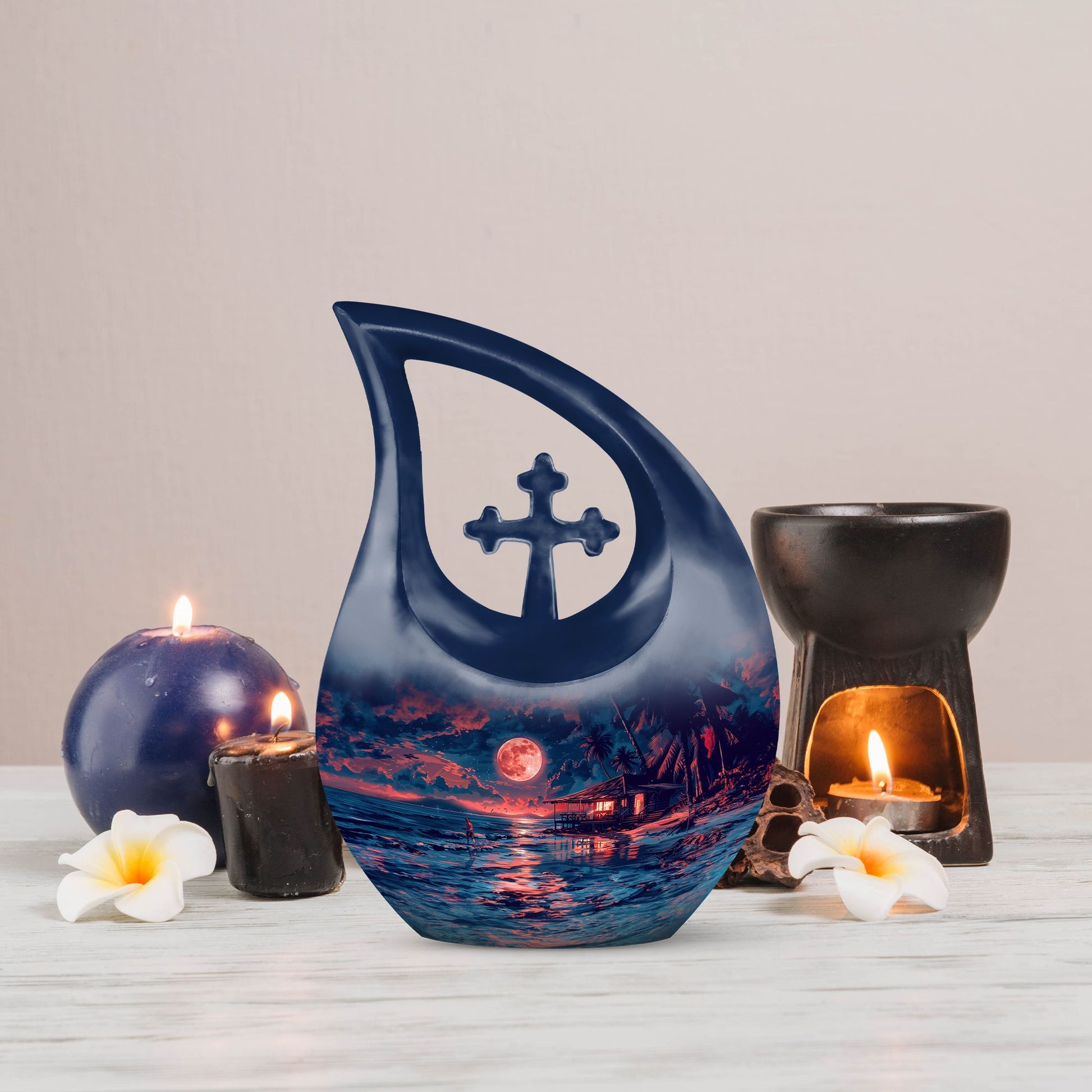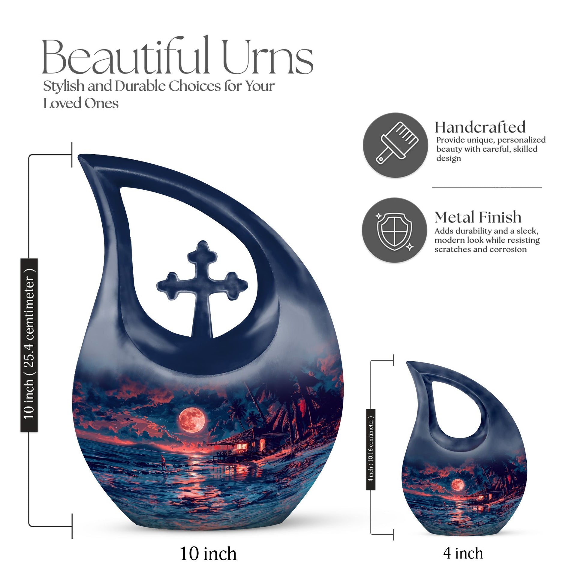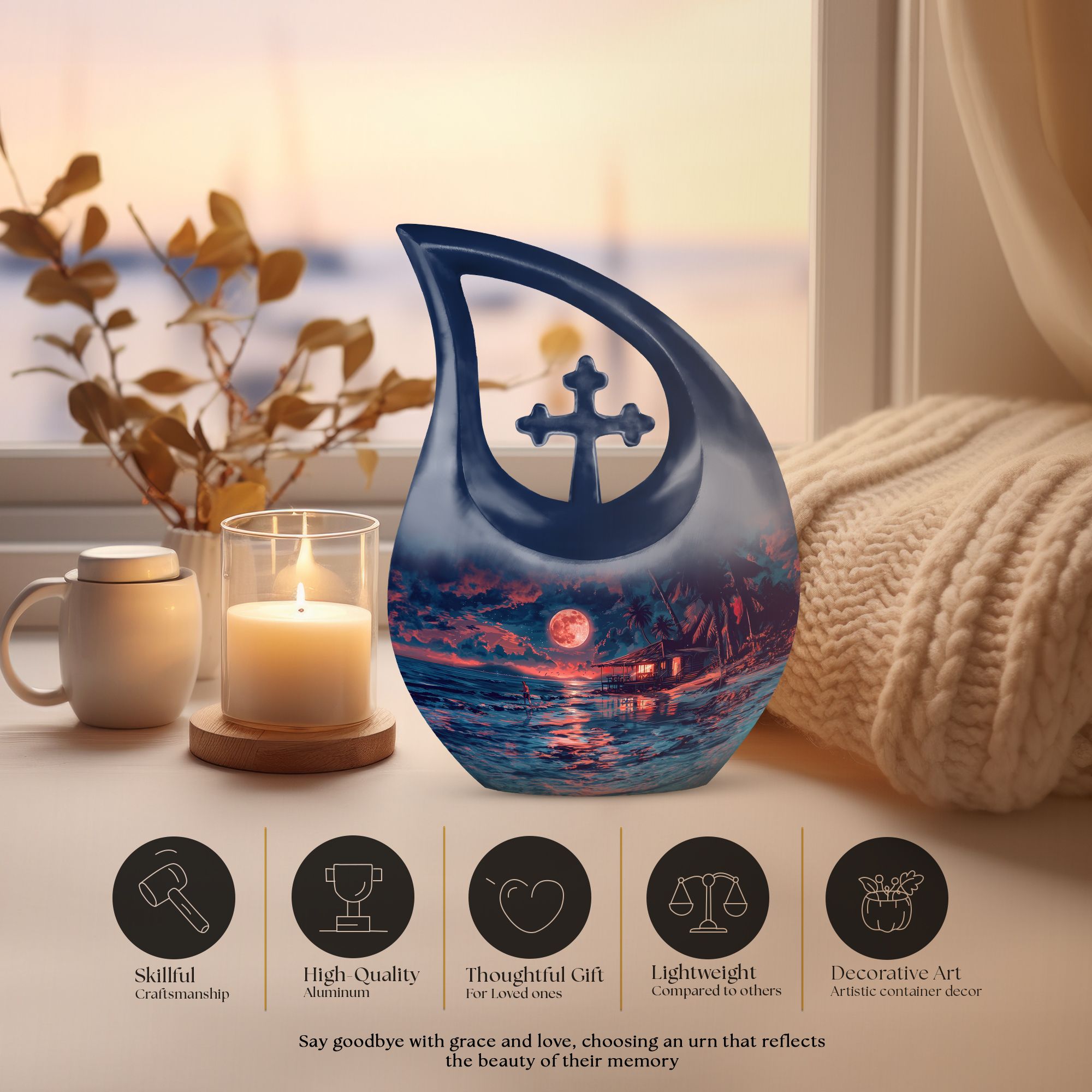 Crafted from durable aluminum, this urn showcases a tranquil night beach scene—soft waves beneath a star-lit sky—symbolizing rest, transition, and the quiet beauty of memory. Its secure screw-top lid ensures long-lasting protection, making it a thoughtful choice whether you need cremation urn human ashes, adult cremation urns, small cremation urns, or companion pieces such as mini cremation urns for human ashes for family sharing. While keepsake options like small urn for cremation human ashes or cremation keepsakes for ashes may complement your memorial, this full-size 10 inch urn serves as a dignified primary tribute.