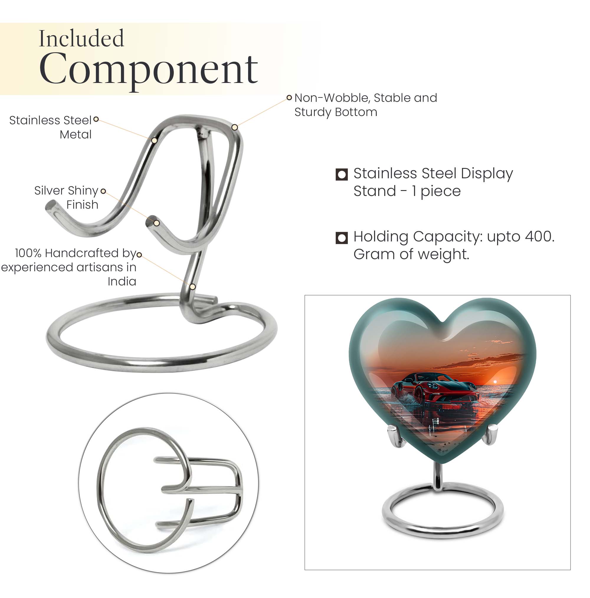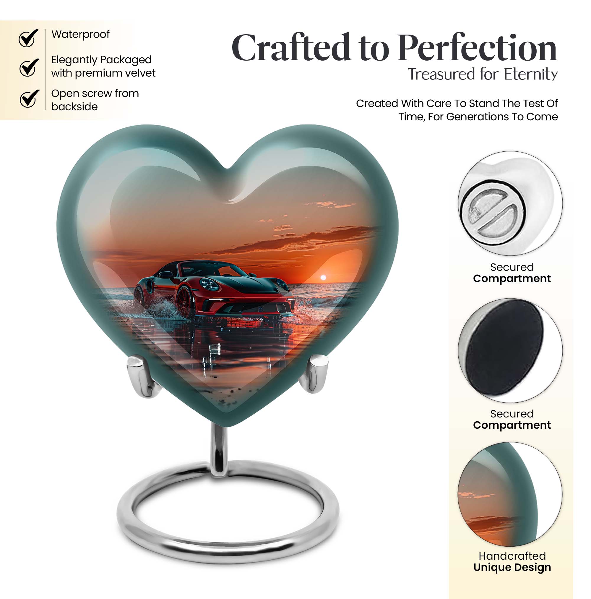 Discover the perfect tribute to a loved one with our uniquely designed Heart Urn. This outstanding piece, measuring 10 inches in height, is designed to preserve the memory of your dearly departed. Thanks to its generous 200 cubic inches capacity, it's ideal for storing the remains of adults and seniors. Crafted from robust aluminum, this urn not only offers a solid and secure containment for the ashes but is also elegant and refined in its aesthetic. The urn's Car At Beach theme adds a soft, peaceful touch evoking the freedom and beauty of a life well-lived. Add a personal note to the urn by engraving names - a beautiful way to cherish your memory of them. The package comes with a velvet pouch, designed for respectful and dignified containment of the ashes. Keywords that best describe this product are 'car Urn', 'cremation large urn', 'memorial urns', 'Burial ashes urn', 'human ash urns', 'funeral urns', and 'cremation urn for human ashes'.
