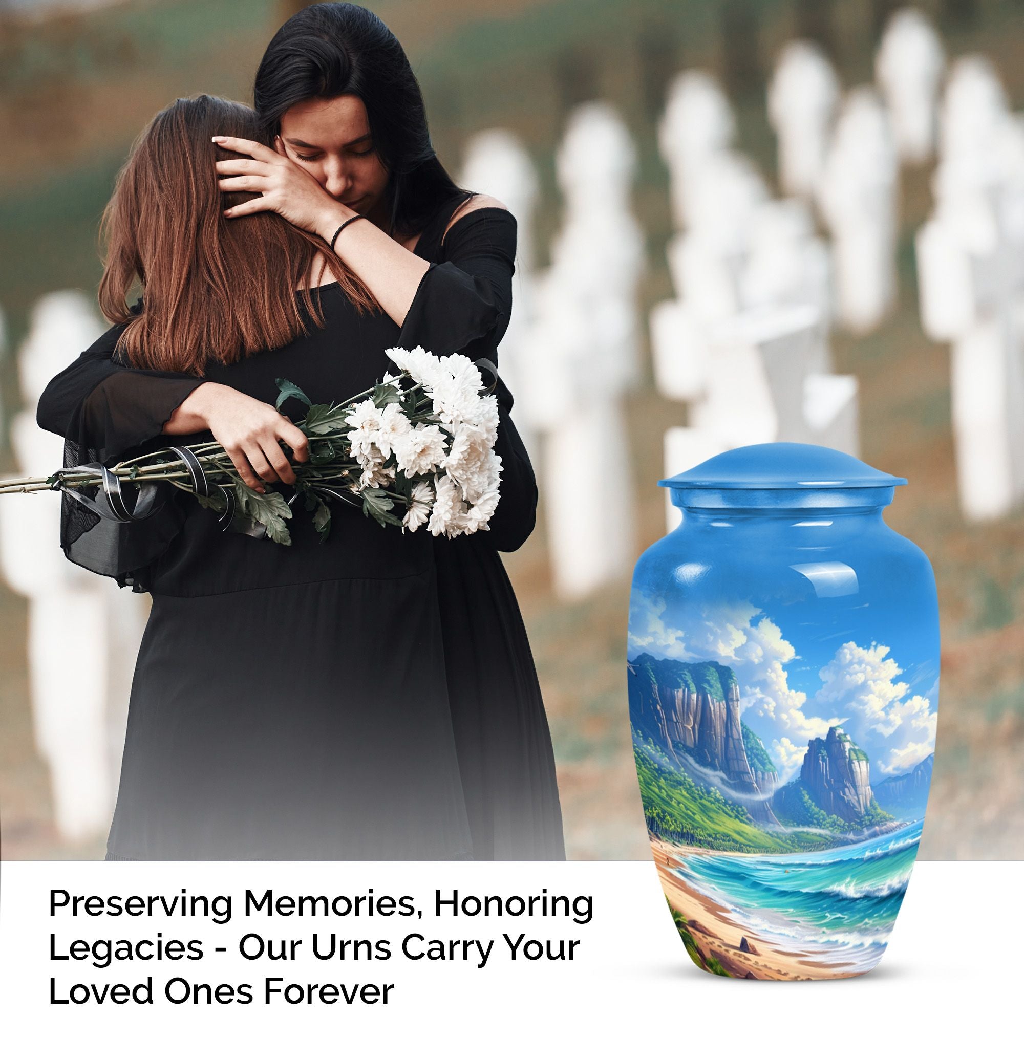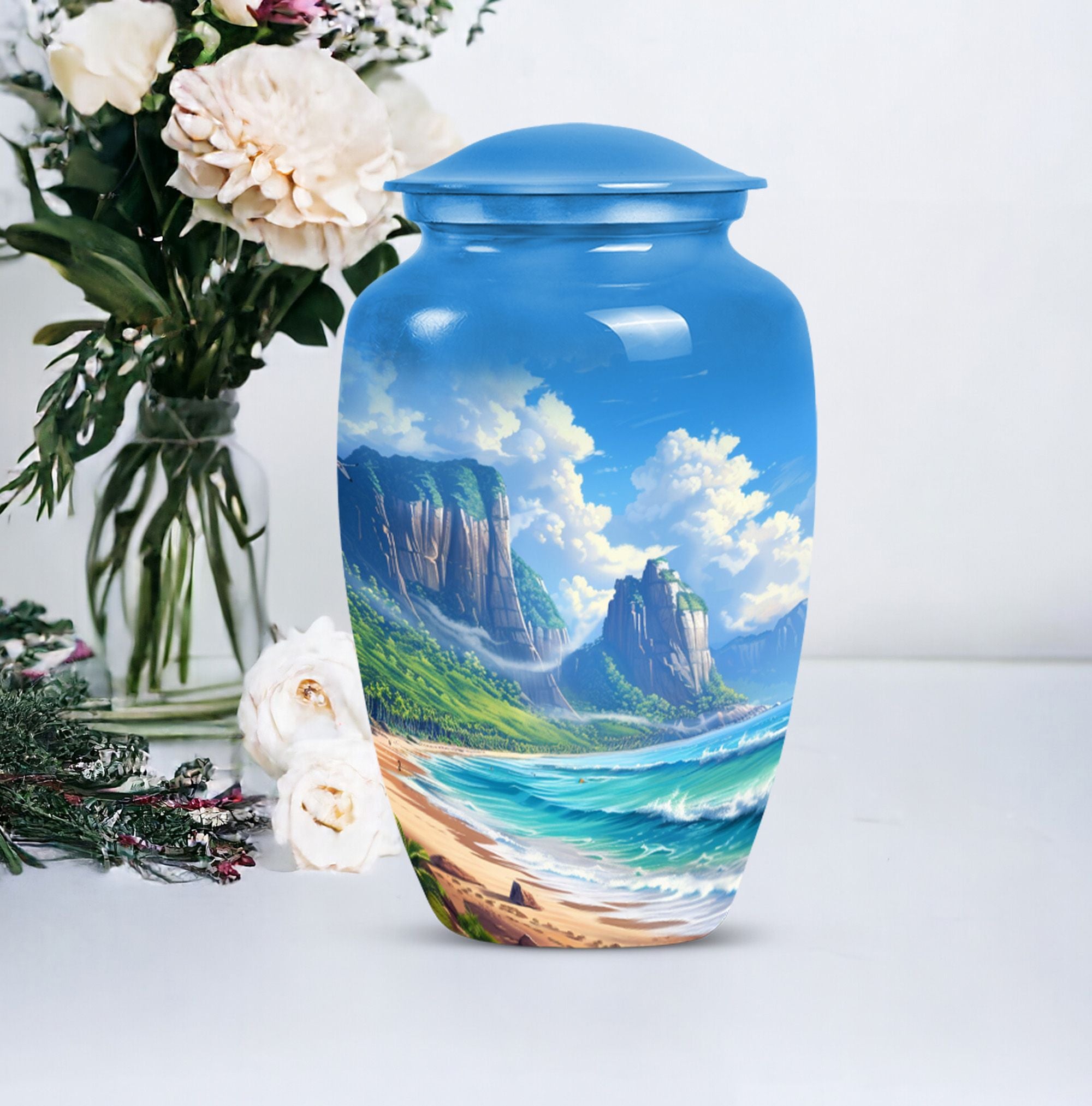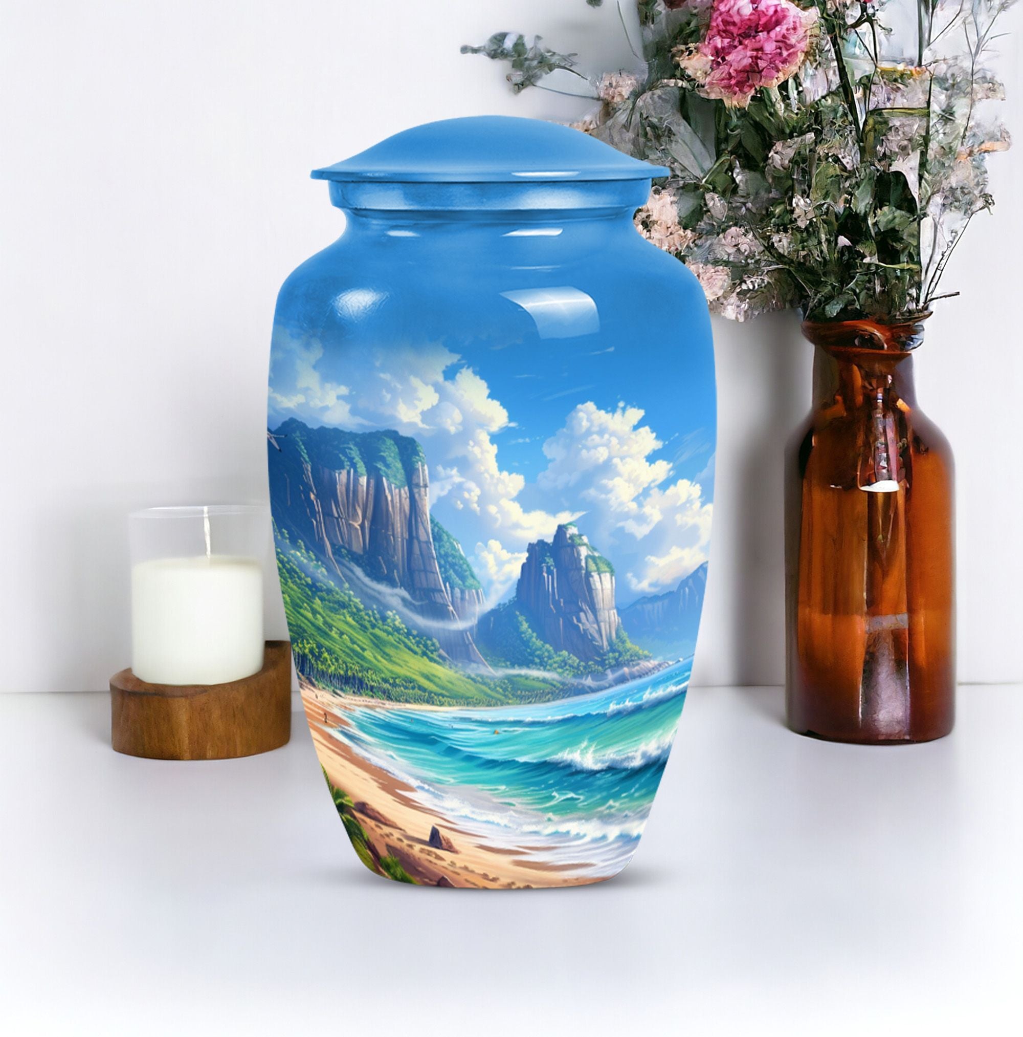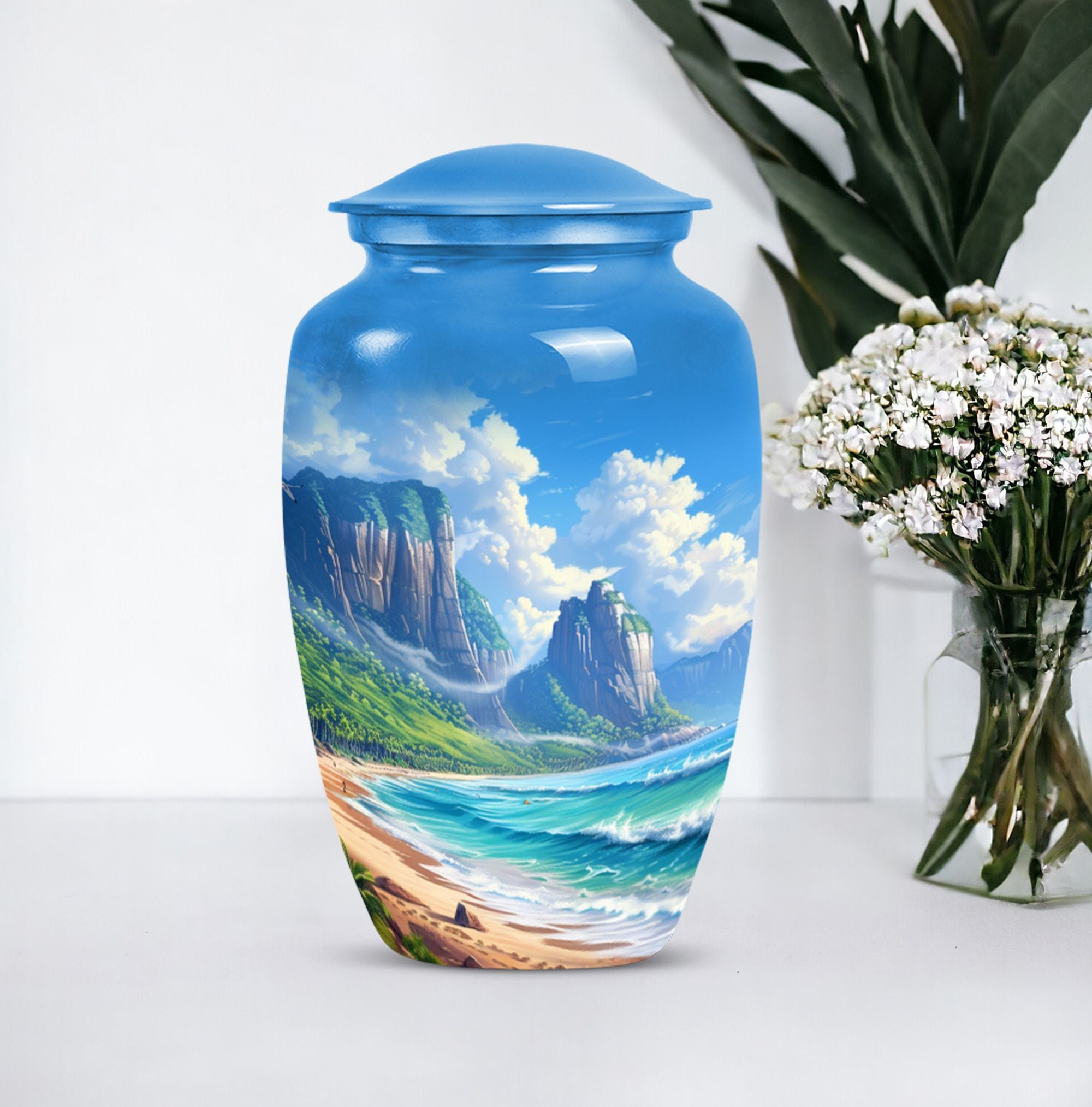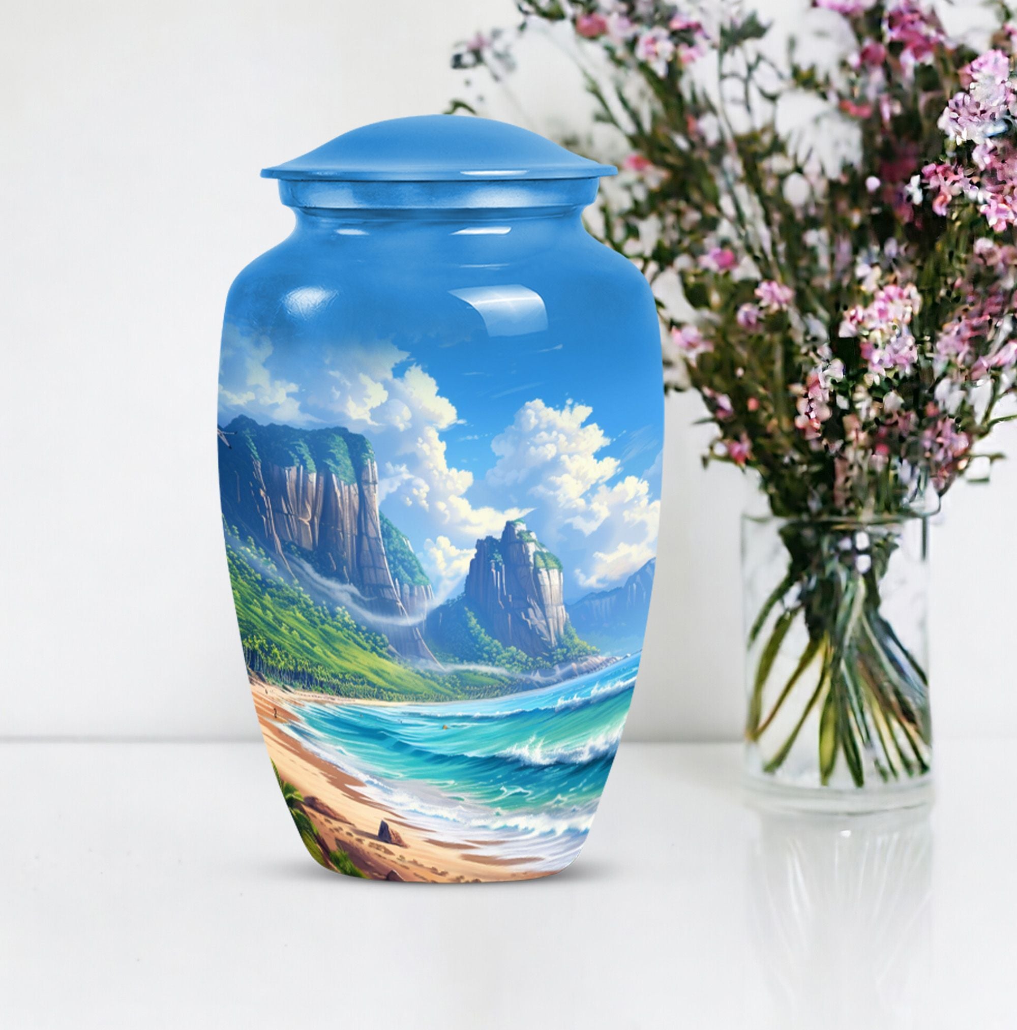 Honor the memory of your loved ones with this meticulously crafted Beach Urn. Perfect for an ocean memoriam, this 10-inch, large urn is skilfully created from robust aluminium, designed to withstand even burial in the ground. Weighing 3.3 pounds and standing 10 inches in height, it provides a capacity of 200 cubic inches to respectfully contain the ashes of adults. This memorial urn aesthetically captures a timeless appeal with a classic design, accompanied by a delicate flower theme. It also offers you the opportunity to personalize by engraving names, a thoughtful touch for remembrance. The funeral urn package includes a soft velvet pouch, ensuring dignified containment and transport of ashes. Combining functionality with unique aesthetics, this memorial urn for burial ensures a worthy tribute during remembrance ceremonies. Seamlessly merge your tribute with the calming aura of the seaside with this Beach Urn. It represents not only a resting place of peace but also an emblem of timeless memory.