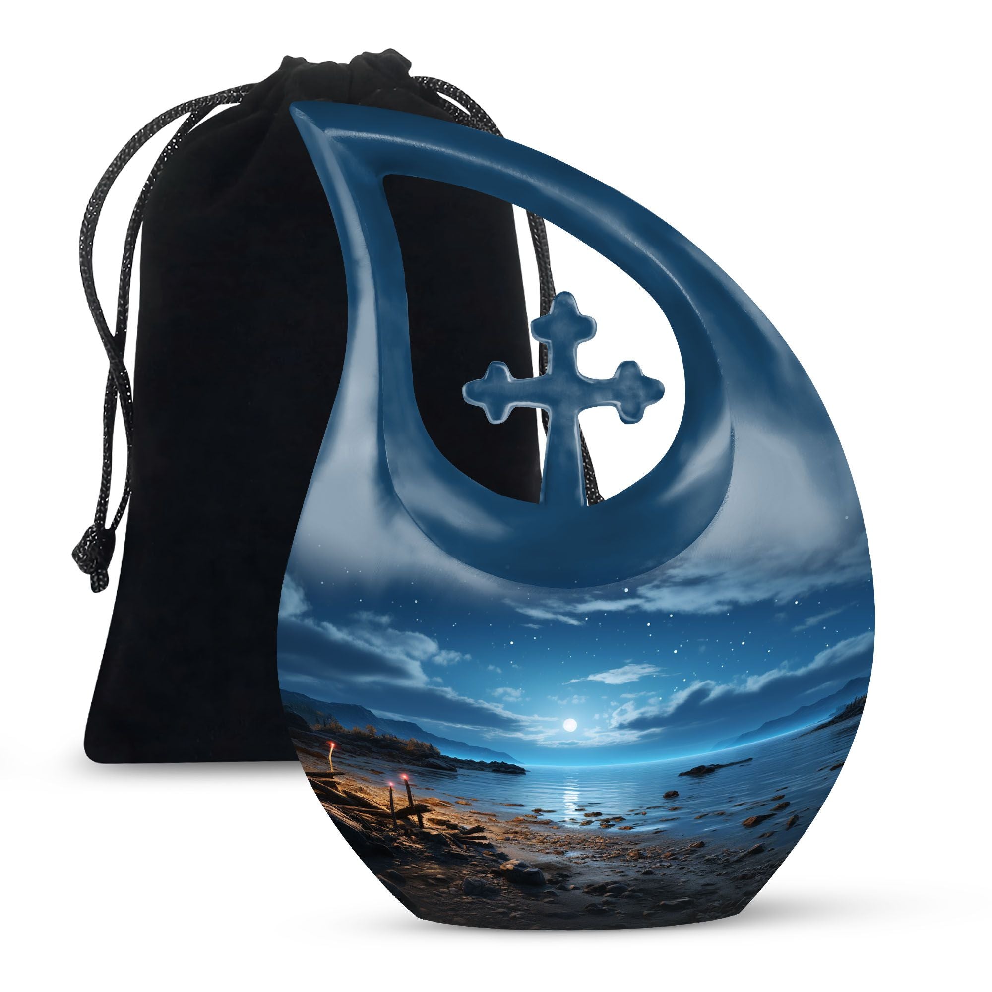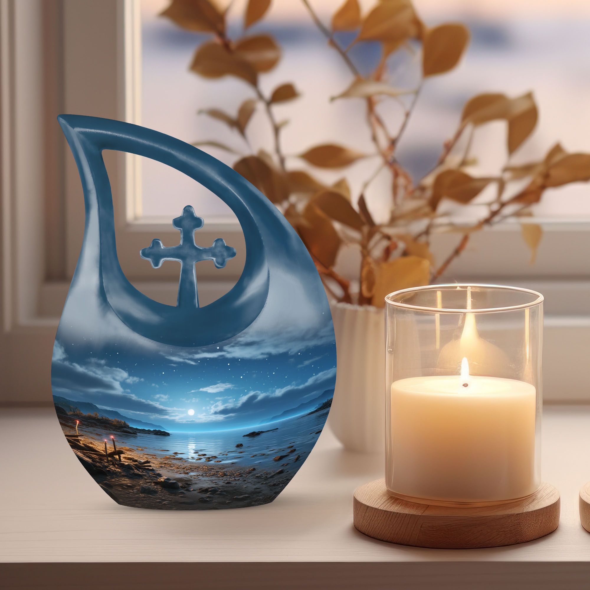 Handcrafted from premium aluminum, this women adult urn features a hand-painted night beach scene in calming shades of blue and silver. The durable finish ensures longevity, while the secure screw-top lid keeps ashes safely contained. Ideal for home memorials or burials, this urn for adult male & female offers timeless elegance suitable for both men and women. The luminous details make it one of the most beautiful urns women and families can choose for remembrance.