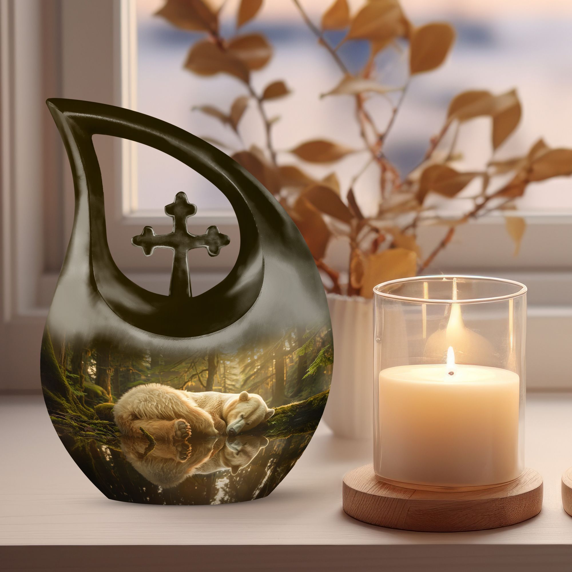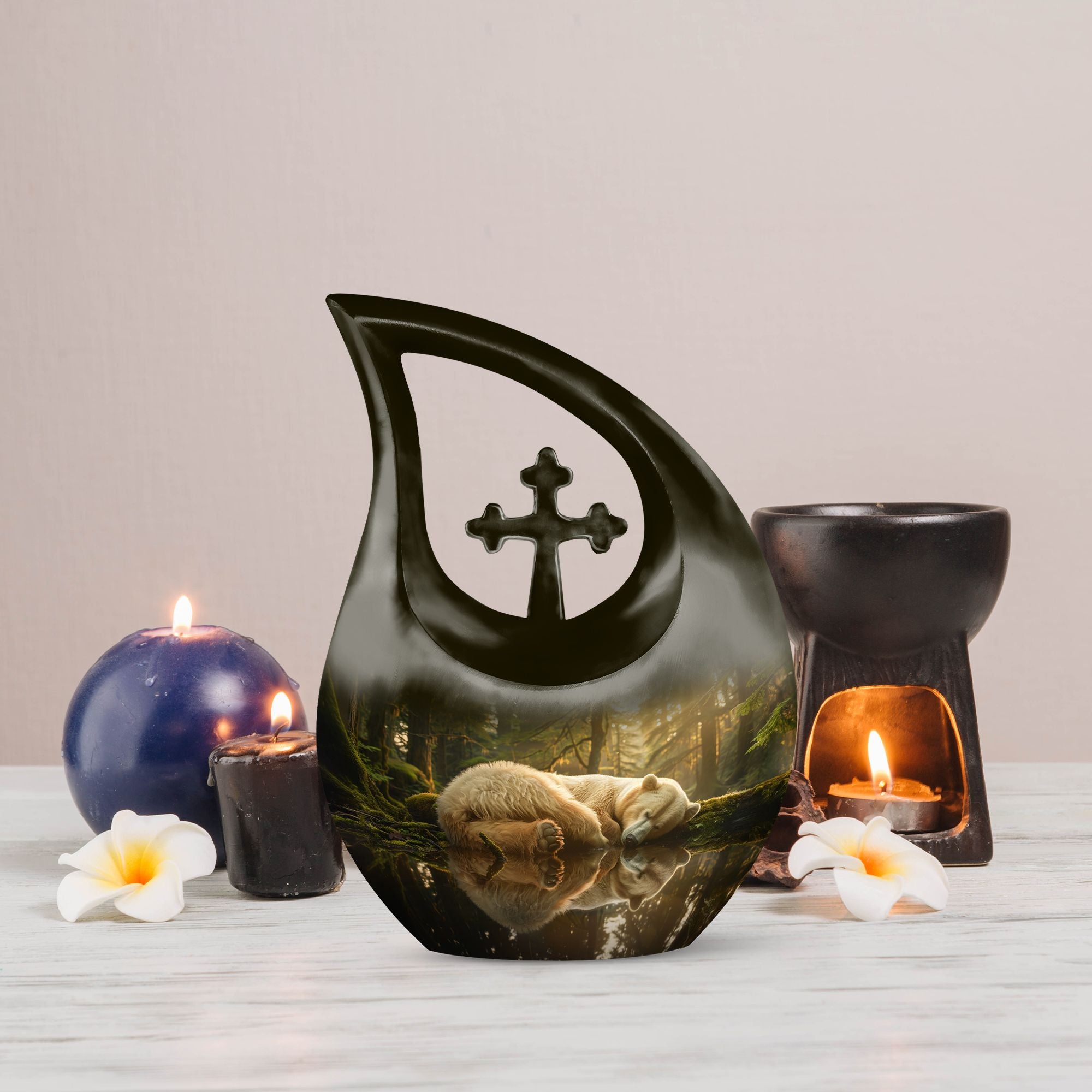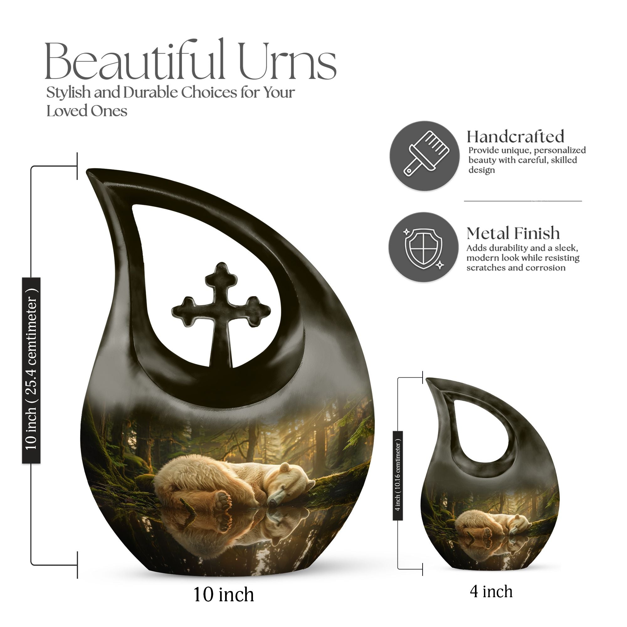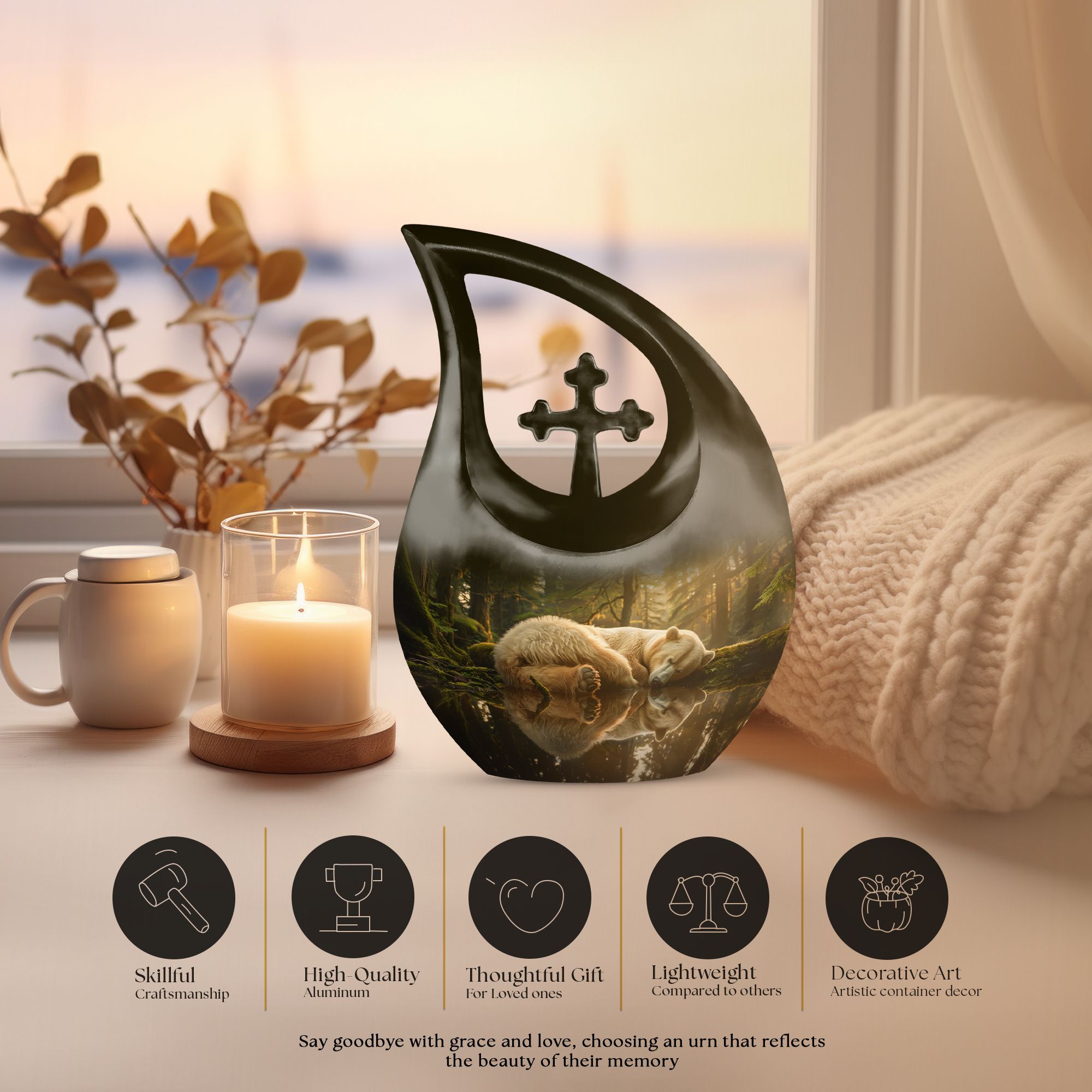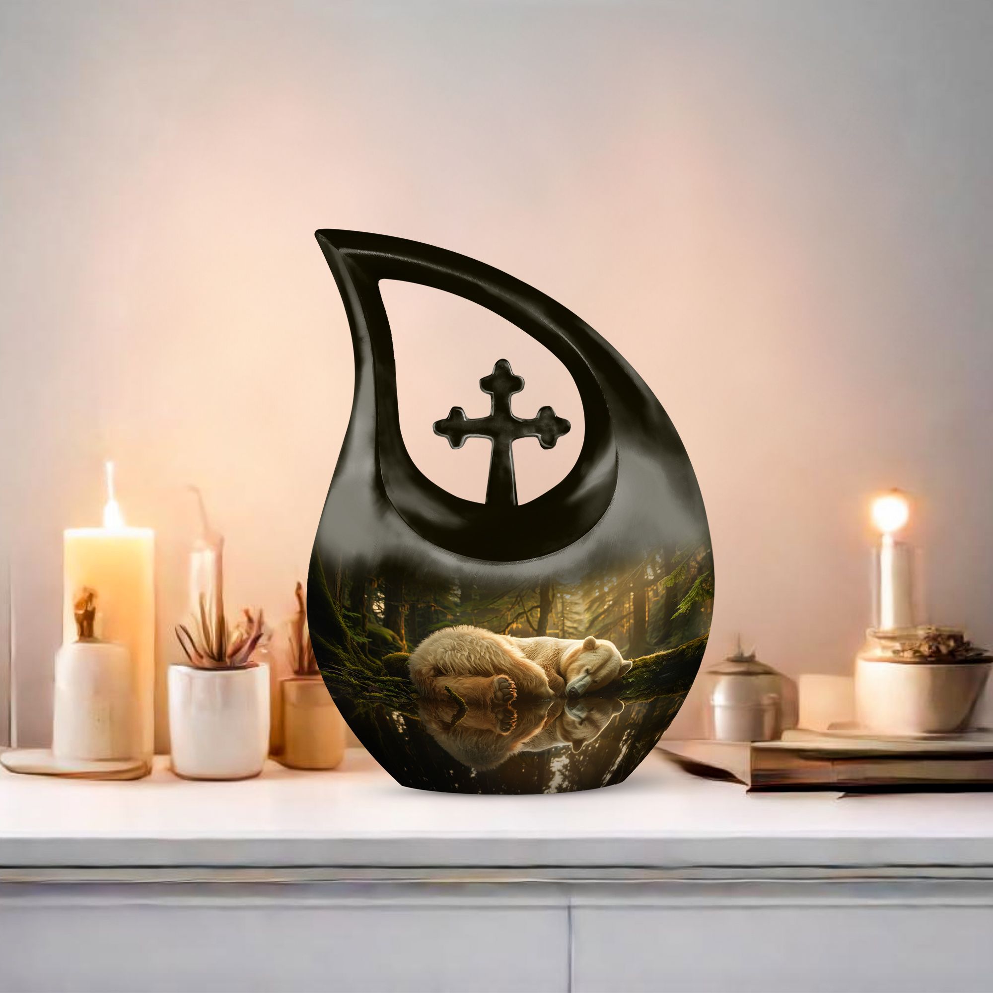 Comfort the heart with the tranquil beauty of our Medium Size Bear Urn, a high-quality tribute to your loved one's memory. Rendered with superior craftsmanship, this piece is made of durable Aluminum, ensuring lasting strength and resilience. This Large Urn stands at 10 inches tall, accommodating a roomy capacity of 200 cubic inches, suitable for accommodating ashes securely. The 'Cross Drop' theme is elegantly represented, creating a soothing, serene aesthetic, echoed by a harmonious bear symbol. An accompanying velvet pouch ensures safe containment of the ashes, adding an additional layer of respect and dignity. The urn can be personalized with engraved names, offering a unique touch of remembrance. Weighing 3.3 pounds, it’s substantial enough to be a lasting memorial centerpiece. Delve into more than just ordinary with this uniquely crafted memorial bear urn, designed for those in search of 'Medium Size Urns' or 'Keepsake For Ashes For A Man'. The perfect blend of functionality, sentiment, and elegance. Ideal for those looking for 'Customized Urns For Ashes For Adults' or 'Personal Urns'.