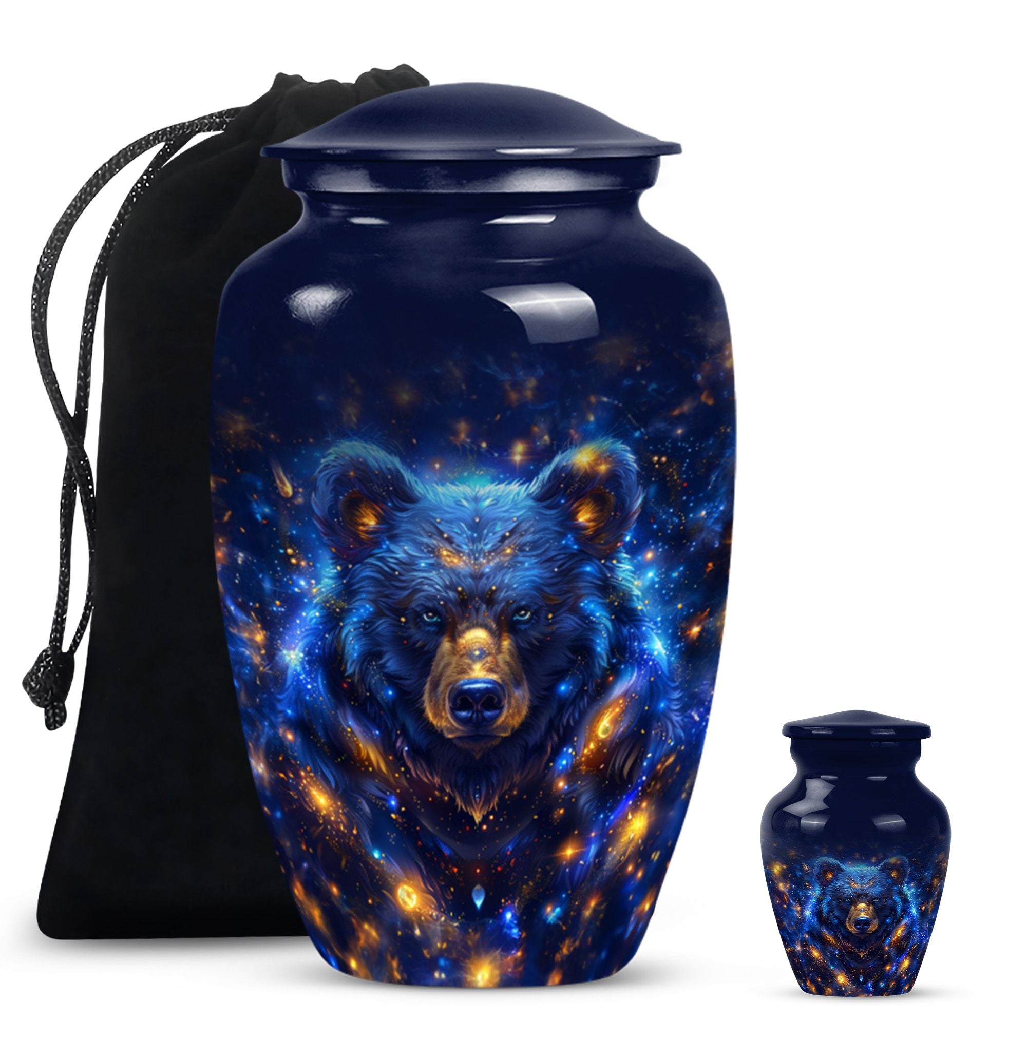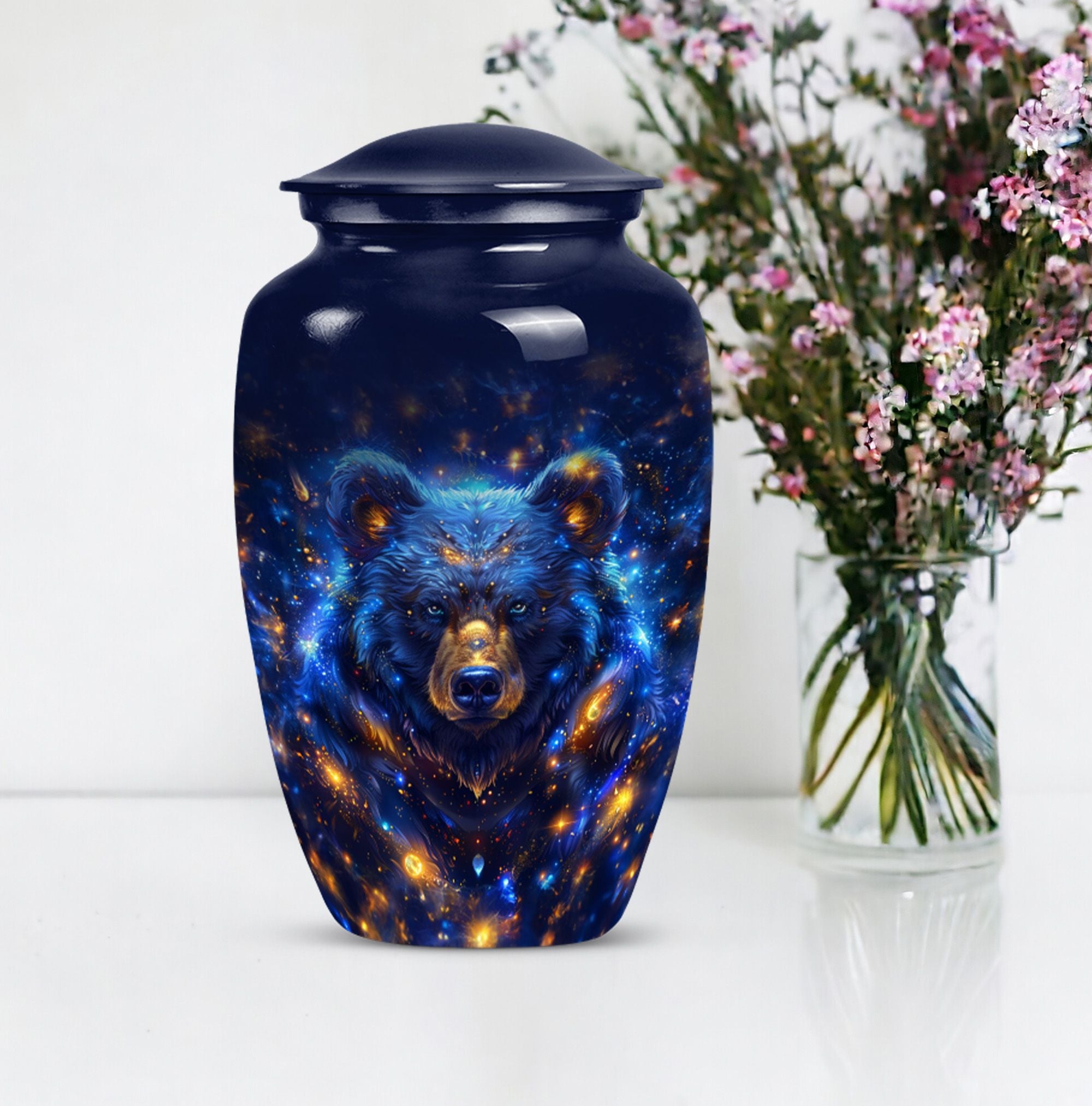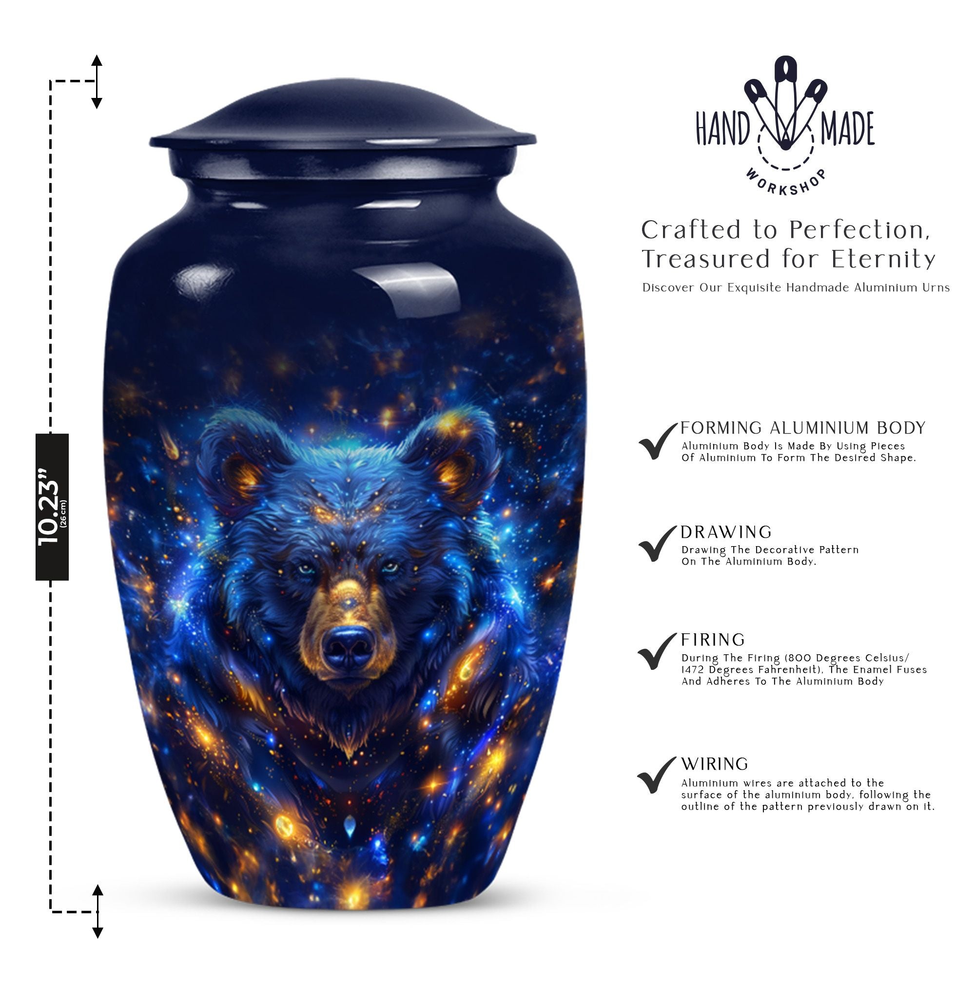 Honor lasting memories with our exquisite bear urn. A treasured ceremonial piece that elegantly embodies a timeless abstract theme. Its majestic size of 10 inches, having the capacity to contain up to 200 cubic inches of ashes and is crafted for adult burials. Our large urn depicts the profound heaviness of loss while ensuring a dignified memory - weighing 3.3 pounds and irradiating a subtle presence. Its durable aluminium construction ensures longevity and resilience. Personalize this unique piece with engraved names, adding a touching tribute to your loved ones. Moreover, it comes with a soft, velvety pouch ensuring containment and protection of cherished ashes. This burial urn perfectly captures the essence of commemoration and is ideal for those searching for 'cremation urns for dad', 'memorial adult urns', or adult burial alternatives. Note: This design of our product doesn’t offer. Embark upon a journey of remembrance with our bear urn.