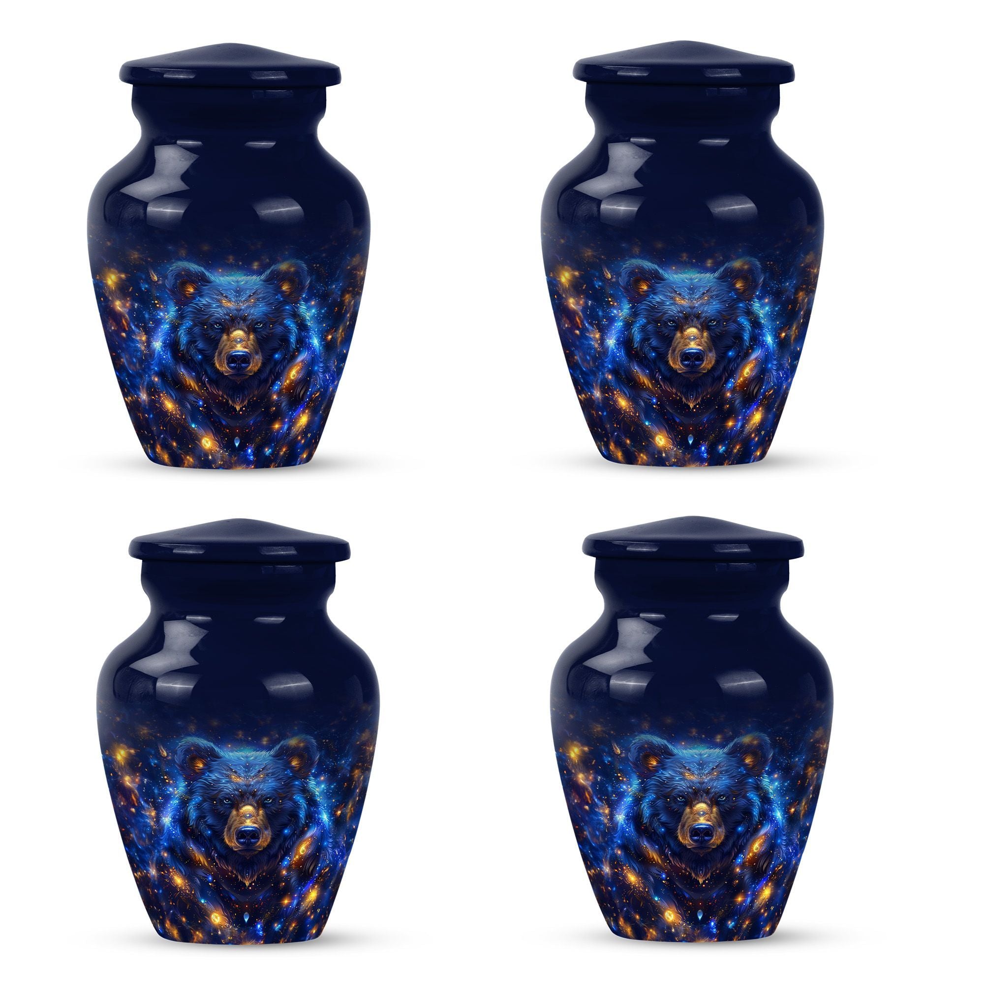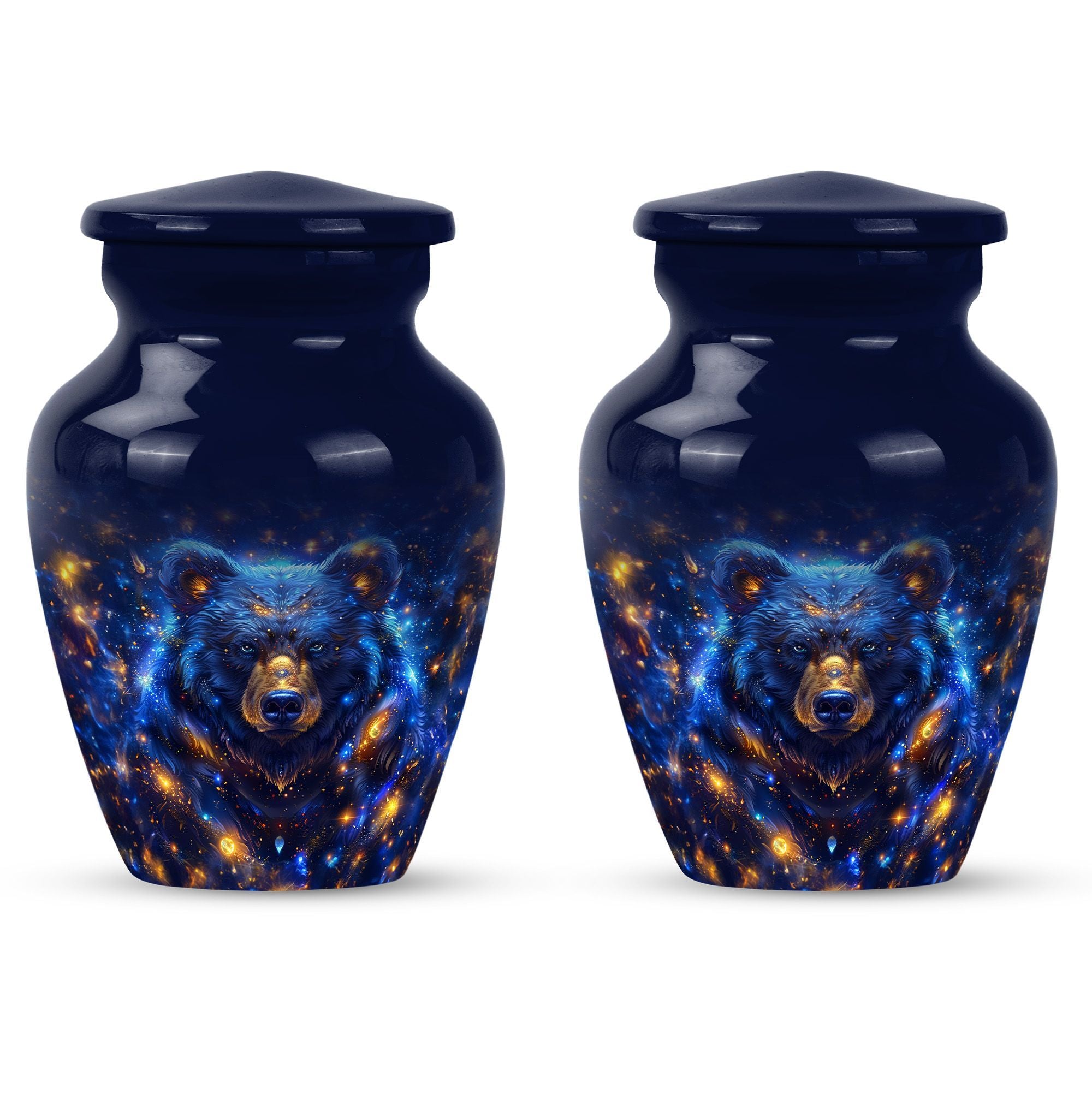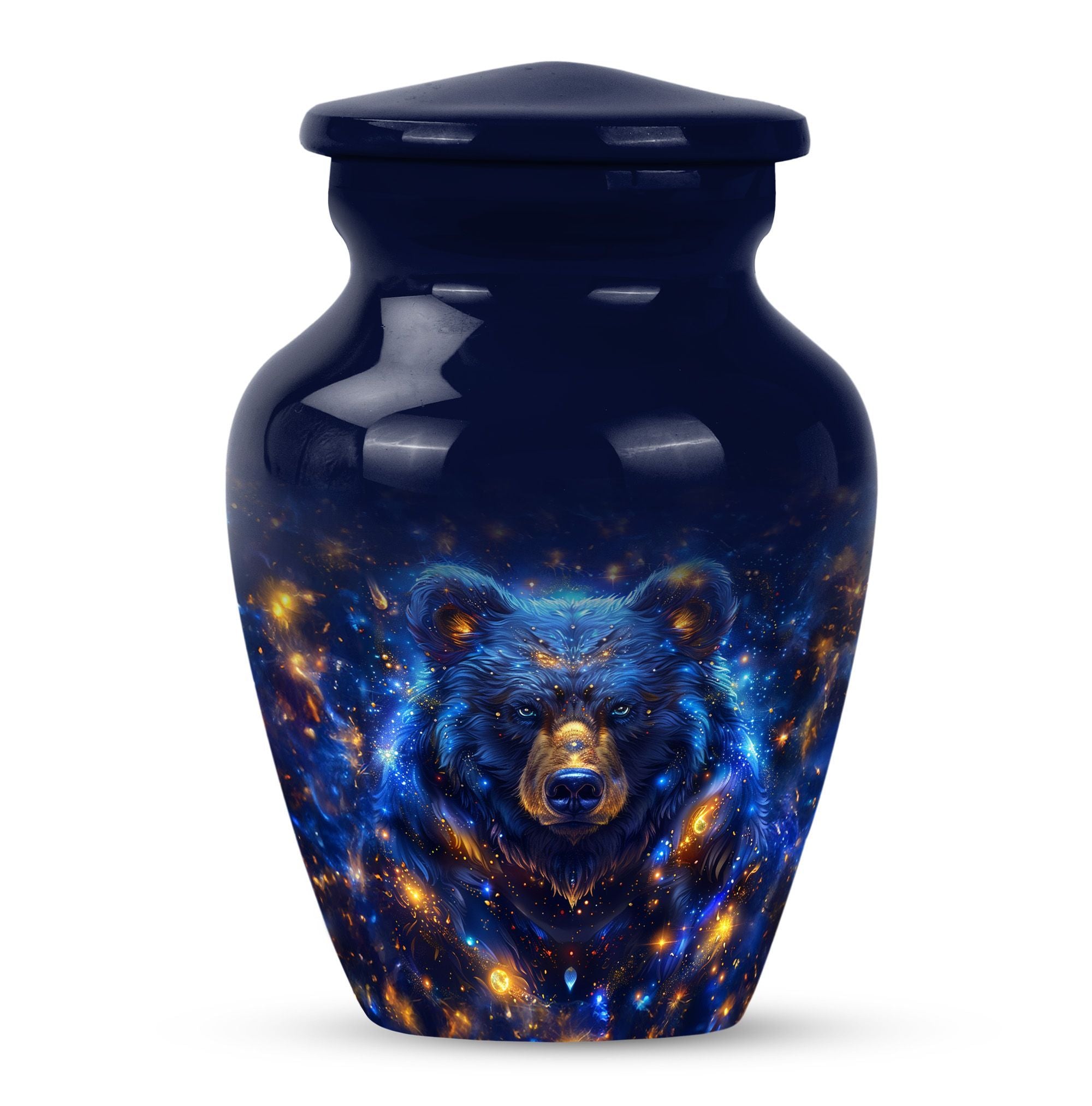 Honor lasting memories with our exquisite bear urn. A treasured ceremonial piece that elegantly embodies a timeless abstract theme. Its majestic size of 10 inches, having the capacity to contain up to 200 cubic inches of ashes and is crafted for adult burials. Our large urn depicts the profound heaviness of loss while ensuring a dignified memory - weighing 3.3 pounds and irradiating a subtle presence. Its durable aluminium construction ensures longevity and resilience. Personalize this unique piece with engraved names, adding a touching tribute to your loved ones. Moreover, it comes with a soft, velvety pouch ensuring containment and protection of cherished ashes. This burial urn perfectly captures the essence of commemoration and is ideal for those searching for 'cremation urns for dad', 'memorial adult urns', or adult burial alternatives. Note: This design of our product doesn’t offer. Embark upon a journey of remembrance with our bear urn.