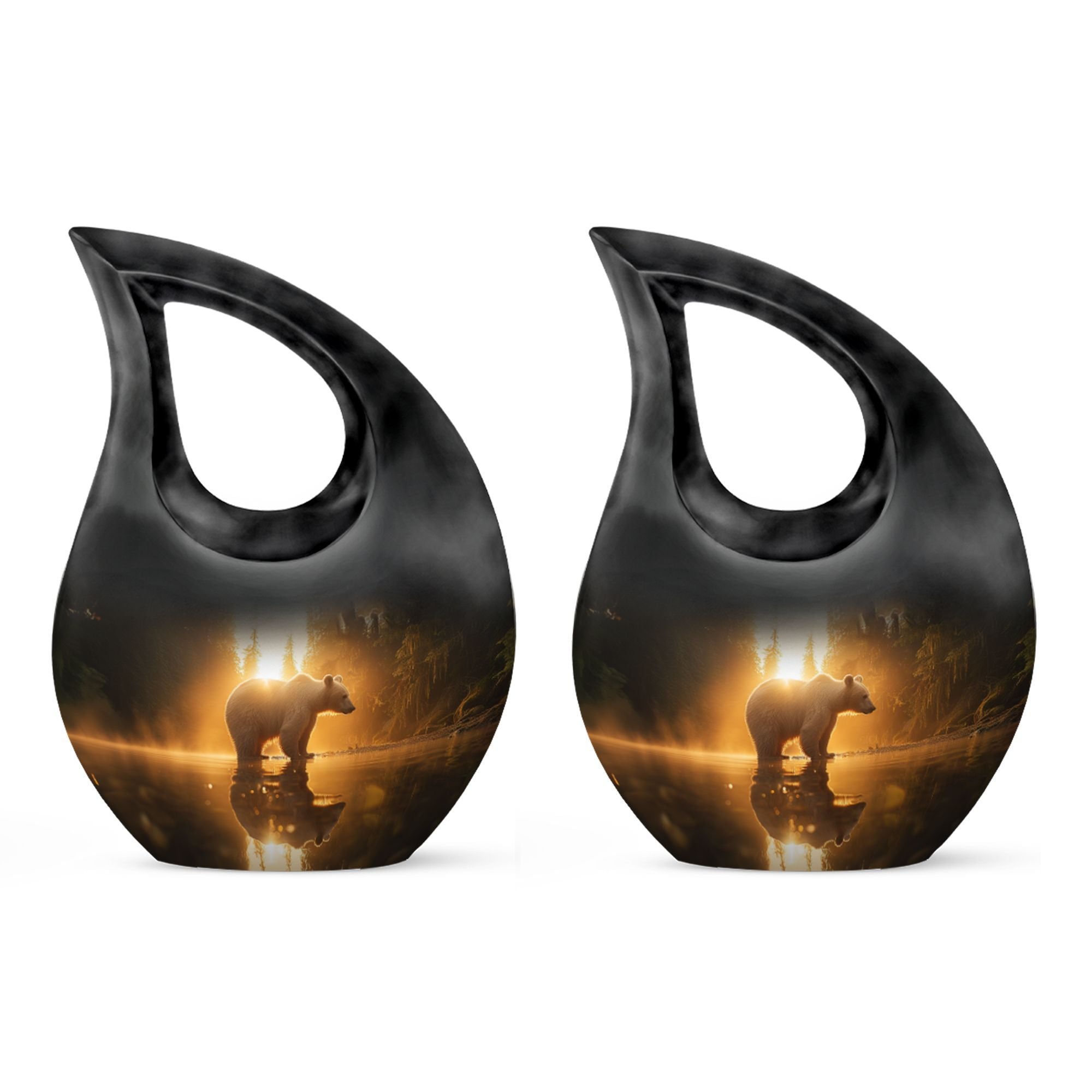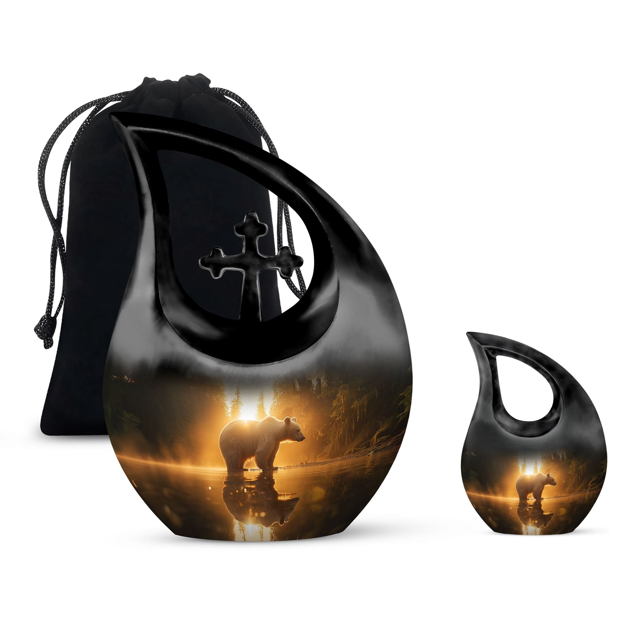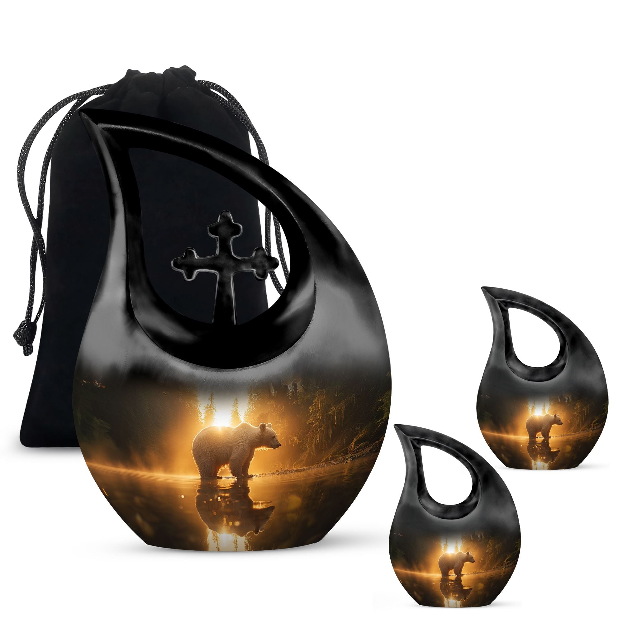 Honor your loved one with our 'Bear Urn', a standout selection in the realm of memorial urns. With an impressive capacity of 200 cubic inches, this large urn embodies finesse and strength reflecting the Rex of wilderness - the bear. Fashioned from robust aluminium and weighing a sturdy 3.3 pounds, it stands tall at 10 inches, aptly crafted to house the ashes of adult men. It's not an urn off the assembly line. It's a 'Cross Drop' artwork that reveals the eternal journey. The package includes a premium velvet pouch, ensuring secure containment and sublime presentation of the ashes. Add a personal touch with custom engraving options - inscribe names or meaningful phrases to create a testament to a life beautifully lived. With our Bear Urn, keep the memory of your loved one forever close in a unique and lasting way. Perfect when seeking extra large cremation urns, Urns for men's ashes, or keepsake for ashes for a man.