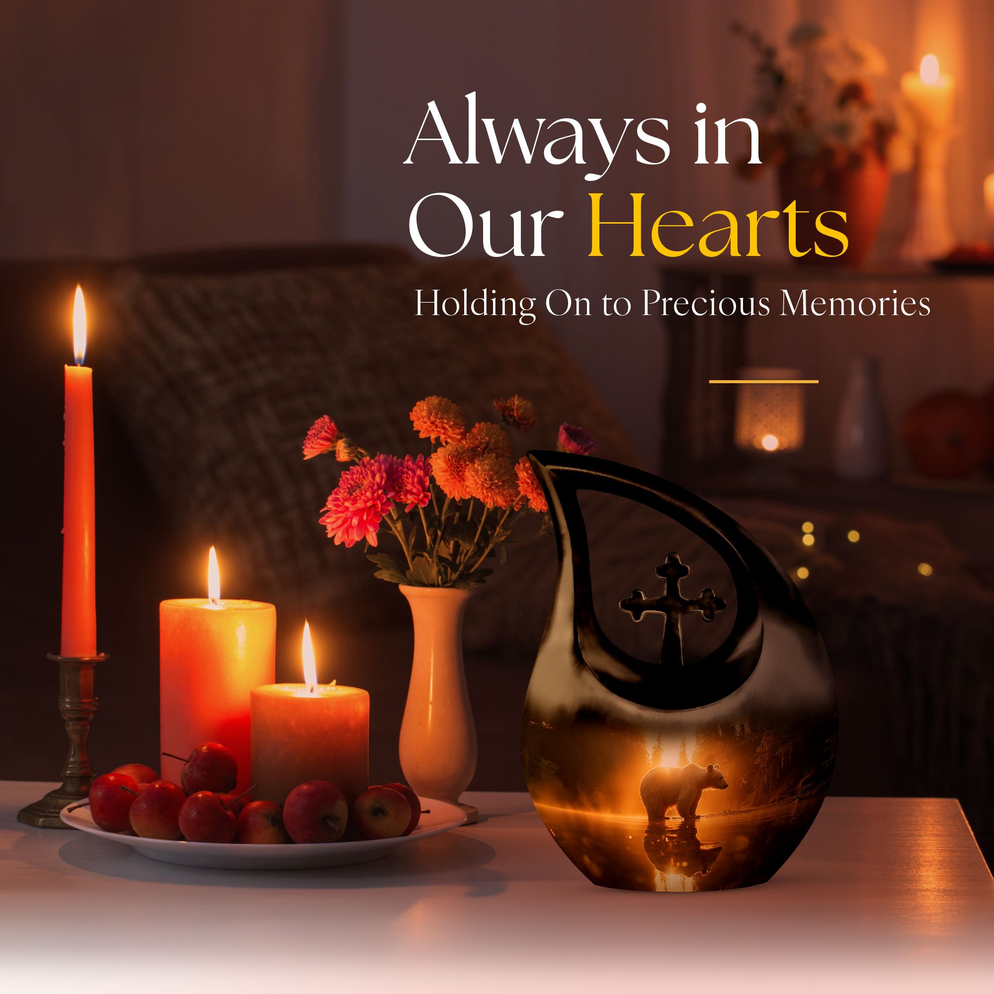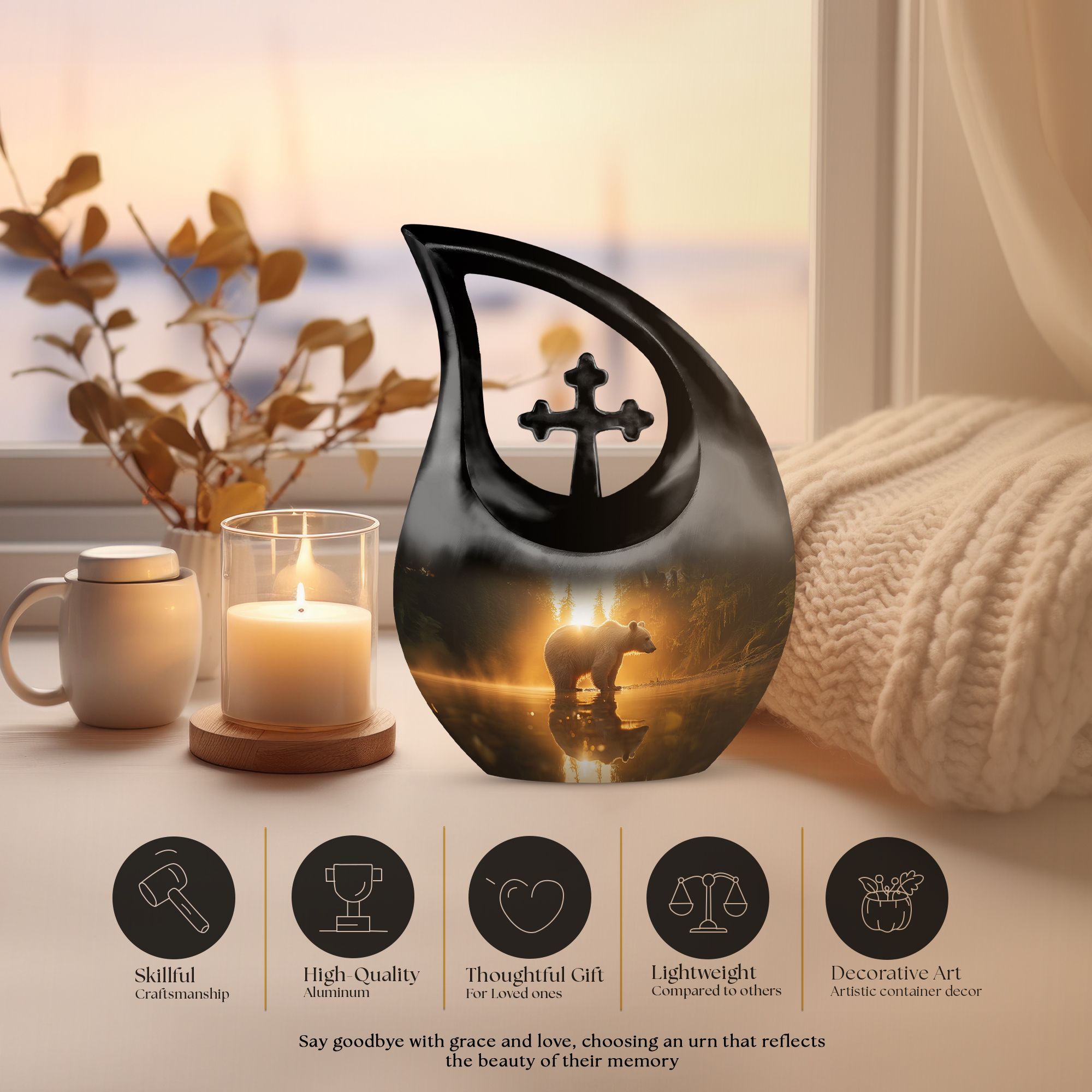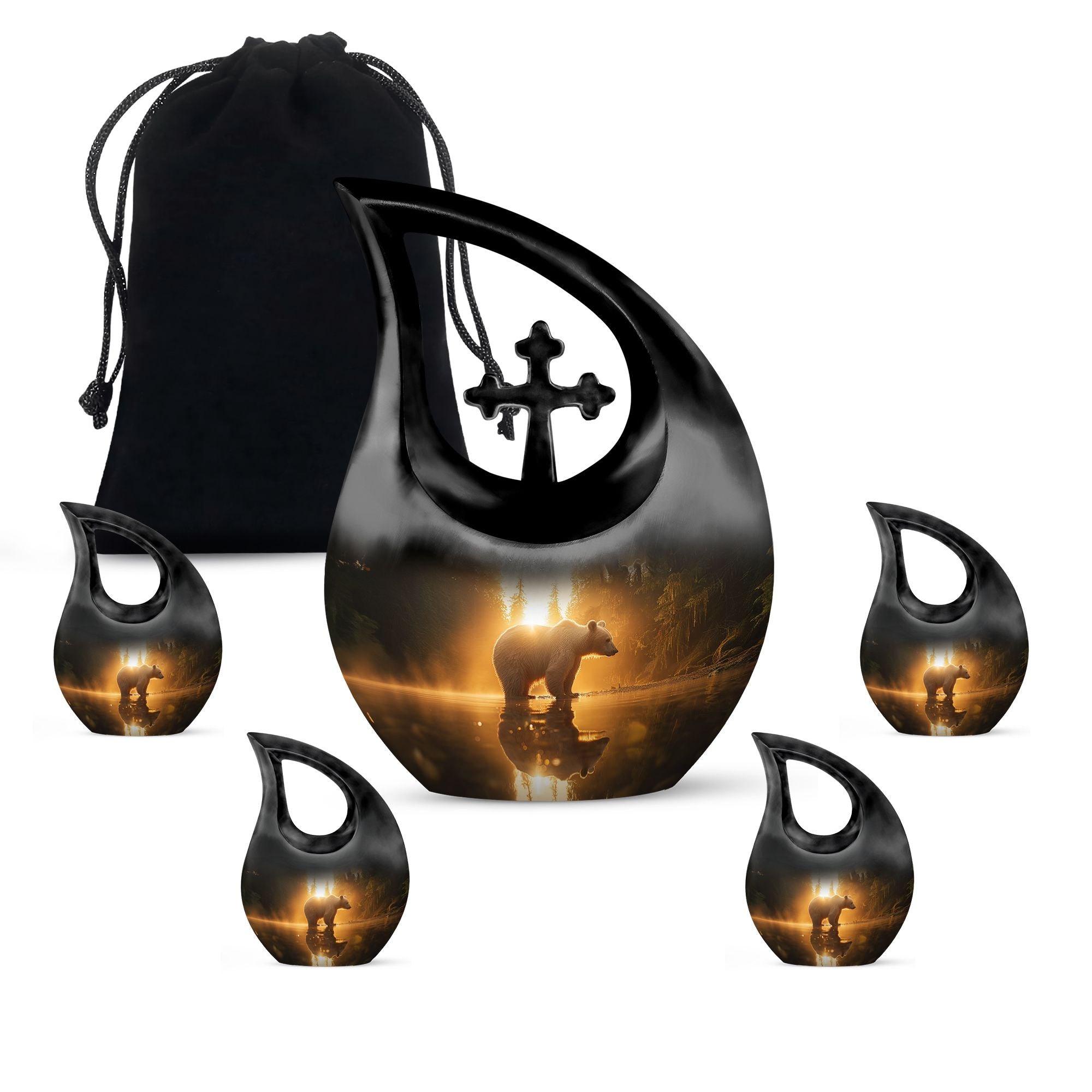 Honor your loved one with our 'Bear Urn', a standout selection in the realm of memorial urns. With an impressive capacity of 200 cubic inches, this large urn embodies finesse and strength reflecting the Rex of wilderness - the bear. Fashioned from robust aluminium and weighing a sturdy 3.3 pounds, it stands tall at 10 inches, aptly crafted to house the ashes of adult men. It's not an urn off the assembly line. It's a 'Cross Drop' artwork that reveals the eternal journey. The package includes a premium velvet pouch, ensuring secure containment and sublime presentation of the ashes. Add a personal touch with custom engraving options - inscribe names or meaningful phrases to create a testament to a life beautifully lived. With our Bear Urn, keep the memory of your loved one forever close in a unique and lasting way. Perfect when seeking extra large cremation urns, Urns for men's ashes, or keepsake for ashes for a man.