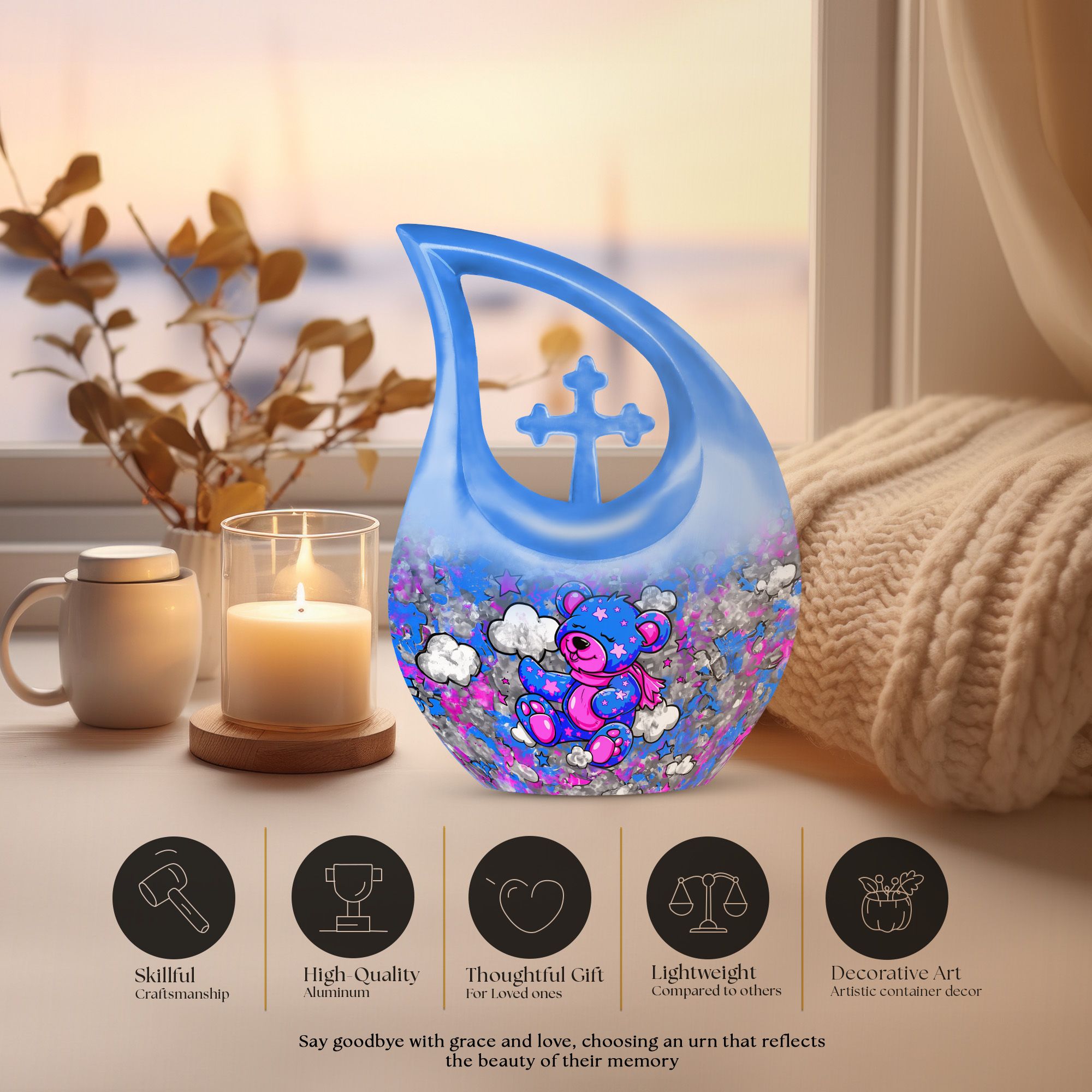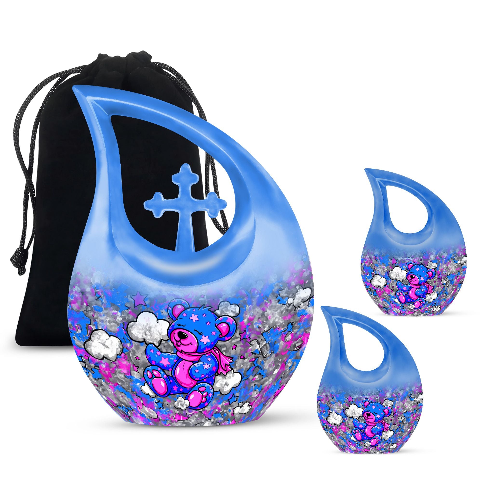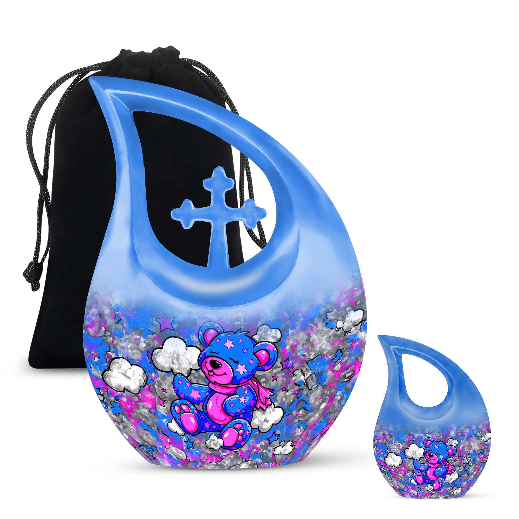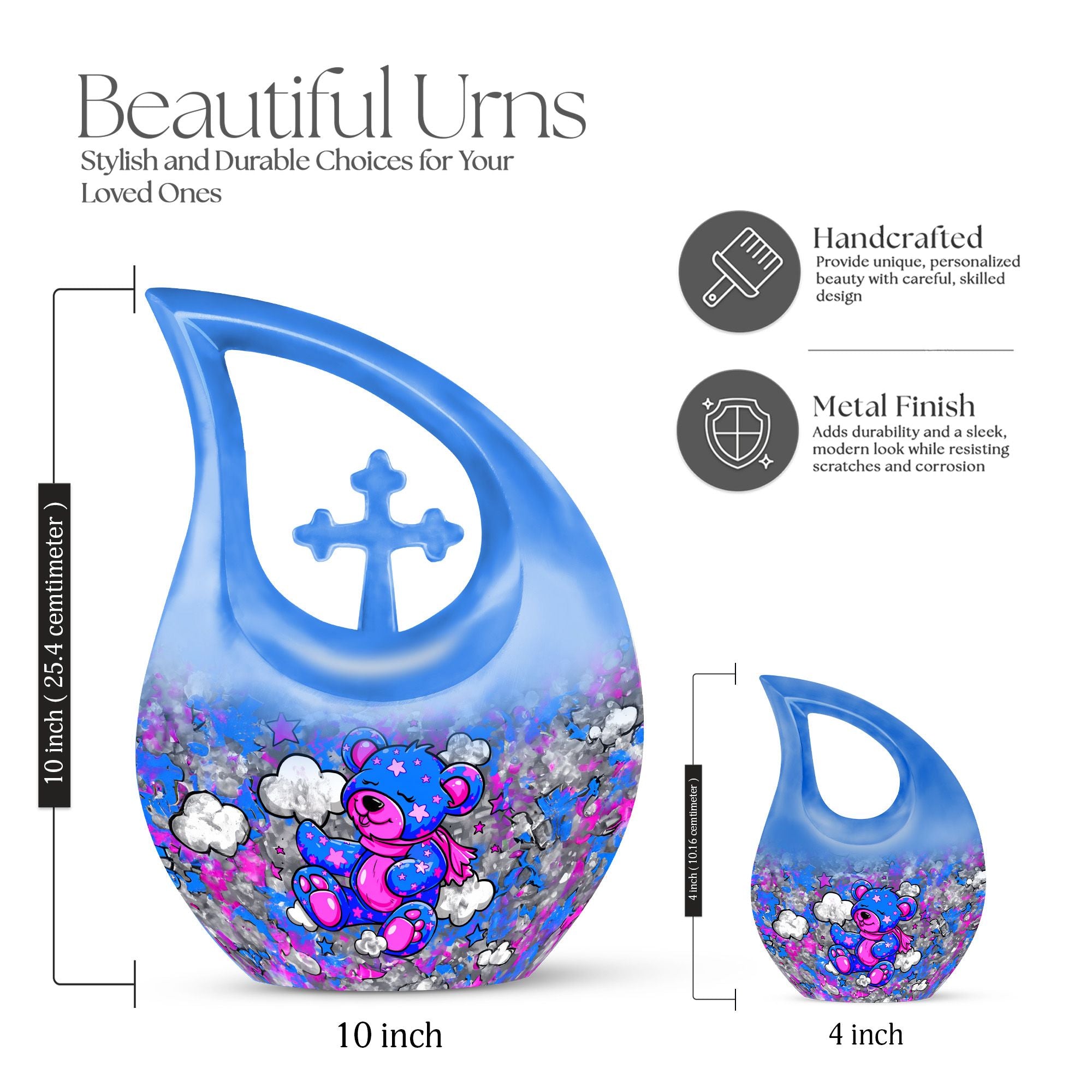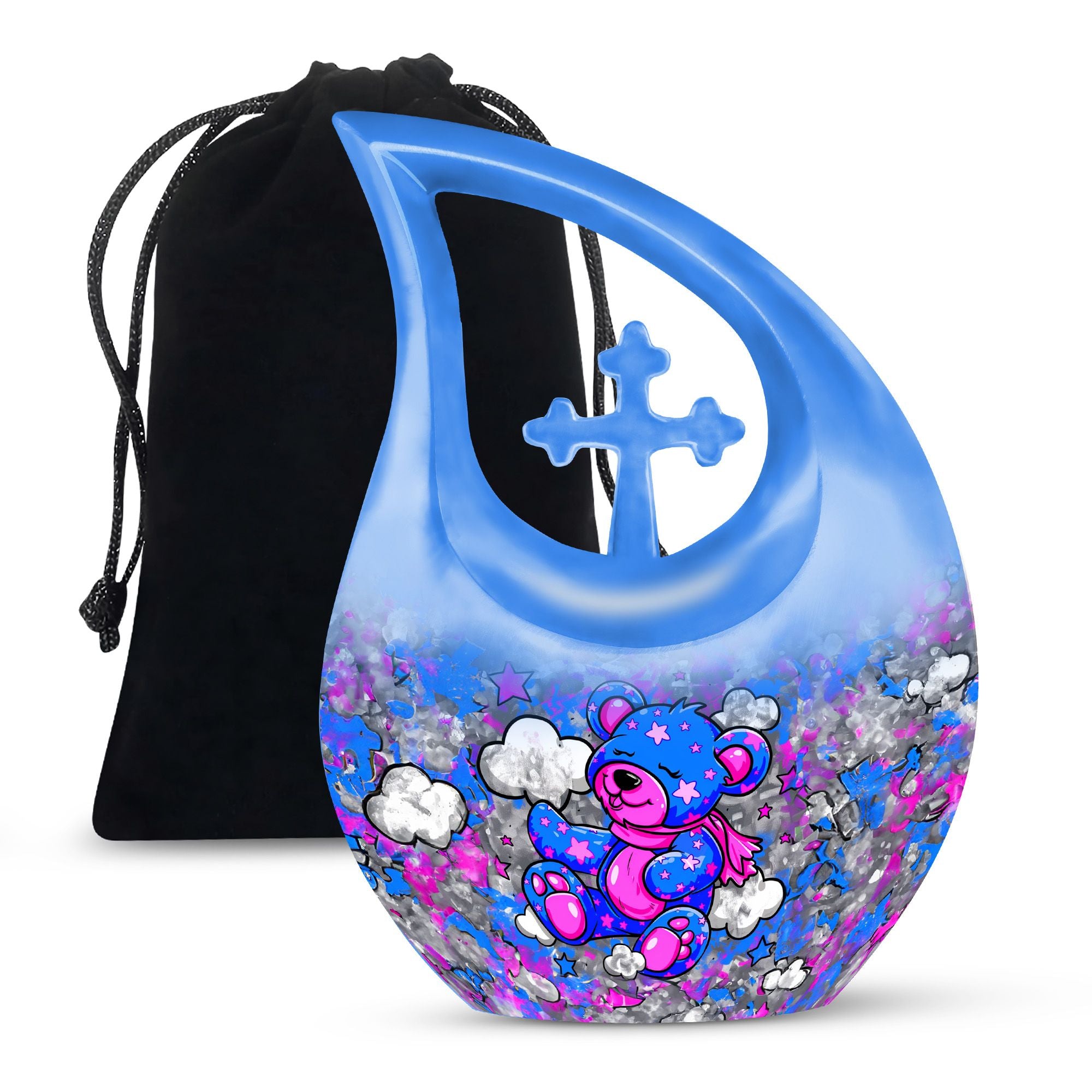 Convey your deepest sentiments and honor your dearly departed with our Modern Bear Urn. Crafted meticulously from high-quality Aluminium, this Large Urn showcases a unique and reverent 'Cross Drop' theme that signifies serenity and love. With a striking 'Bear' motif, this urn measures a comfortable 10 Inch in size and possessing 200 cubic inches in capacity, it can hold a substantial amount of ashes. It weighs a reasonable 3.3 pounds, ensuring it is sturdy yet not overly cumbersome. Adding a personal touch, our Bear Urn permits customization, enabling you to immortalize the memory of your loved one with engraved names. To safeguard the ashes, each urn arrives with a velvet pouch for containment. Ideal for adults and seniors seeking memorial urns or urns for ashes, this Bear Urn offers an authentic way to express your endless love. Our multipurpose urn serves as a fitting remembrance, appealing to those searching specifically for Urns For Angels, Urn For Mom, or Burial Urbs For Human Ashes. Embrace and cherish the memories of your special ones with our exquisitely crafted Bear Urn.