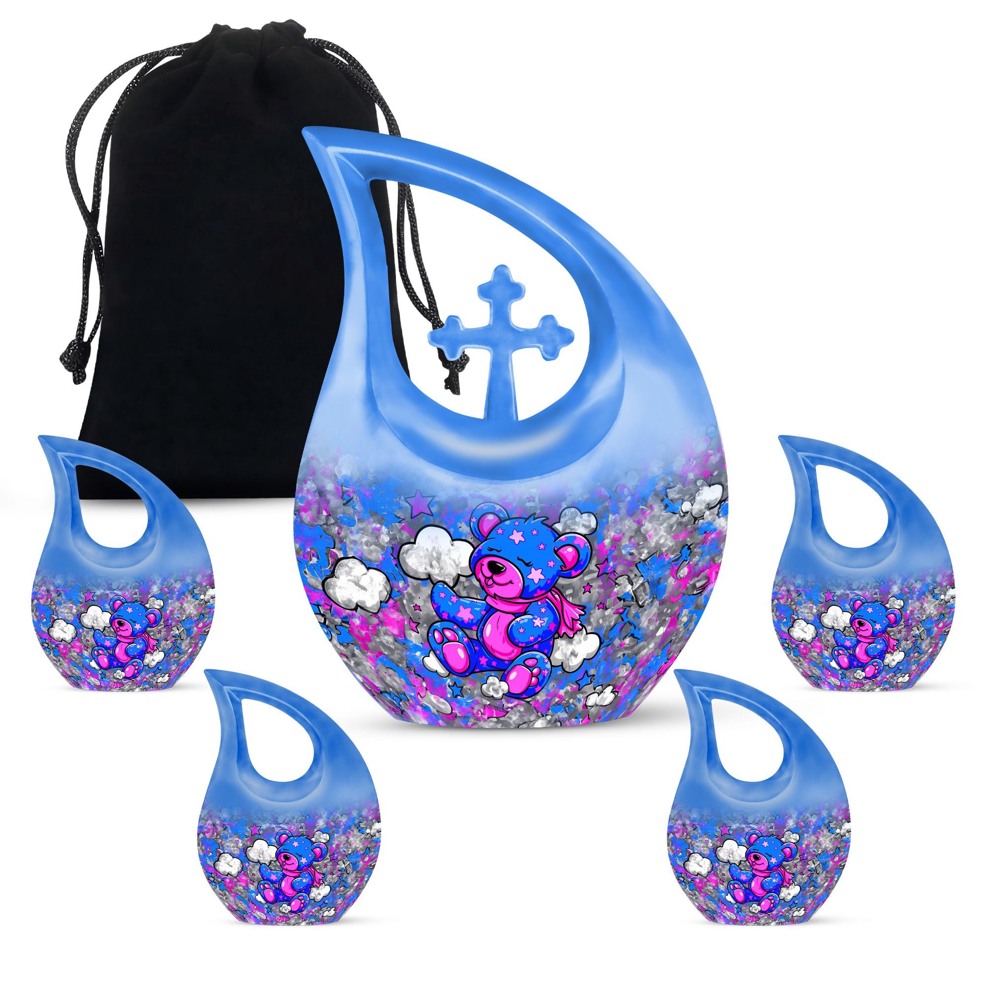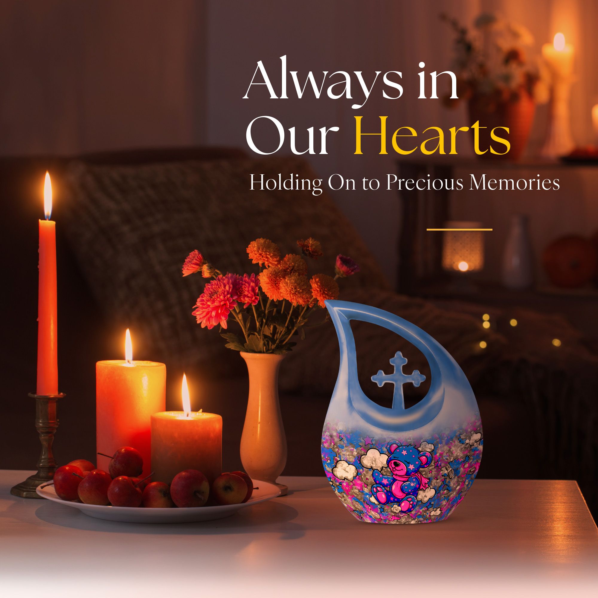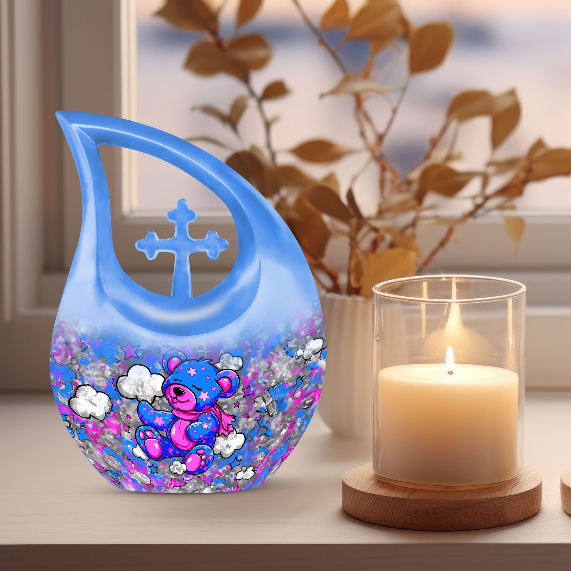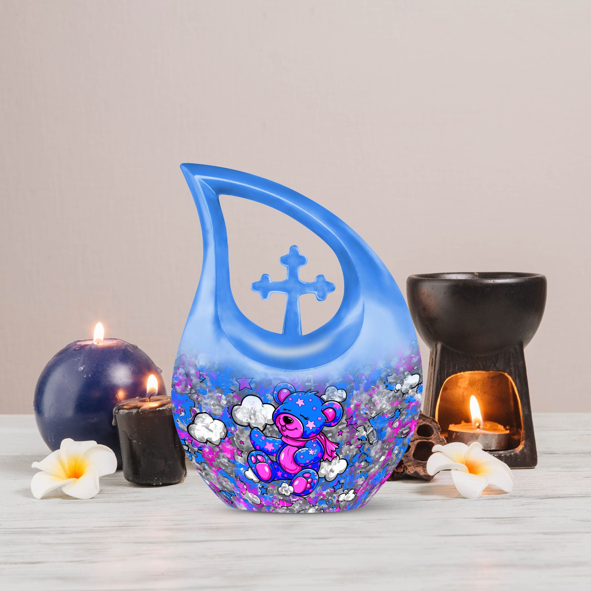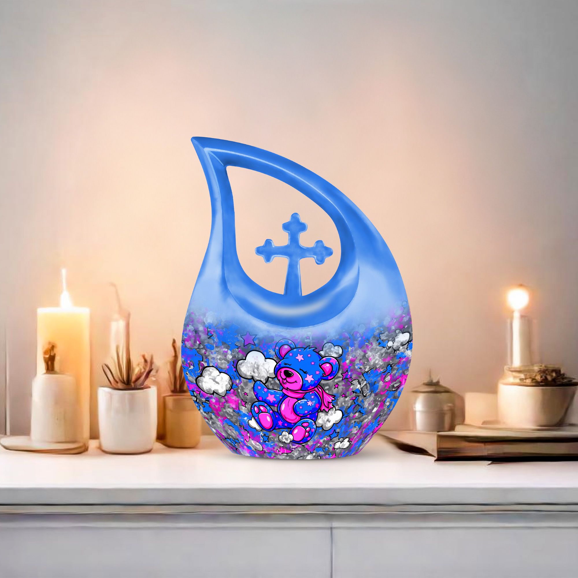 Convey your deepest sentiments and honor your dearly departed with our Modern Bear Urn. Crafted meticulously from high-quality Aluminium, this Large Urn showcases a unique and reverent 'Cross Drop' theme that signifies serenity and love. With a striking 'Bear' motif, this urn measures a comfortable 10 Inch in size and possessing 200 cubic inches in capacity, it can hold a substantial amount of ashes. It weighs a reasonable 3.3 pounds, ensuring it is sturdy yet not overly cumbersome. Adding a personal touch, our Bear Urn permits customization, enabling you to immortalize the memory of your loved one with engraved names. To safeguard the ashes, each urn arrives with a velvet pouch for containment. Ideal for adults and seniors seeking memorial urns or urns for ashes, this Bear Urn offers an authentic way to express your endless love. Our multipurpose urn serves as a fitting remembrance, appealing to those searching specifically for Urns For Angels, Urn For Mom, or Burial Urbs For Human Ashes. Embrace and cherish the memories of your special ones with our exquisitely crafted Bear Urn.