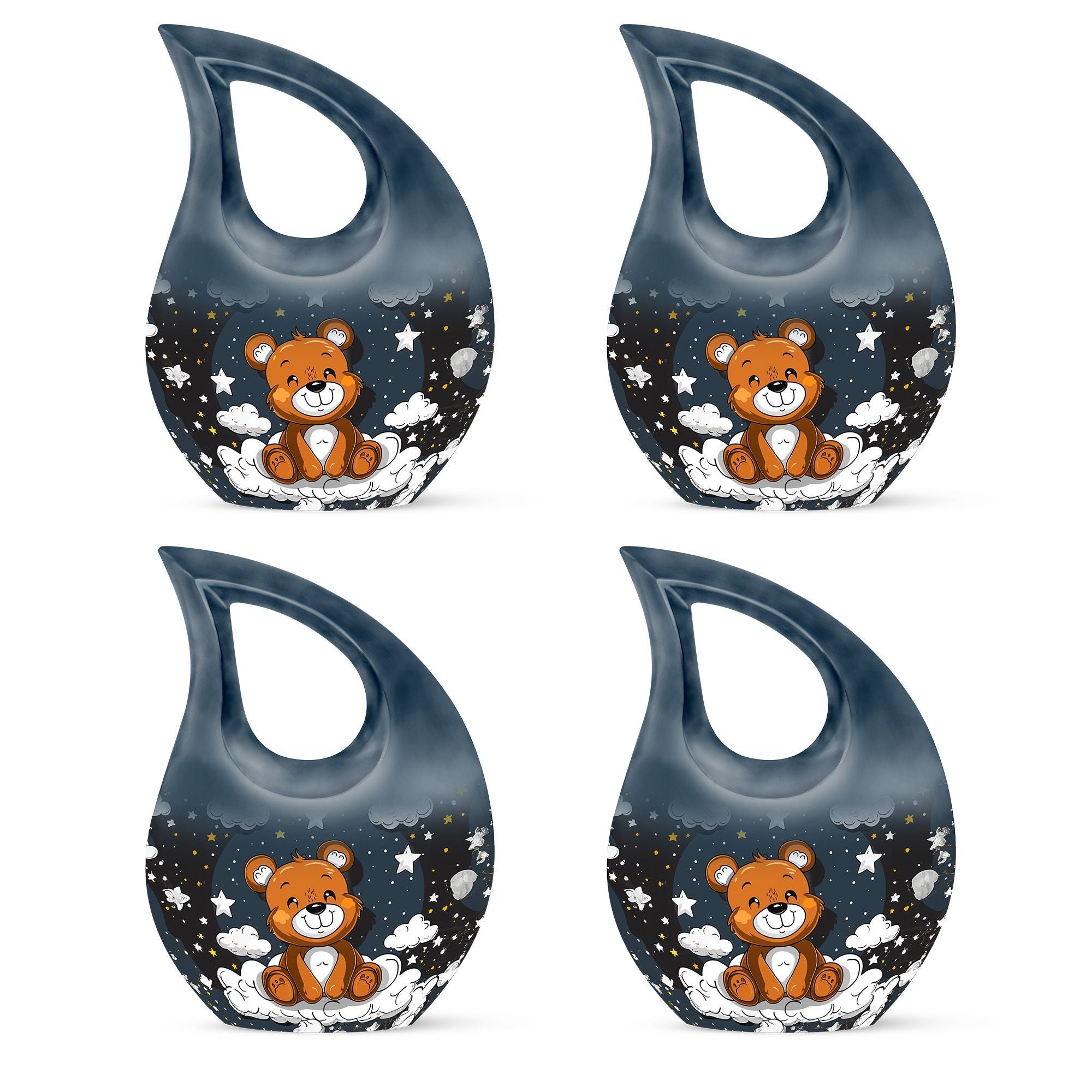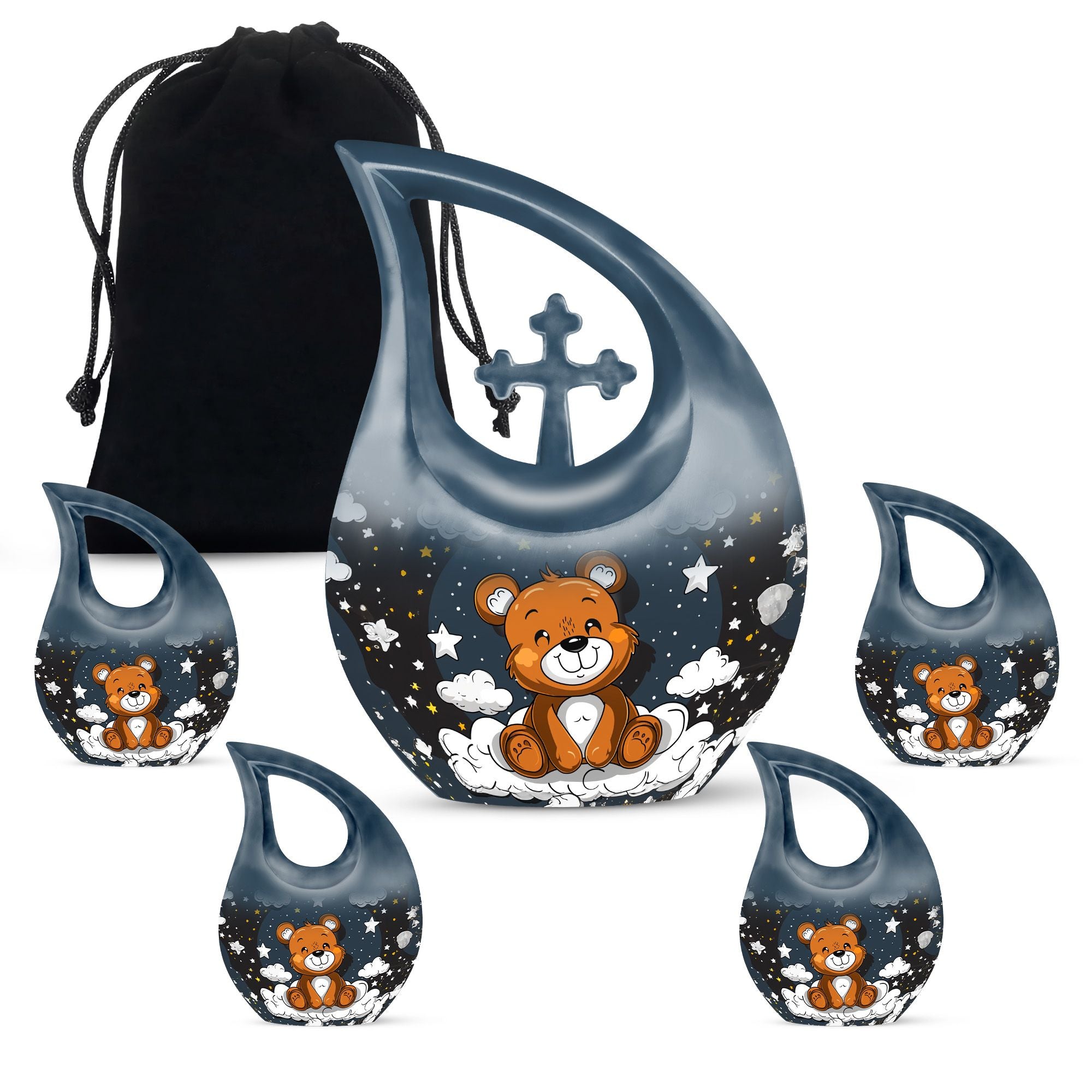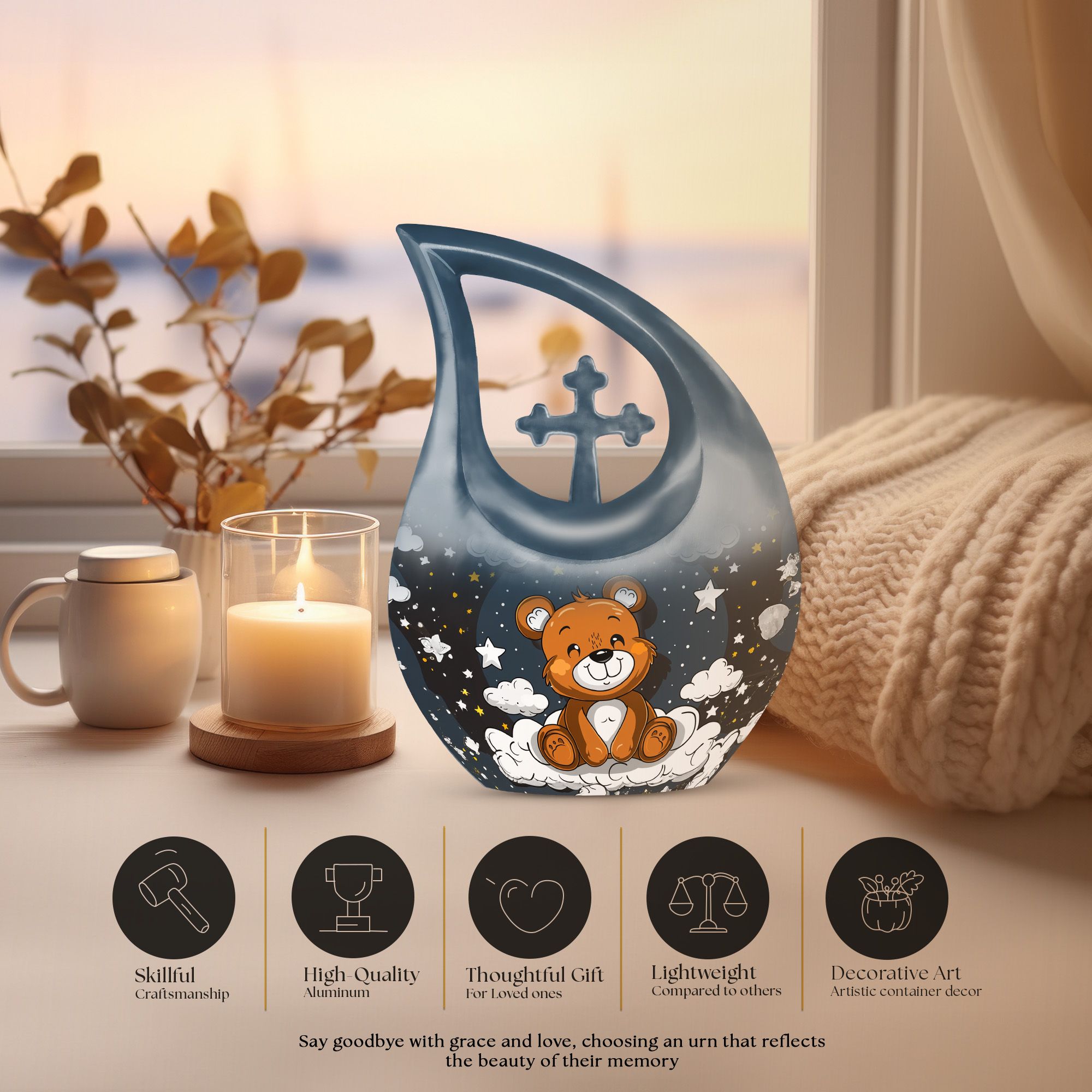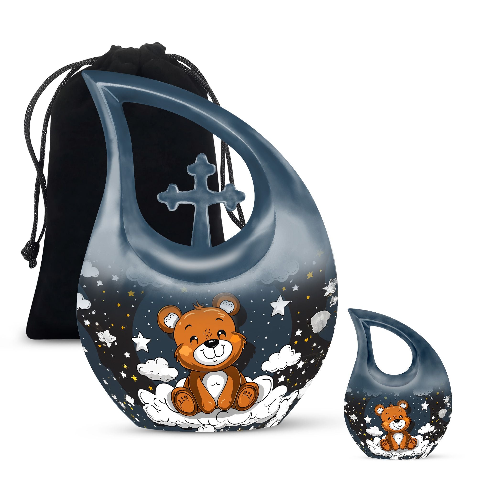 Honor the memory of your loved ones with our Bear Urn, a distinguished piece from our memorial urns range. Crafted from premium aluminium, this large urn measures 10 inches in height, has a weight of 3.3 pounds, and offers a generous capacity of 200 cubic inches. Its delightfully uncommon design features the endearing theme of a bear and an elegant cross drop detail, offering a touching tribute to those held dearest. The package includes a delicate velvet pouch for respectful containment of ashes. You can further personalize this urn by engraving the names of your loved ones. This beautiful urn not only acts as a sublime remembrance of your loved ones but also serves as an exquisite decorative piece for your home. Peruse through our collection for more such unconventional urns for ashes and other ashes keepsake for a man, custom mom urn options, and more.