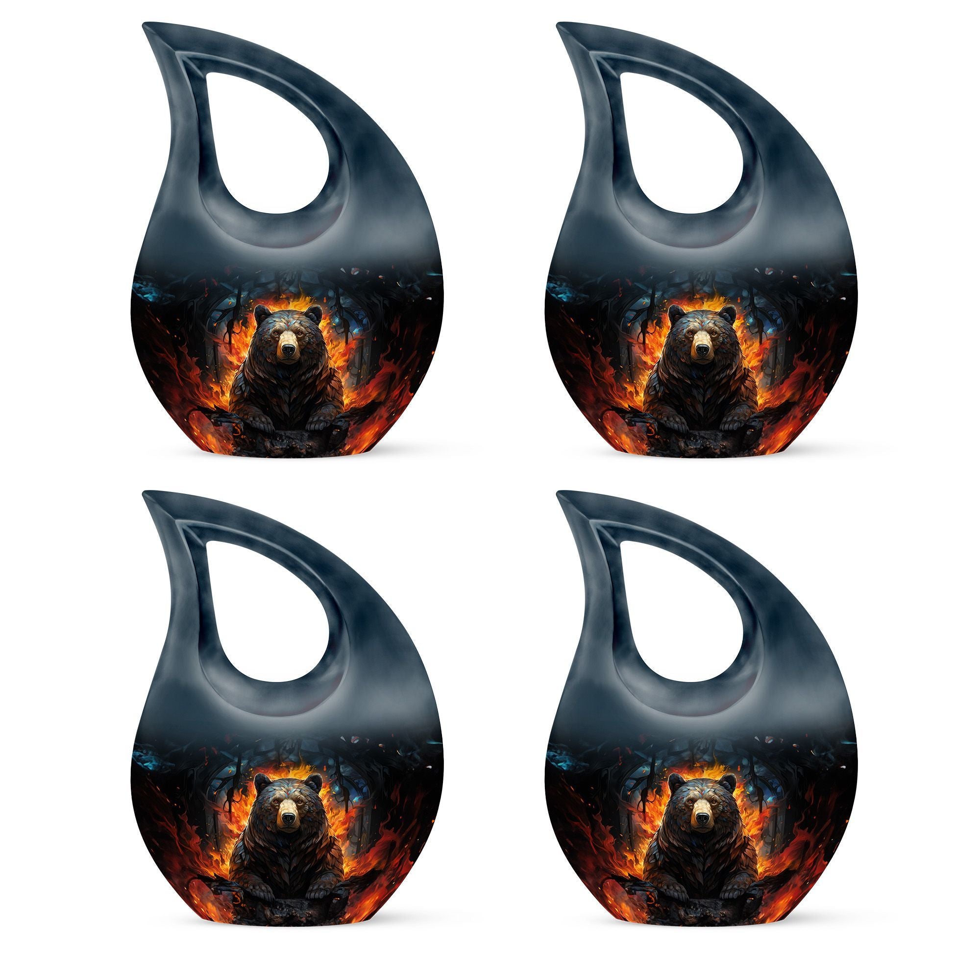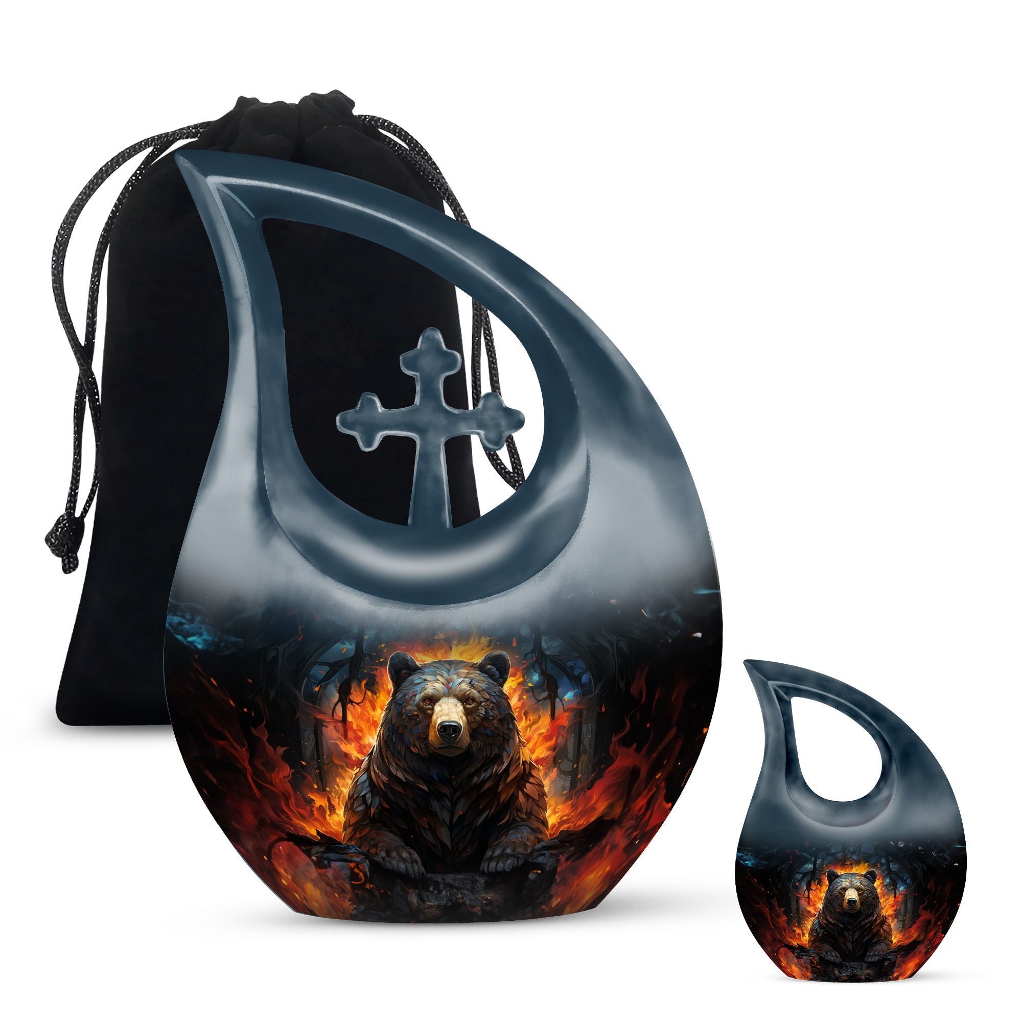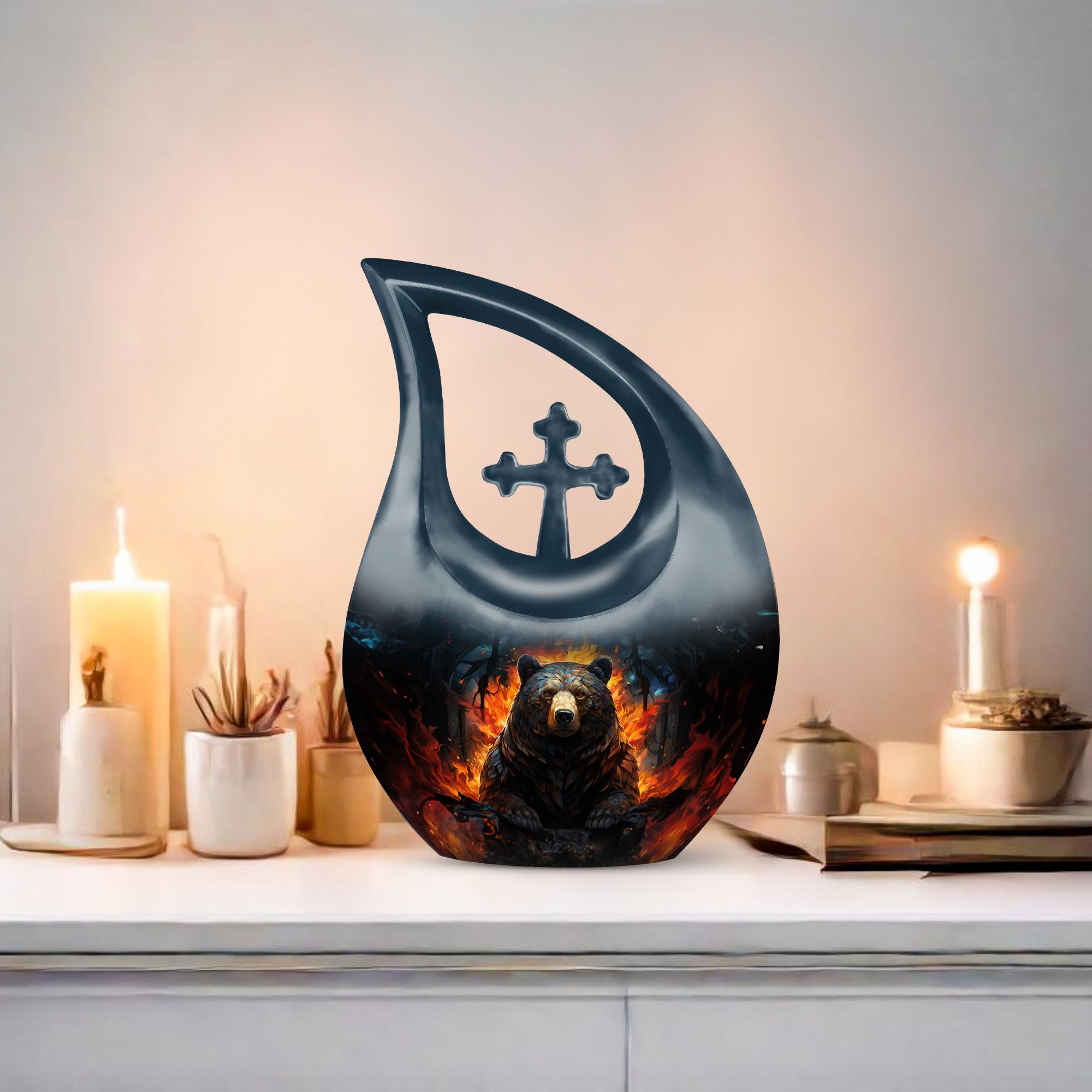 Presenting our creatively crafted Bear Urn, a unique memorial piece specially curated for adults and seniors. This sizeable 10-inch urn is sculpted with a distinguished Cross Drop pattern, amplifying its solemn beauty. It is meticulously constructed from resilient aluminum, rendering it both substantial and durable, weighing in at 3.3 pounds with 10 inches in height. This bear-themed urn boasts a considerable capacity of 200 cubic inches, providing ample space to safeguard precious memories. The product arrives with a velvet pouch, intentionally designed for the respectful containment of ashes. Enhance its significance by personalizing it with engraved names, a gesture of enduring remembrance and honor. Our Bear Urn is not just a container; it serves as a symbol of cherished memories and boundless love. Stand out in your search for 'Unique Urns For Dad,' 'Cremation Boxes For Adults,' 'Large Urns For Ashes,' or 'Funeral Urns For Adults.' Allow this tastefully designed urn to honor your loved ones in an exceptional way.