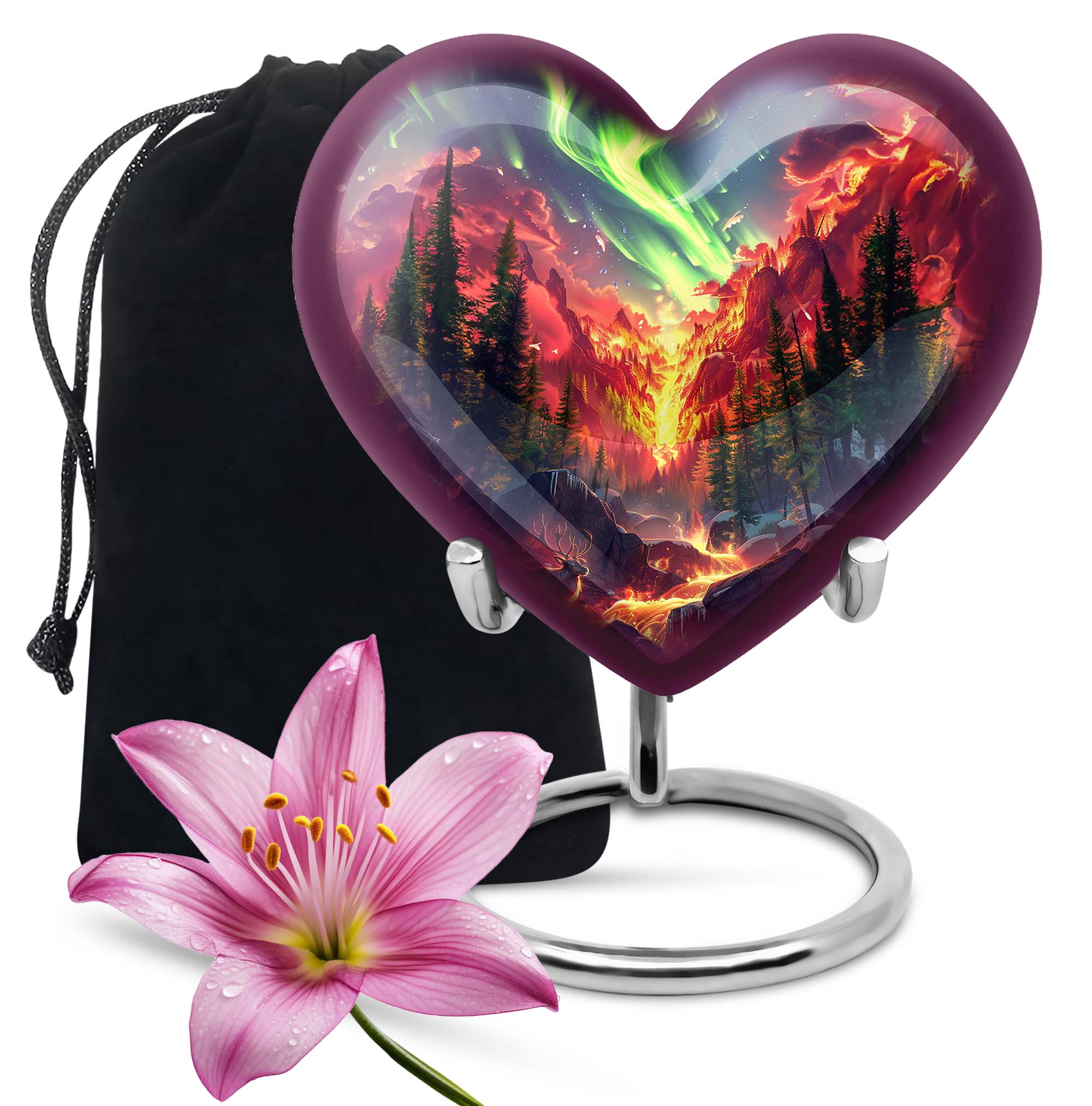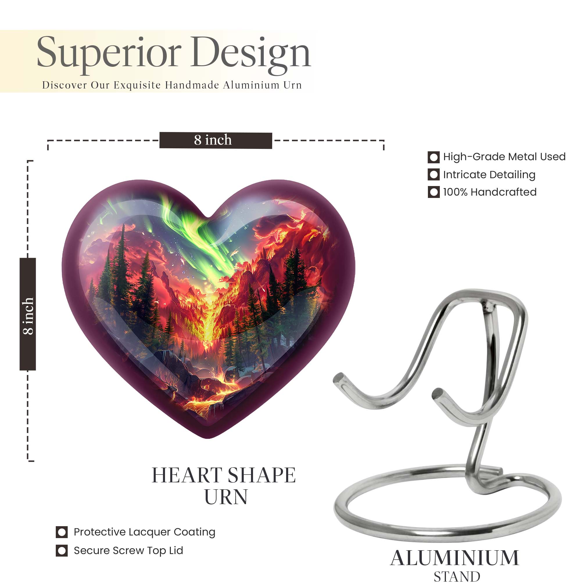 Experience ultimate comfort and peace with our religious and ceremonial Bear Urn. More than just an urn, it's a heartfelt masterpiece, designed with the theme of a serene Purple Meadow. The size is a generous 10-inch, made to accommodate 200 cubic inches of cremains, making it a suitable option for medium size burial needs. Each urn is meticulously crafted from durable aluminium, giving it a stable weight of 3.3 pounds. In the package you receive a velvet pouch, specifically designed for the containment of ashes, adding a touch of dignity and respect. You have the option to add a personal touch of love through our customization option. You can make it even more meaningful by engraving names of your beloved ones. This one-of-a-kind Heart Urn doesn't just hold ashes; it retains love and memories forever. Perfect for use as cremation urns for women, ash adult earns ashes, artistic urns, or metal urns for burial in ground large.