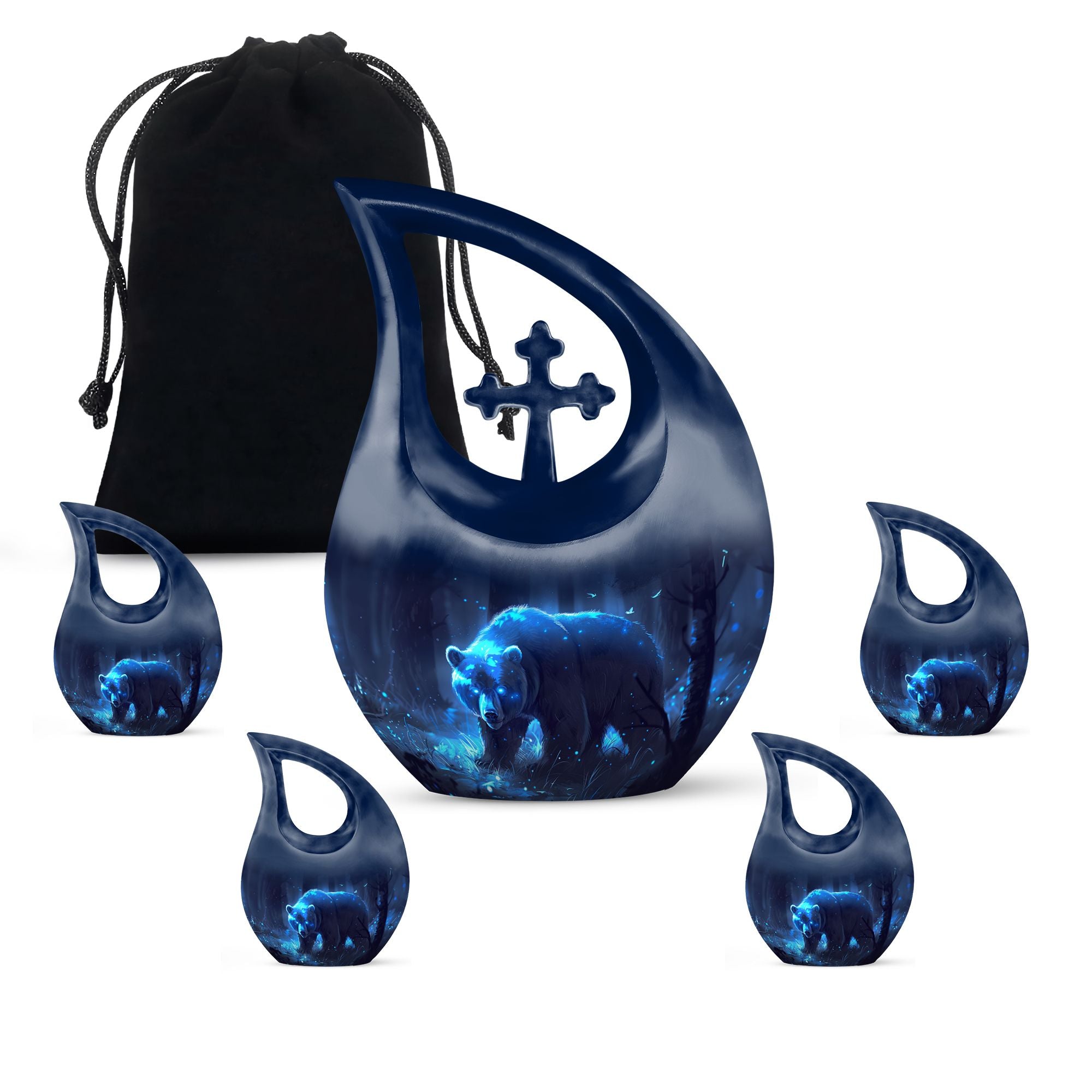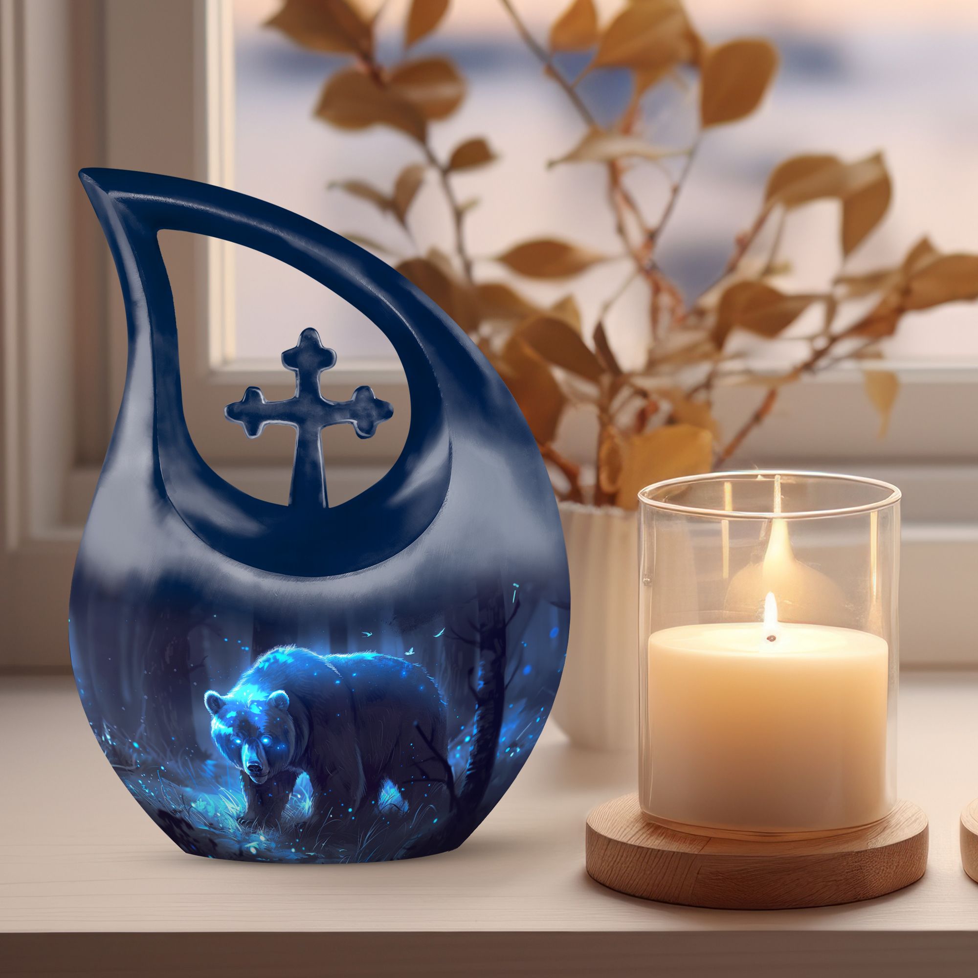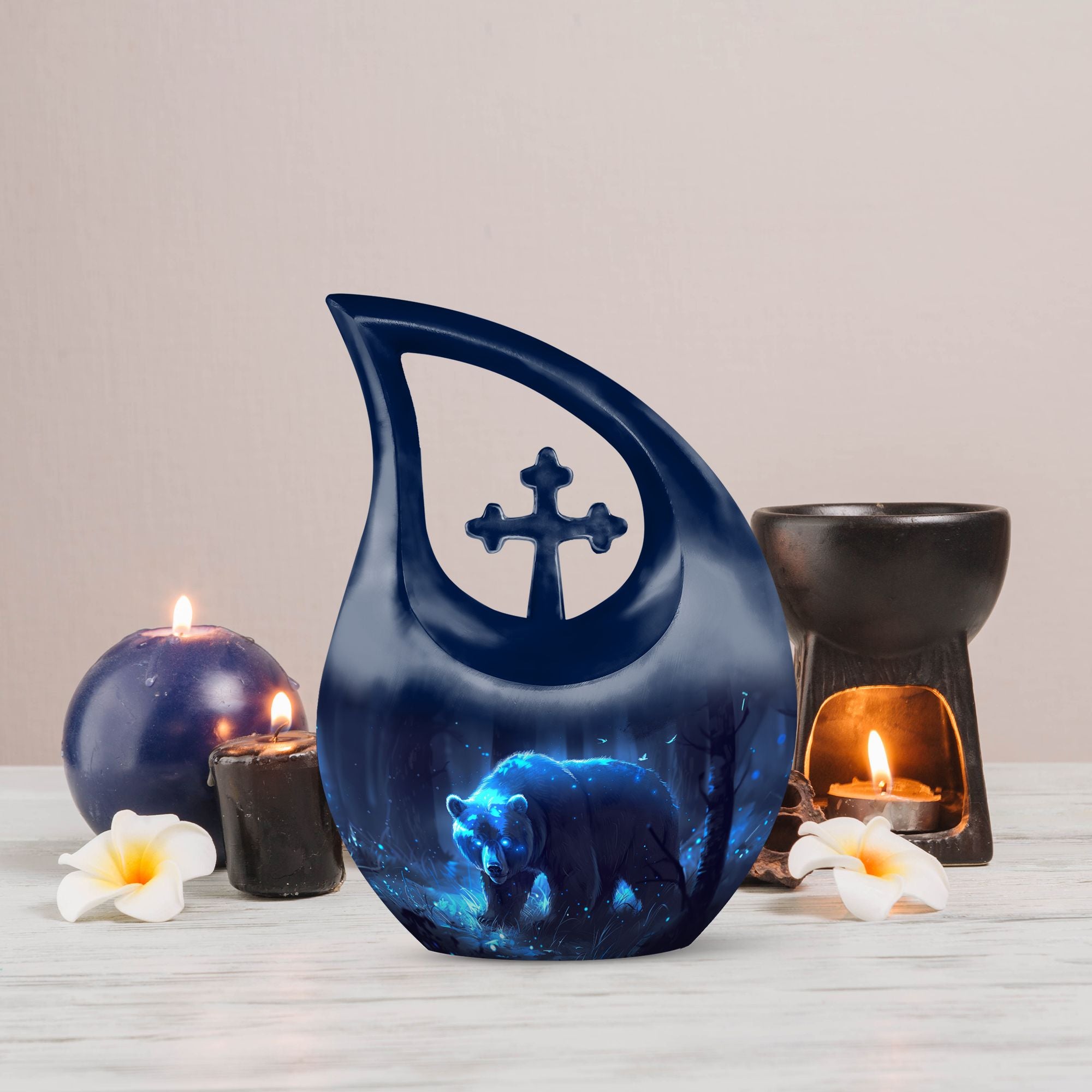 Cherish and honor the memory of a loved one with our beautiful 'Bear Cross Drop' cremation urn. Rendered in high-quality Aluminum, this gracefully constructed Bear Urn offers a unique homage to those who are deeply missed. A tastefully sizable urn designed to measure up to 10 Inches in height and weighs 3.3 pounds, it has a spacious capacity of 200 cubic inches, providing ample room to contain the ashes discretely. It is accompanied by a soft velvet pouch accentuating its unique 'Cross Drop' theme. As a special touch, we offer the ability to personalize this large urn by engraving names on it, making it a truly unique memento of your loved one. Our mission is to provide you with quality urns online, for adults, that will endure the test of time, keeping cherished memories alive while providing comfort and a sense of tranquility. Each of our cremation boxes for adults, allows you the opportunity to remember your loved one in a truly personal way. Trending as 'unique urns for dad', this elegantly themed 'Bear' urn seamlessly blends in with any décor. The 'memorial urns' you choose today become the meaningful heirlooms of tomorrow.