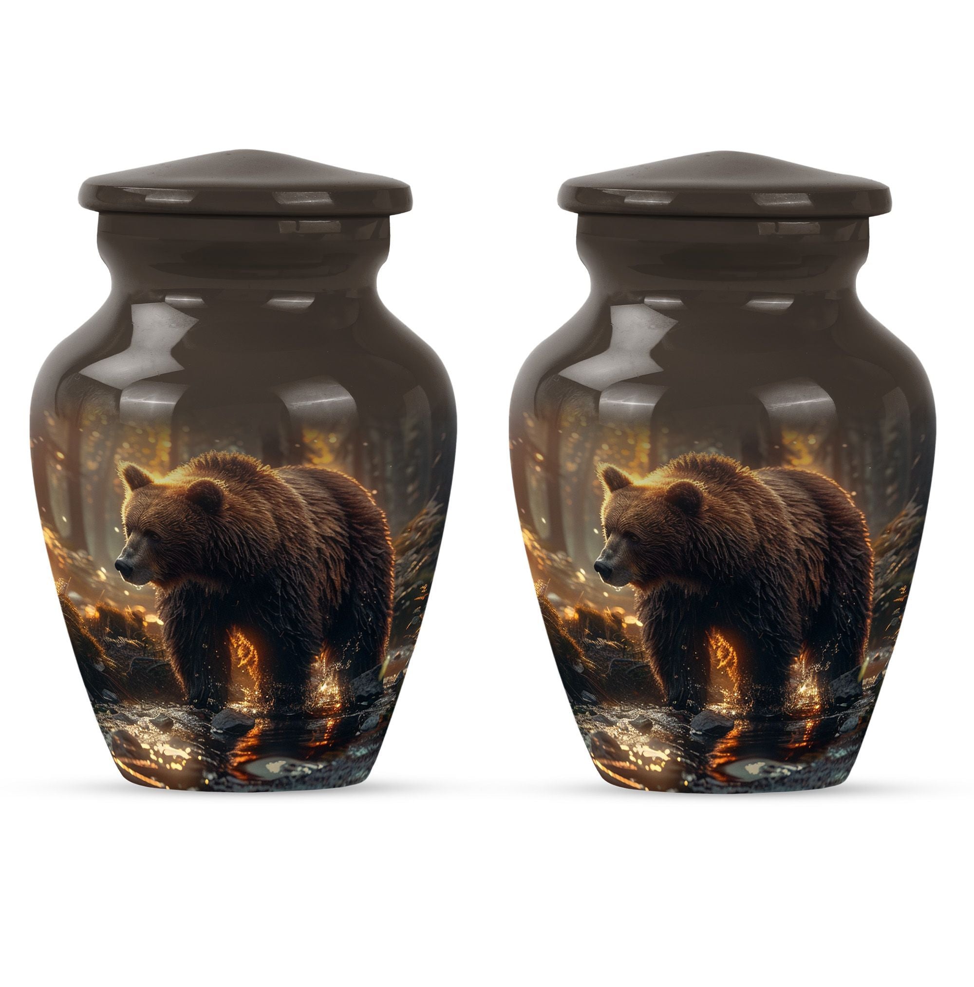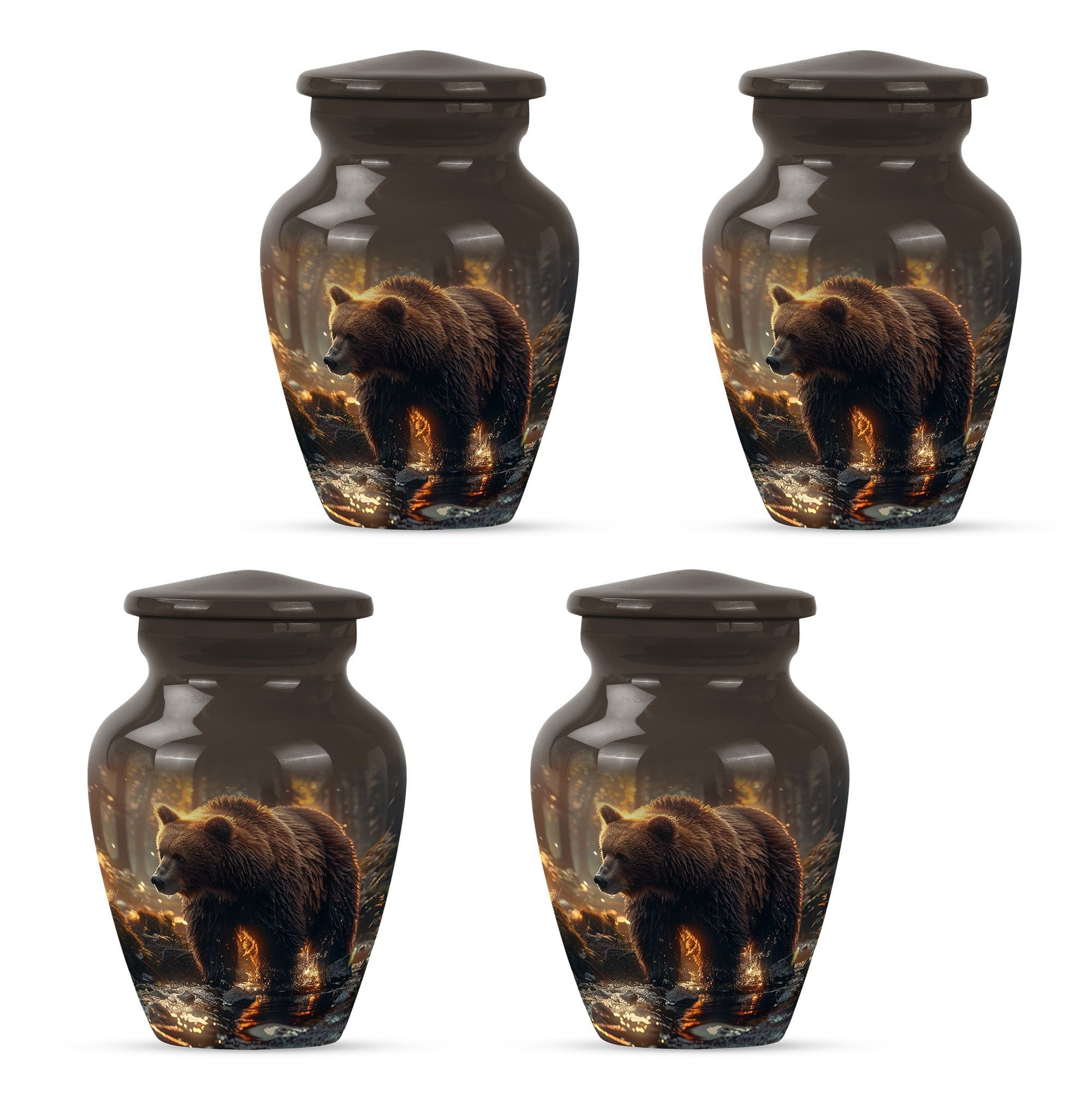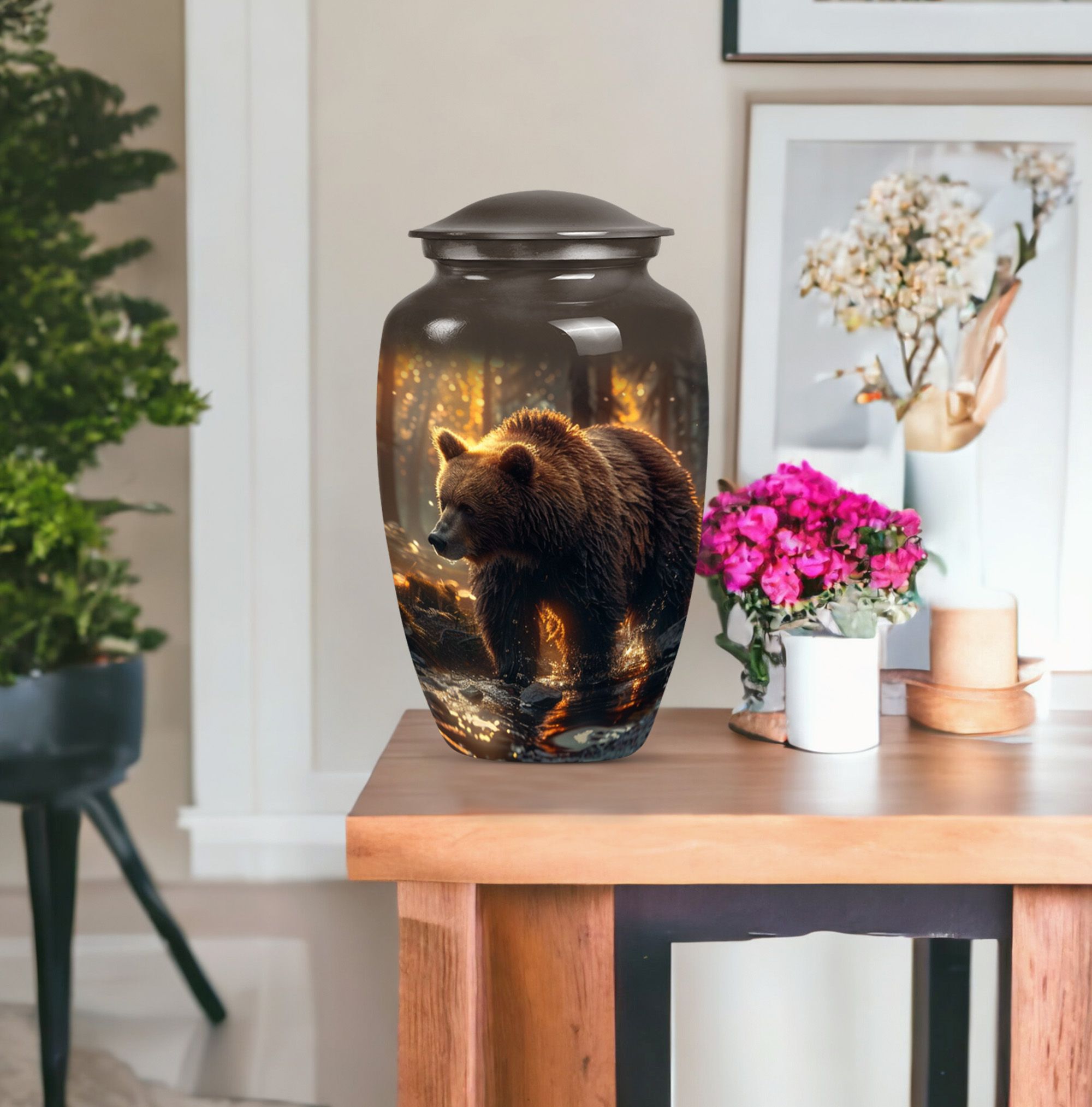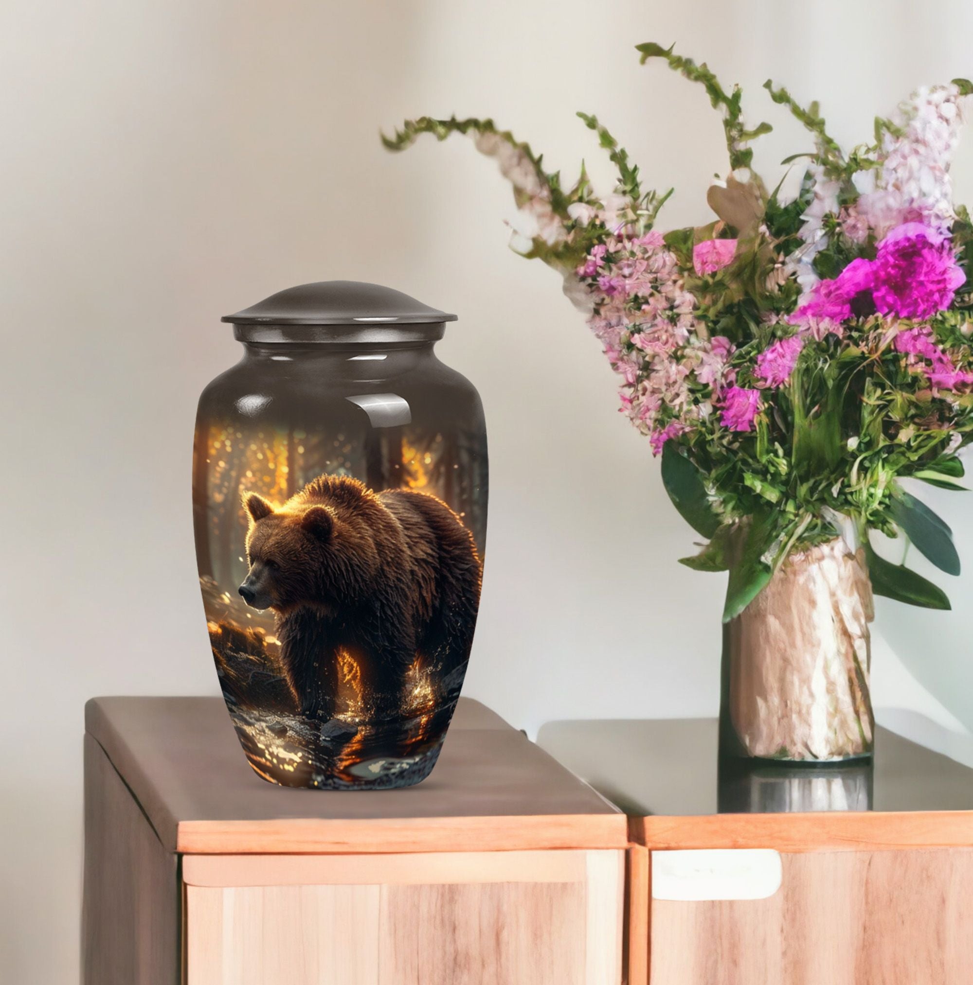 Honor the memory of your departed loved ones with our timeless 10-Inch 'Bear Urn'. Crafted meticulously from durable Aluminium, this large urn holds a significant capacity of 200 cubic inches of ashes. The sturdy design, born out of class and tradition, effortlessly merges the past with the present. Our 'Bear Urn' has the sacred purpose of preserving ashes of love overdue. This memorial human urn for ashes weighs about 3.3 pounds, reinforcing its quality and durability. Its 'Purple Meadow' theme resonates with the serene and peaceful spirit of the departed. Personalization options also serve to engrave the names, reflecting a profound bond extending beyond this worldly life. Each urn comes with a velvet pouch for dignified containment and preservation of the ashes. Recognizing and honoring your love, loss, and longing, this urn is more than just a common cremation urn; it is about cherishing relationships that transcend physical existence.