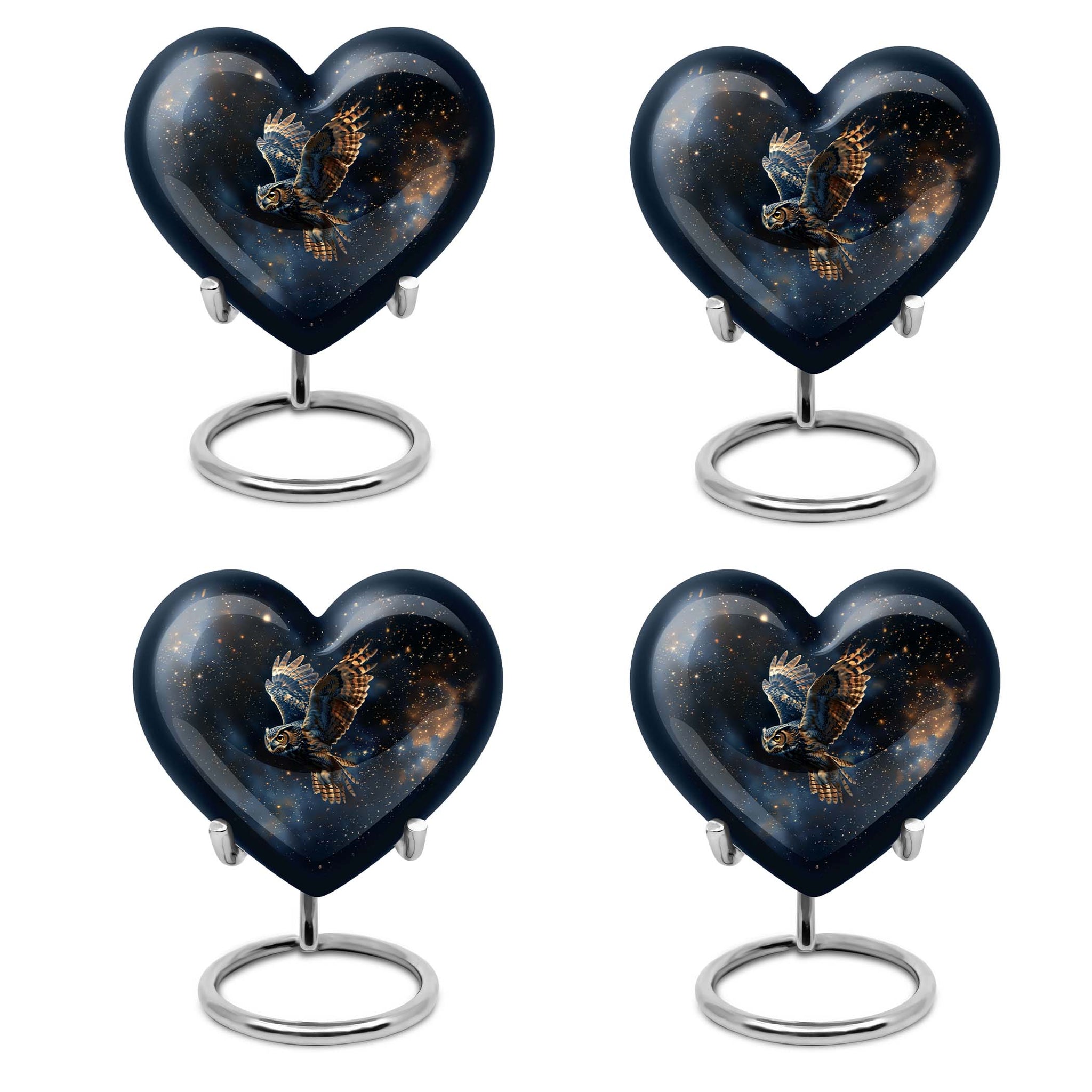 Celebrate the memory of a loved one with our large, 10-inch Owl Urn. This elegantly designed aluminium memorial urn radiates dignity and solemn respect. Its weight of 3.3 pounds exudes solidity and permanence, apt reminders of the lasting impact of your dearly departed. The urn is carefully crafted in the shape of a heart, signifying the love and affection you carry for the passed soul. The fascinating theme of a Wolf Howling enhances its aesthetic appeal while providing a unique thematic essence. The urn offers a sizeable capacity of 200 cubic inches, being suitable for burial and encapsulating lustrous memories within it. Moreover, we understand that the personal touch matters; therefore, we provide the option to customize and personalise this piece with engraved names, making it a true representation of the person it commemorates. The package also includes a velvet pouch for the containment of ashes, ensuring respectful and careful handling. In addition to being an exceptionally designed memorial urn, it is also a manifestation of the soul's journey to eternity. Searching with keywords like 'owl Urn', 'memorial urns', 'urns for burial', 'funeral metal urn', 'shaped ashes urn' or 'urns metal' shall lead you to our product.