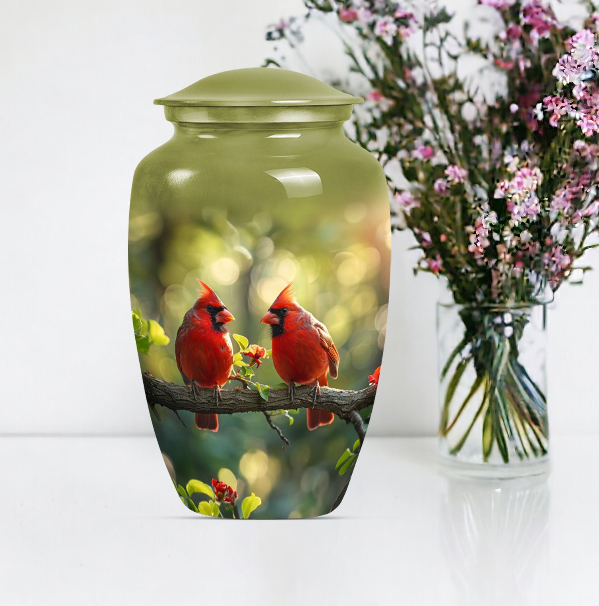Experience transcendent serenity with our Cardinal Bird Urn, an exquisite selection in Medium Size Urns for Human Ashes. Created to cater specifically to the tastes of Adults and Seniors, our funeral urn is as beautiful as it is meaningful. Shaped in a timeless 'Classic Urn' style, it's skillfully crafted from premium aluminium to ensure durability without compromising on aesthetics. With a substantial capacity of 200 cubic inches, this large urn is designed to hold the ashes of your beloved in secure peace. It measures 10 inches in height, a substantial presence to honor the memory of the departed. Coming with a velvet pouch for containment of ashes, the urn is also capable of being personalized with engraved names, making every piece special and unique. Weighing 3.3 pounds, this 'Wolf Howling' themed cremation urn requires careful handling. Embrace a memorable way of preserving the ashes of your loved ones with our Medium Cardinal Bird Urn. Remember, this isn't just an urn. It's a loving memorial container linking two worlds. A synonym of affectionate remembrance for those who are sadly no longer with us.