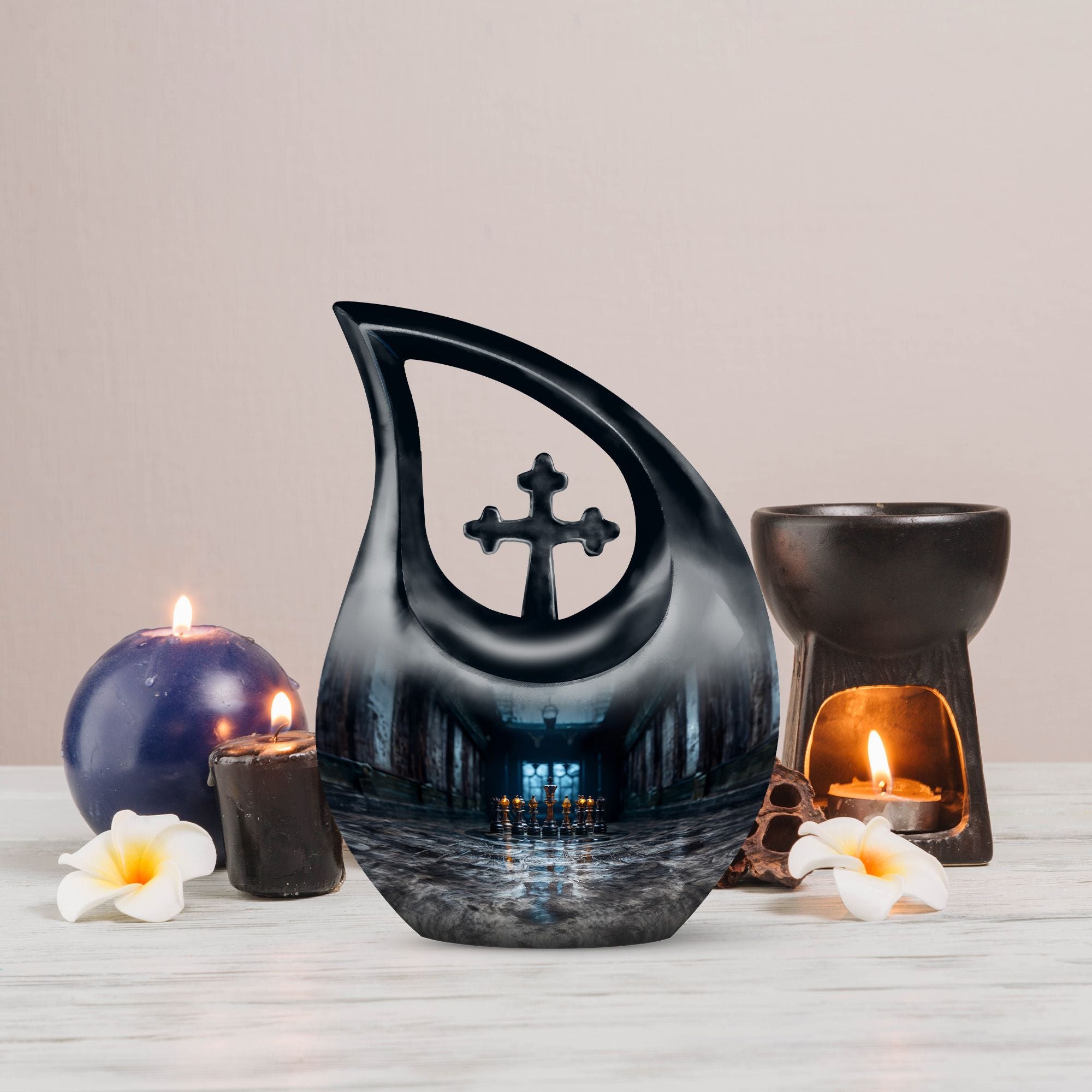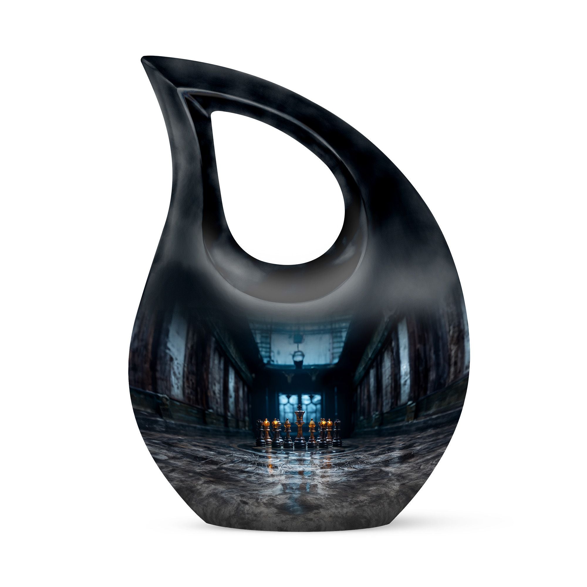 Crafted with precision from durable aluminum, this 10 inch urn showcases a sleek black matte finish accented with gleaming golden chess pieces, symbolizing wisdom and legacy. Its secure screw-top lid ensures ashes remain safe and protected, while the design’s elegant detailing makes it ideal for home display or burial. Whether used as an ashes memorial keepsake or part of an urn with keepsake combo, this piece merges meaning and sophistication beautifully.