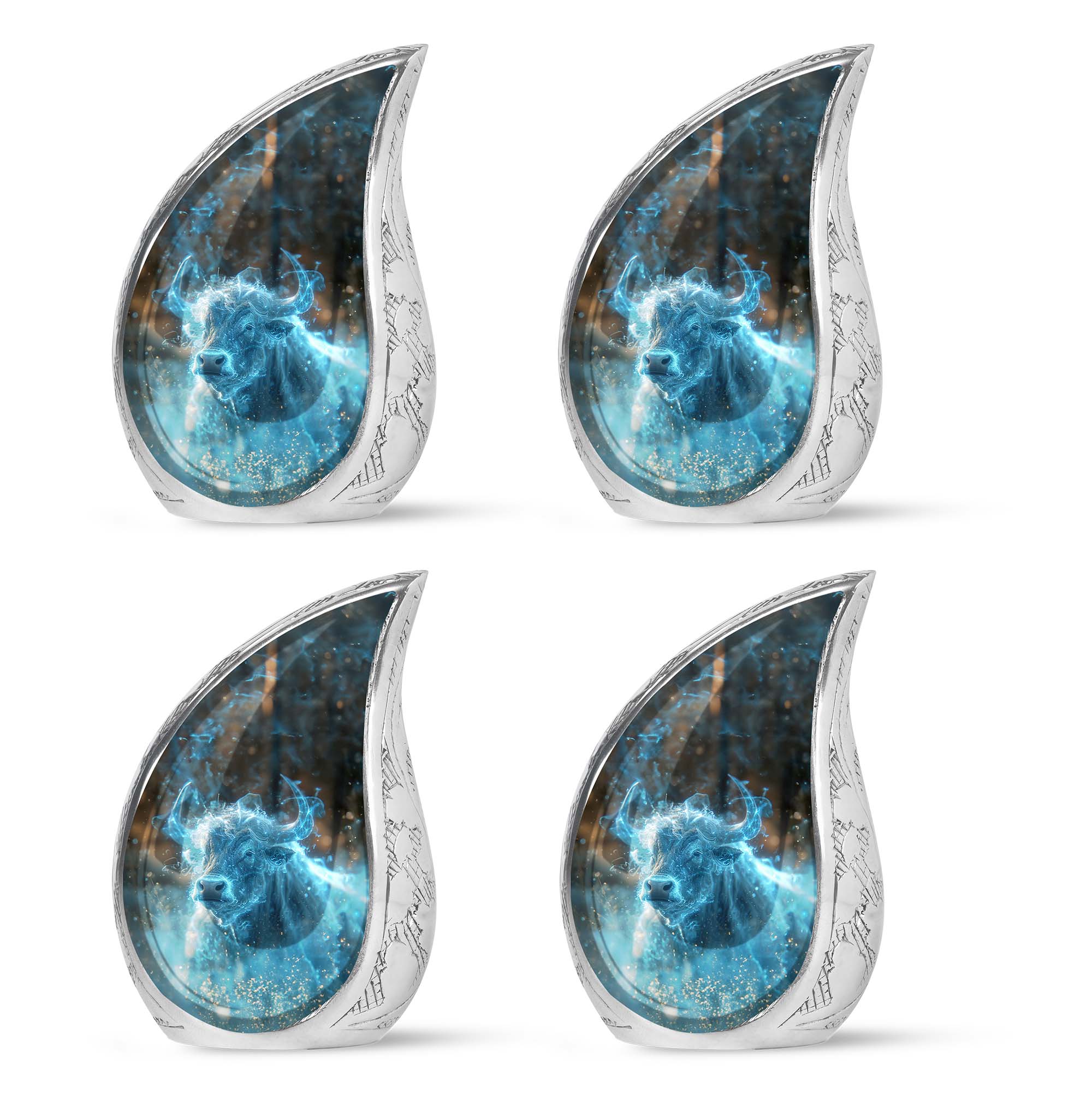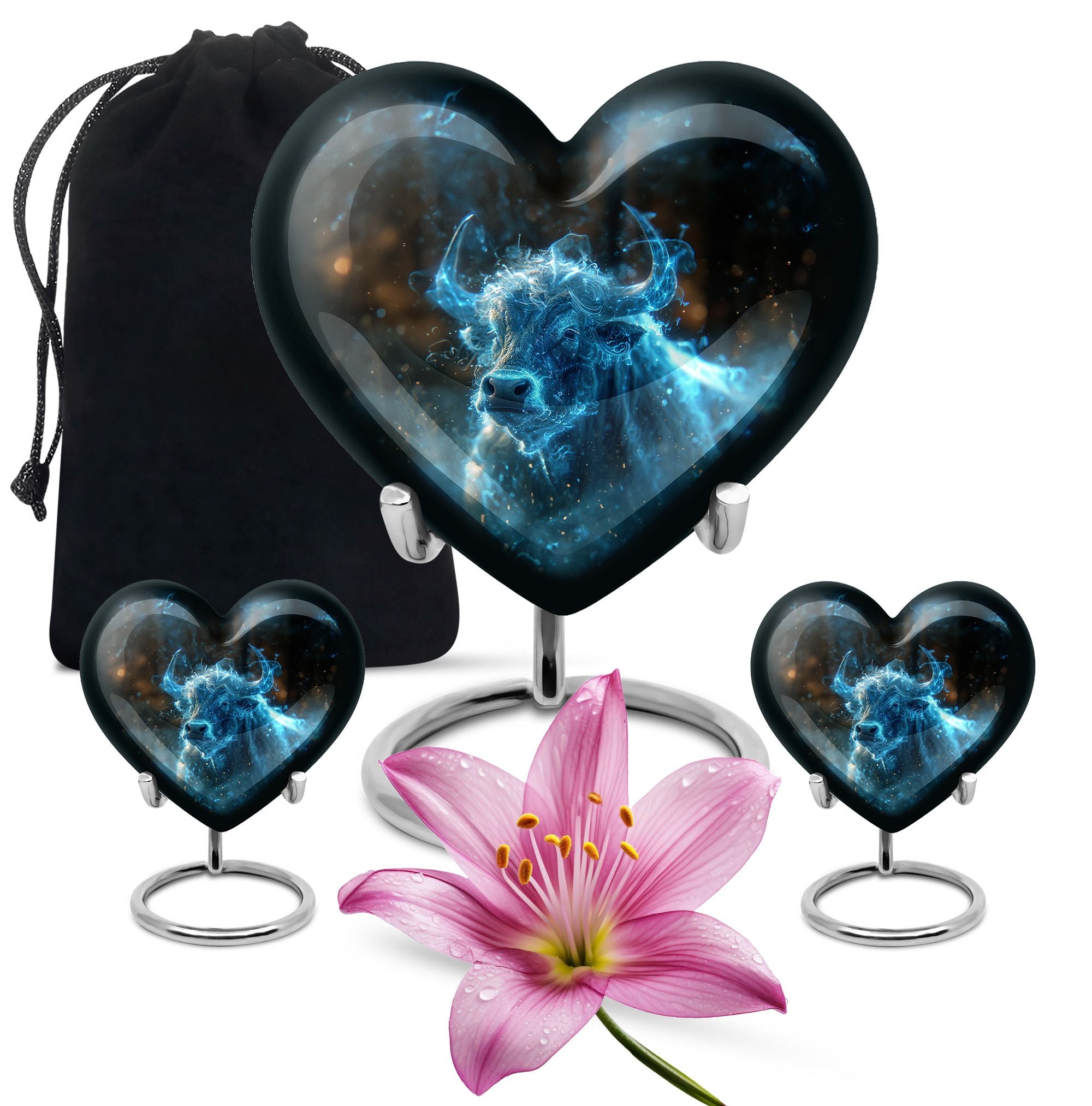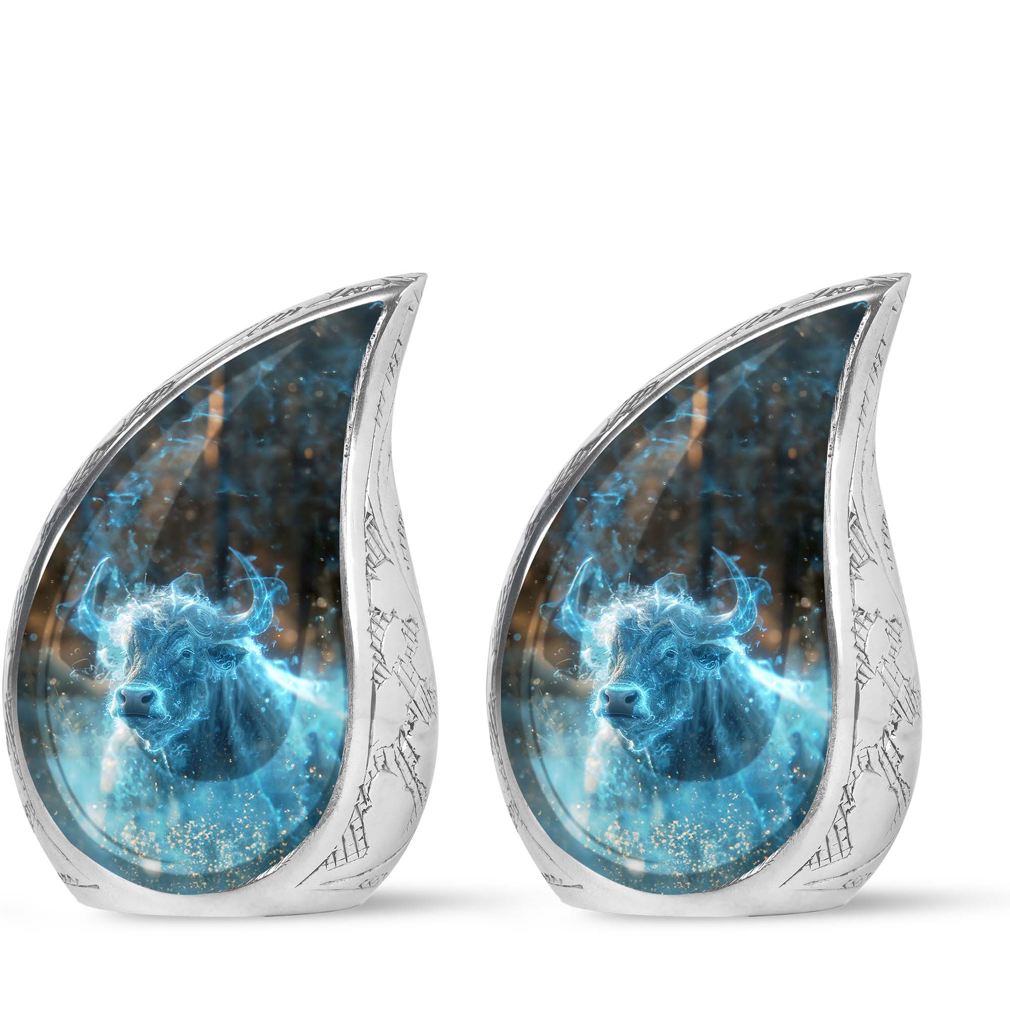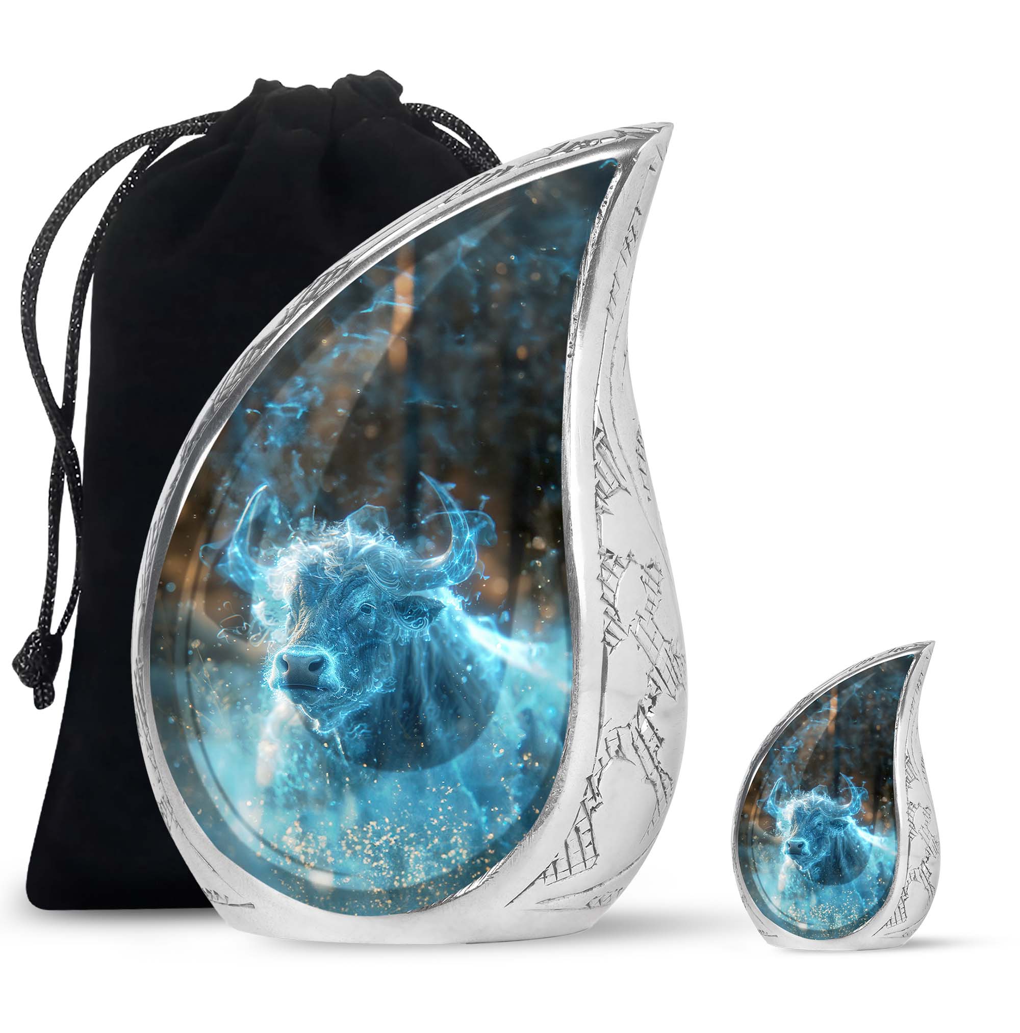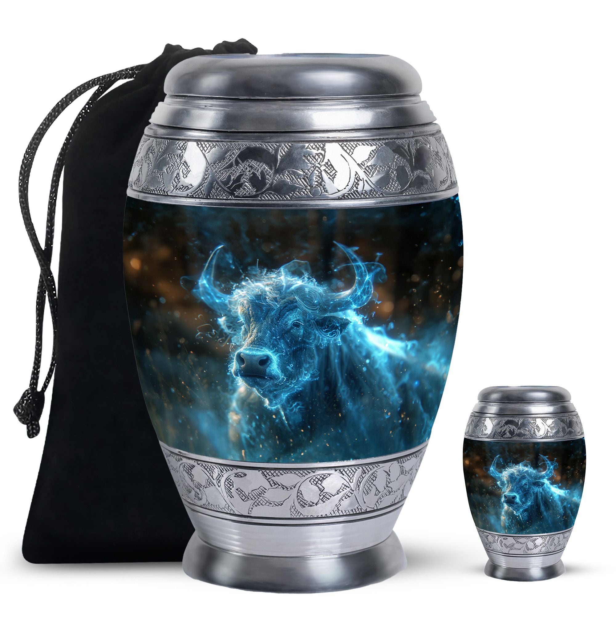 Expertly crafted with attention to detail, this urn combines sturdy construction with an artistic, cosmic-inspired design. It is perfect as a large cremation urn, large urn for adult ashes, or a cremation urn adult large, offering both secure storage and a beautiful display. The majestic bull motif symbolizes resilience and vitality, making it a striking centerpiece for any memorial space.